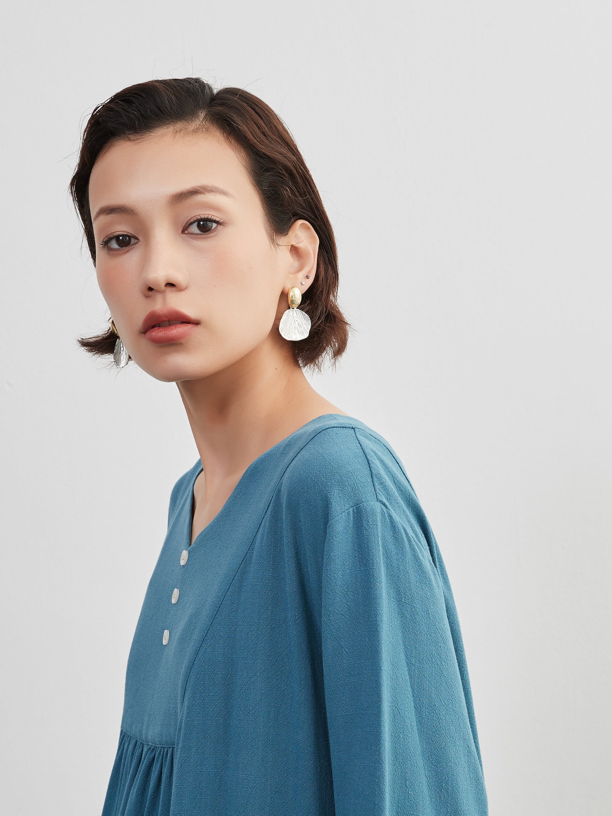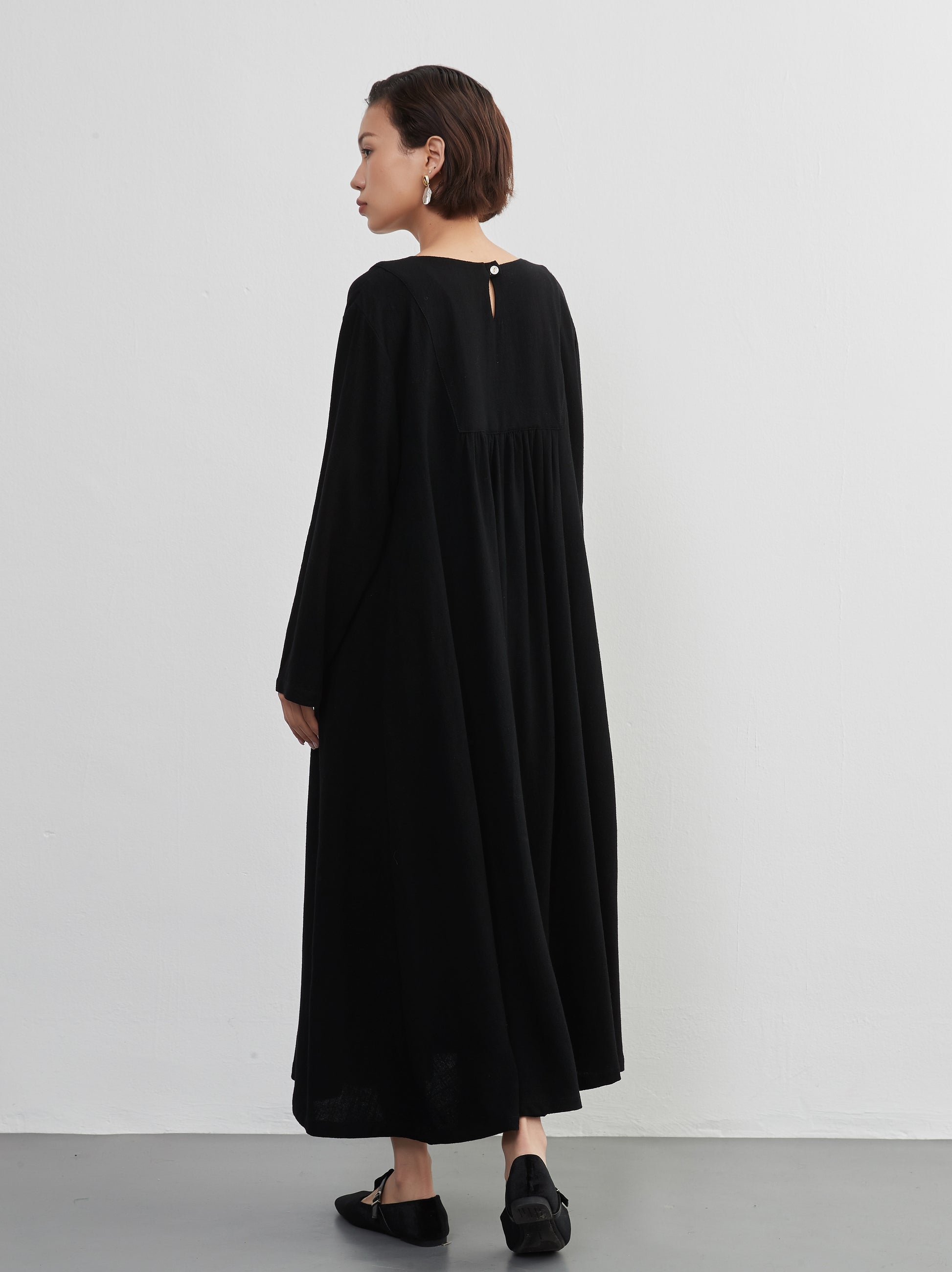 A dress made of draped fabric with plenty of gathers. The light movement and elegant design make this an item that is easy to move in. The decorative buttons and gathers are accents, and the linen mix material gives a comfortable breeze.