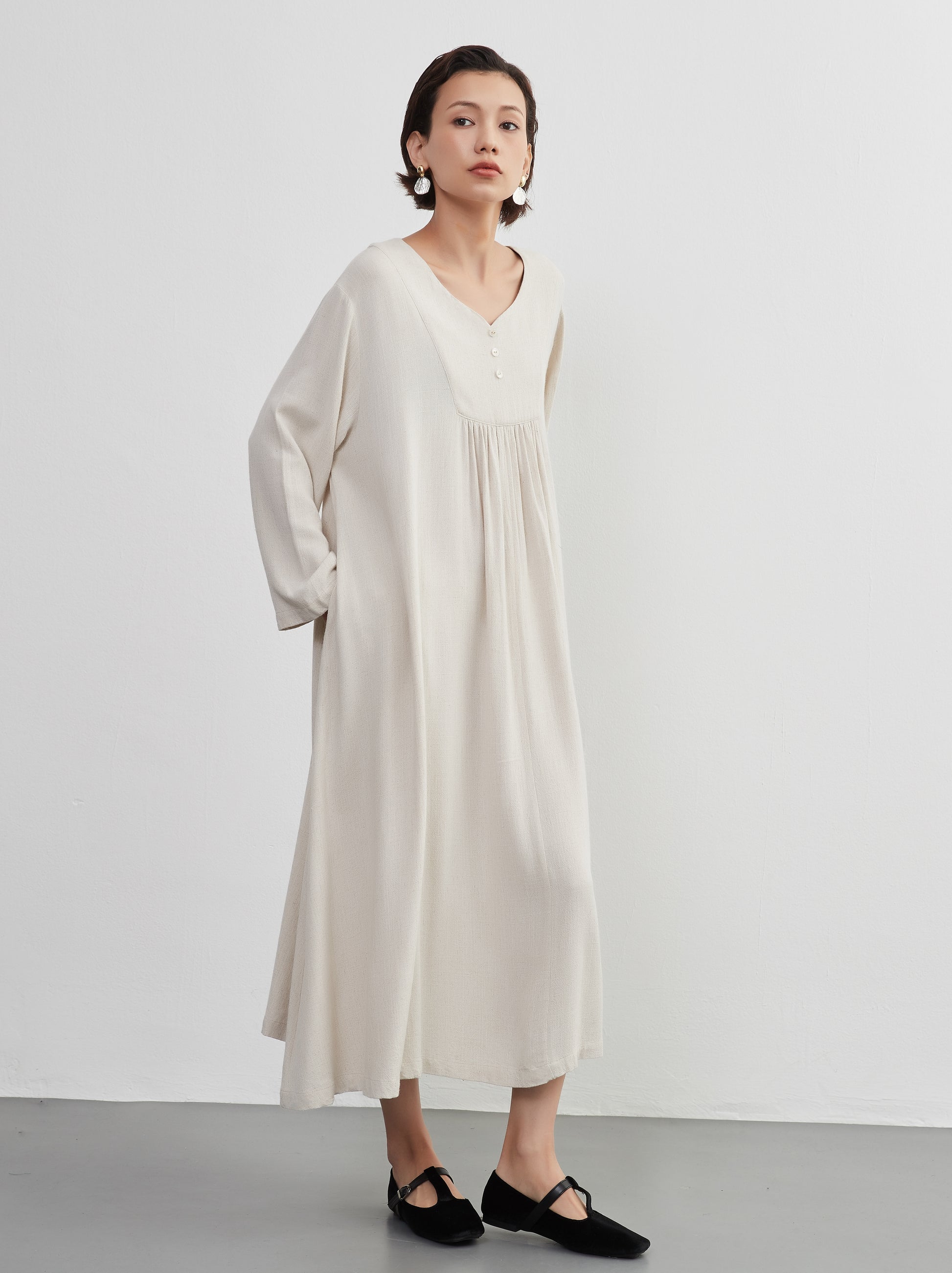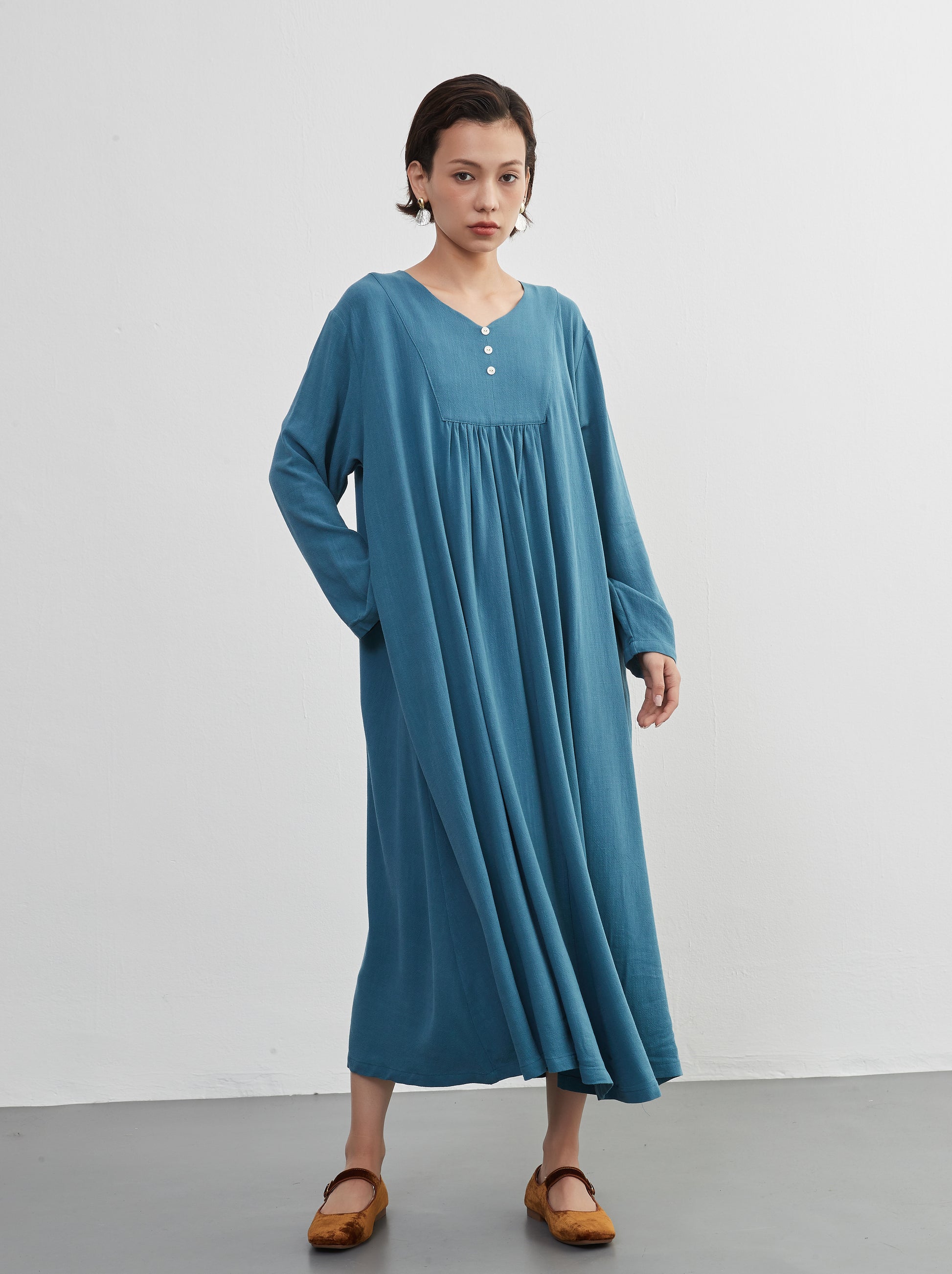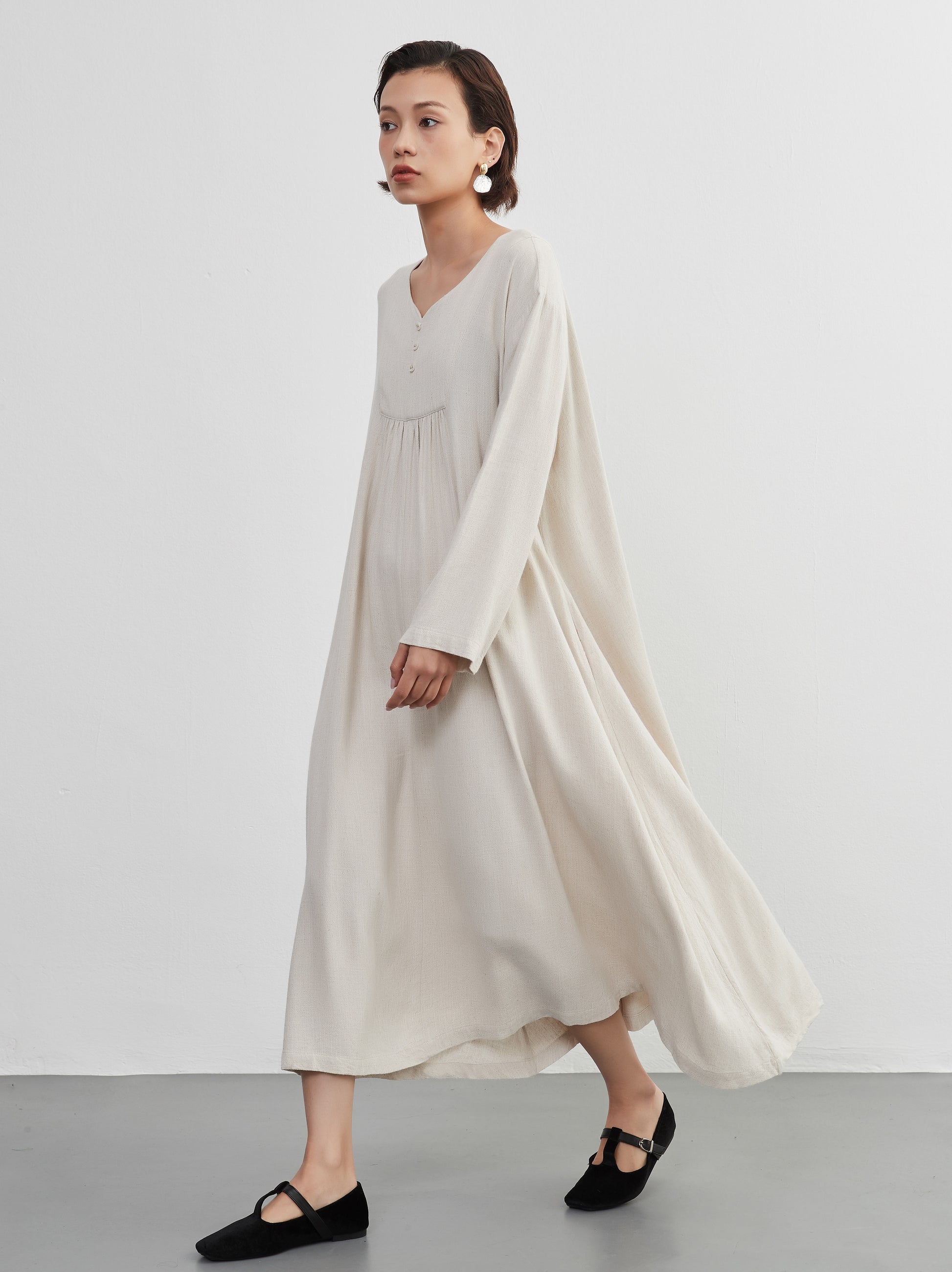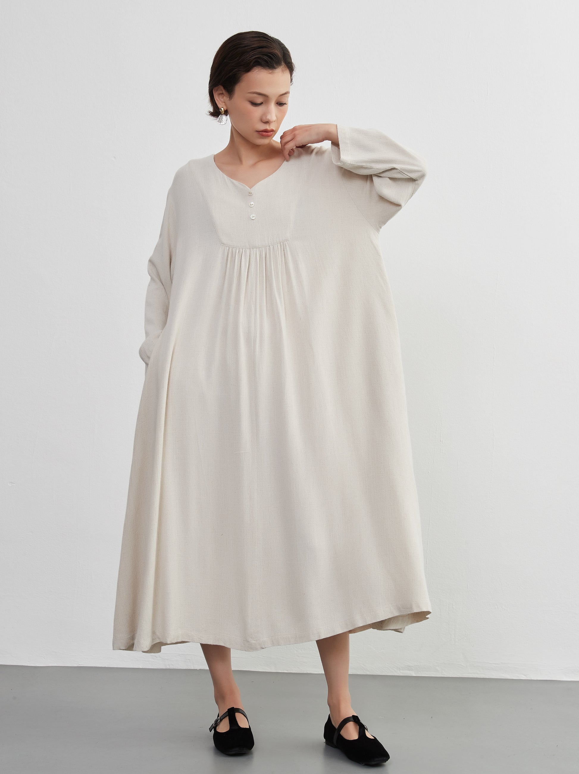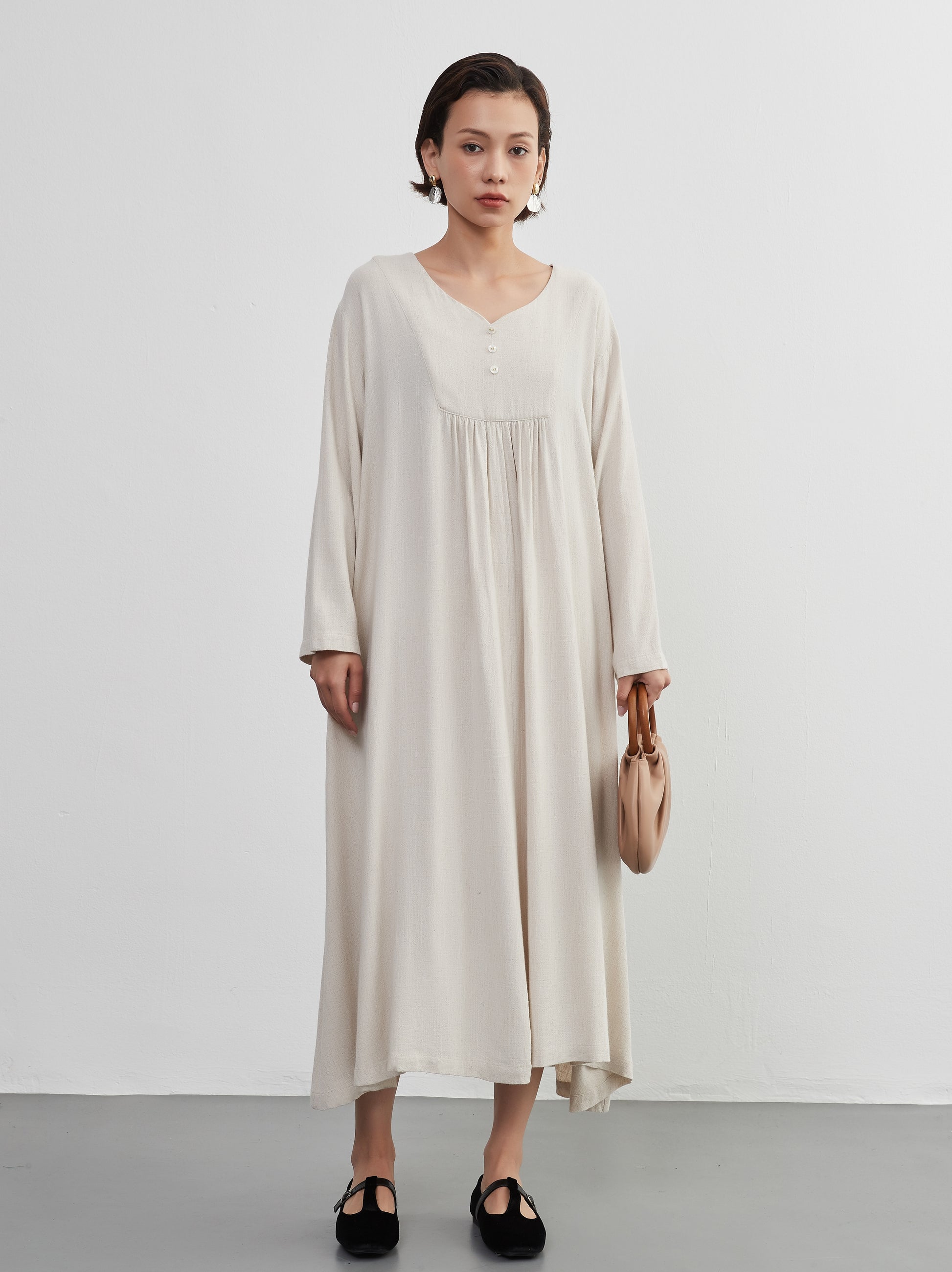 KNXO405 - Easy to move your legs in, linen mix long sleeve dress, decorative button gathered long length