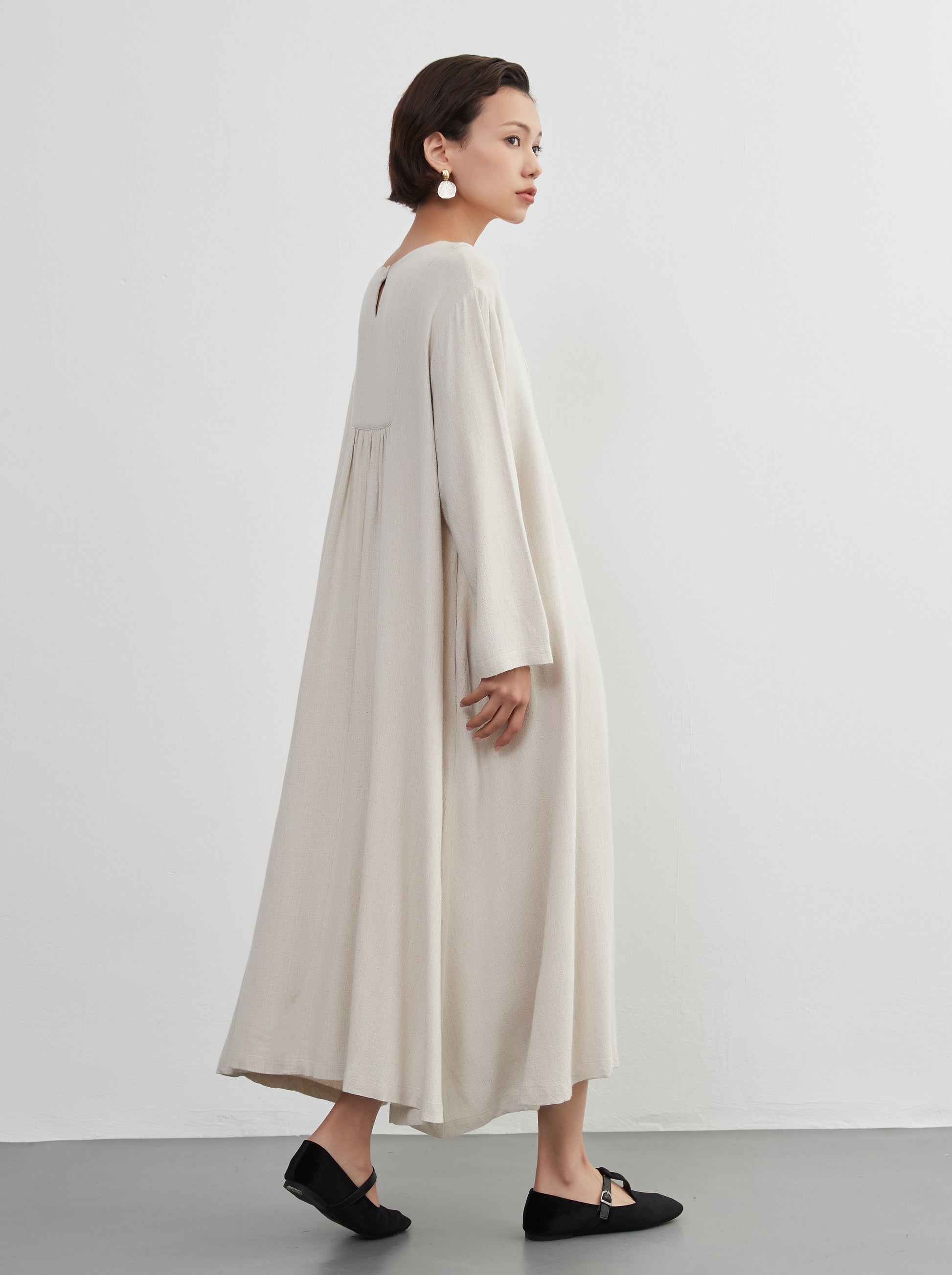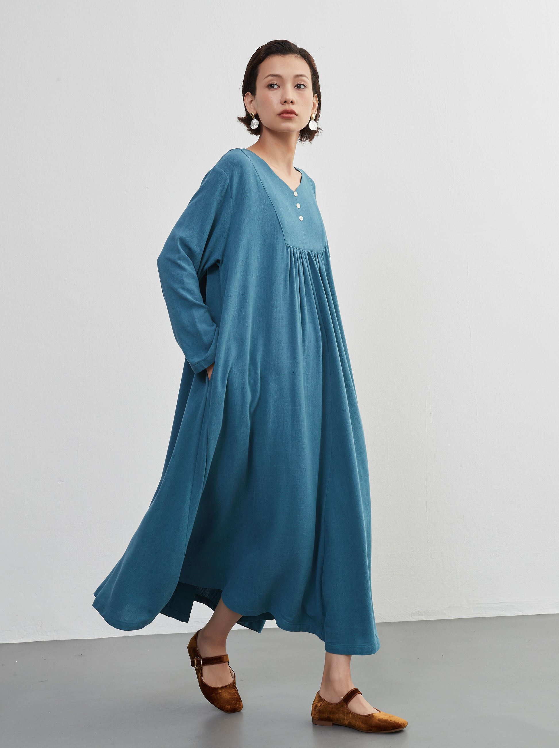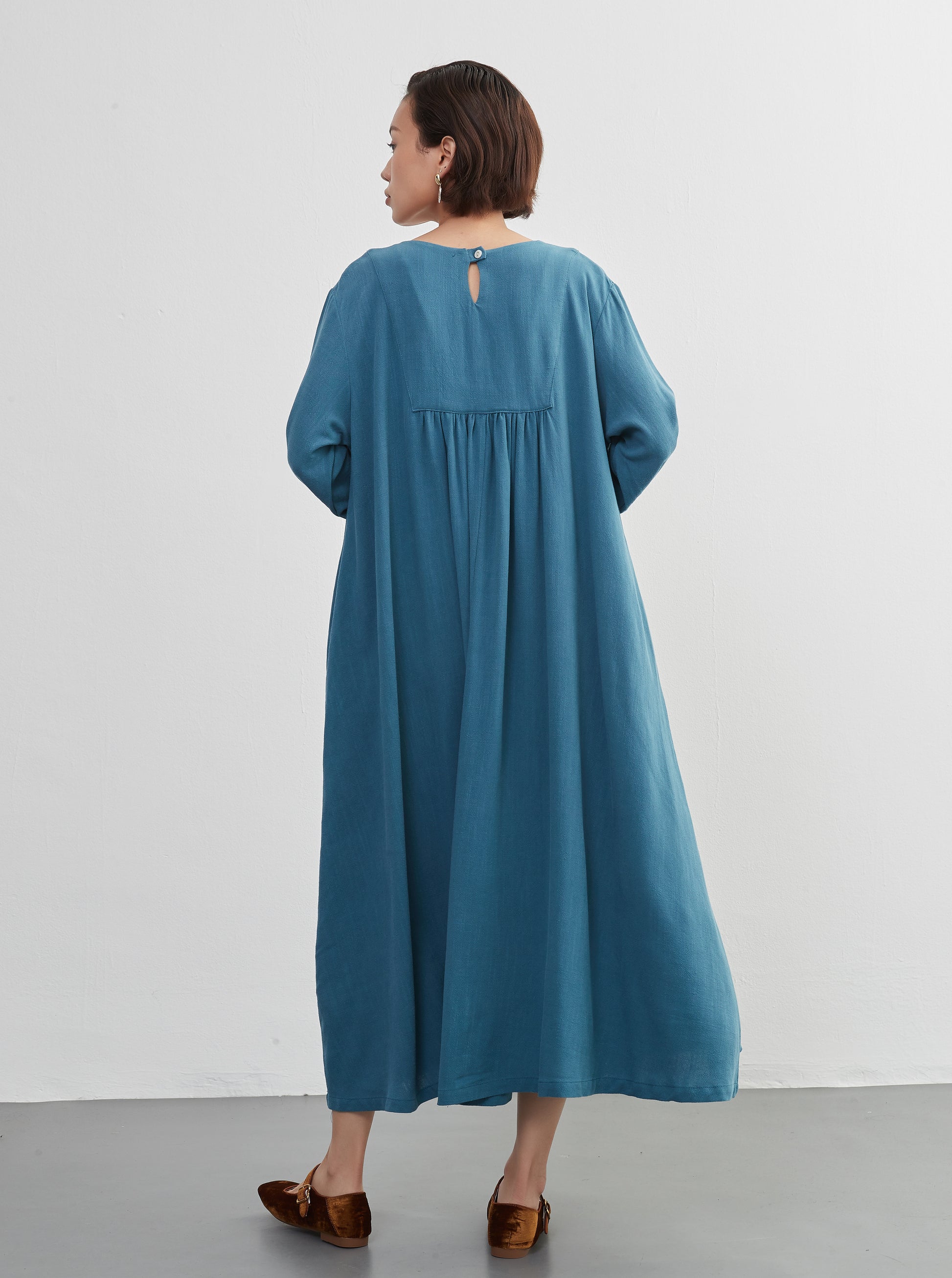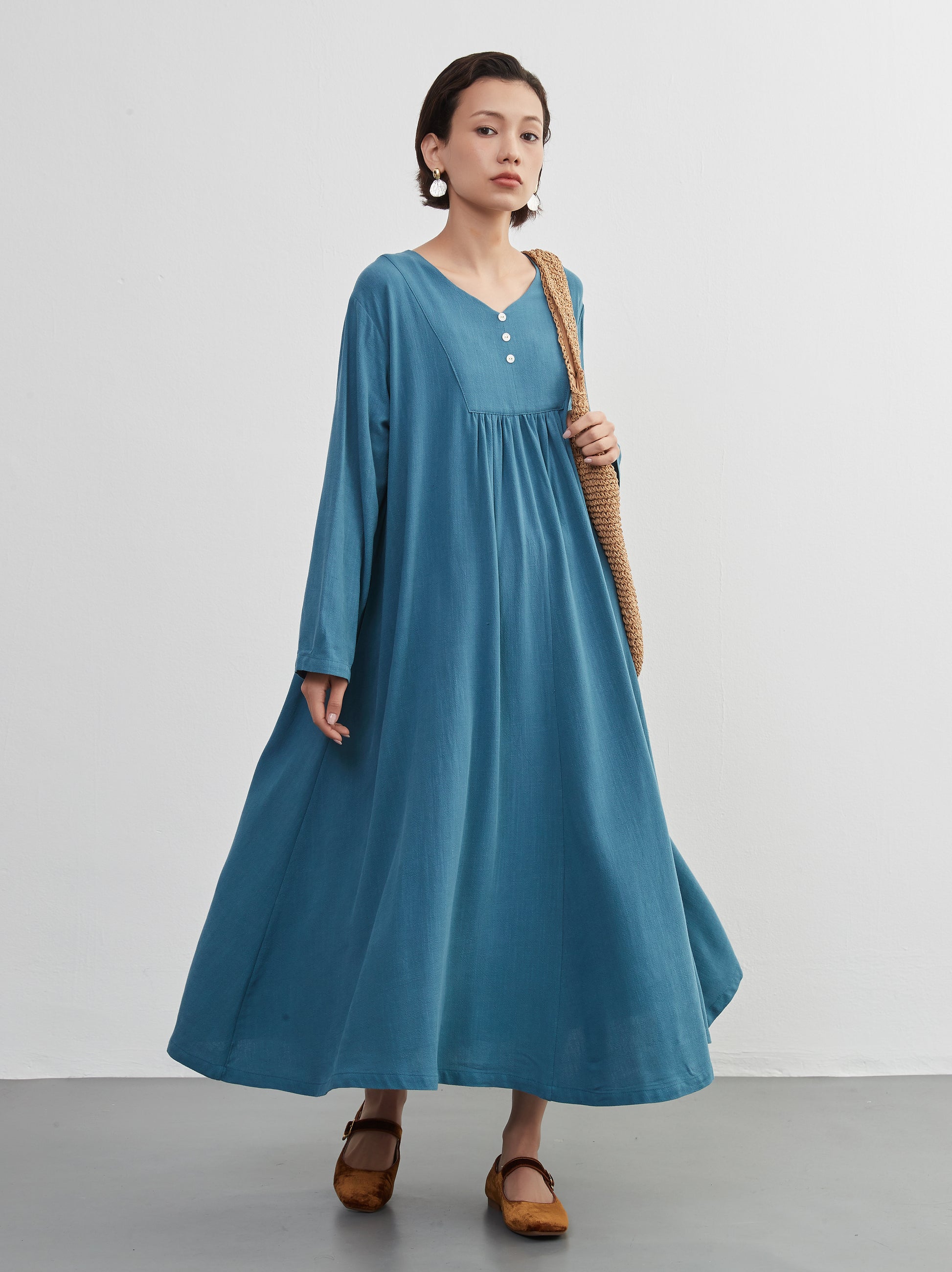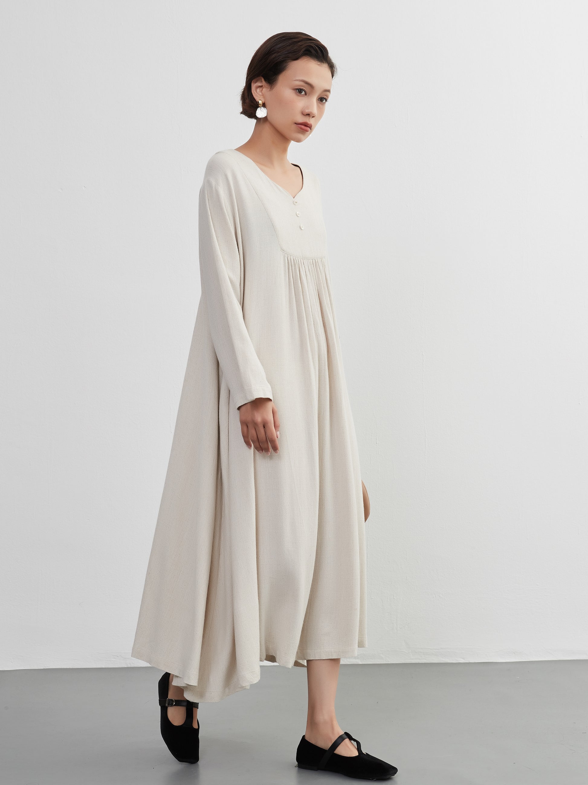 KNXO405 - Easy to move your legs in, linen mix long sleeve dress, decorative button gathered long length