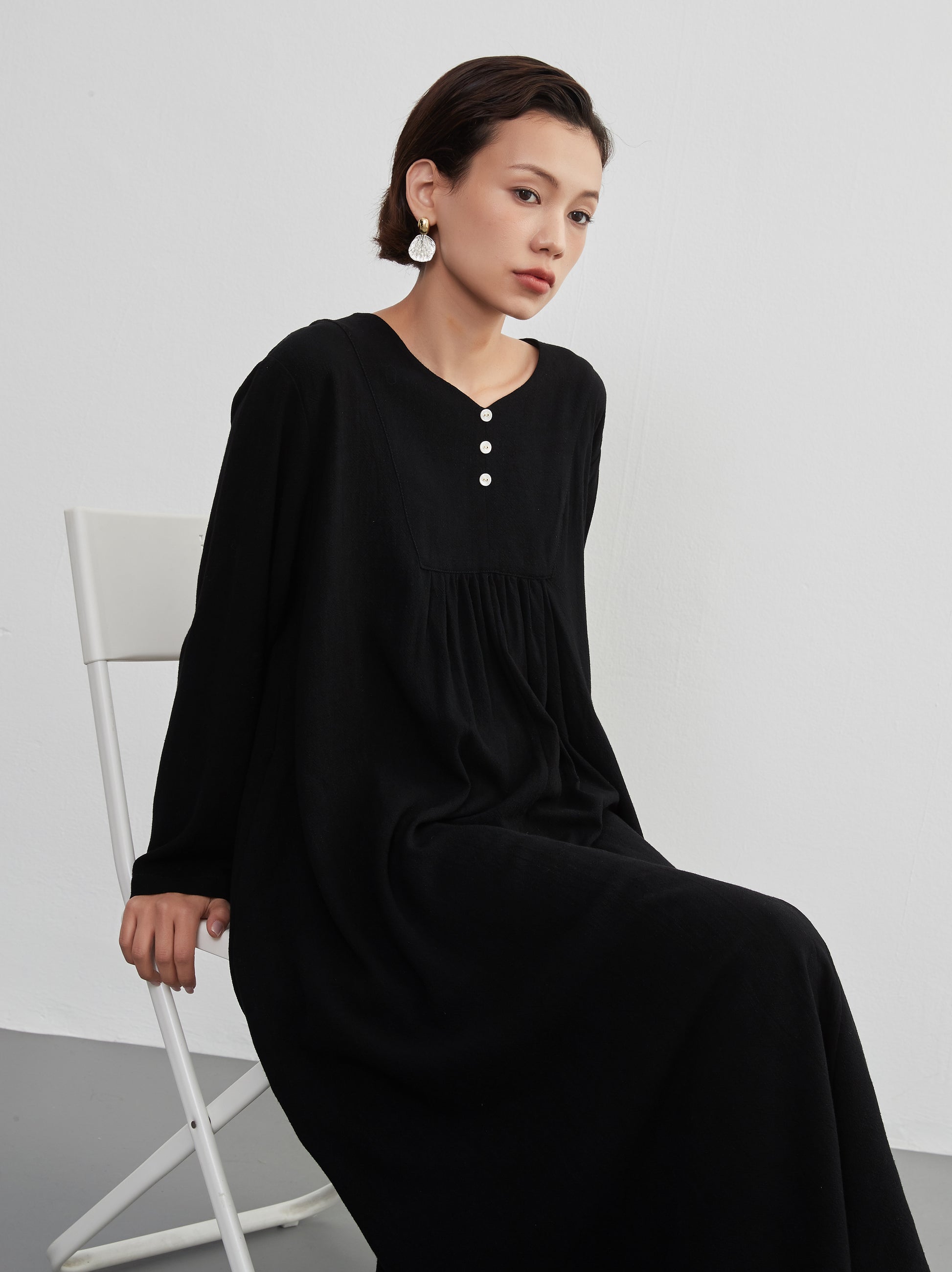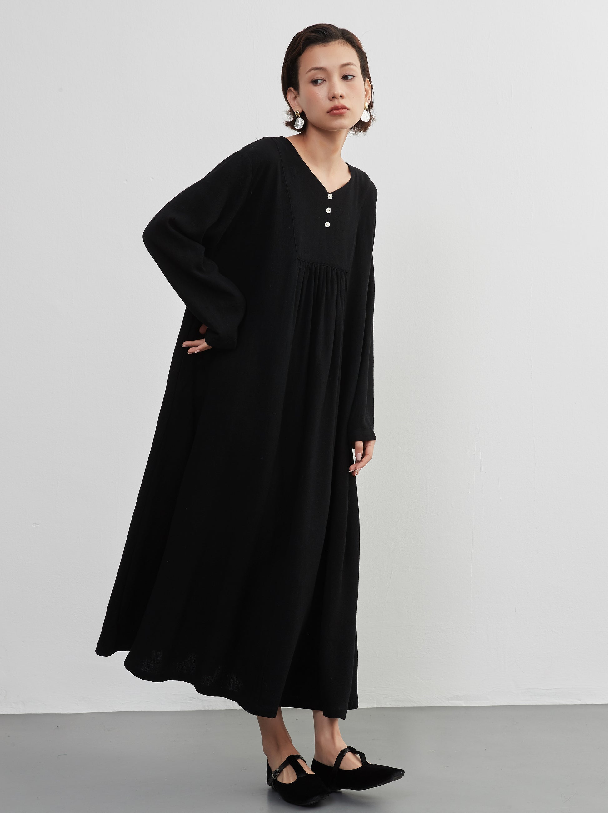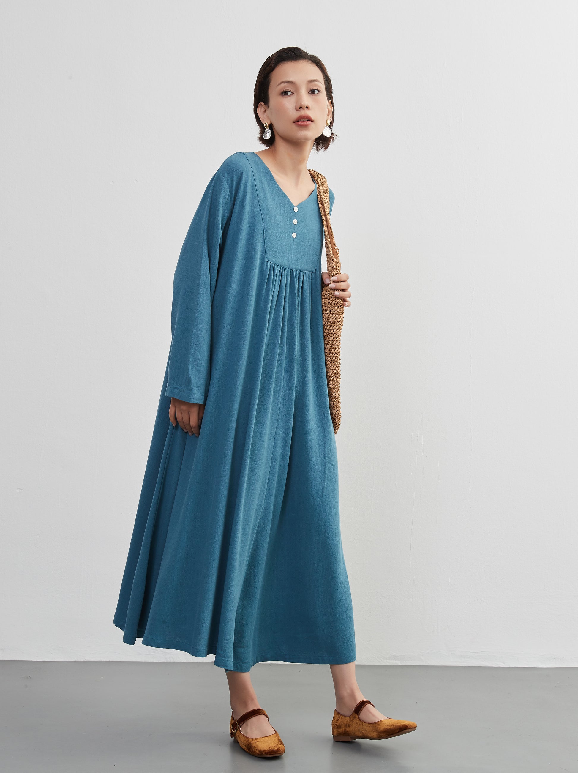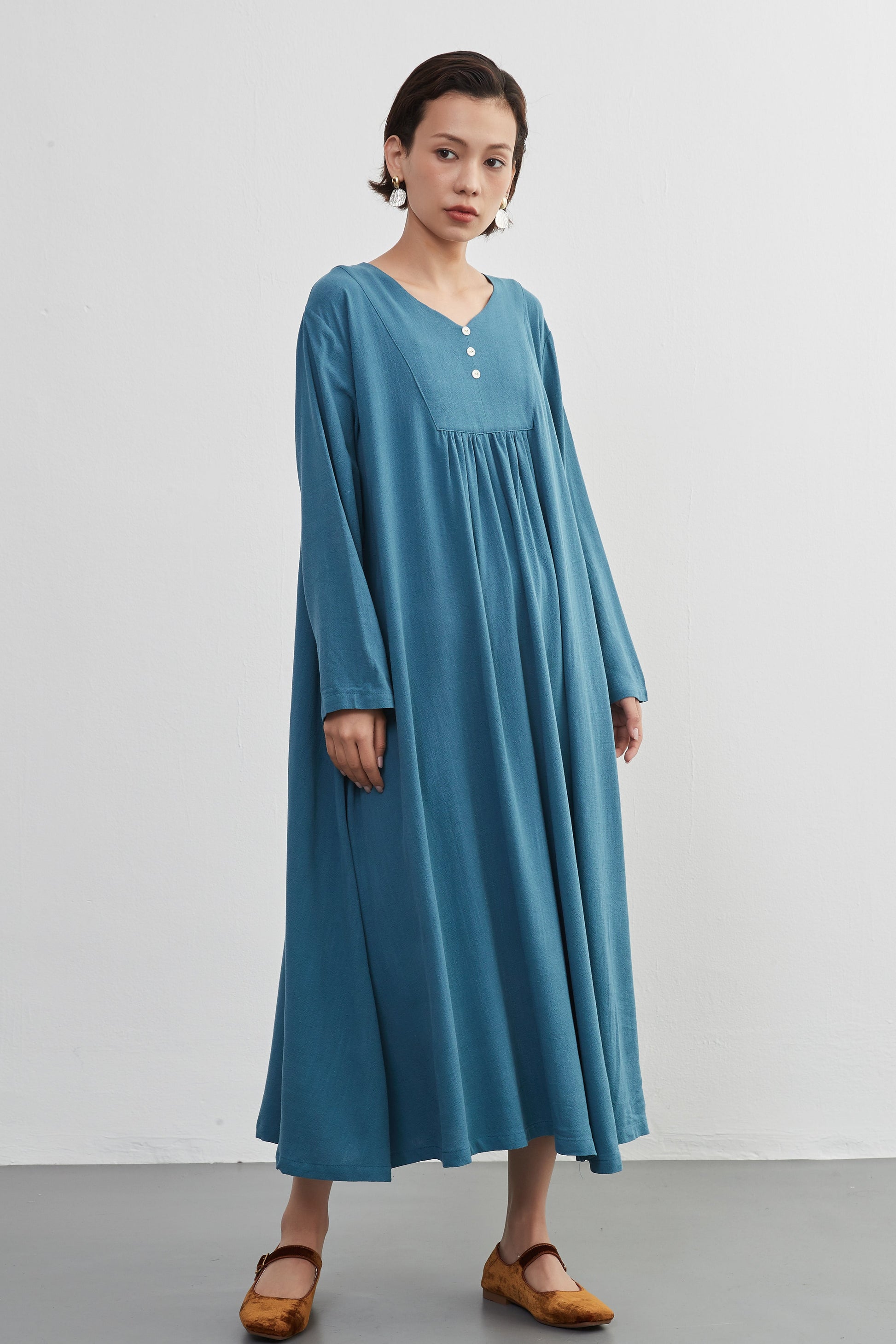 KNXO405 - Easy to move your legs in, linen mix long sleeve dress, decorative button gathered long length