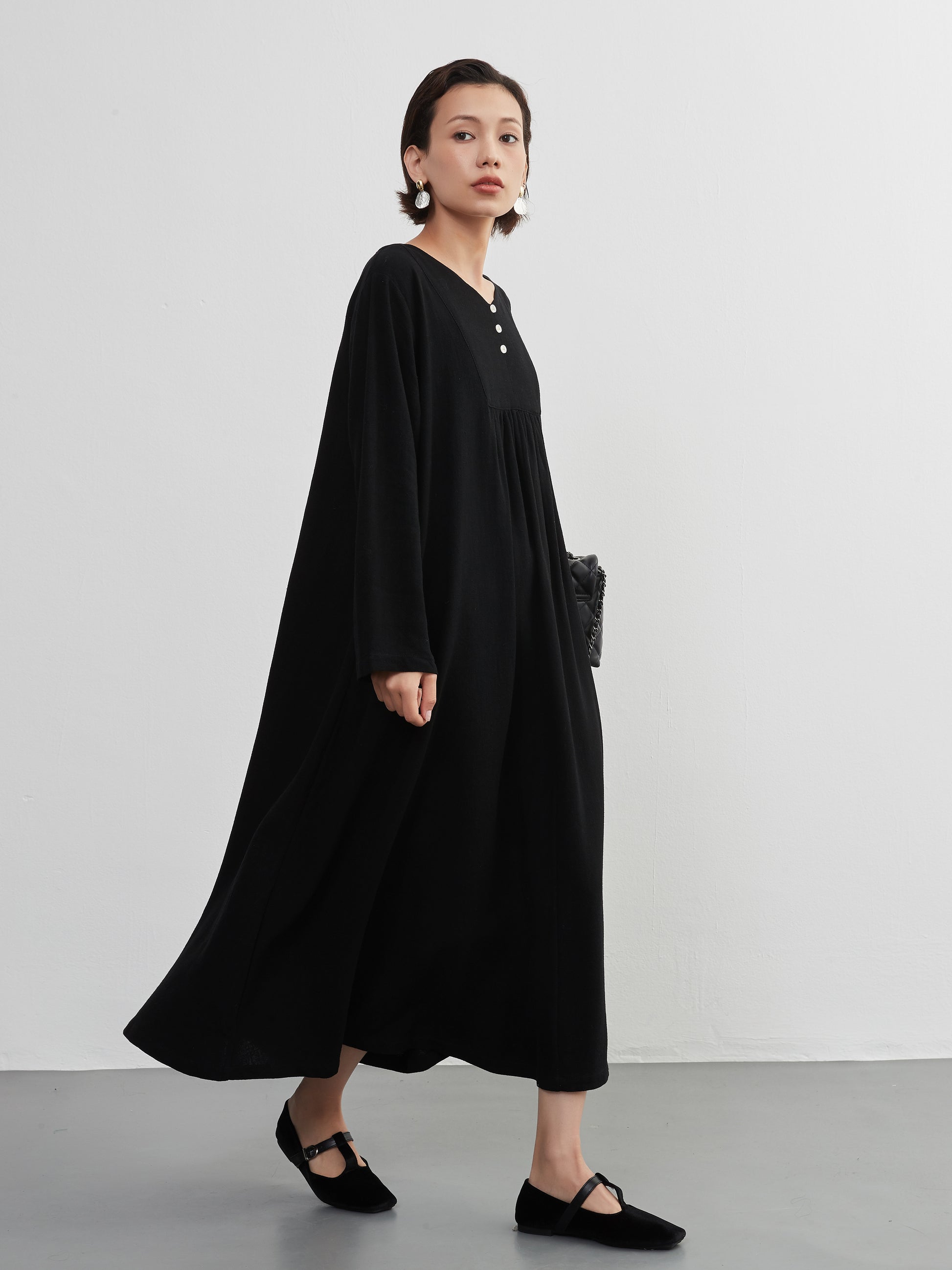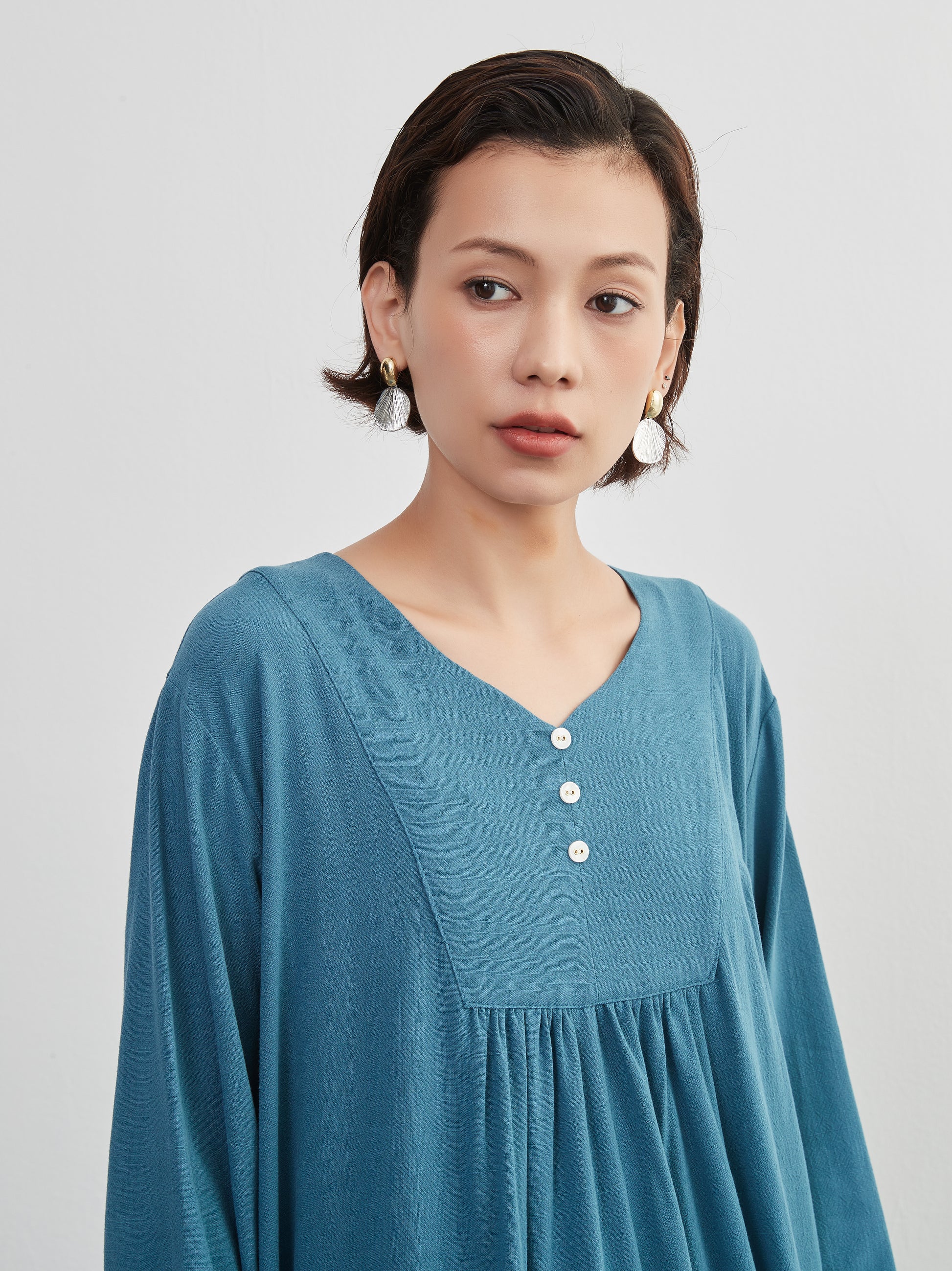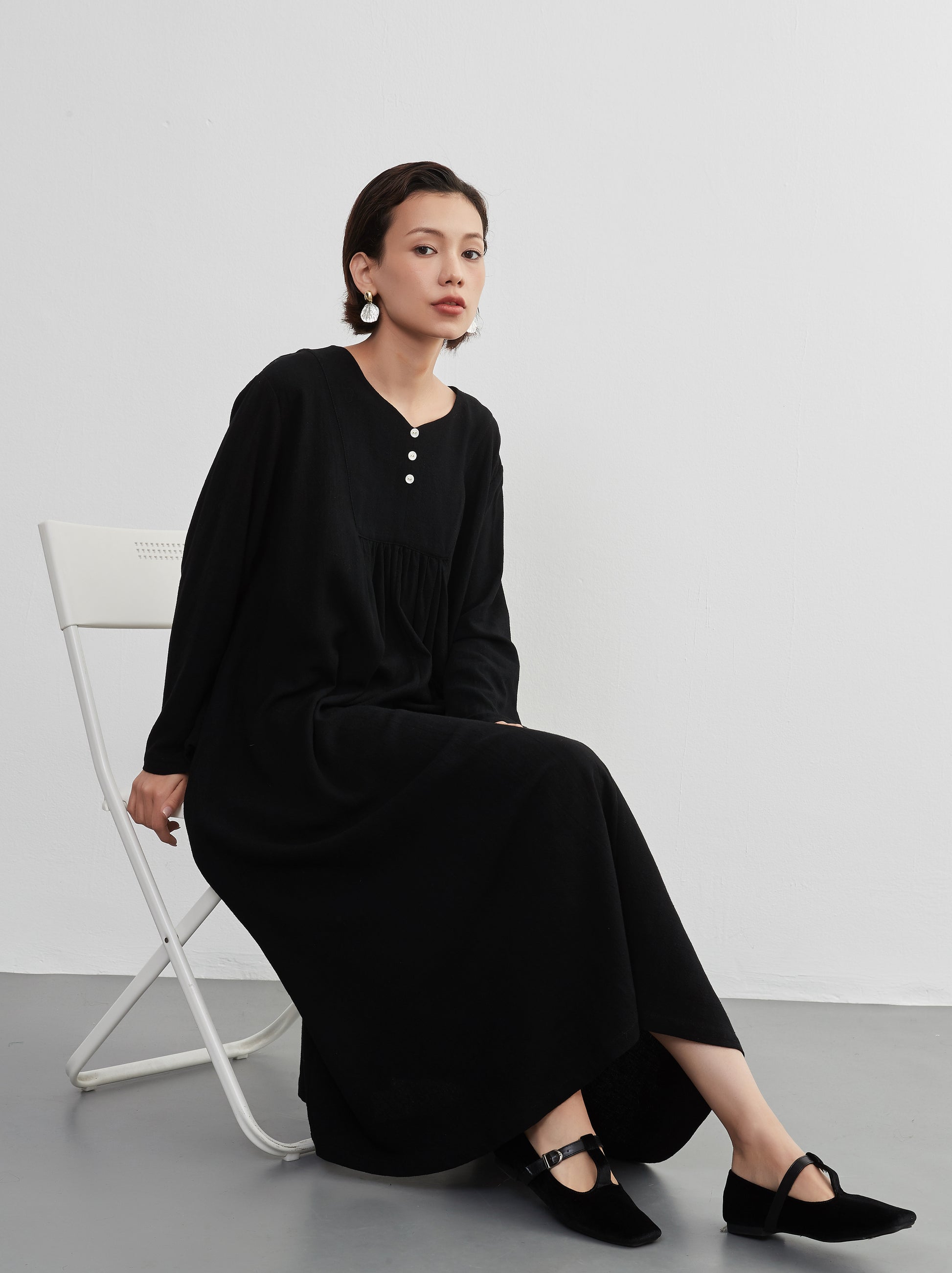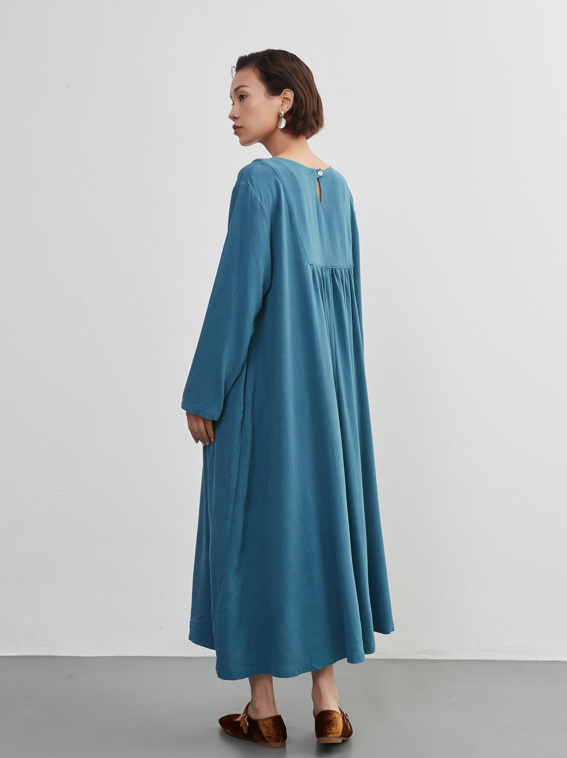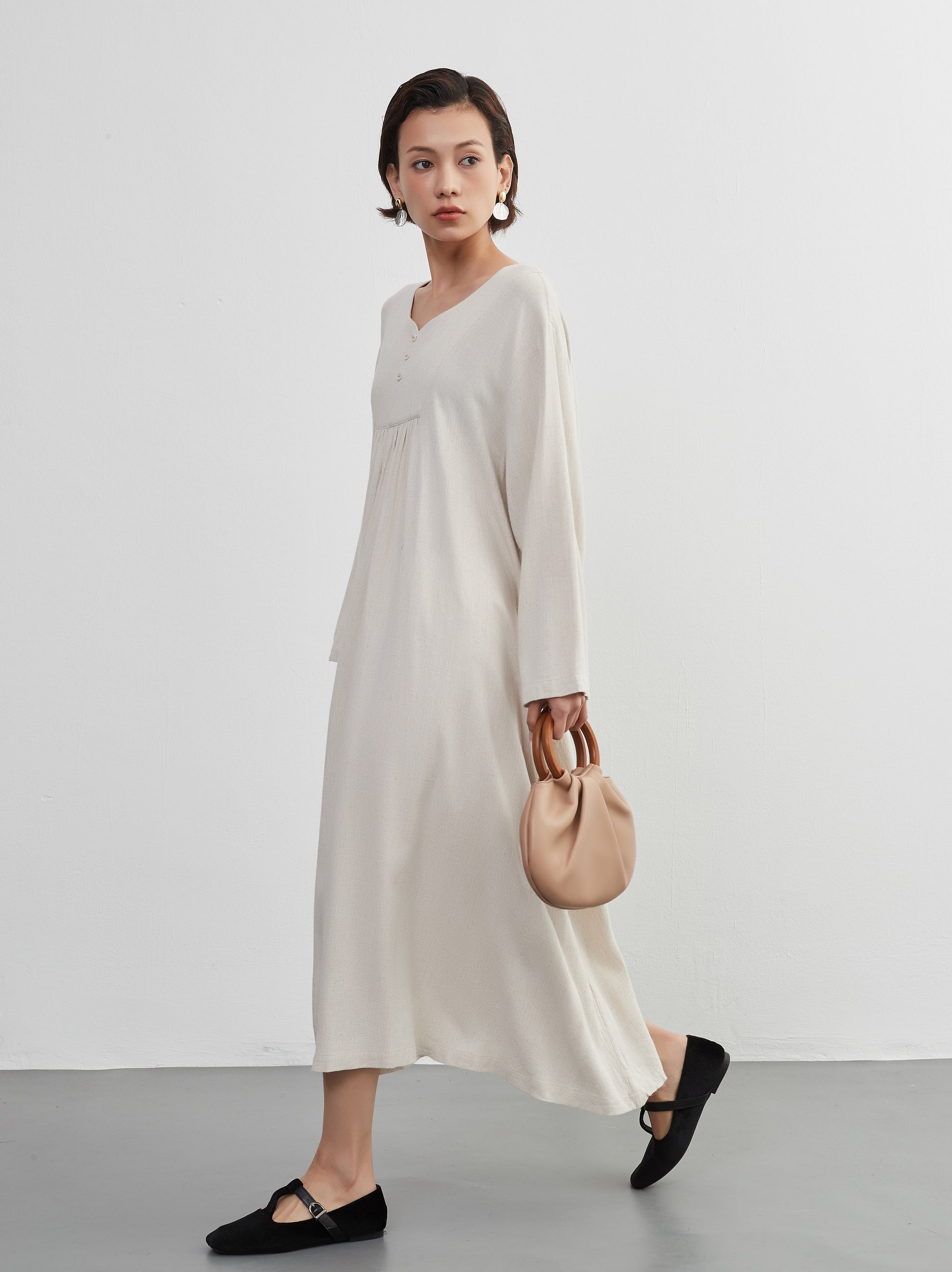 KNXO405 - Easy to move your legs in, linen mix long sleeve dress, decorative button gathered long length