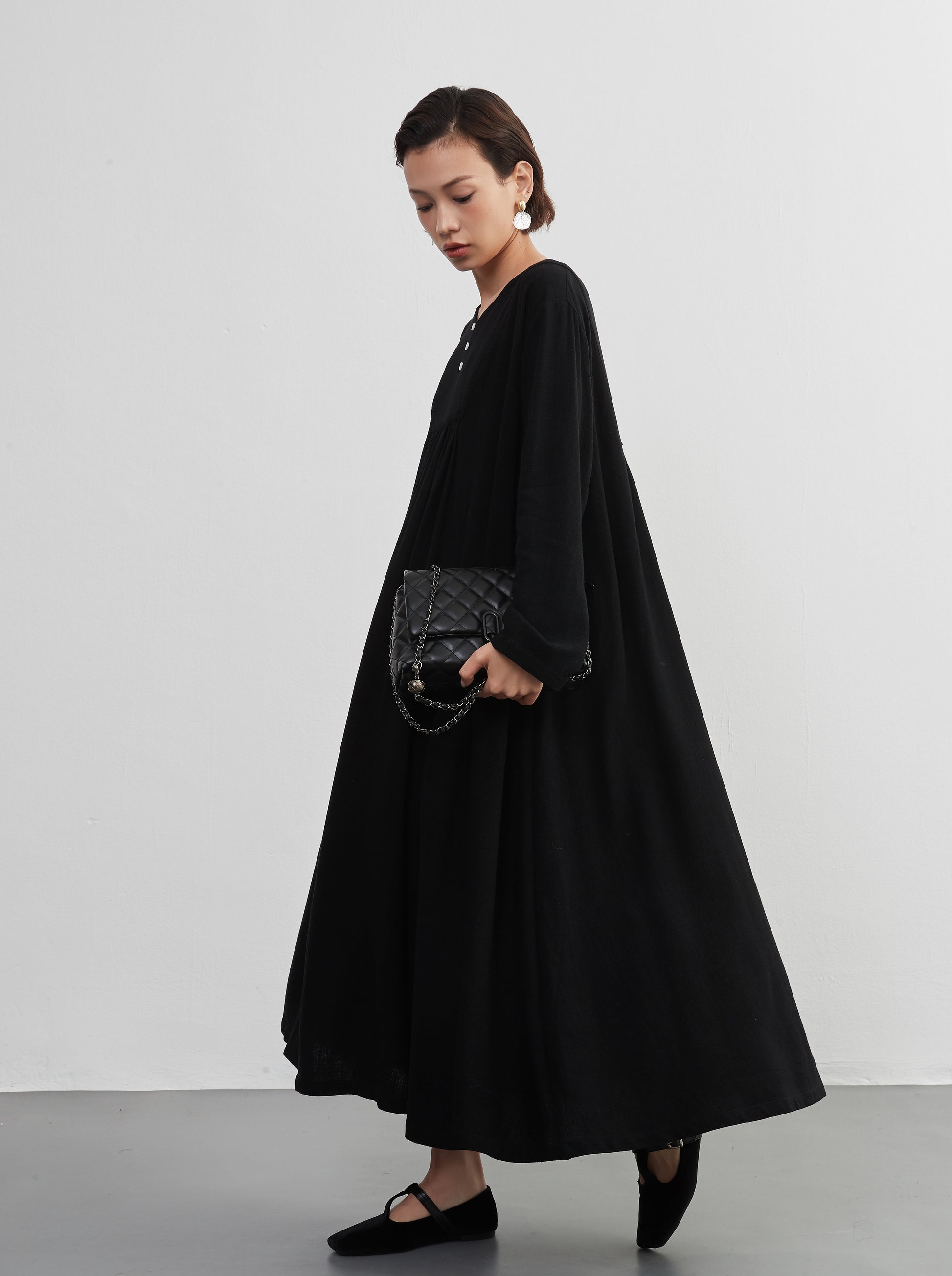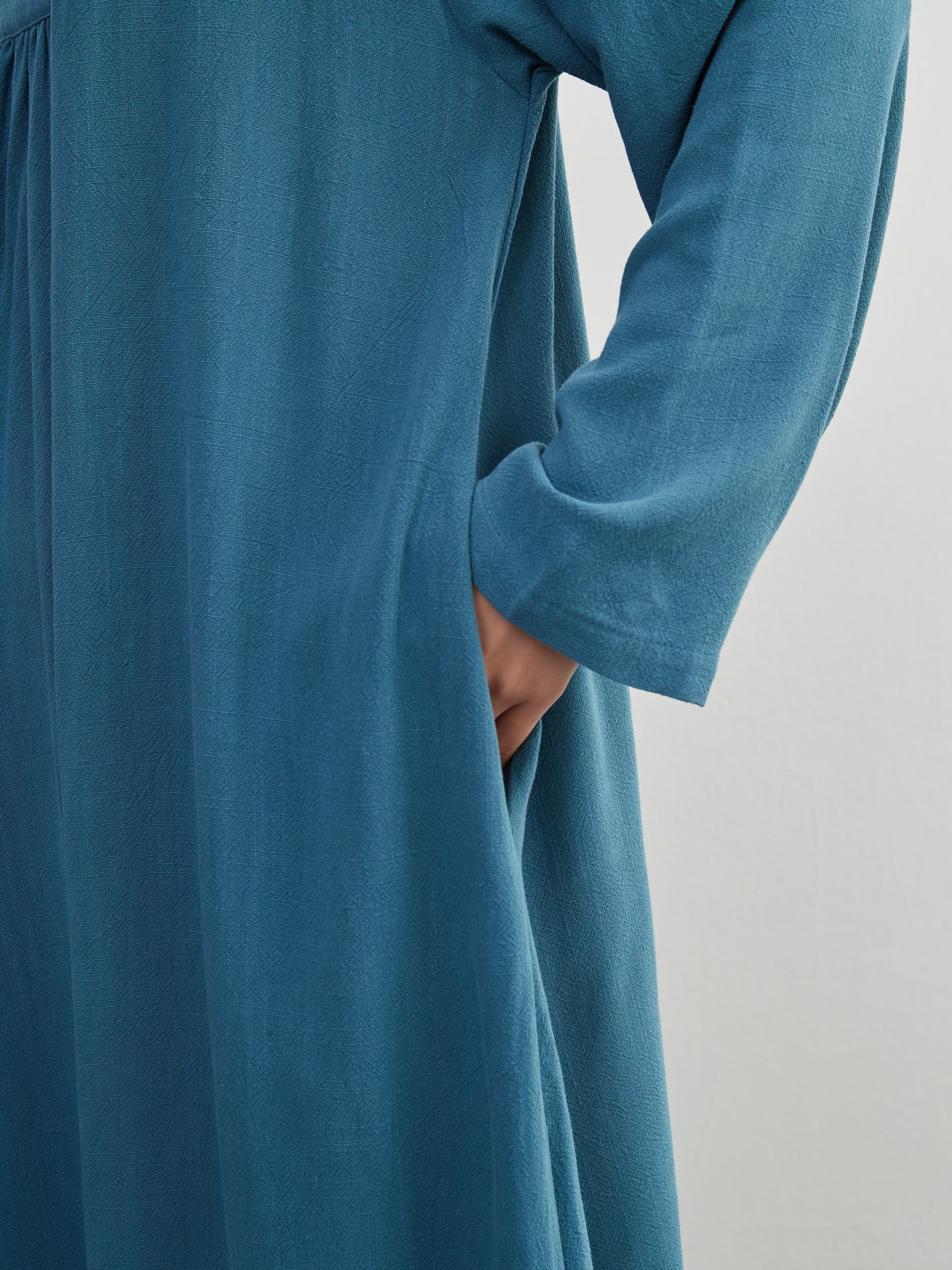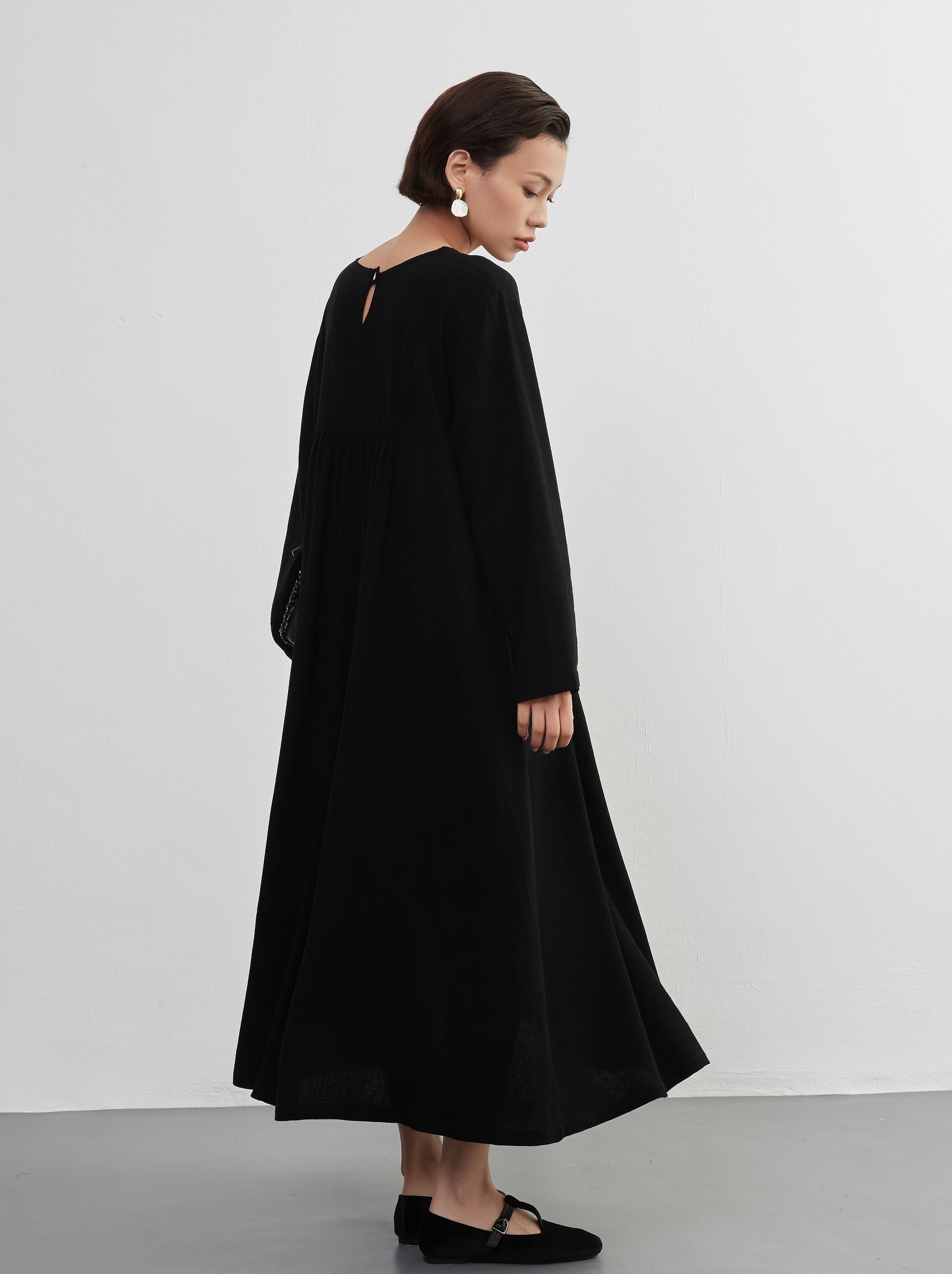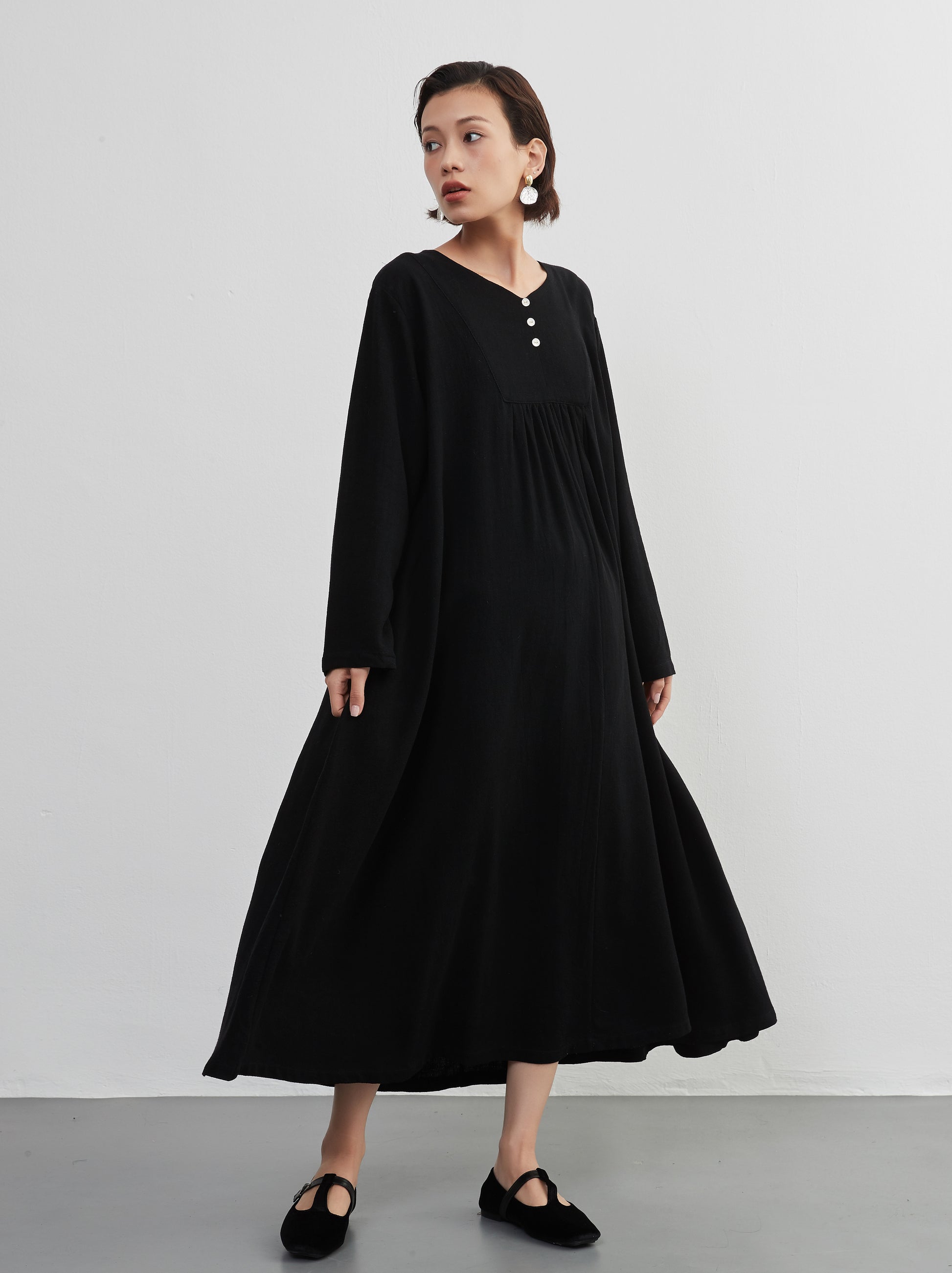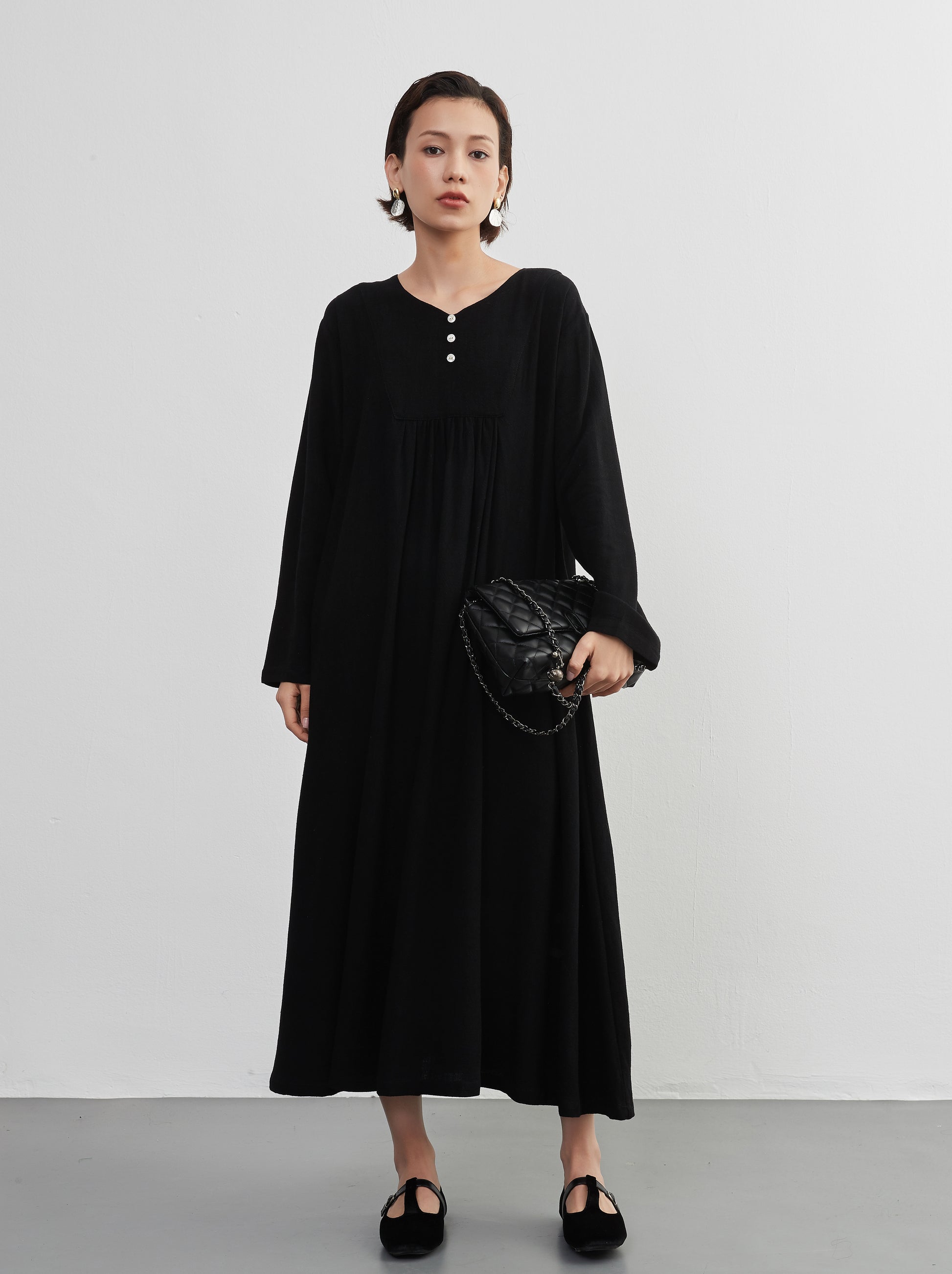 KNXO405 - Easy to move your legs in, linen mix long sleeve dress, decorative button gathered long length