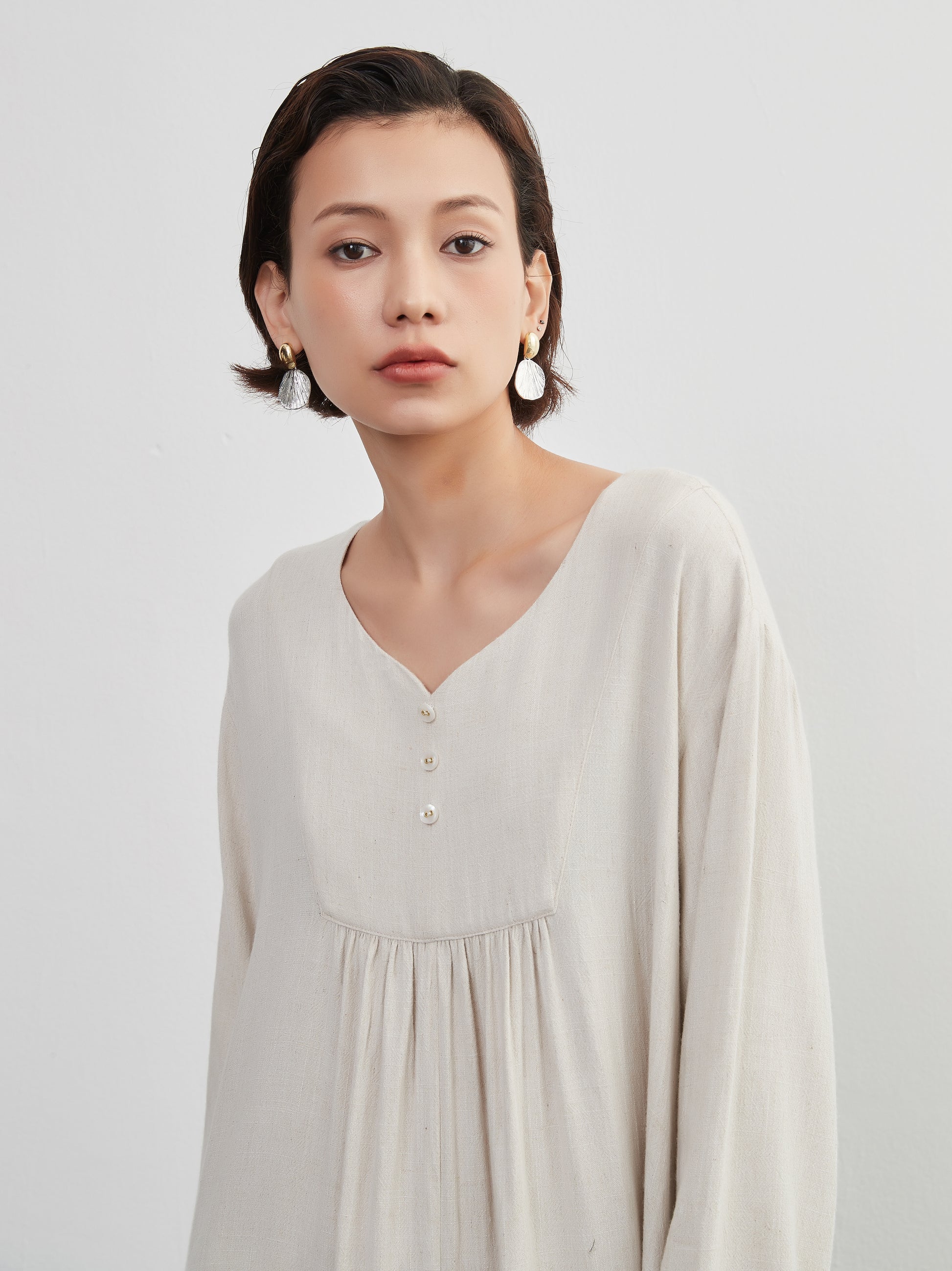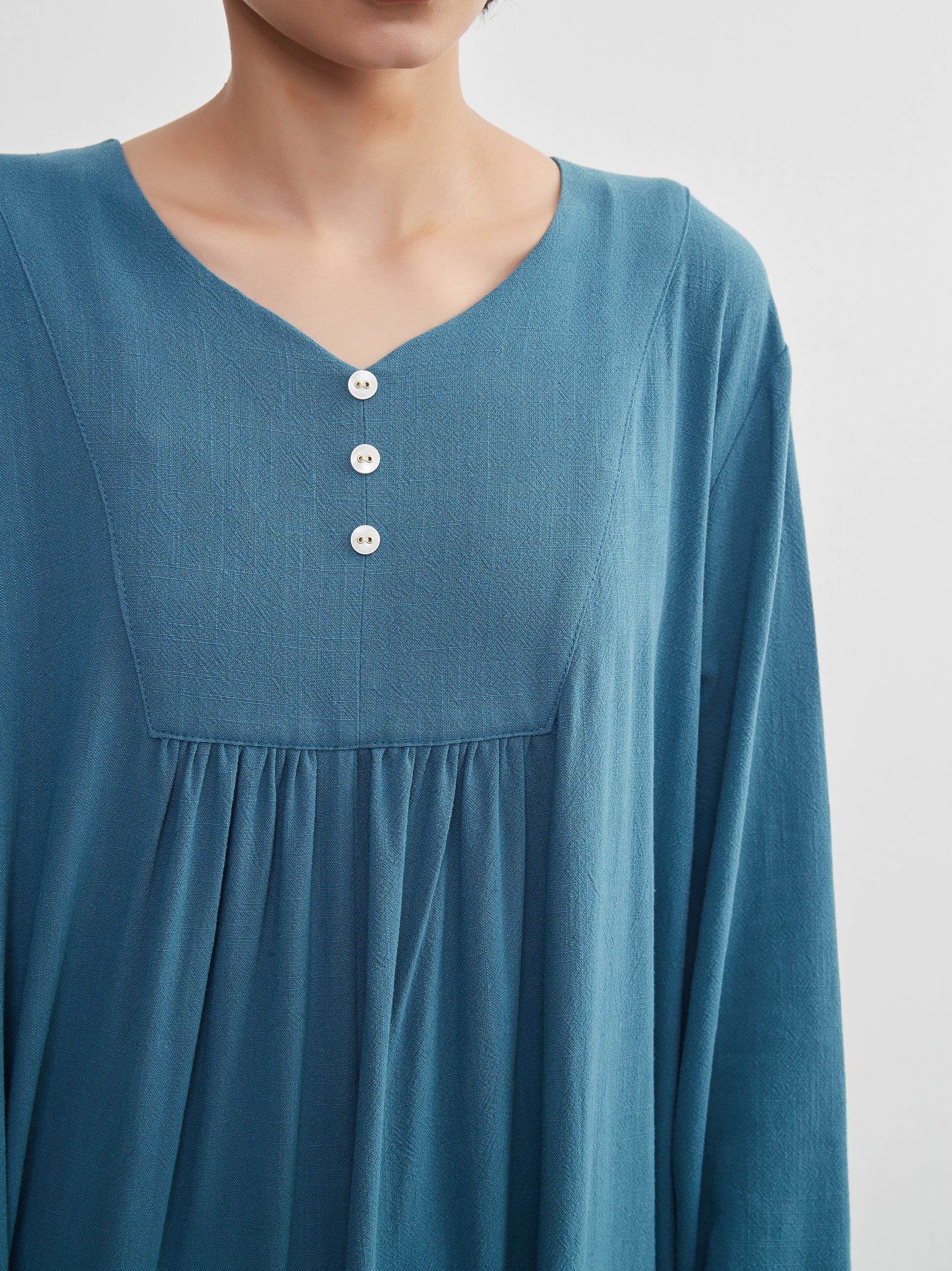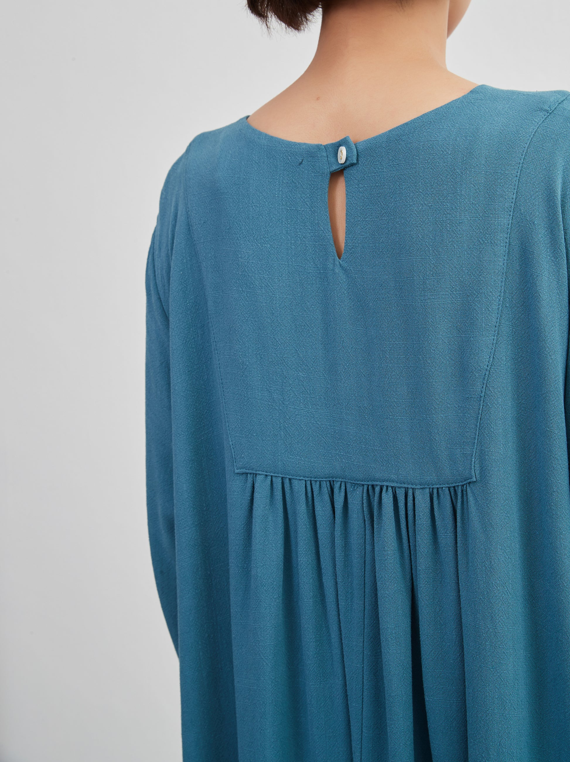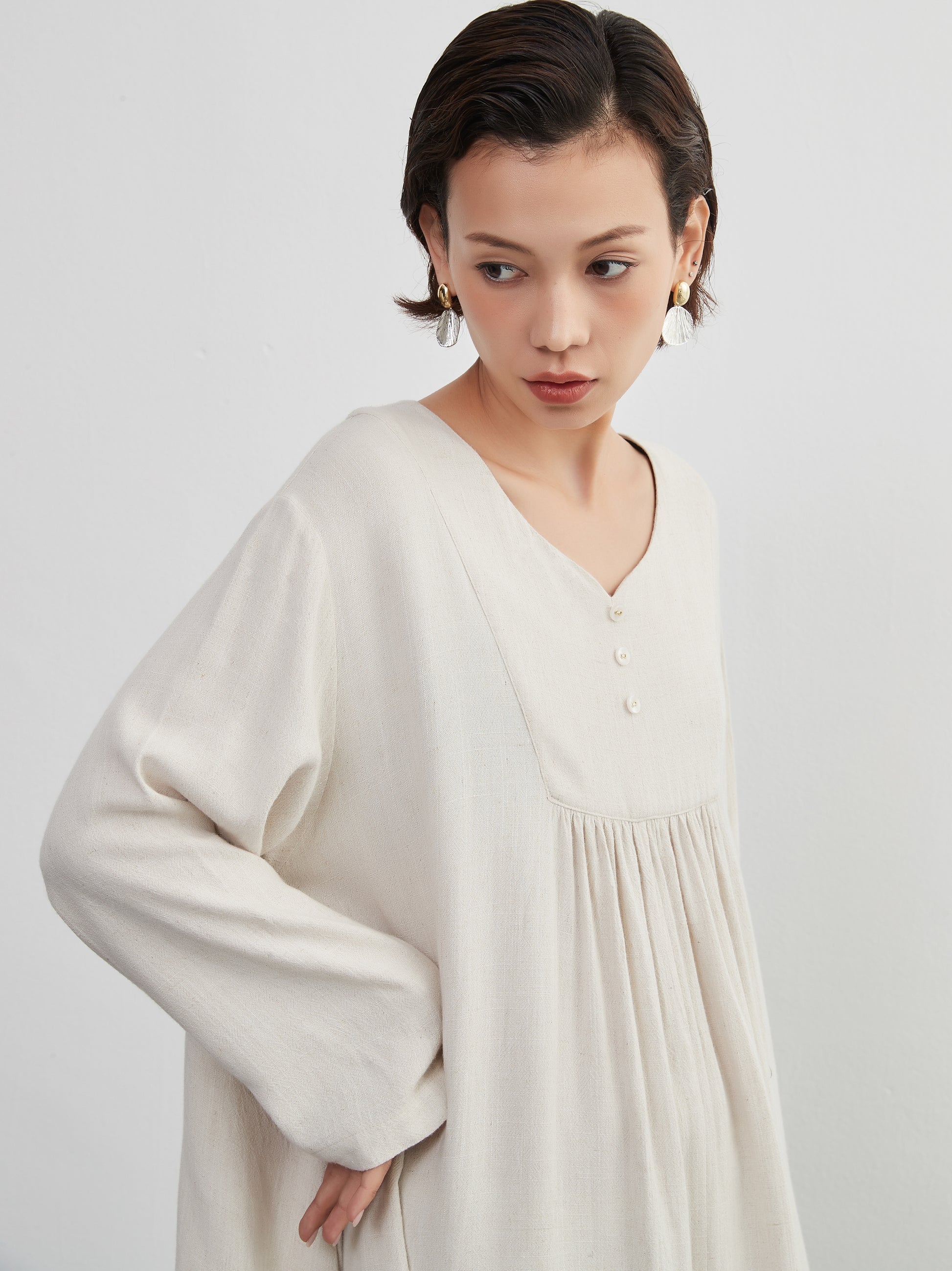 Decorative button gathered long length linen MIX long sleeve dress