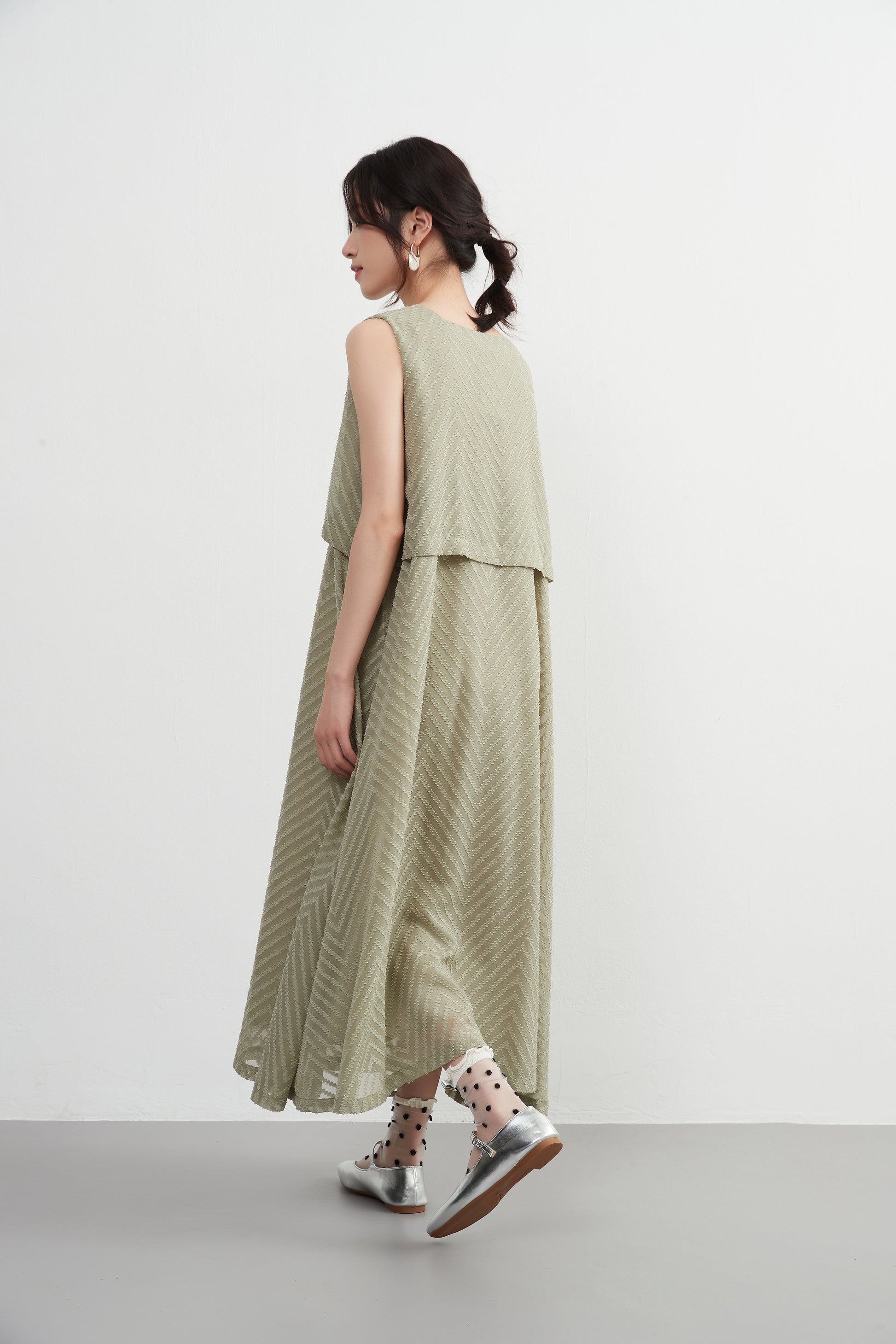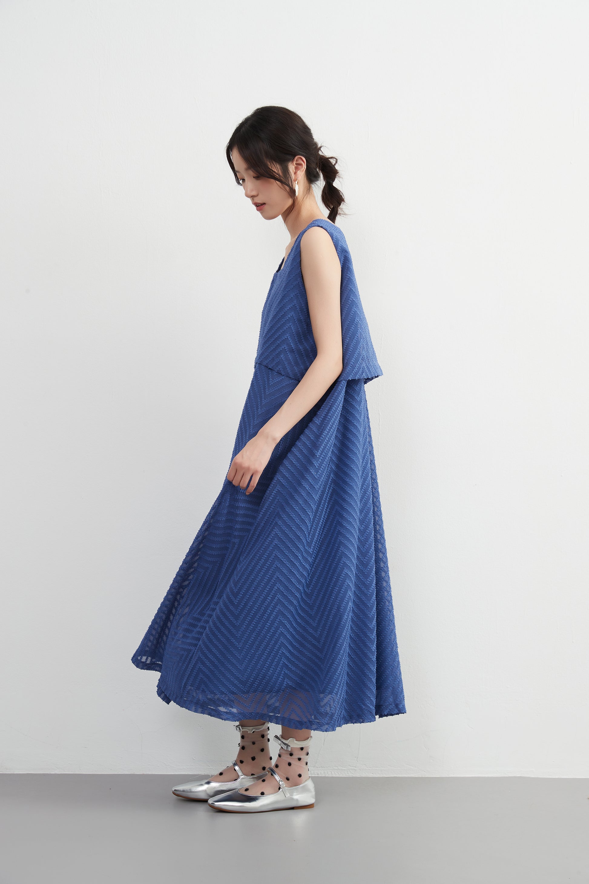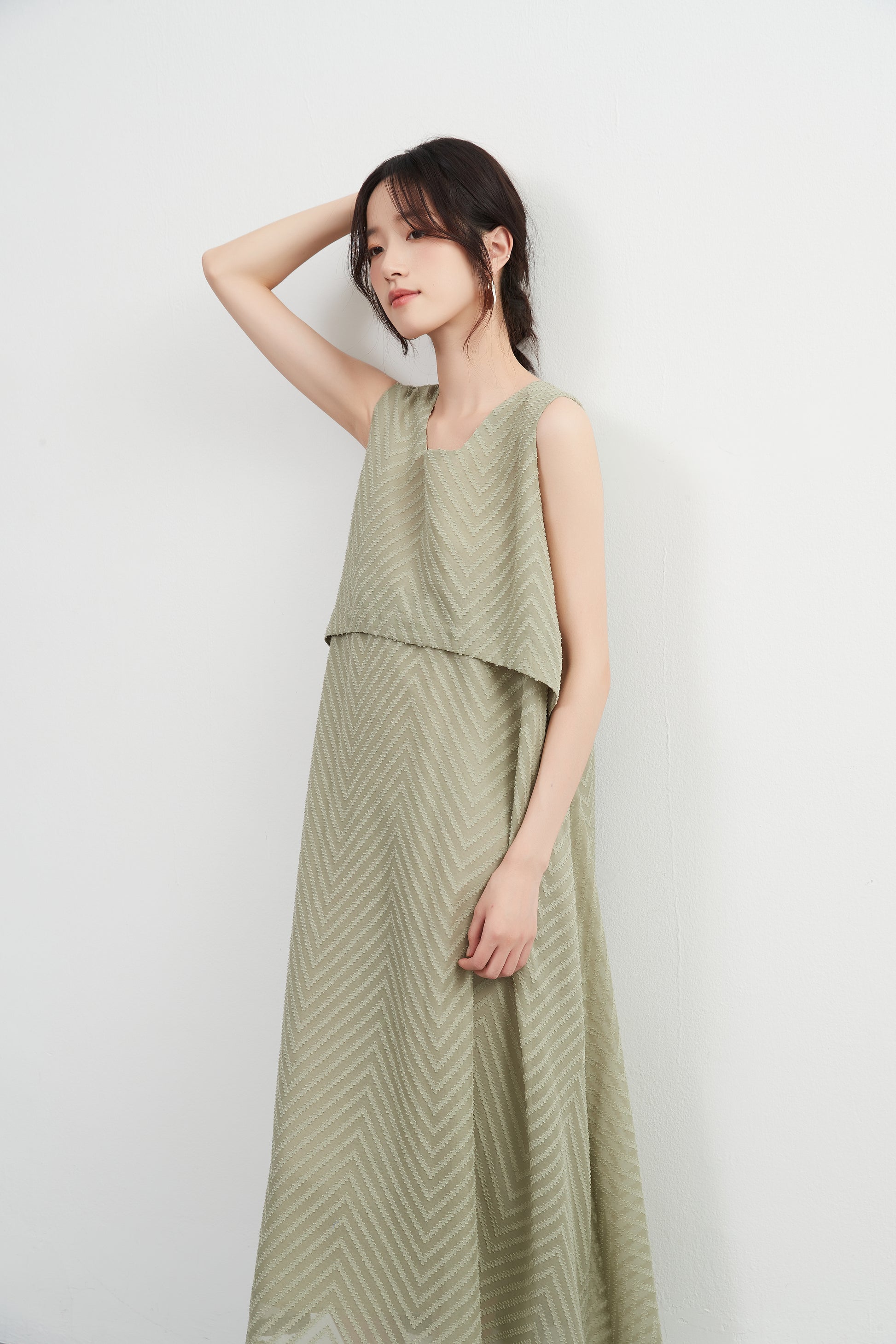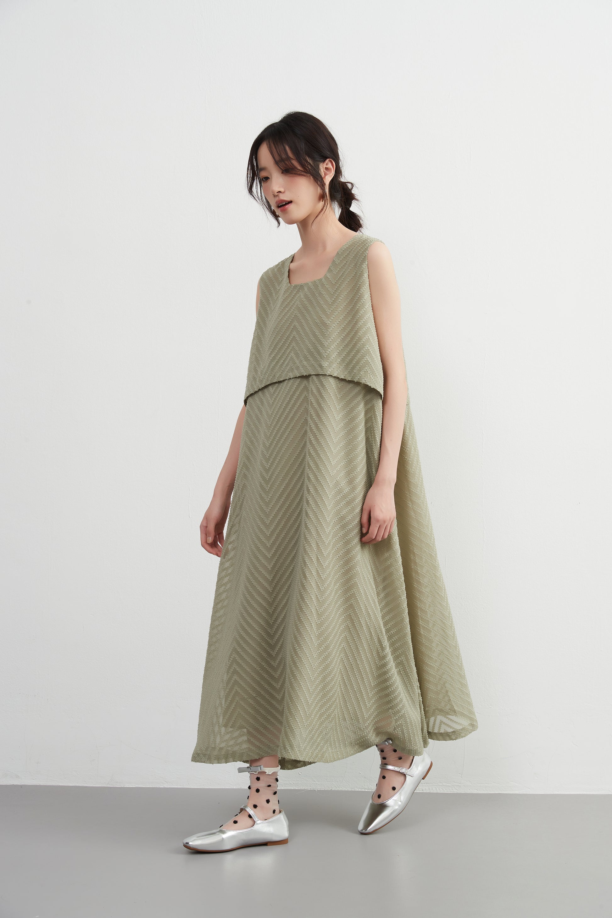 This dress is made of jacquard chiffon material and features a layered design that looks like it was made of two layers. It combines an elegant atmosphere with a refined sense of transparency. The sleeveless design creates a refreshing look that is perfect for summer. It also comes with a lining so you can wear it with confidence.