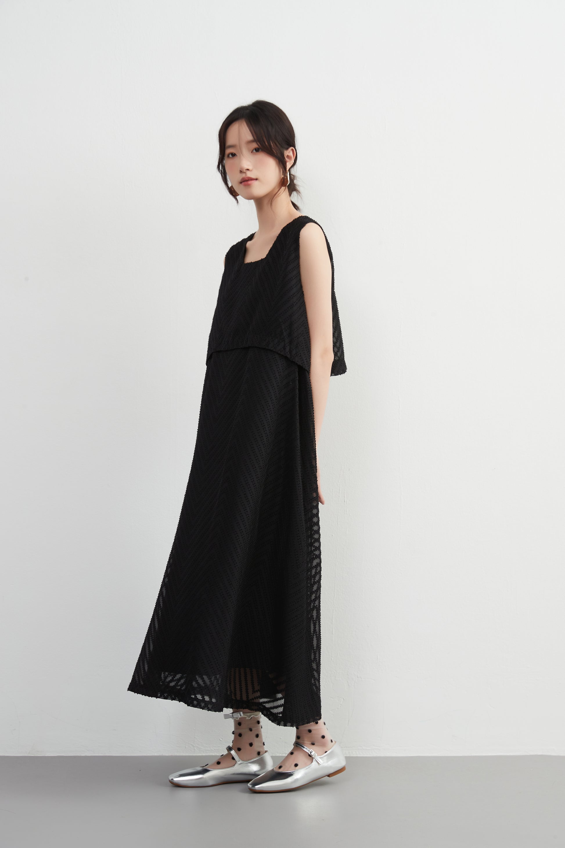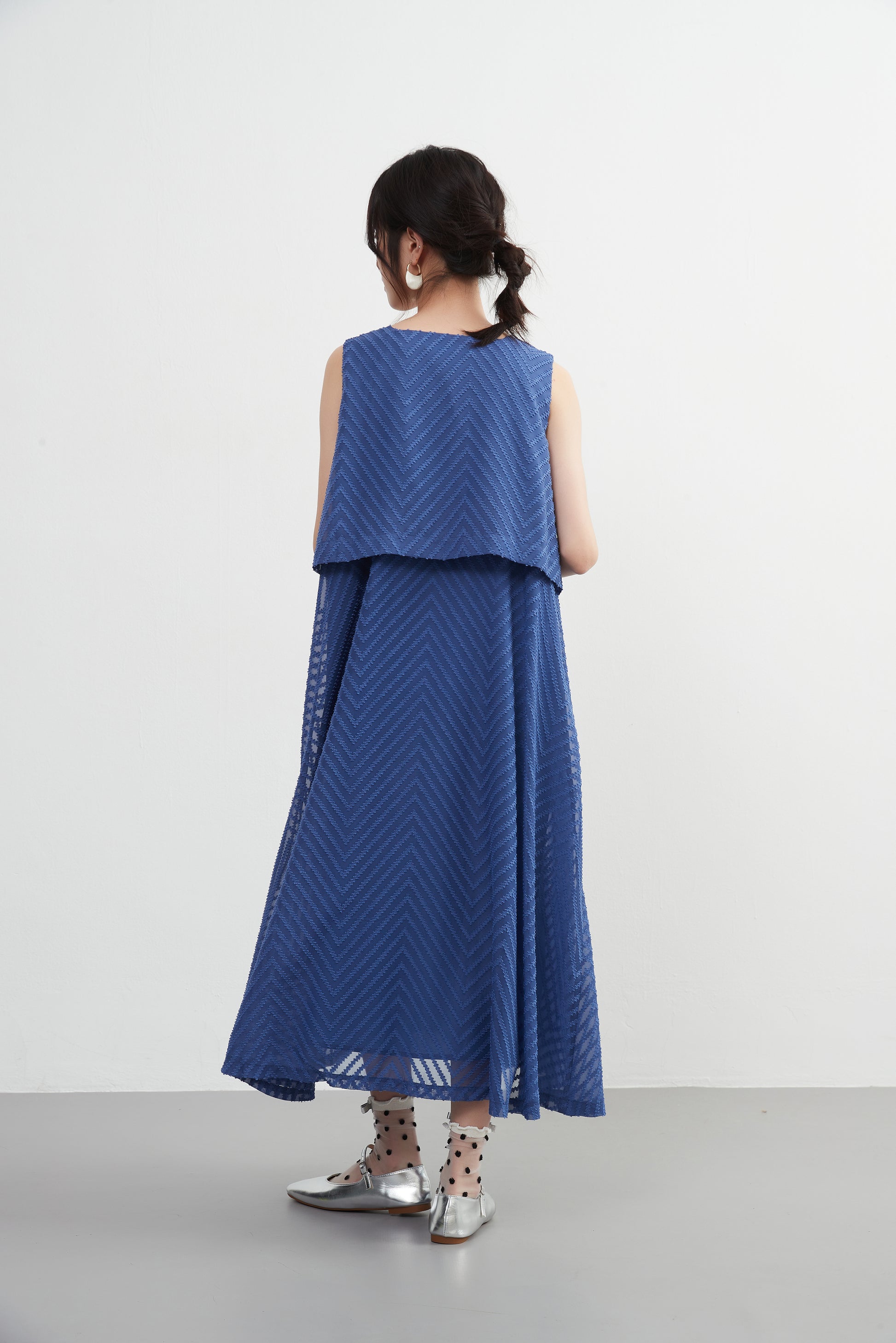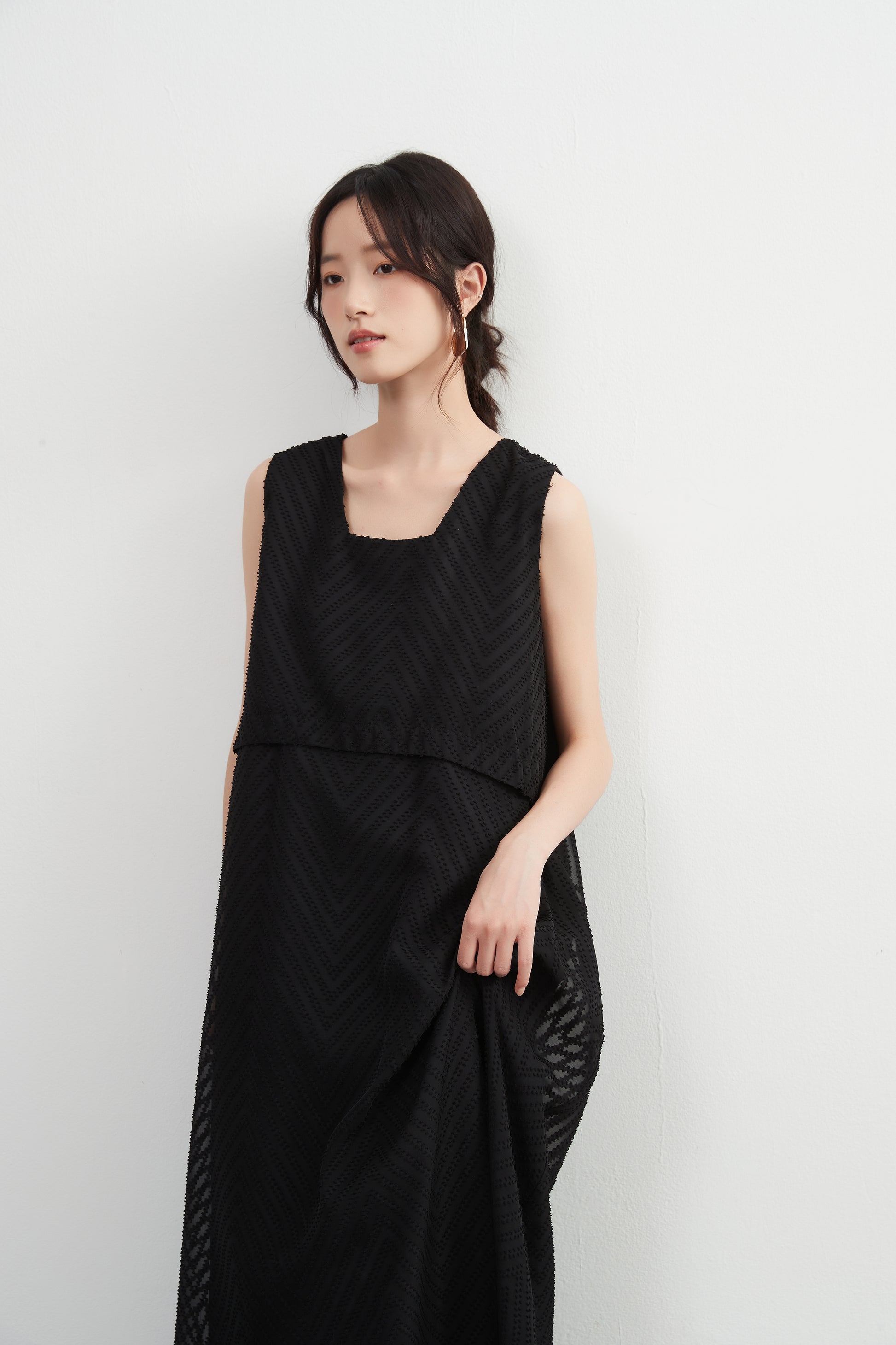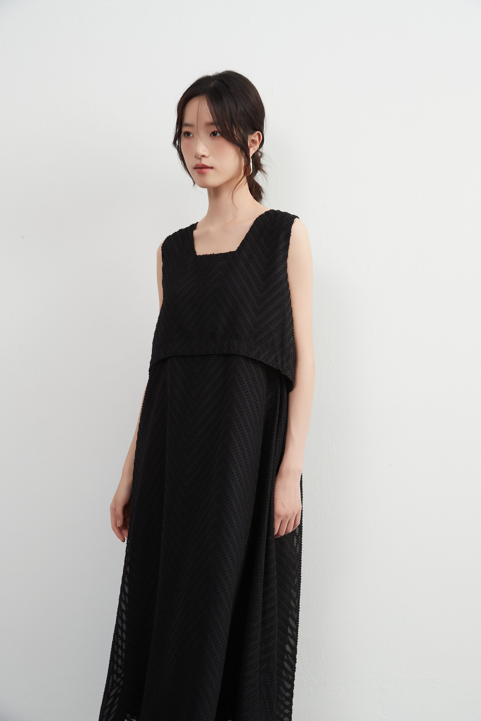 This dress is made of jacquard chiffon material and features a layered design that looks like it was made of two layers. It combines an elegant atmosphere with a refined sense of transparency. The sleeveless design creates a refreshing look that is perfect for summer. It also comes with a lining so you can wear it with confidence.