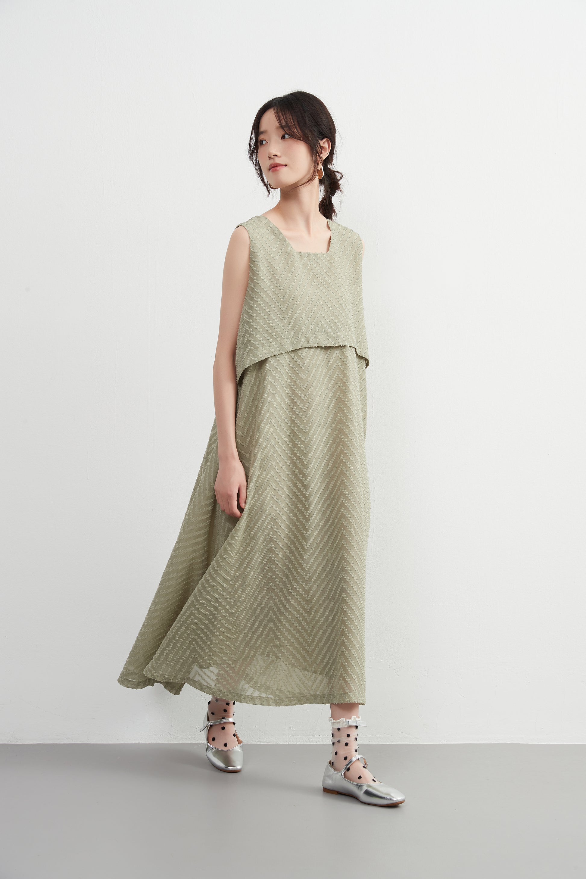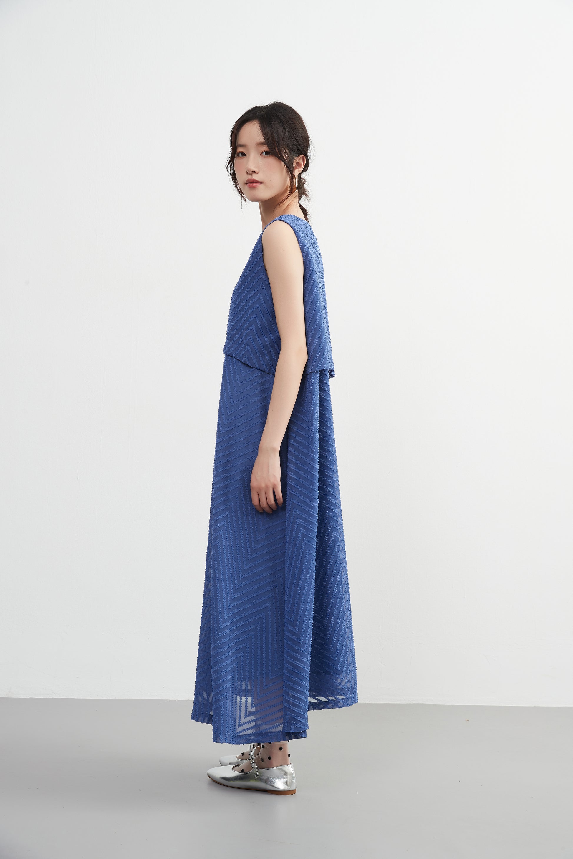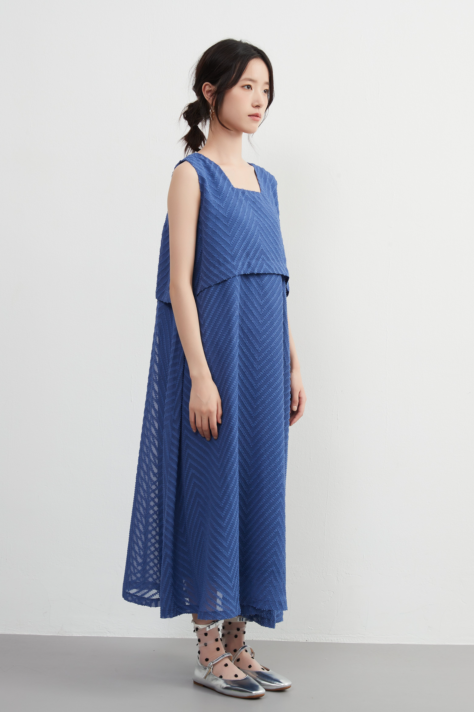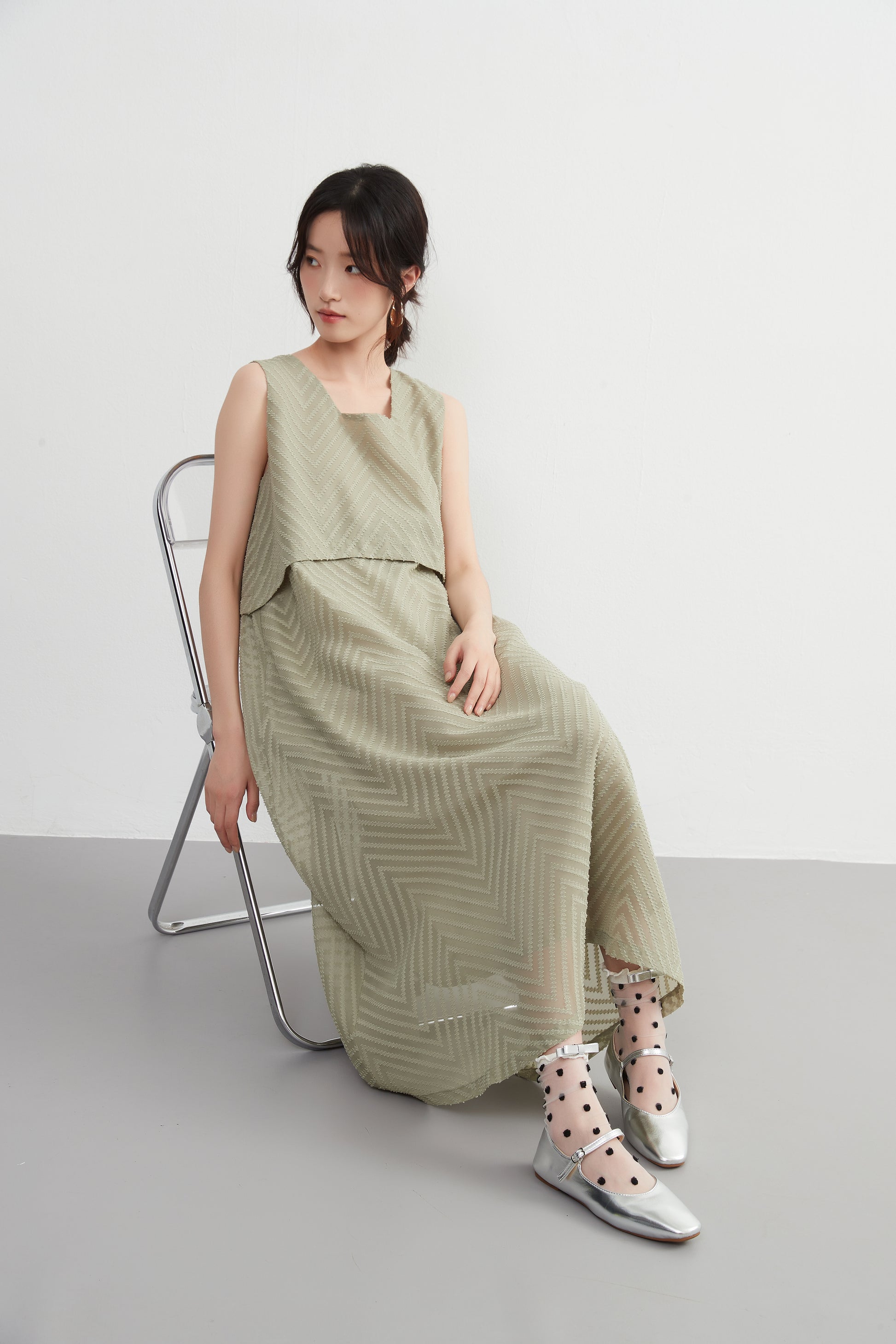 This dress is made of jacquard chiffon material and features a layered design that looks like it was made of two layers. It combines an elegant atmosphere with a refined sense of transparency. The sleeveless design creates a refreshing look that is perfect for summer. It also comes with a lining so you can wear it with confidence.