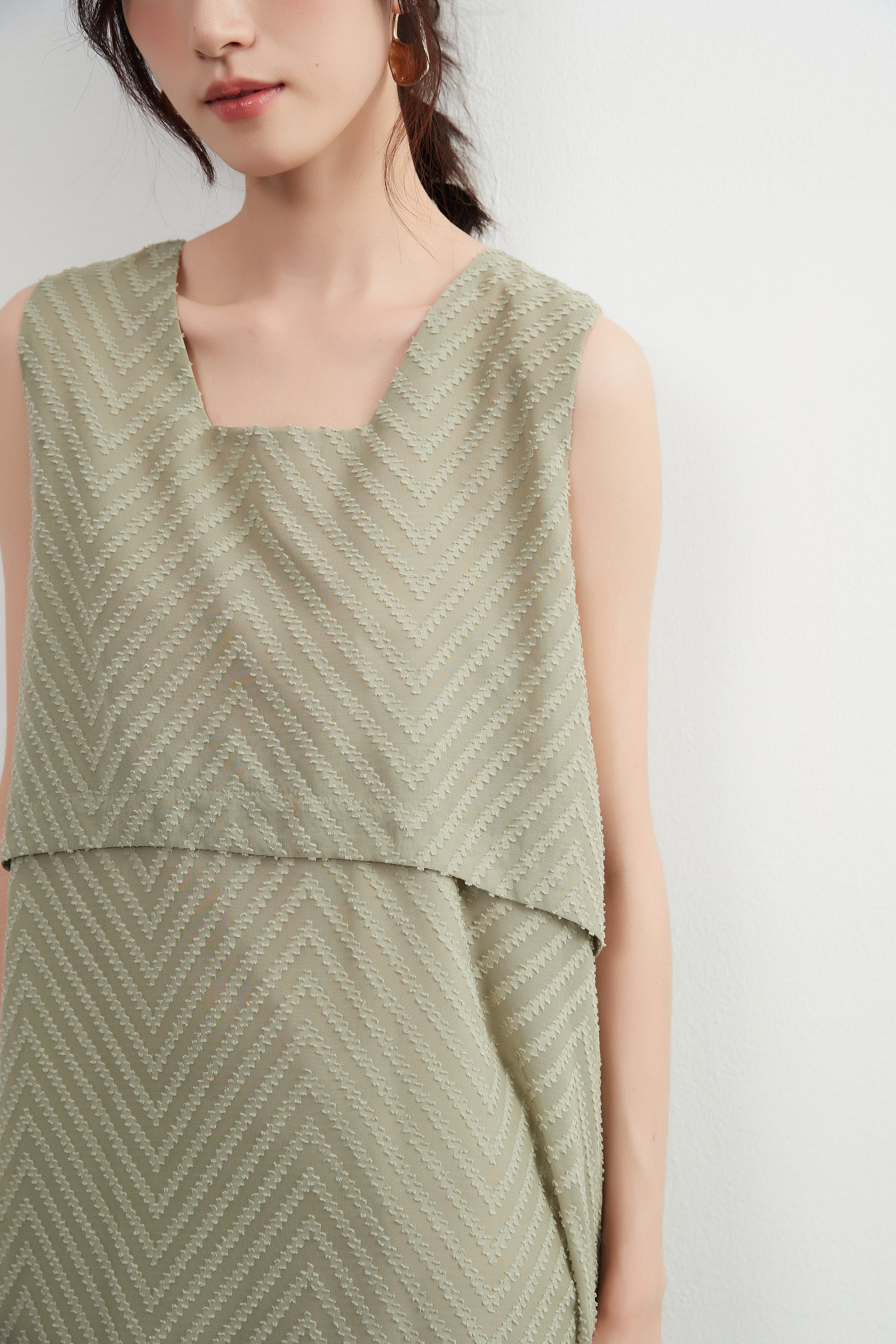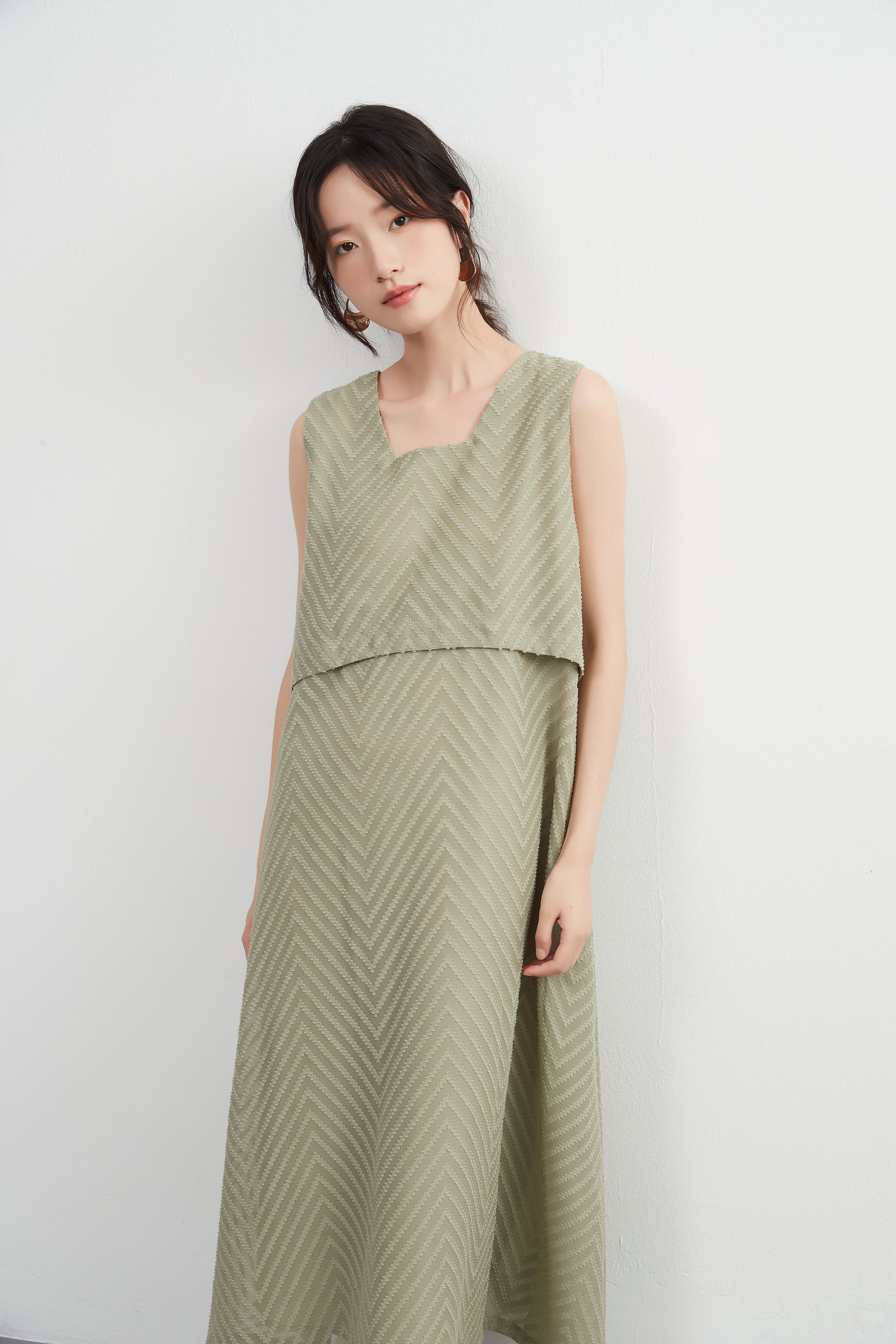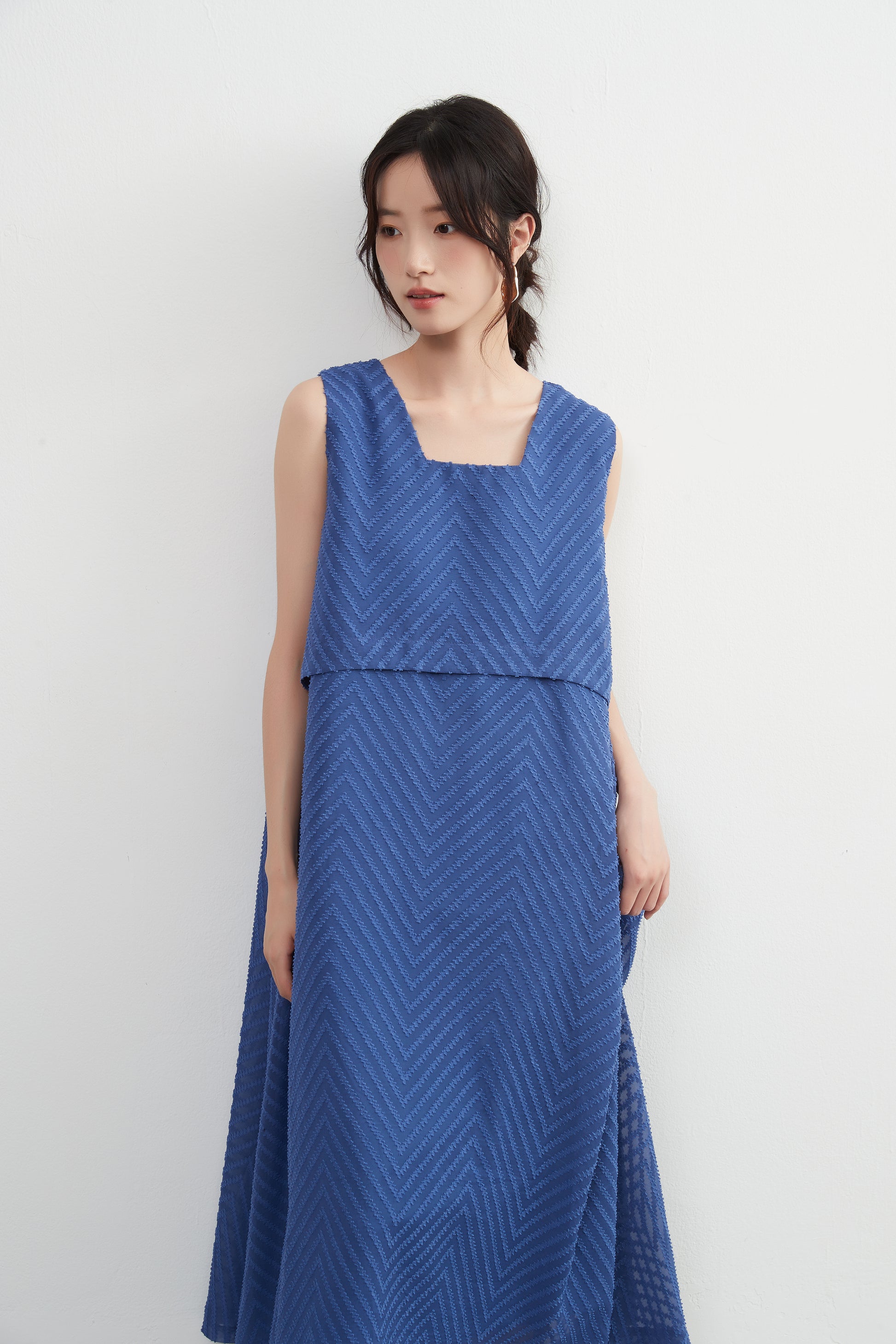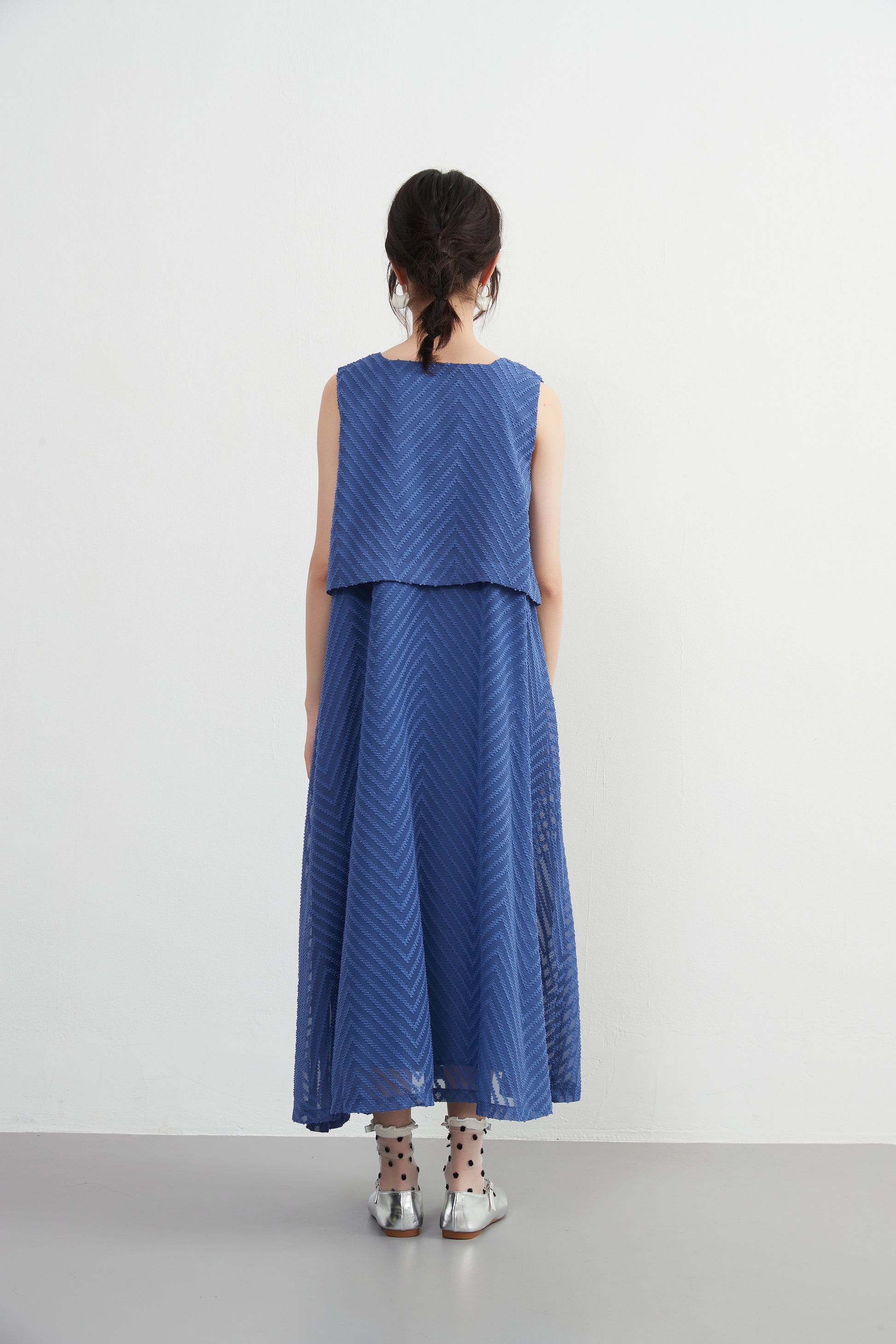 This dress is made of jacquard chiffon material and features a layered design that looks like it was made of two layers. It combines an elegant atmosphere with a refined sense of transparency. The sleeveless design creates a refreshing look that is perfect for summer. It also comes with a lining so you can wear it with confidence.