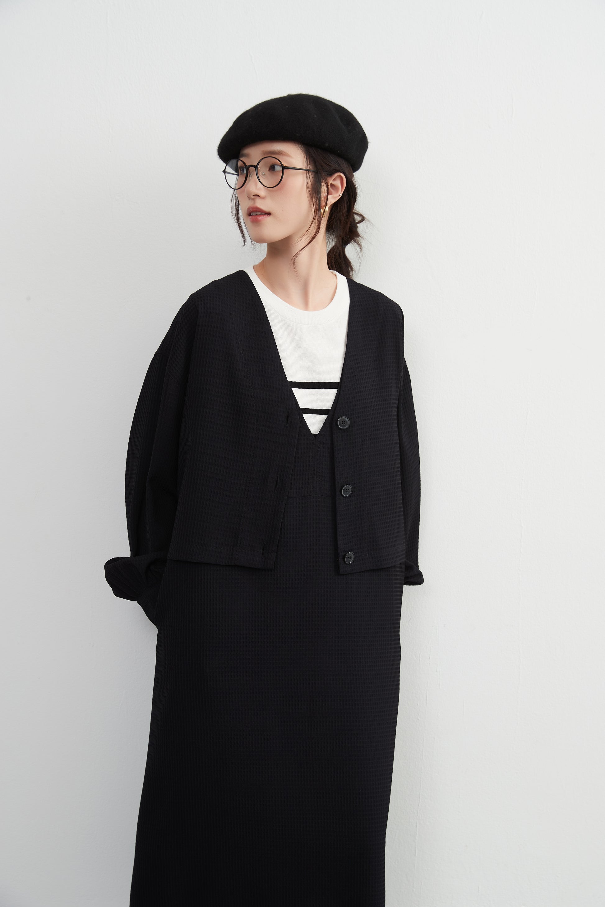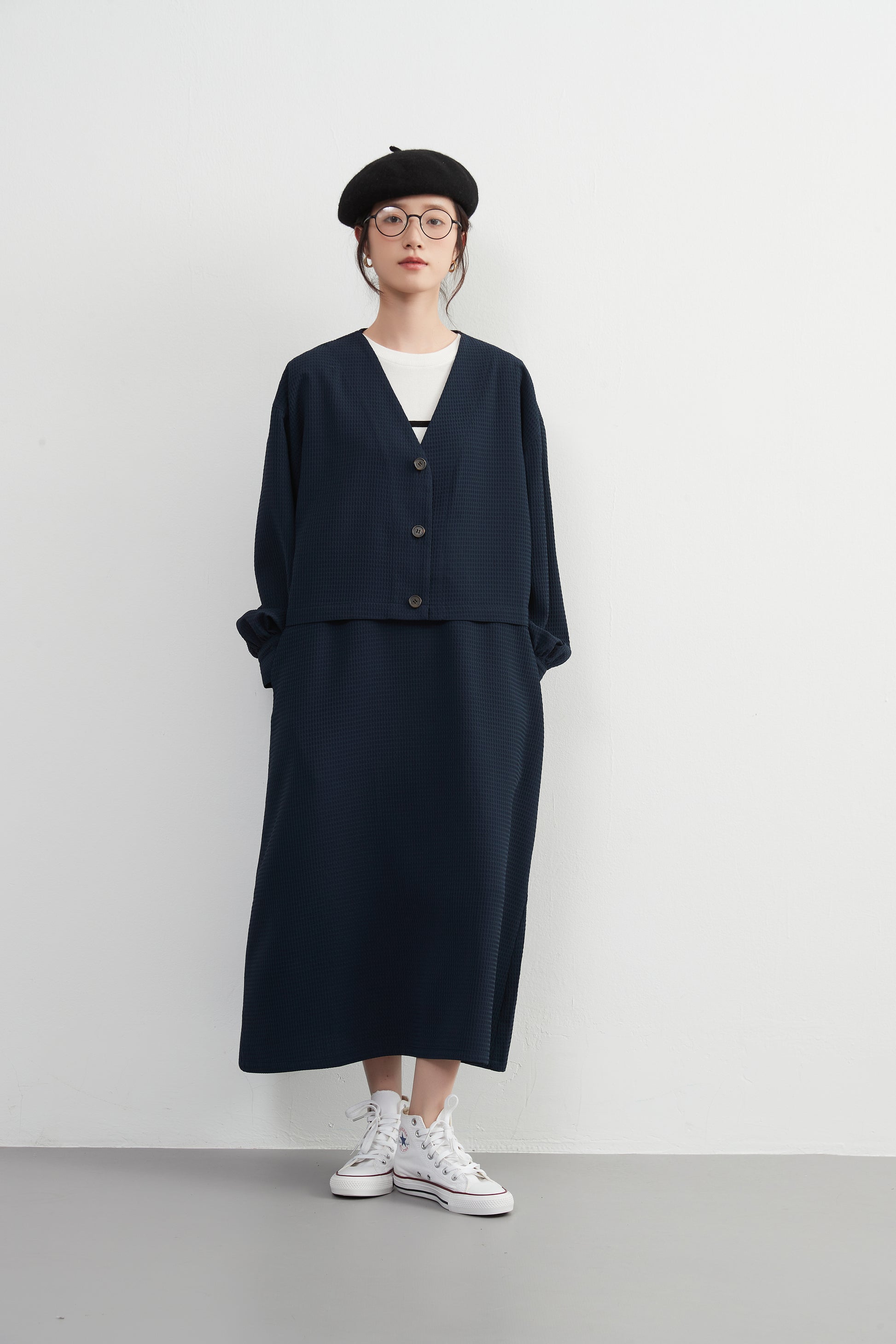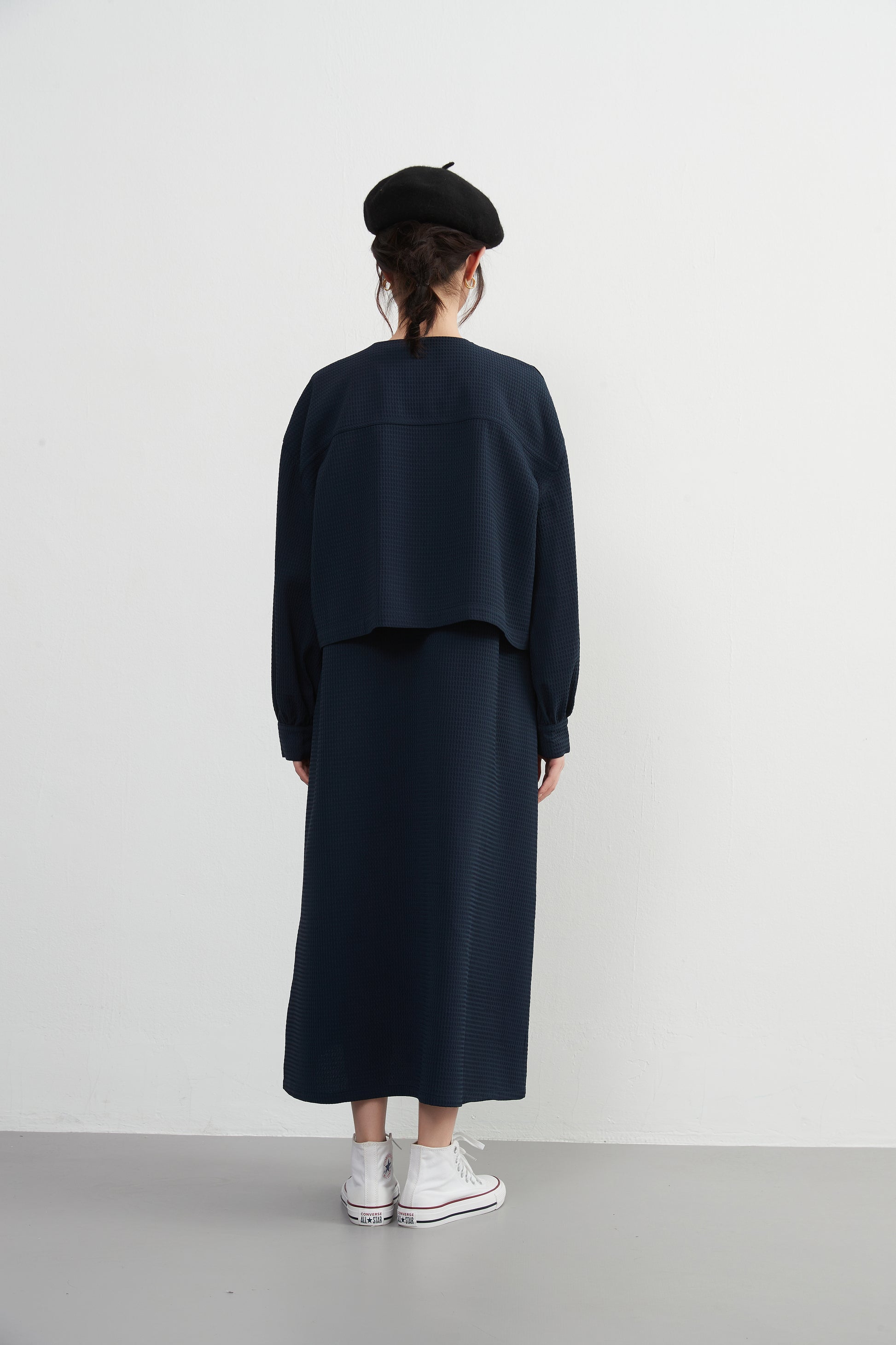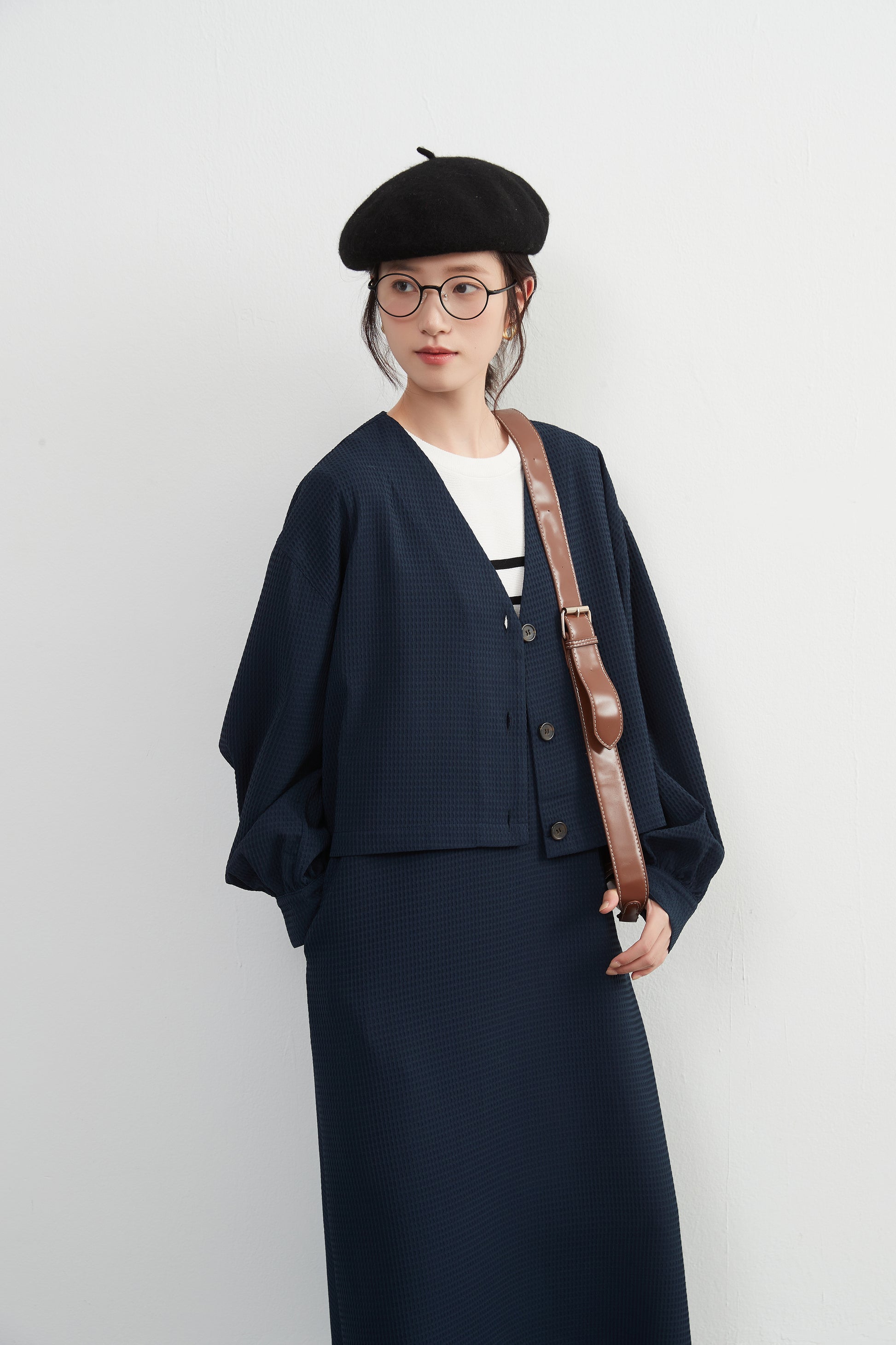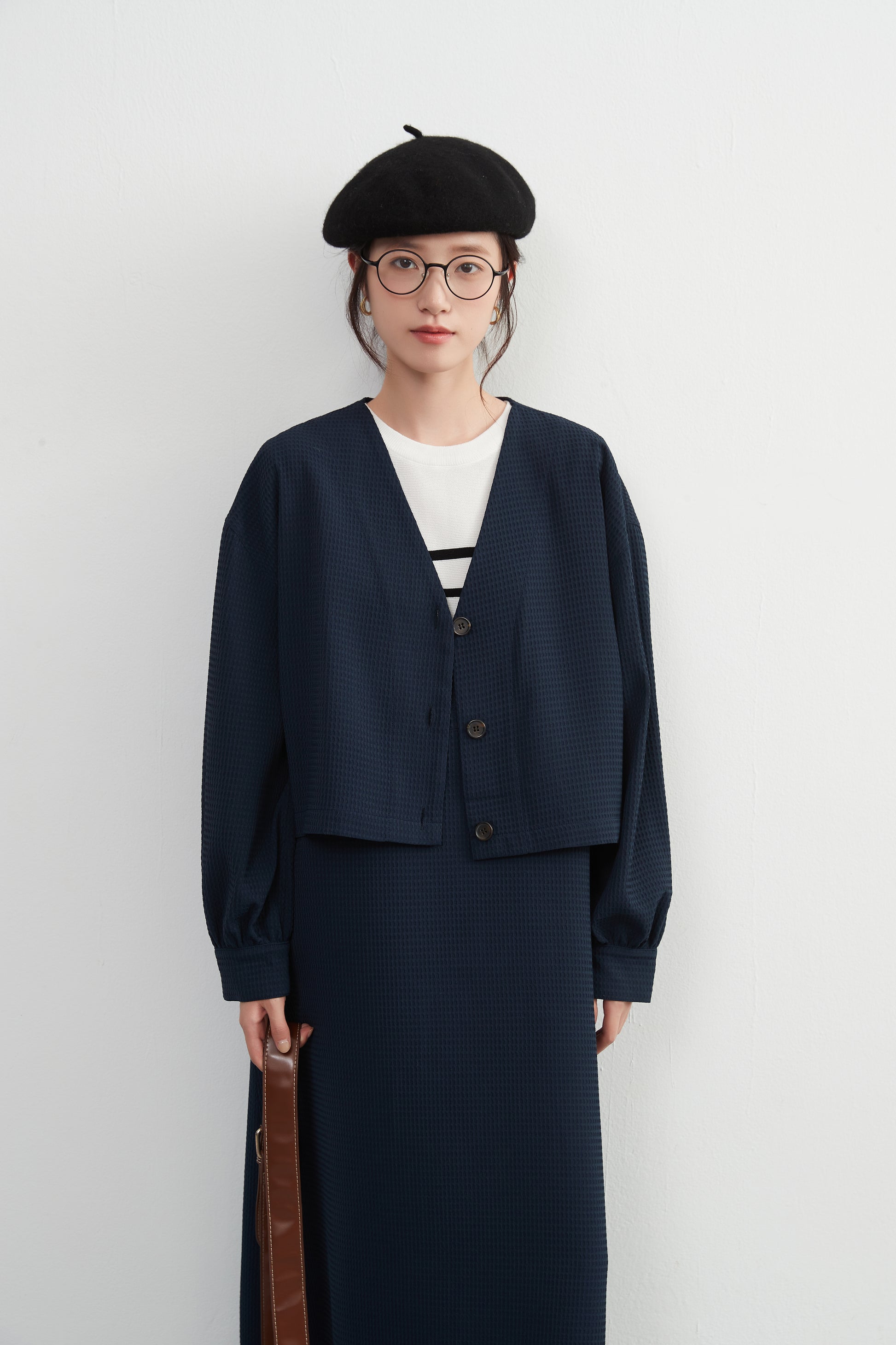 This set combines a jumper skirt made of waffle-patterned fabric with a bolero-style jacket. The loose silhouette combines a relaxed and stylish look. The bolero-style jacket is light and easy to move in, making it perfect for the change of seasons. Each item can be easily coordinated on its own.