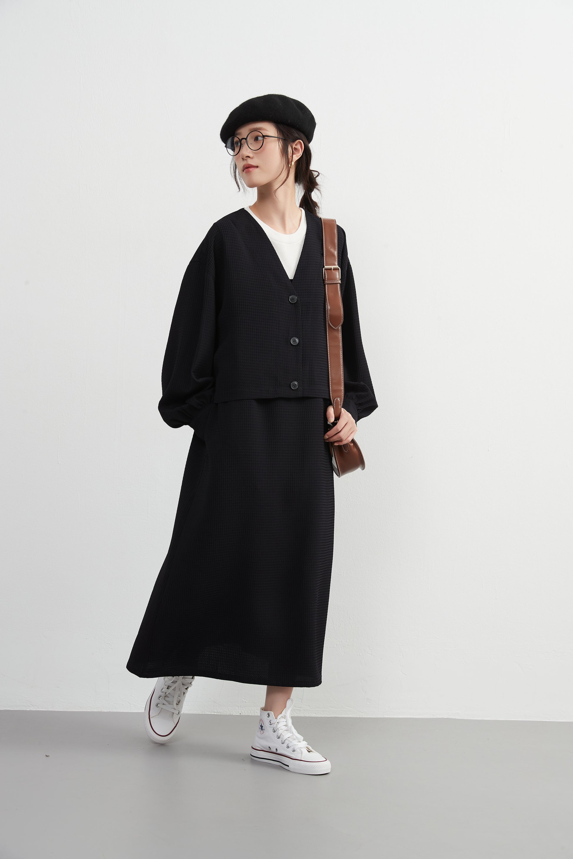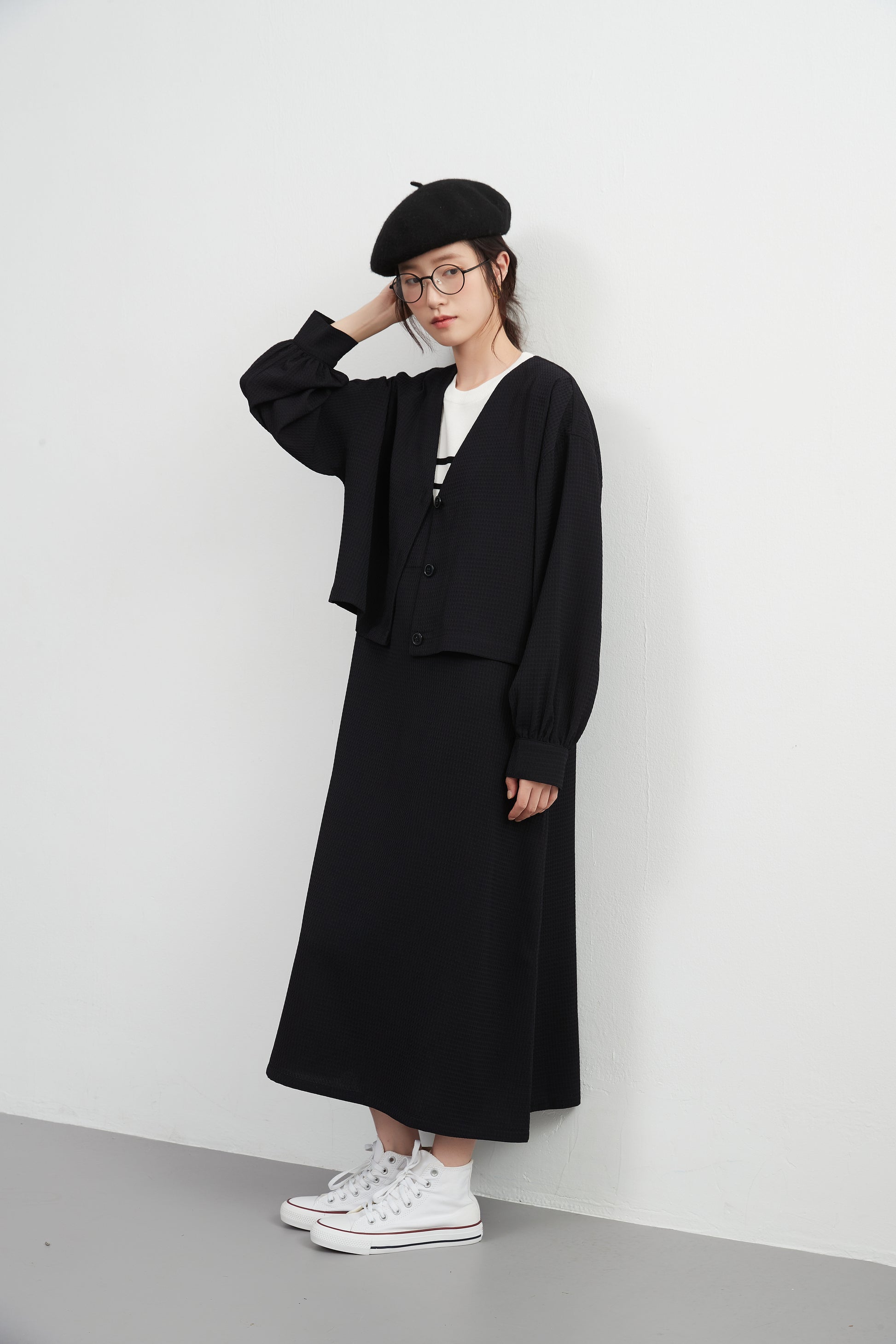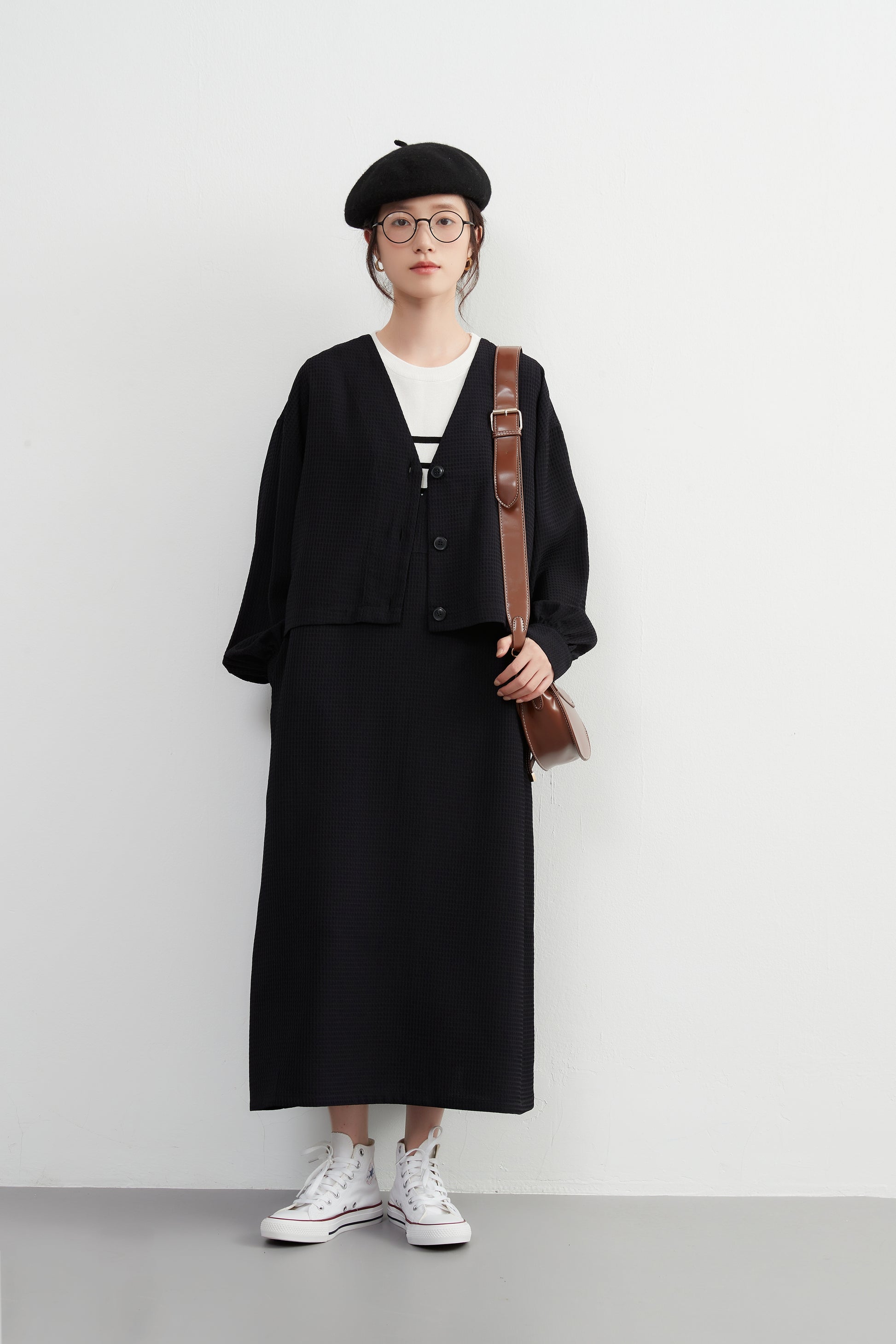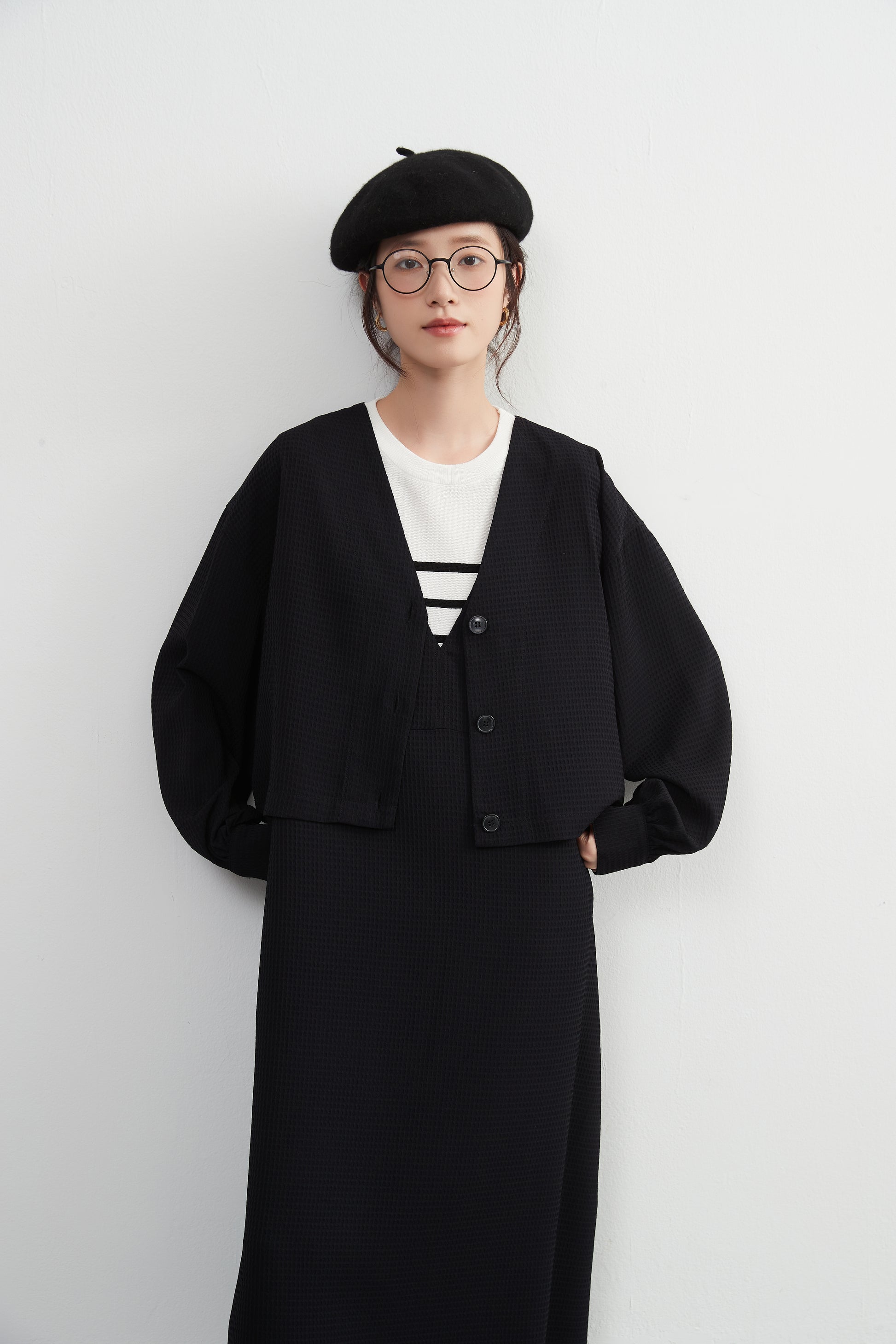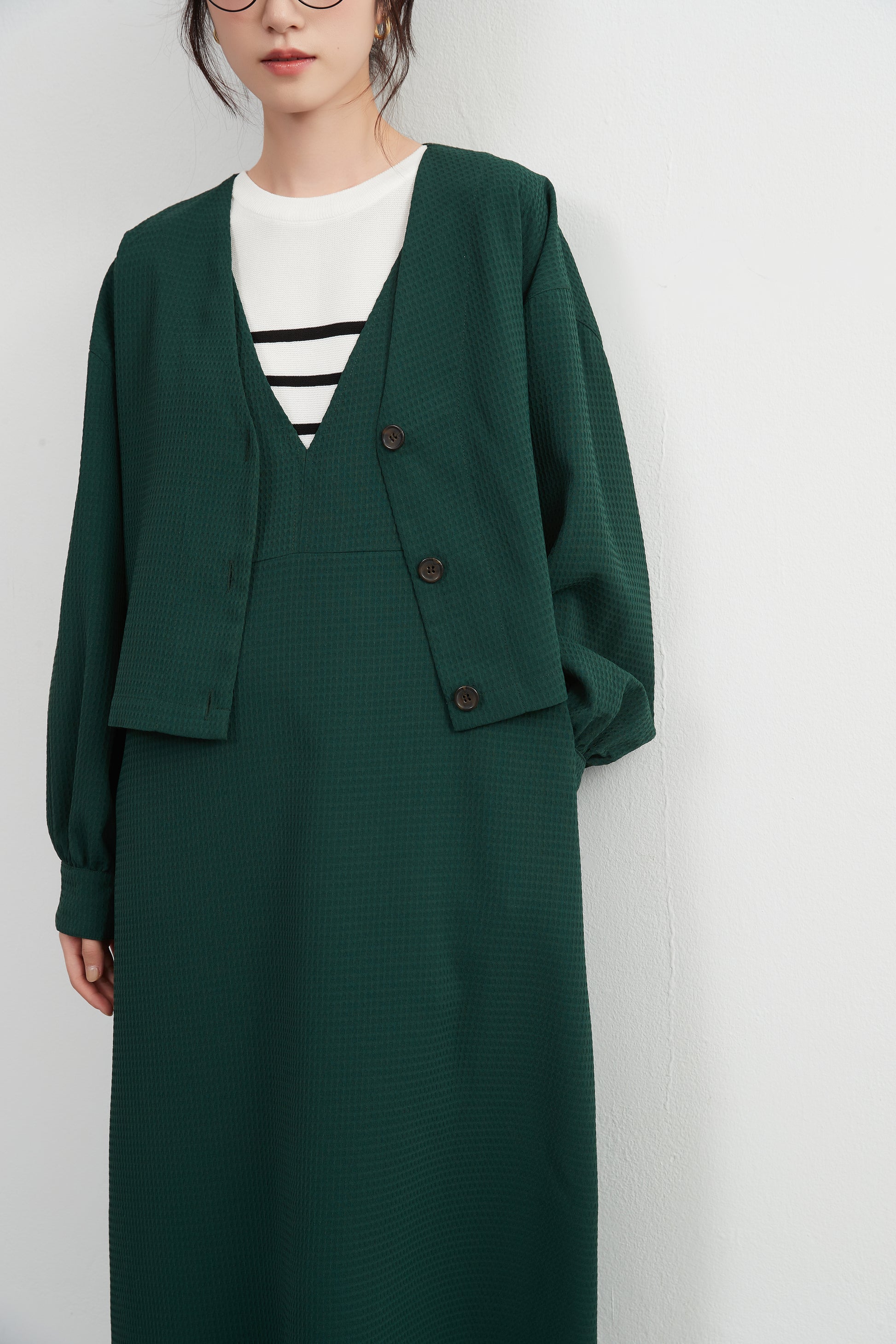 This set combines a jumper skirt made of waffle-patterned fabric with a bolero-style jacket. The loose silhouette combines a relaxed and stylish look. The bolero-style jacket is light and easy to move in, making it perfect for the change of seasons. Each item can be easily coordinated on its own.