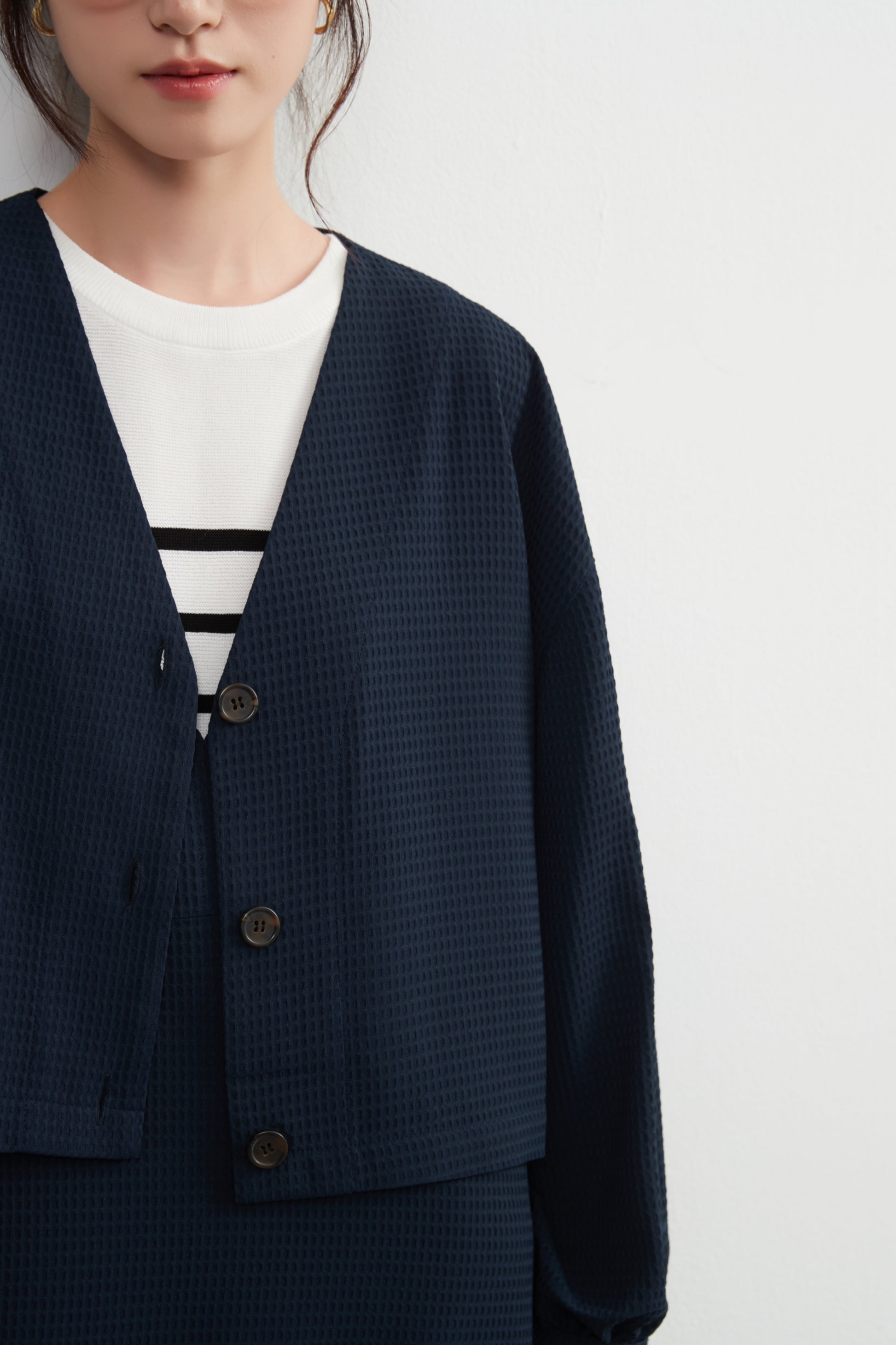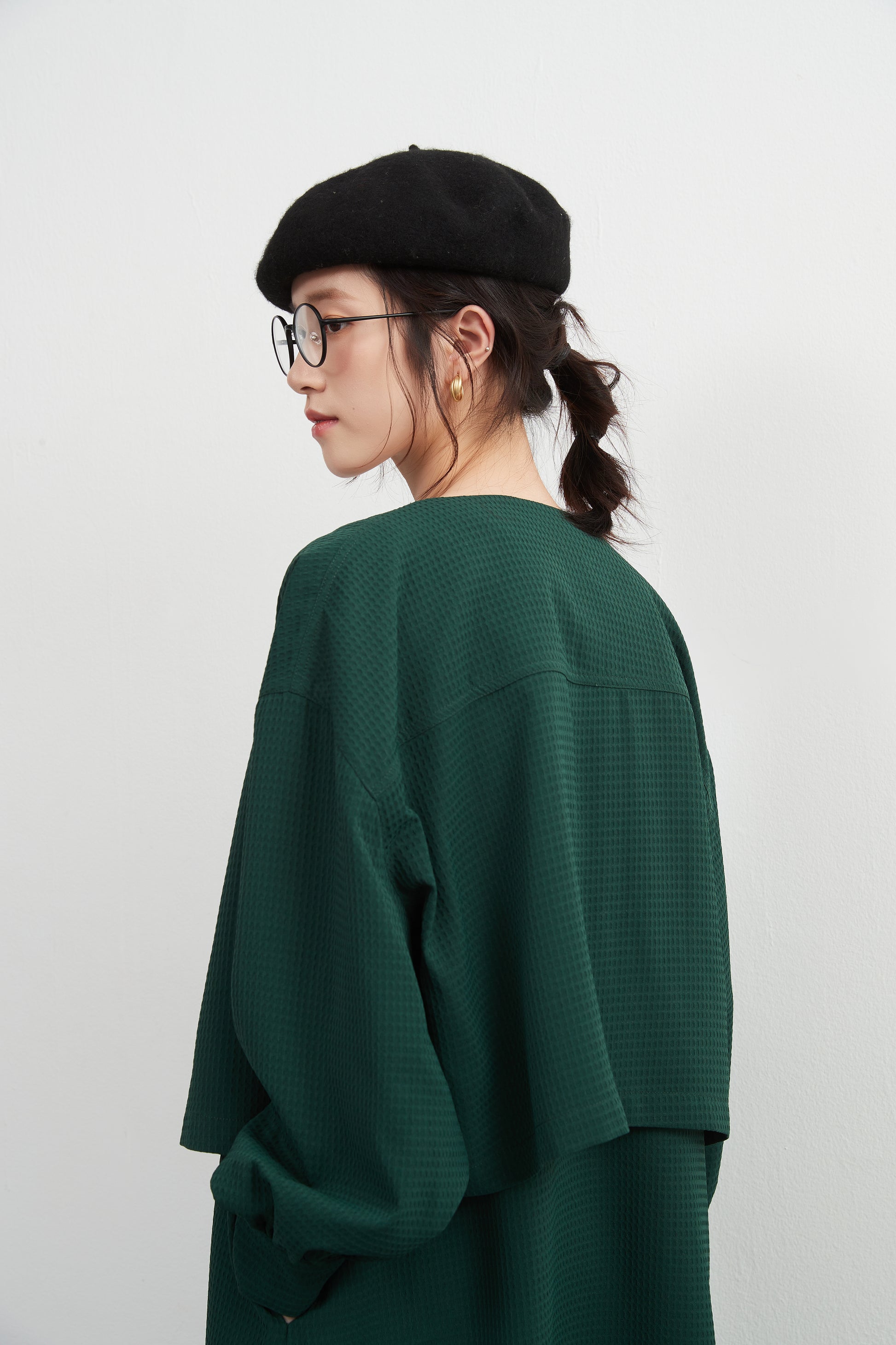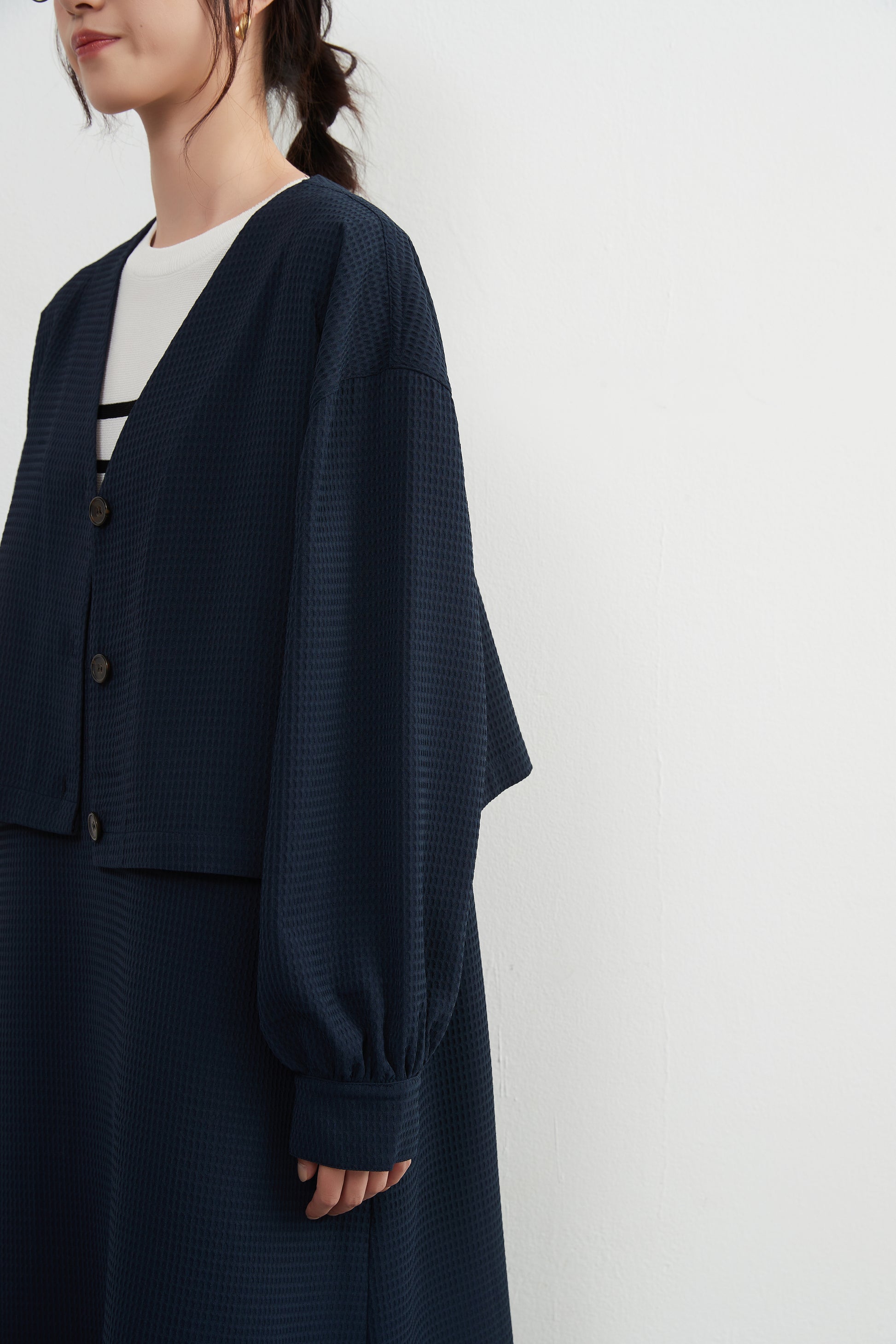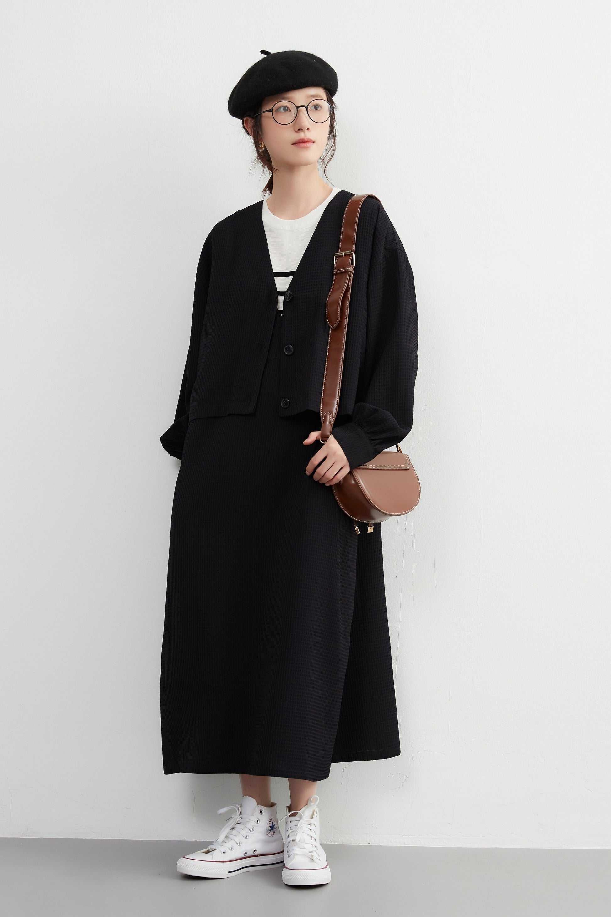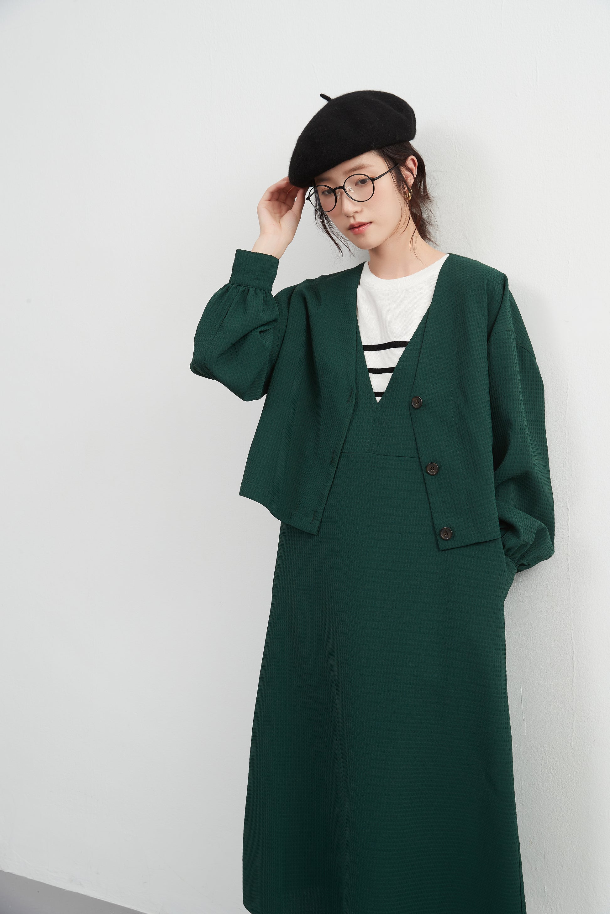 This set combines a jumper skirt made of waffle-patterned fabric with a bolero-style jacket. The loose silhouette combines a relaxed and stylish look. The bolero-style jacket is light and easy to move in, making it perfect for the change of seasons. Each item can be easily coordinated on its own.