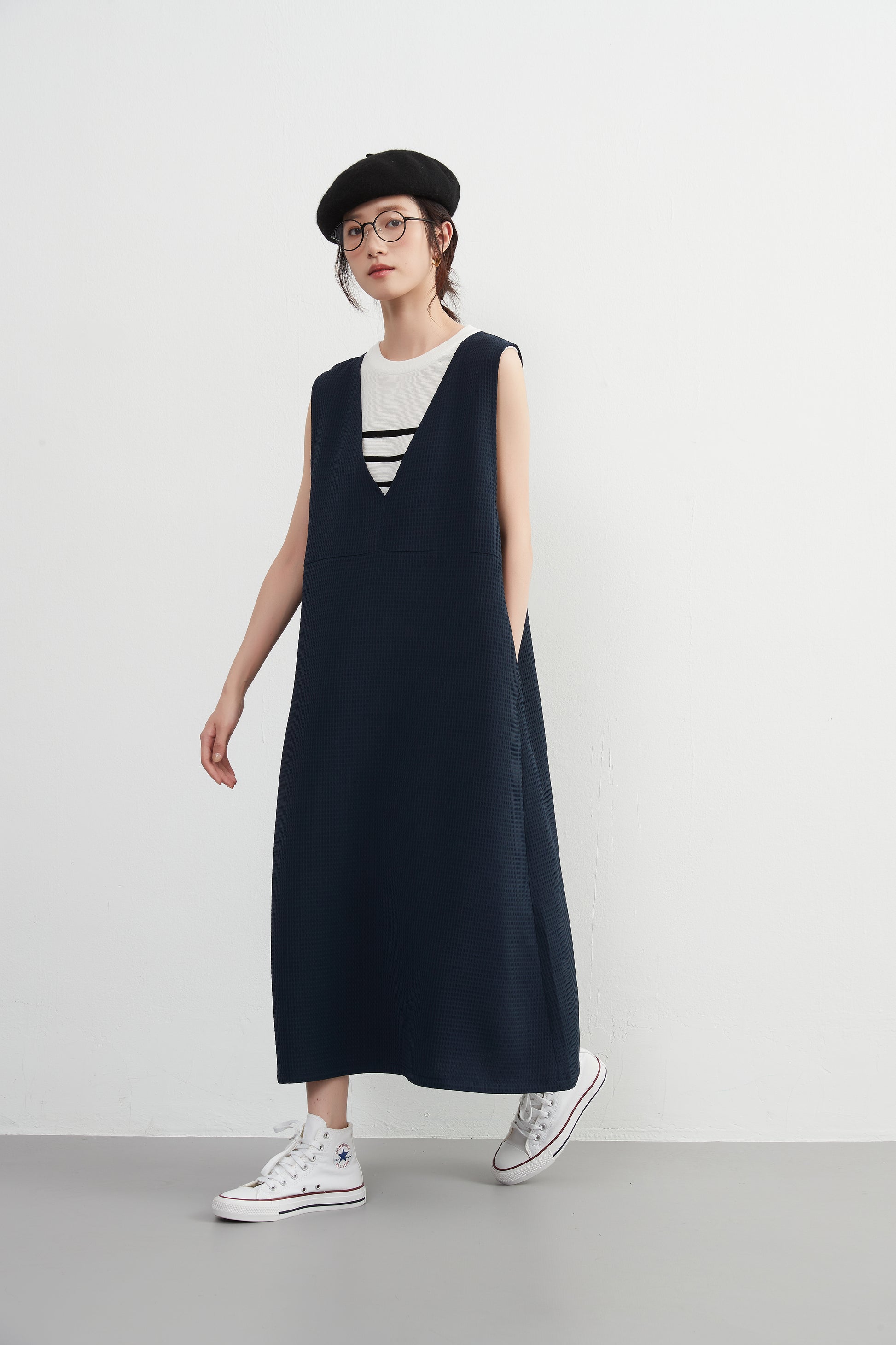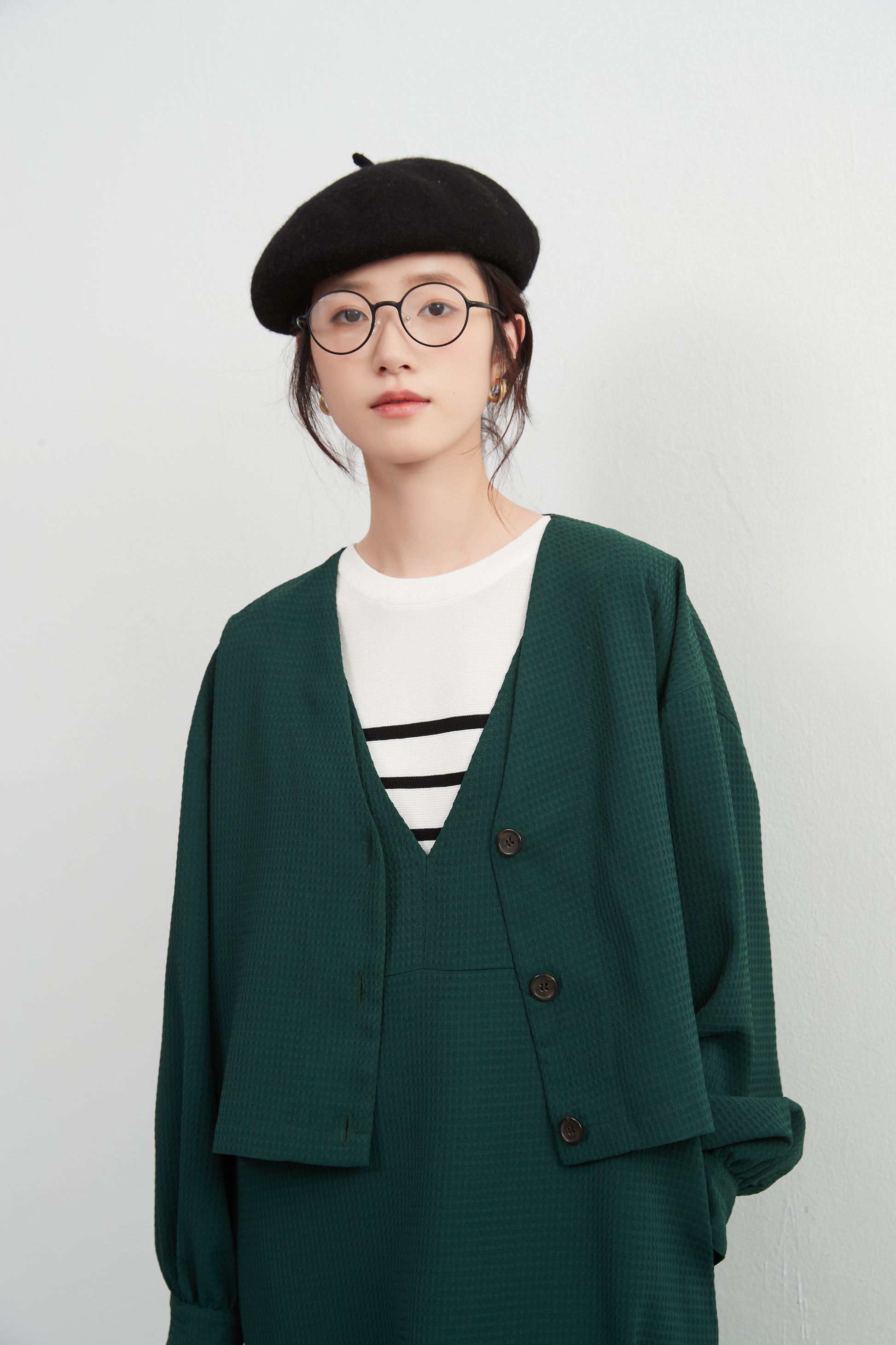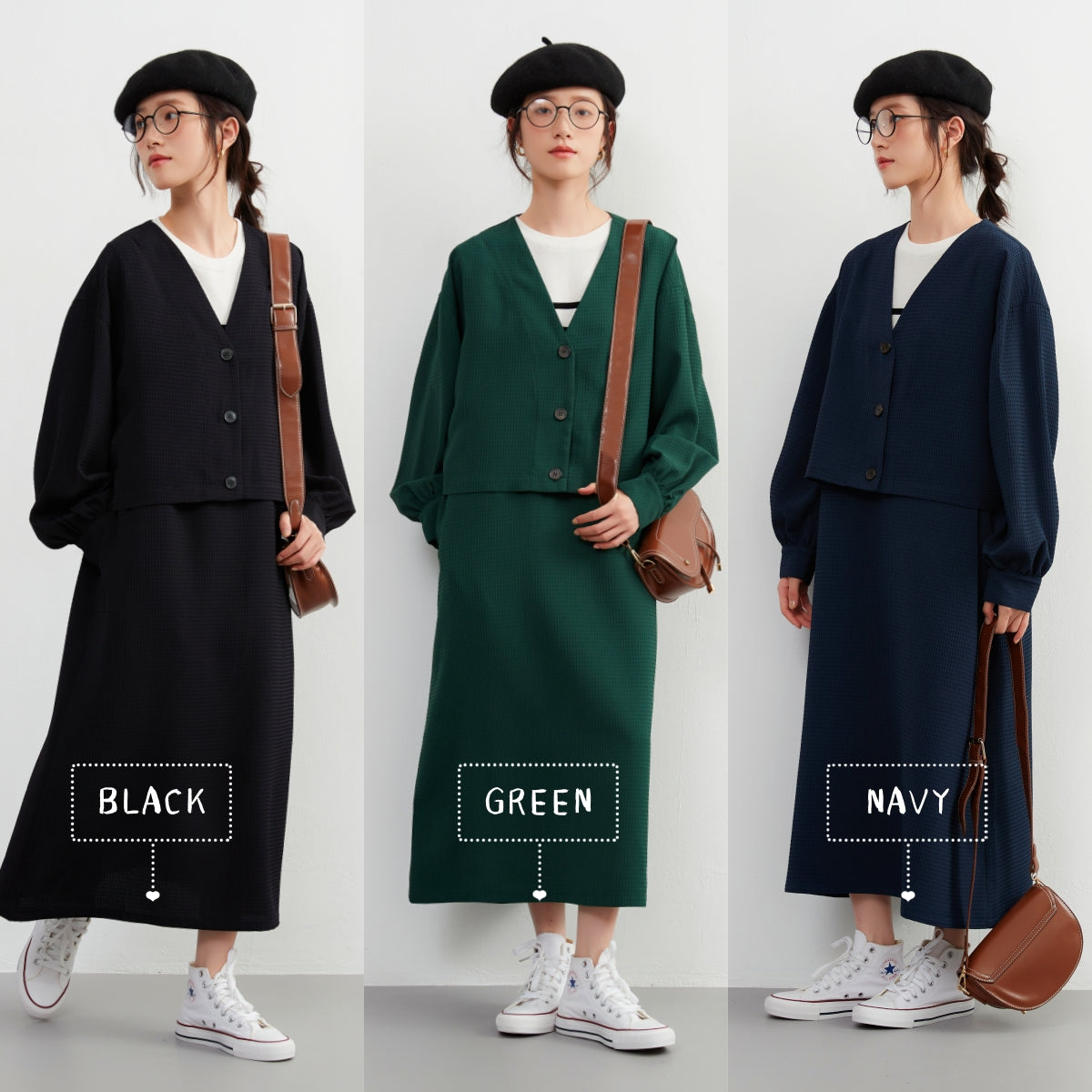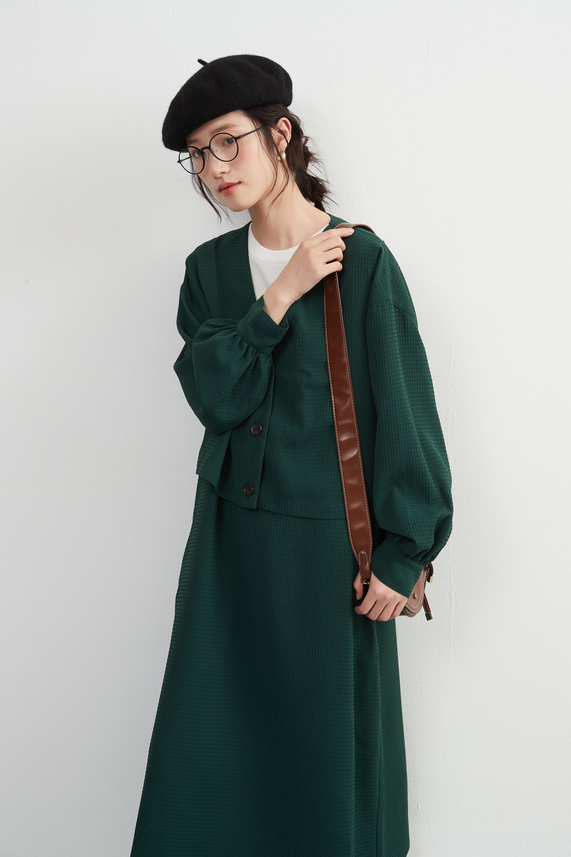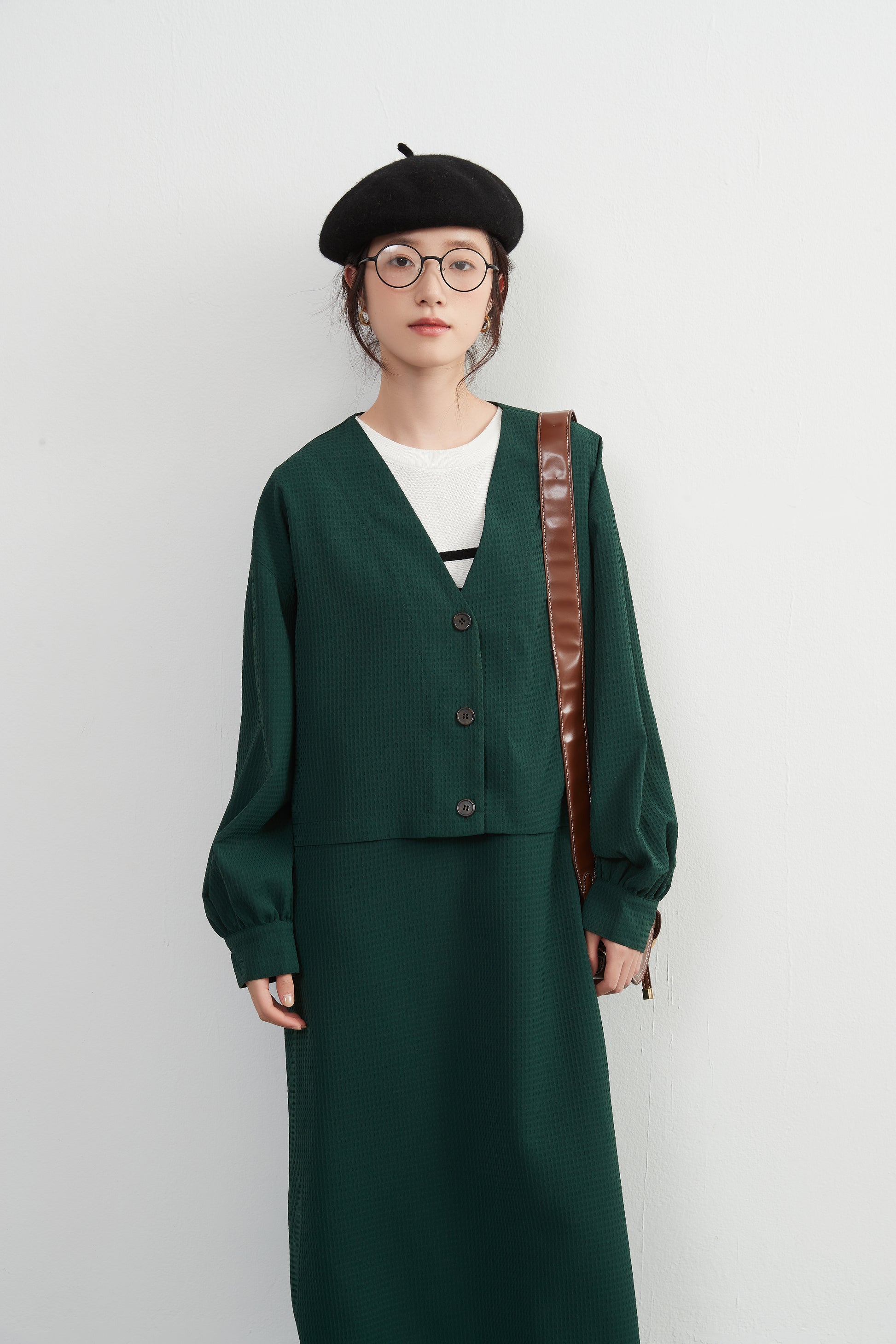 This set combines a jumper skirt made of waffle-patterned fabric with a bolero-style jacket. The loose silhouette combines a relaxed and stylish look. The bolero-style jacket is light and easy to move in, making it perfect for the change of seasons. Each item can be easily coordinated on its own.