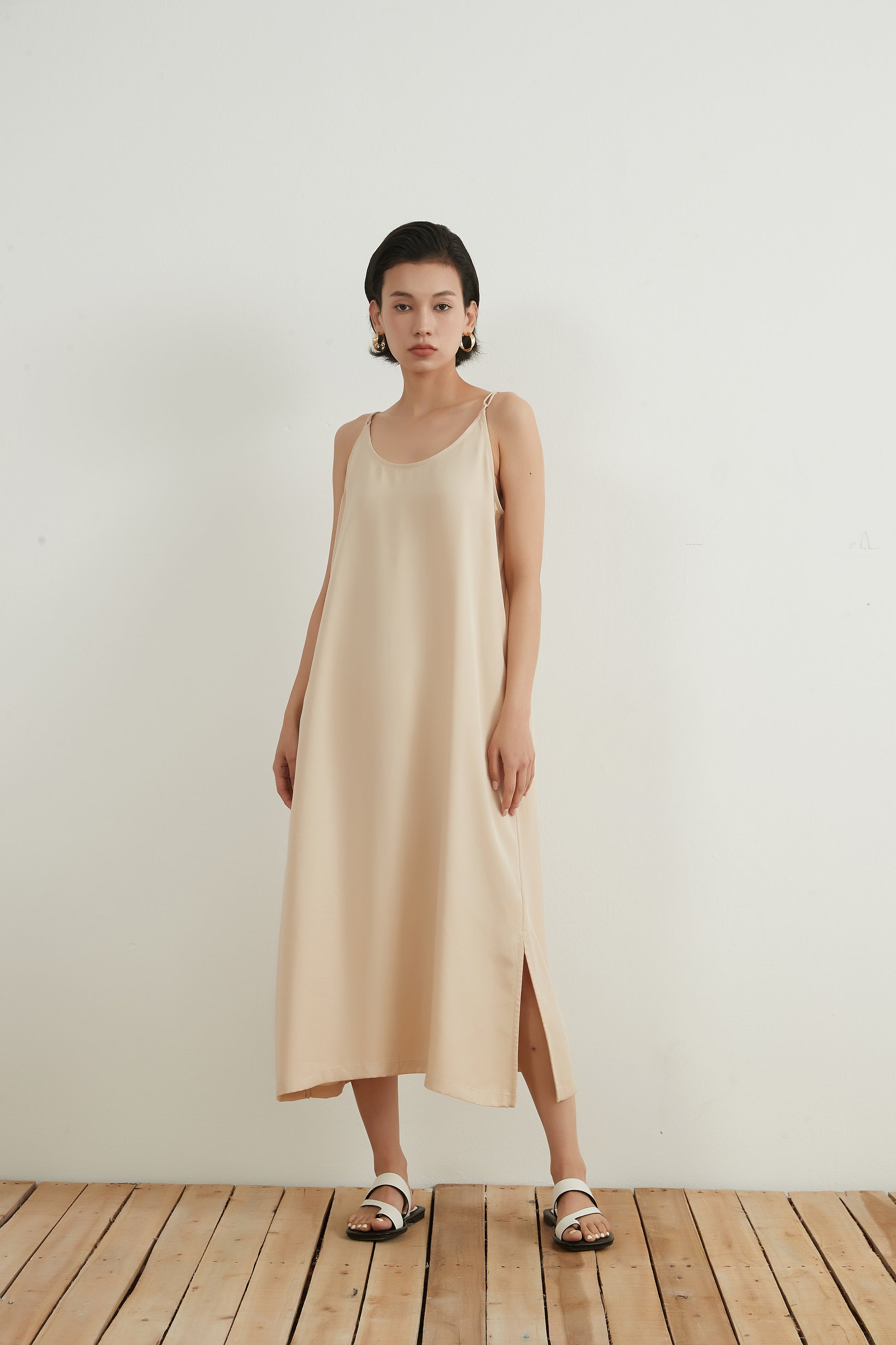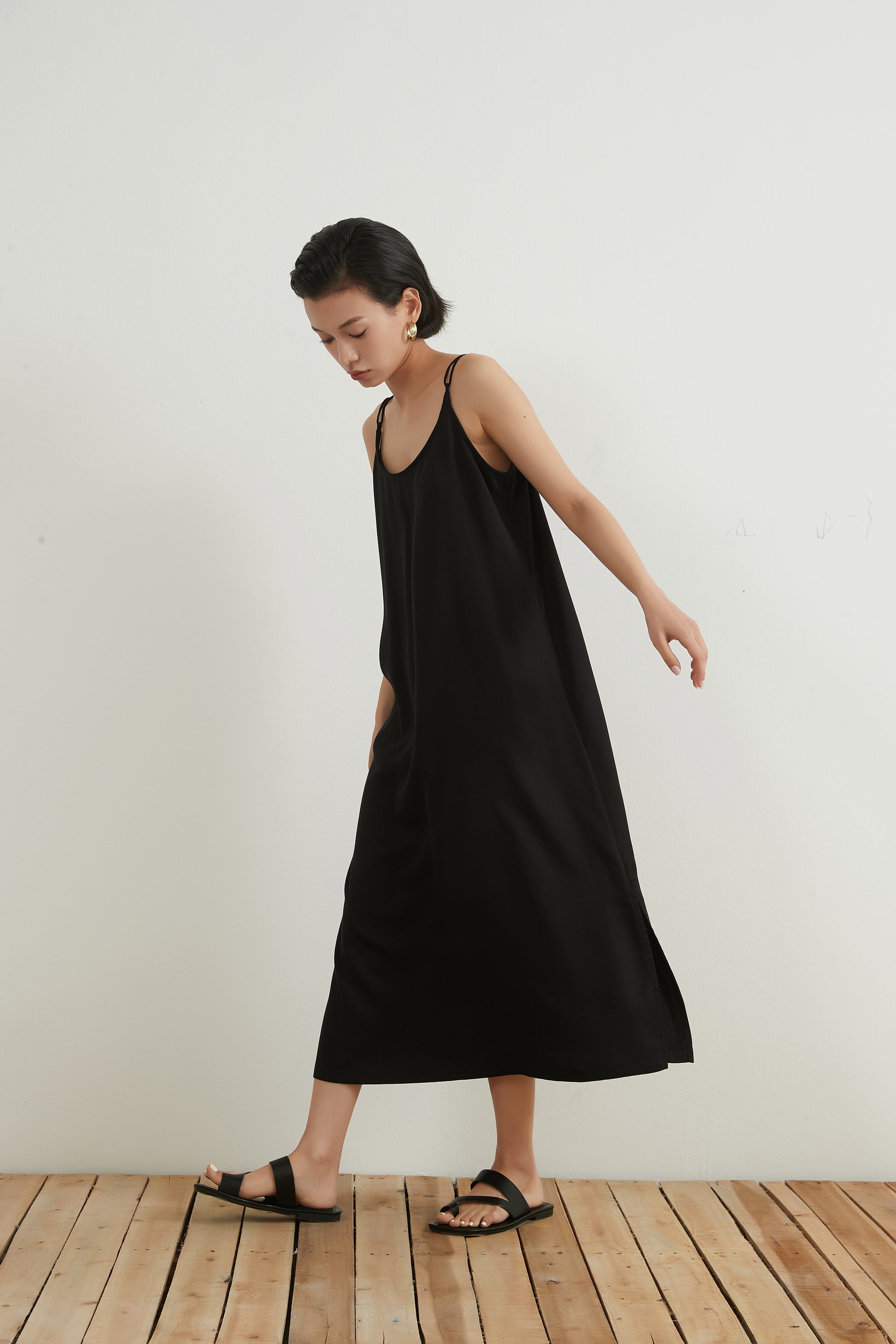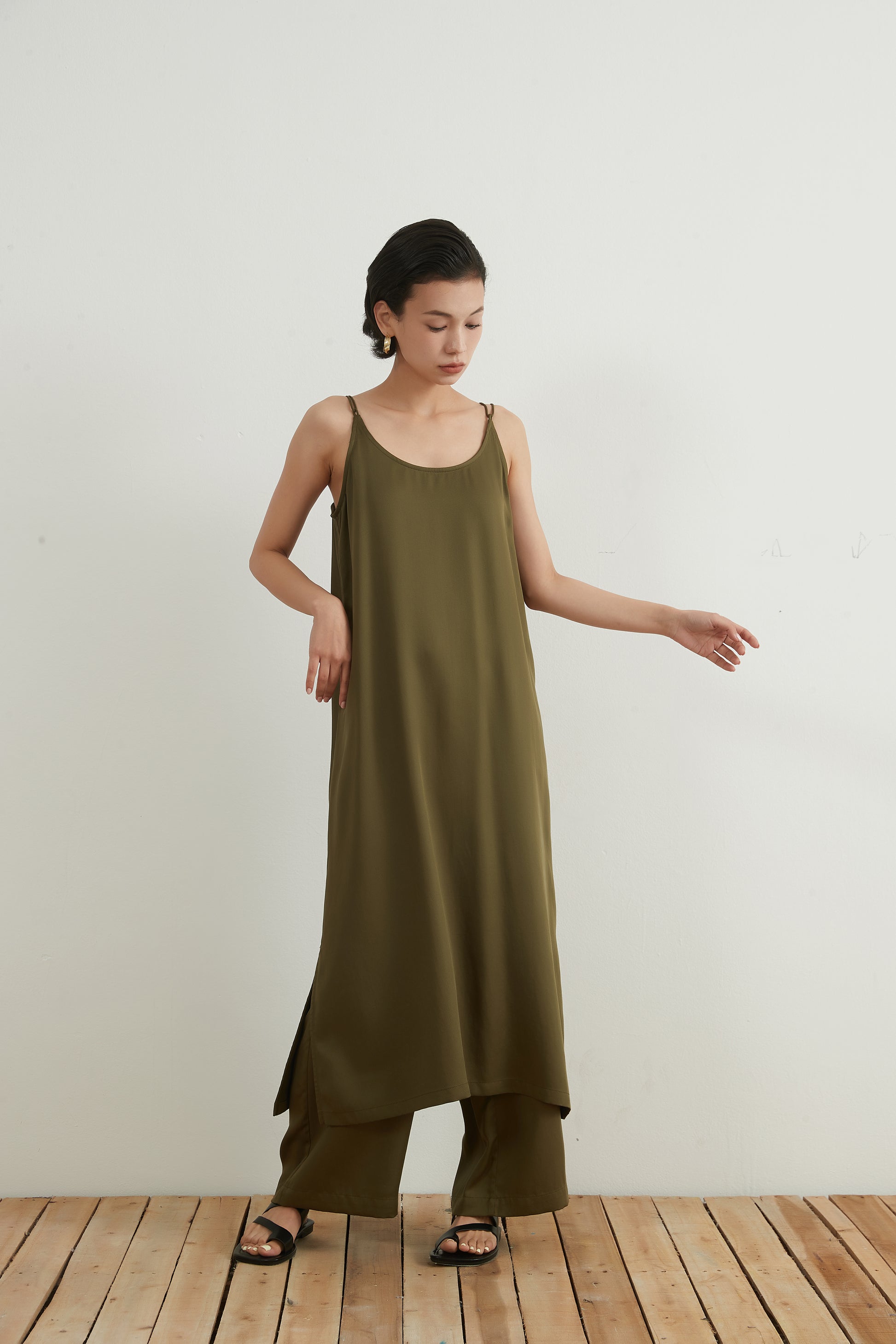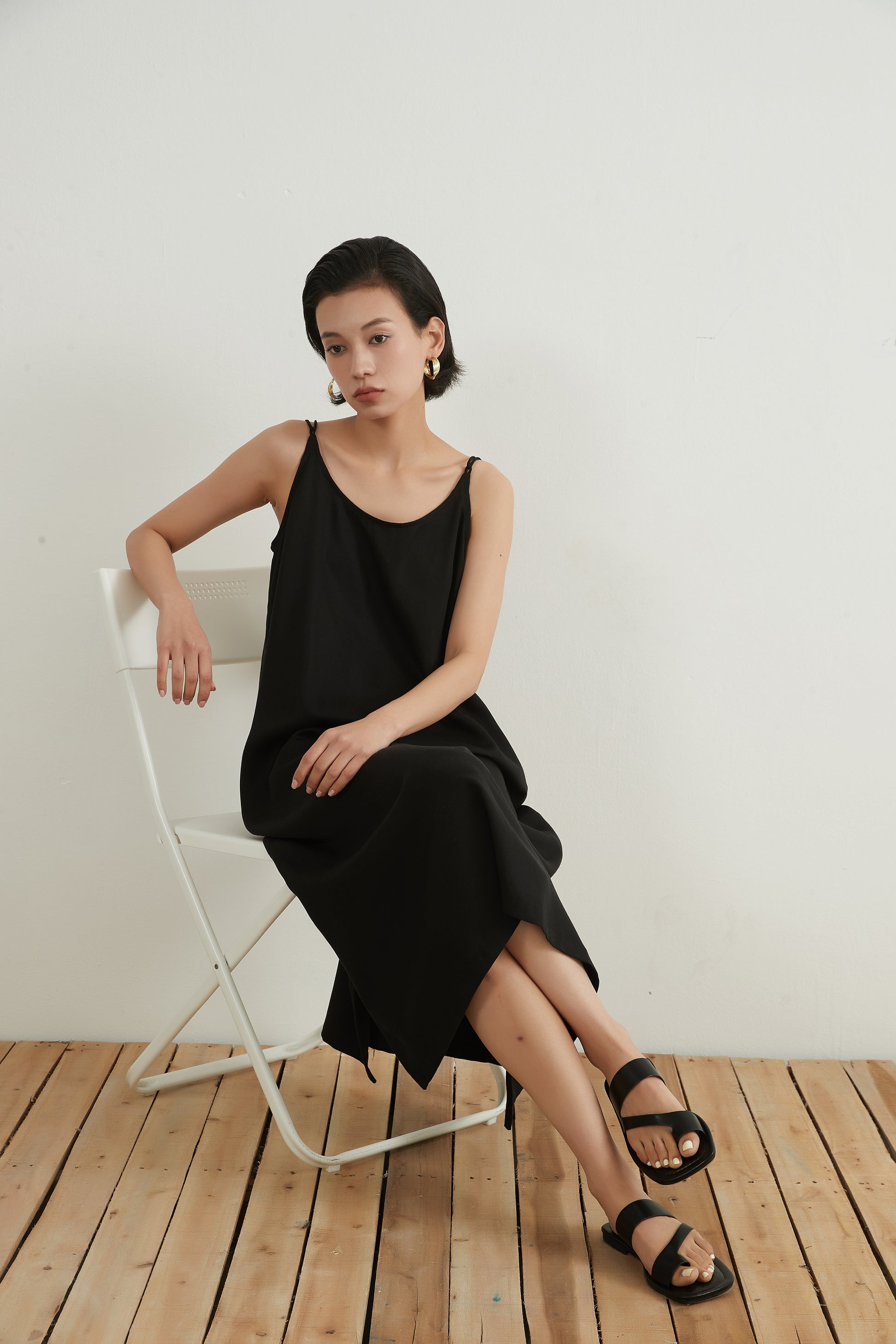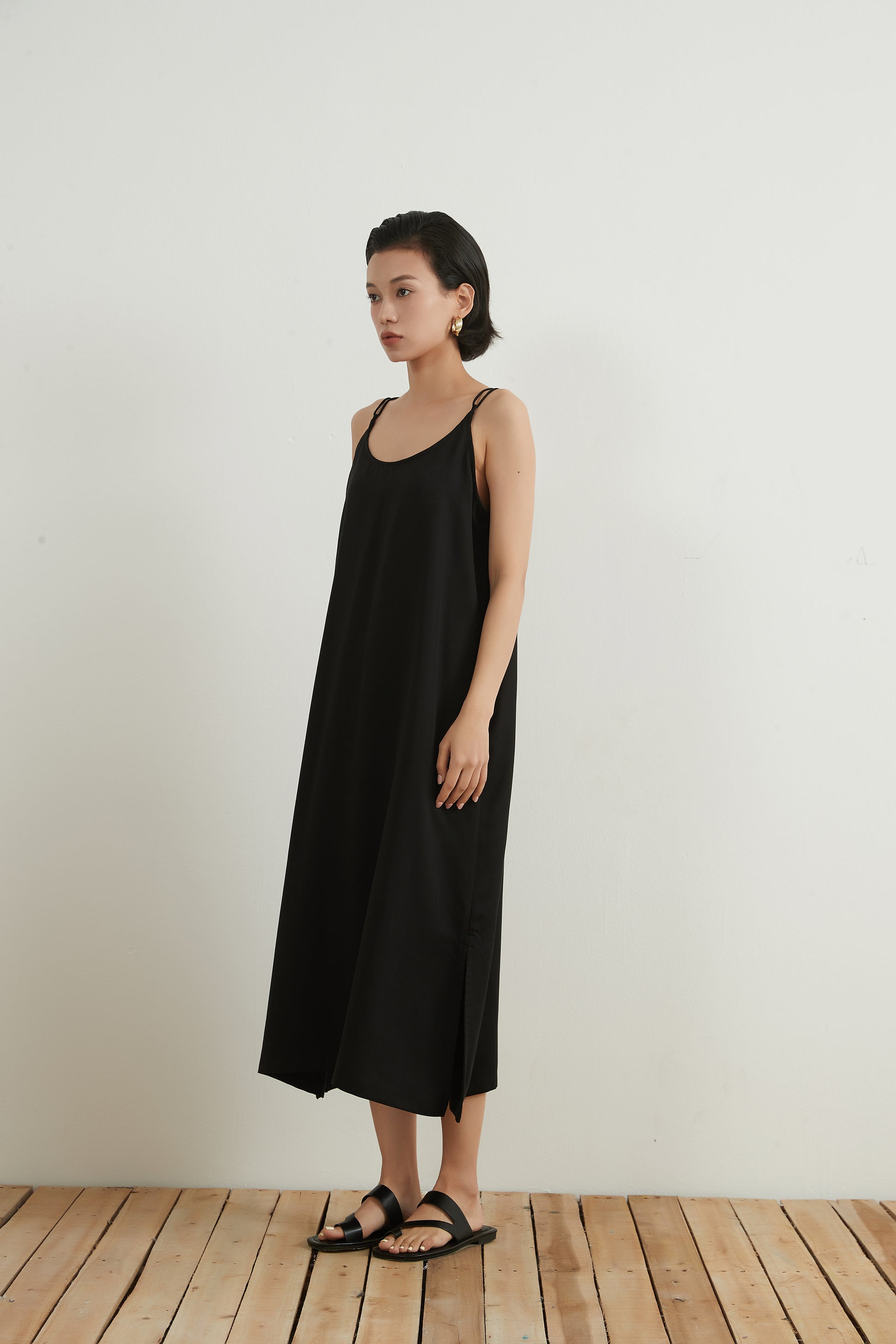 A luxurious camisole dress with delicate straps that exude a mature atmosphere. The lines are not too tight, making the body look neat and beautiful, and the thin straps add an accent to the simple design. It has a minimalist impression and can be worn alone, or paired with a sleeveless top or T-shirt for a casual style.