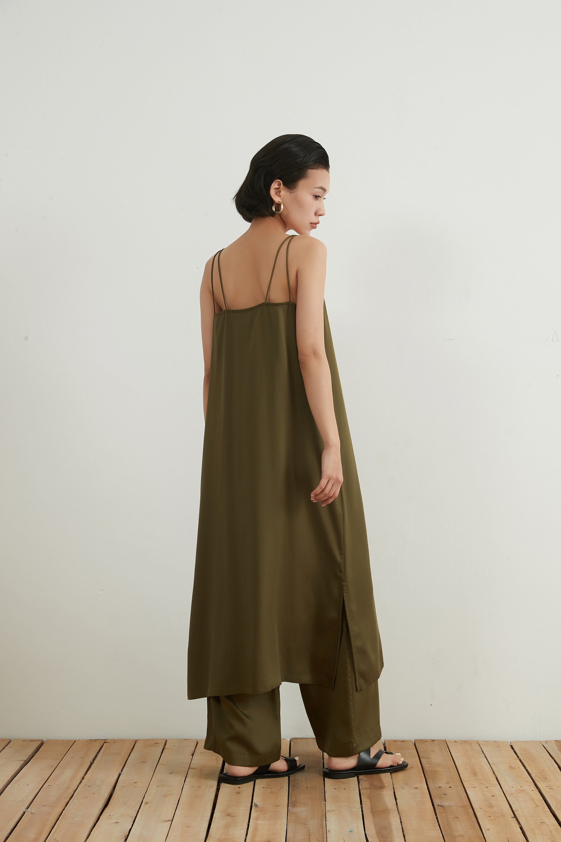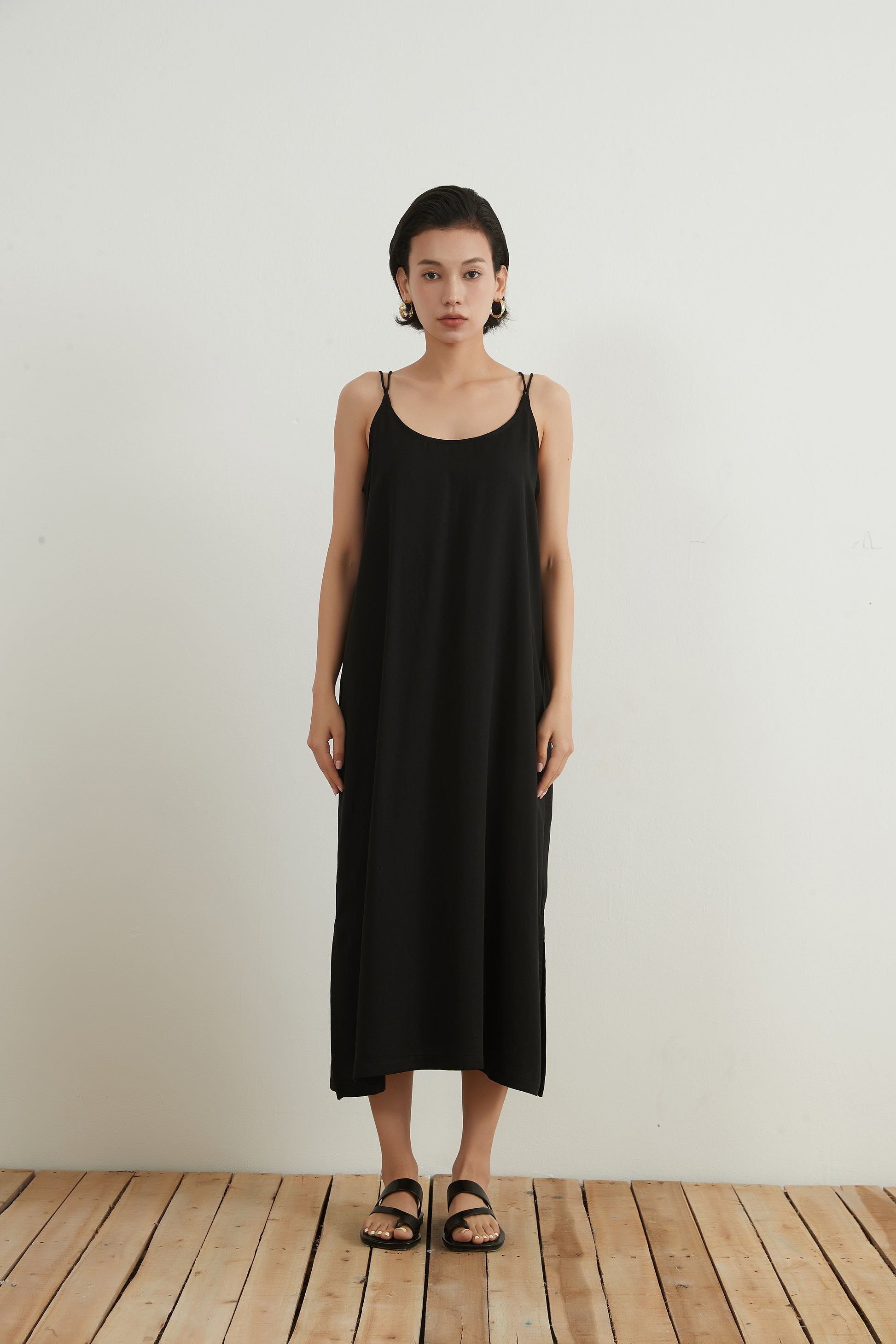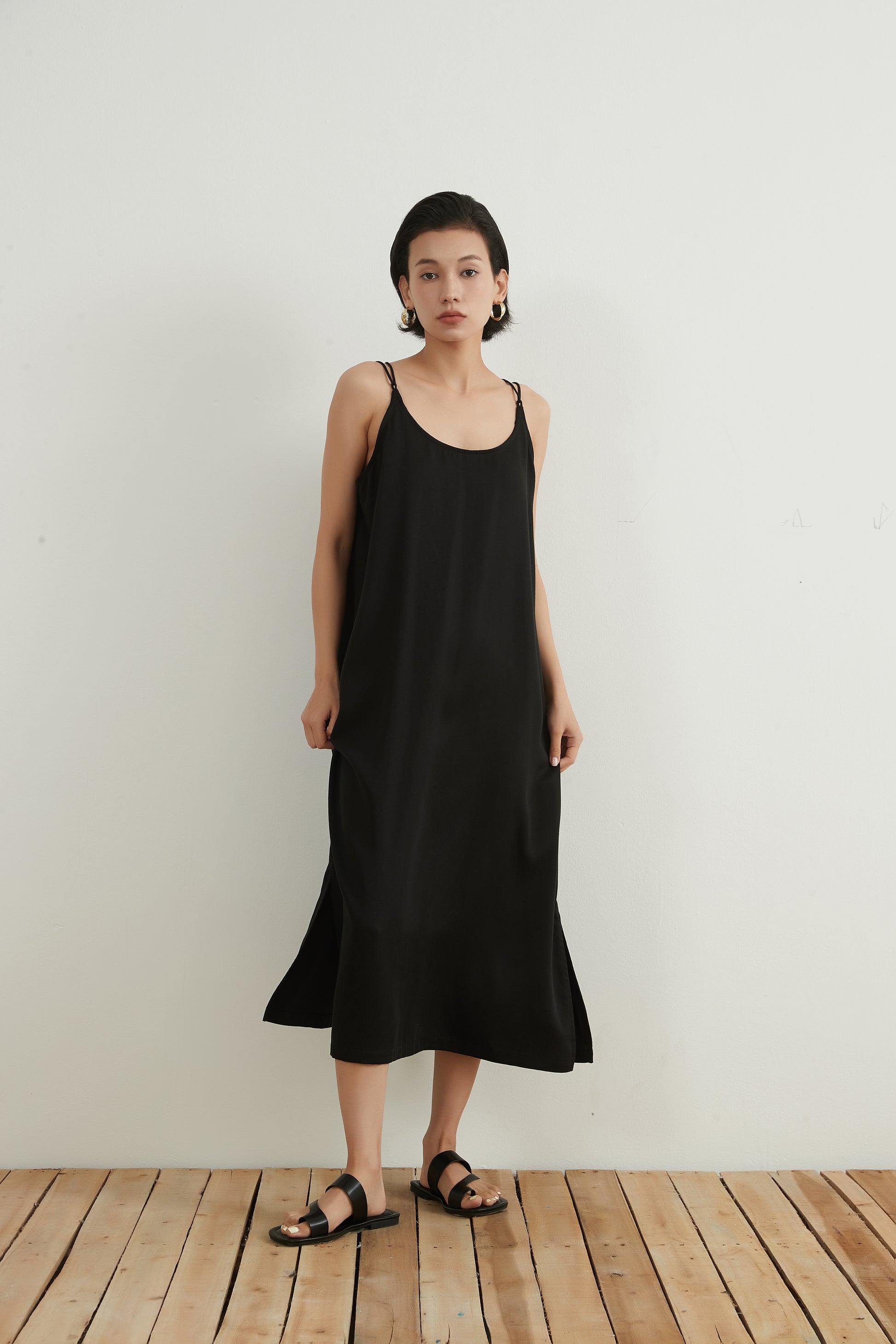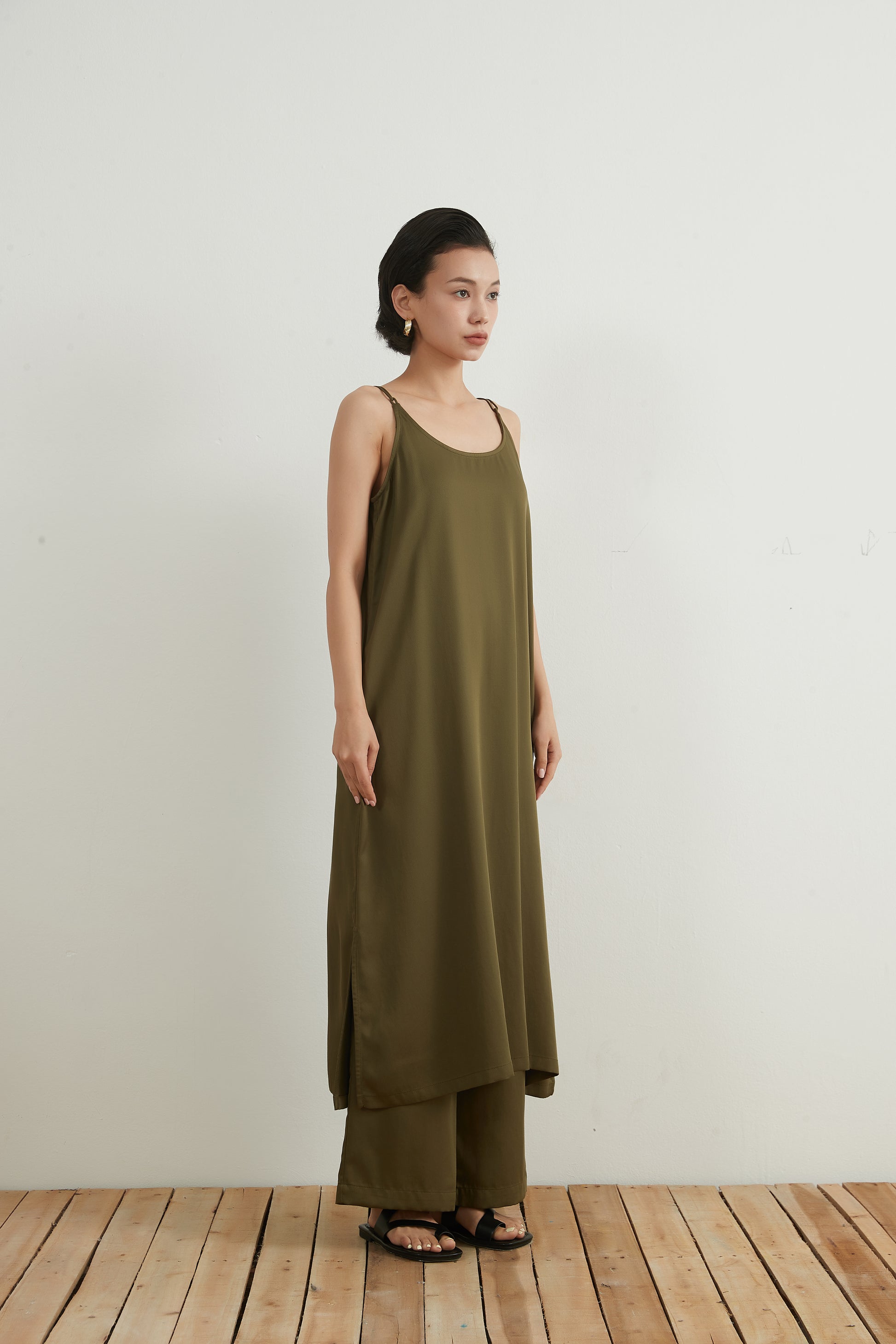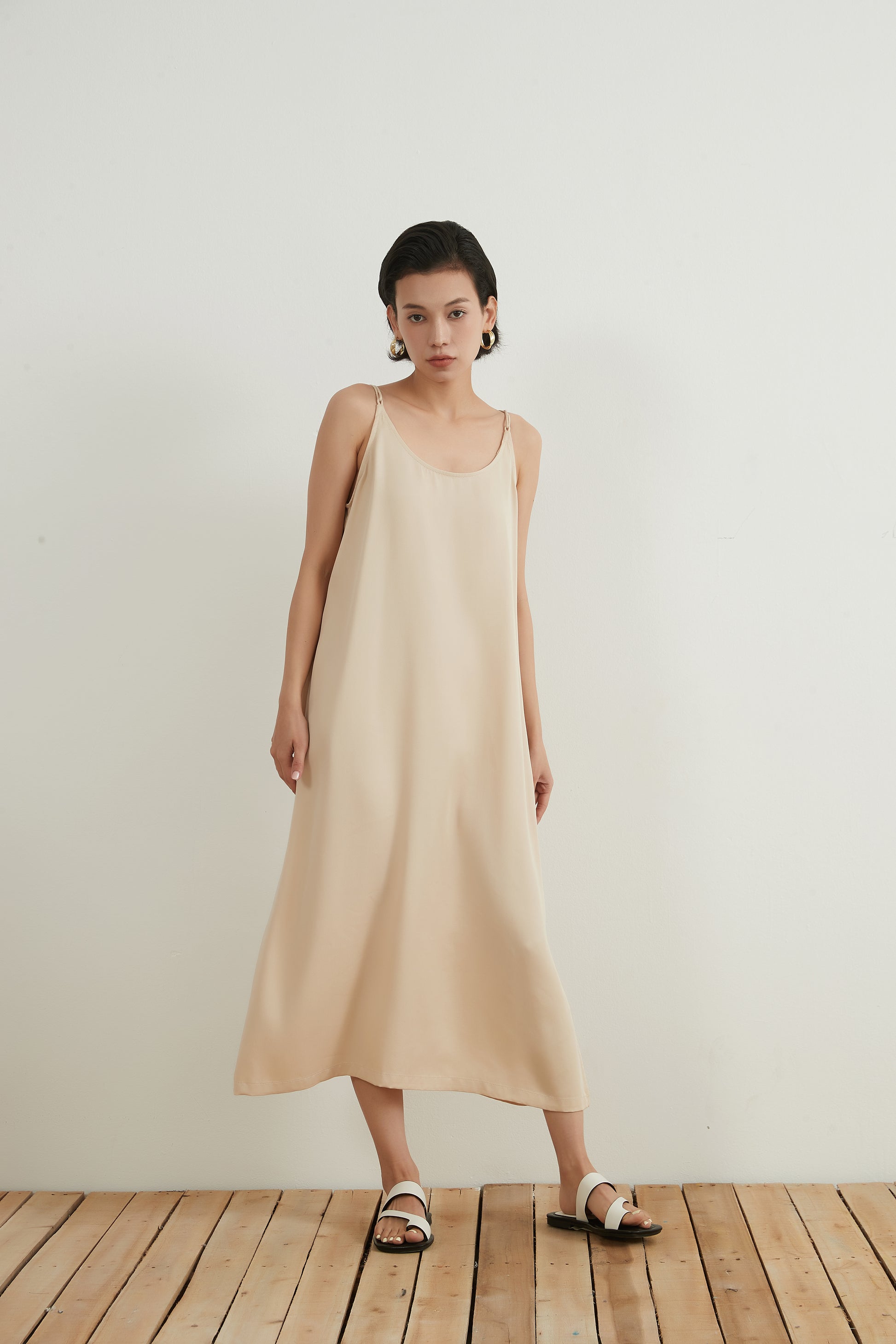 A luxurious camisole dress with delicate straps that exude a mature atmosphere. The lines are not too tight, making the body look neat and beautiful, and the thin straps add an accent to the simple design. It has a minimalist impression and can be worn alone, or paired with a sleeveless top or T-shirt for a casual style.