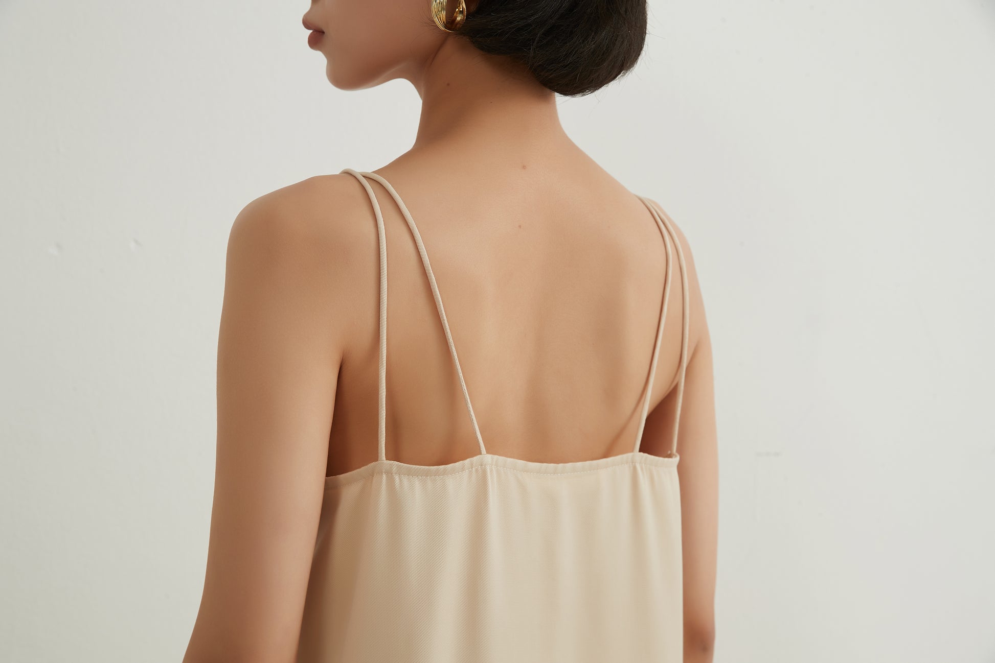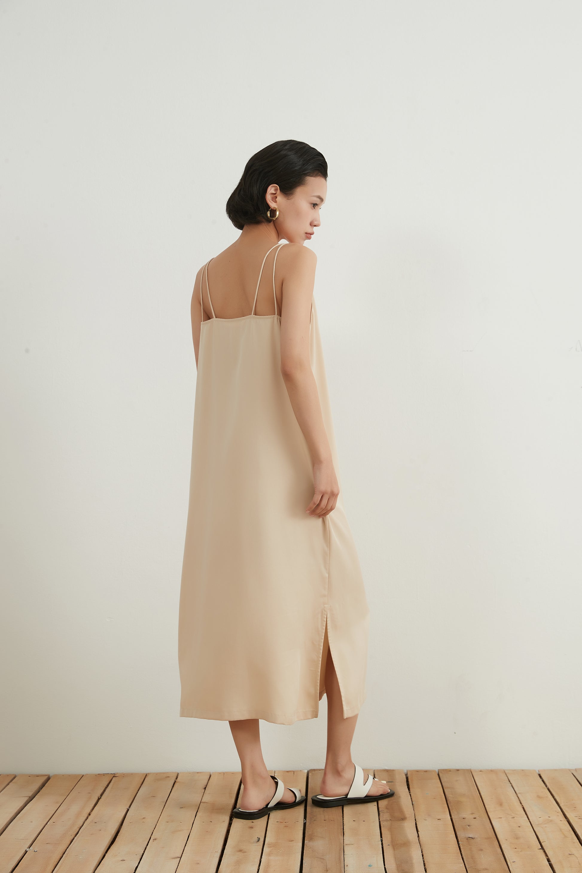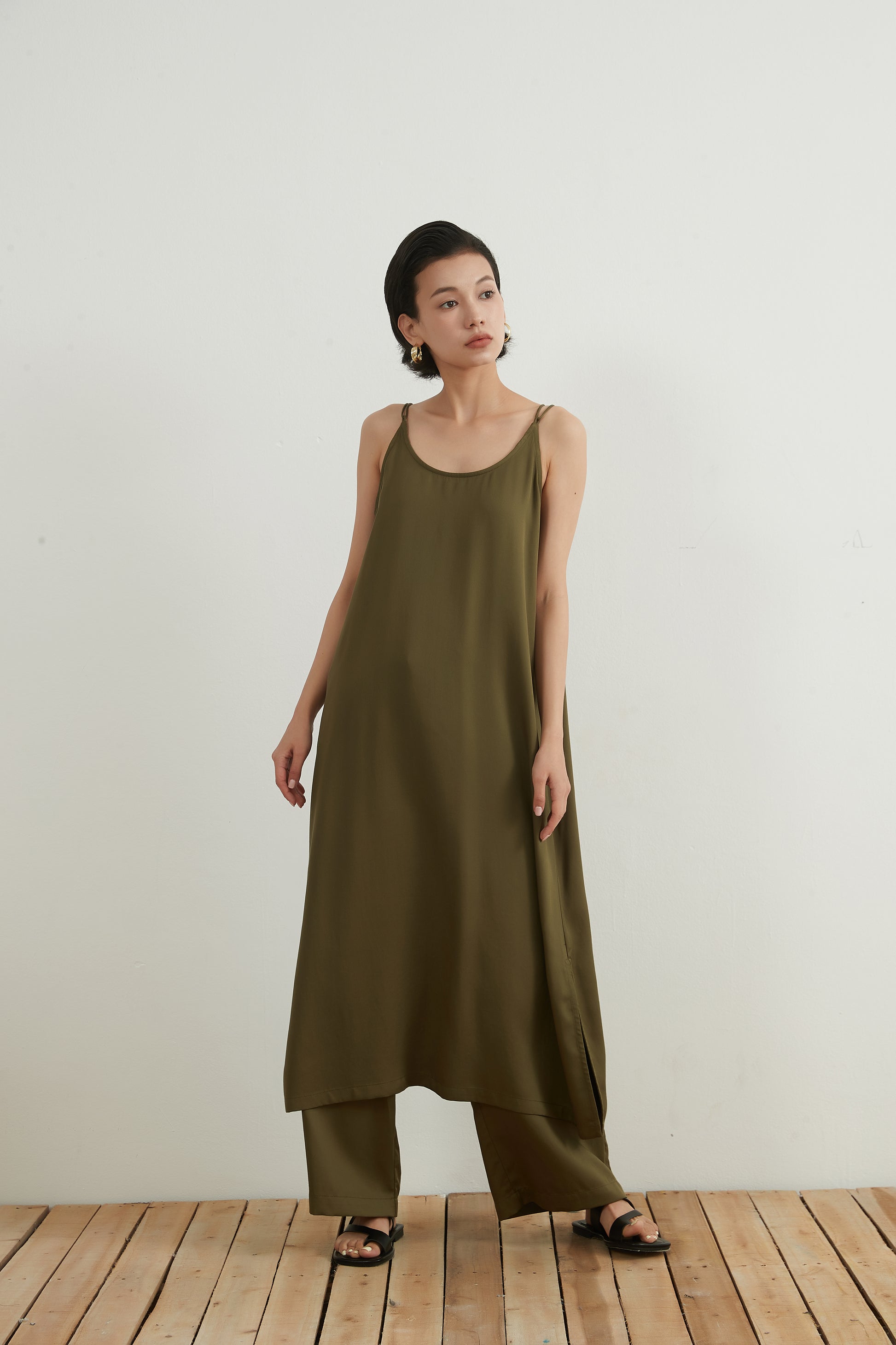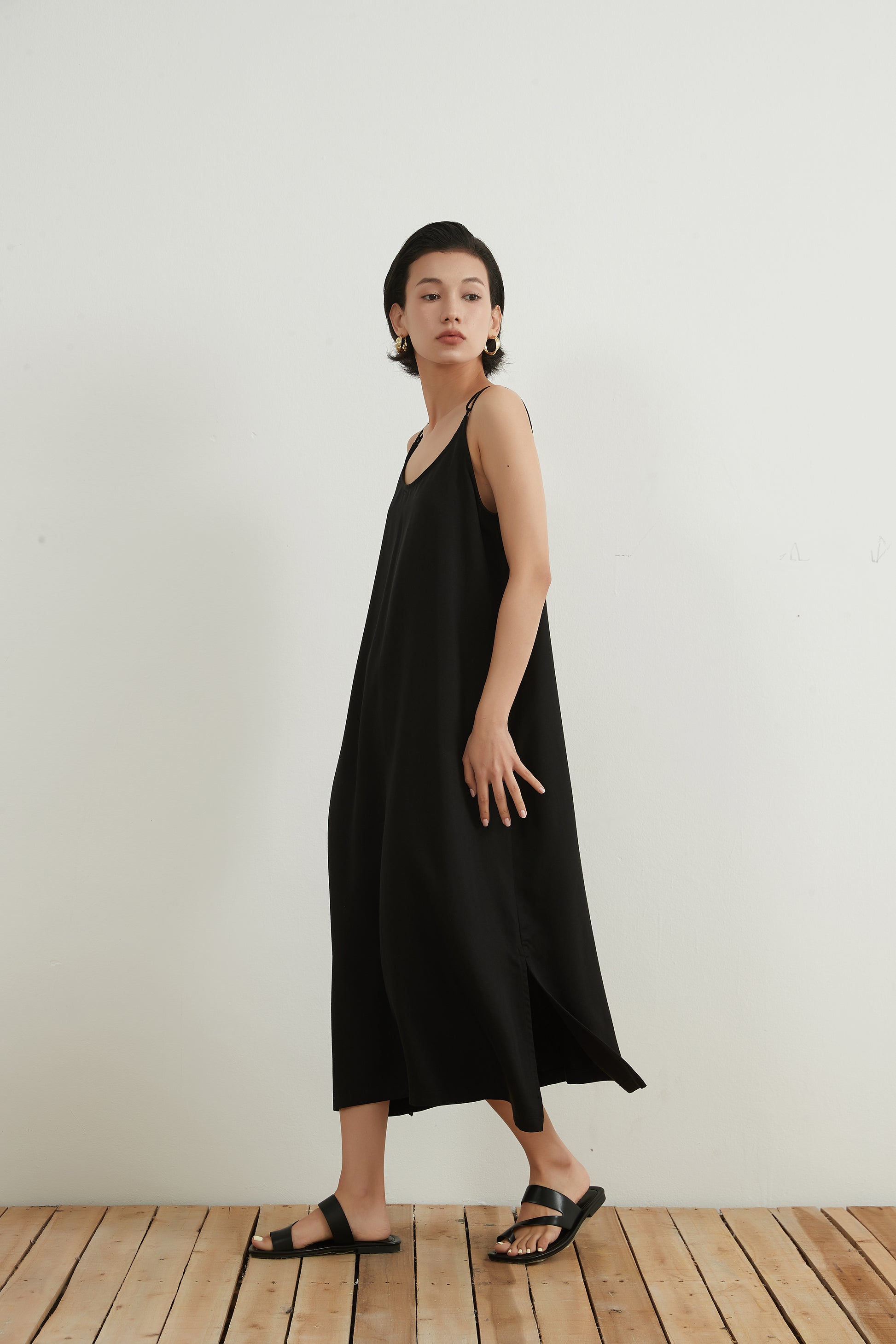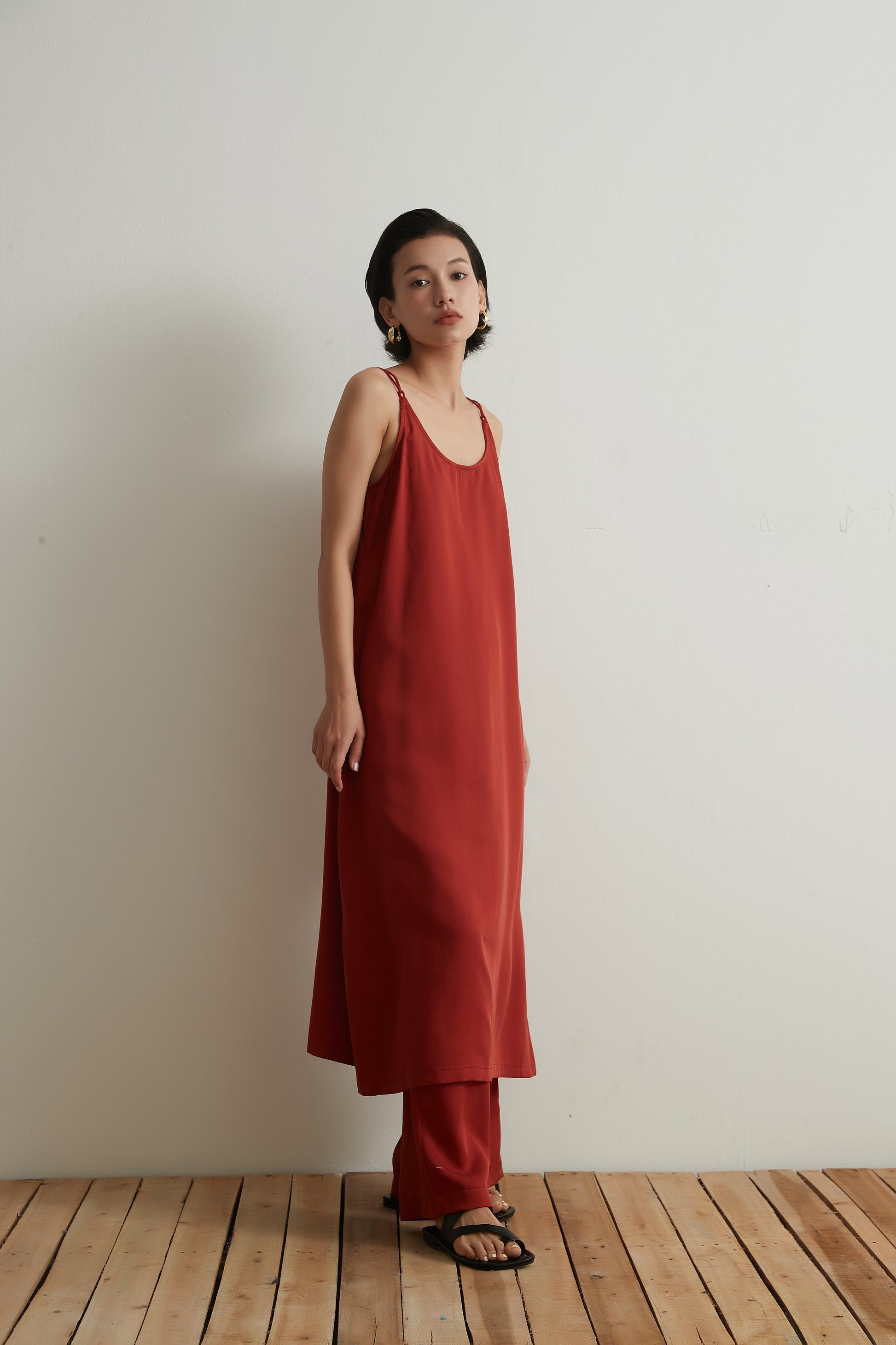 A luxurious camisole dress with delicate straps that exude a mature atmosphere. The lines are not too tight, making the body look neat and beautiful, and the thin straps add an accent to the simple design. It has a minimalist impression and can be worn alone, or paired with a sleeveless top or T-shirt for a casual style.