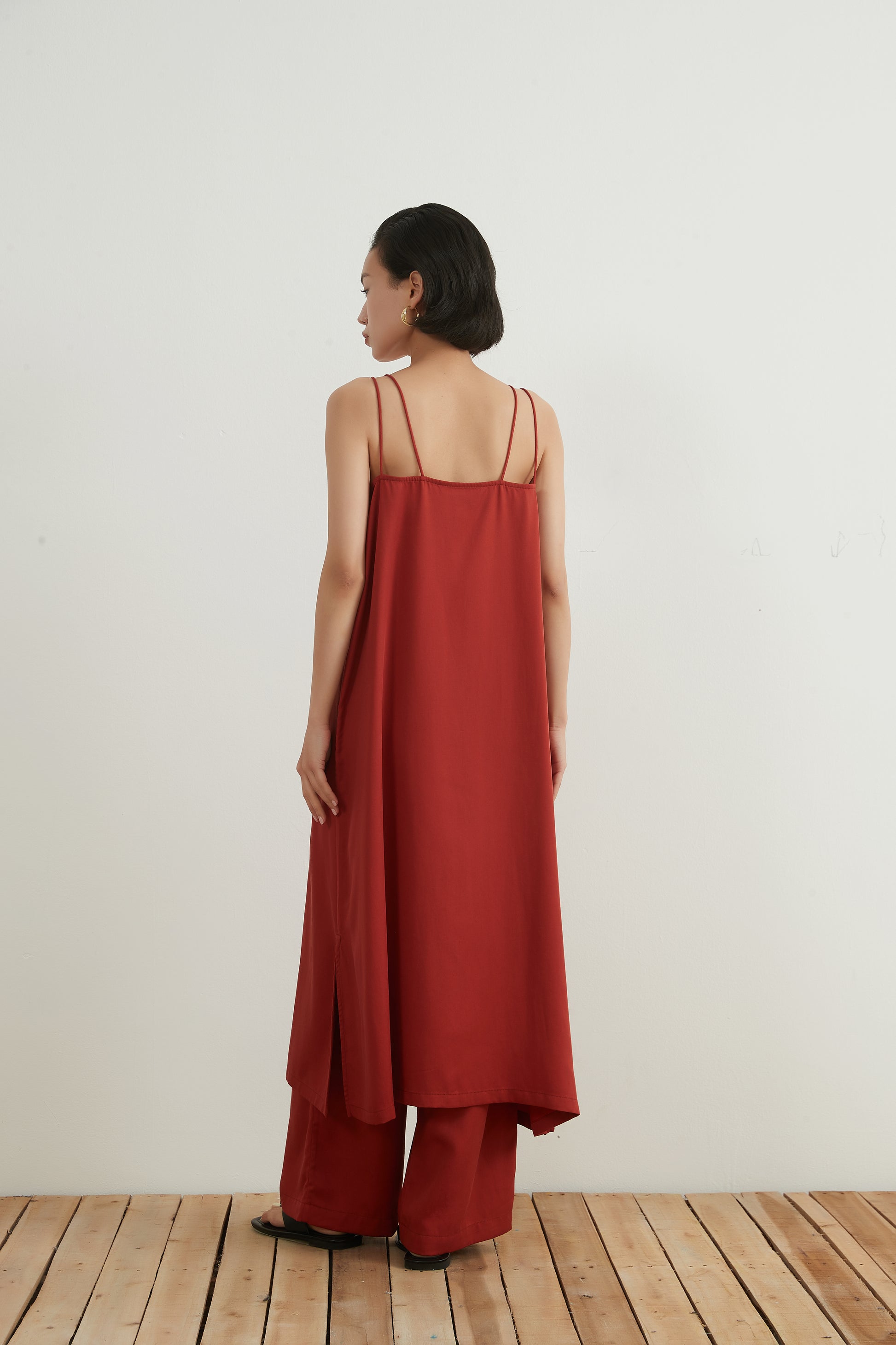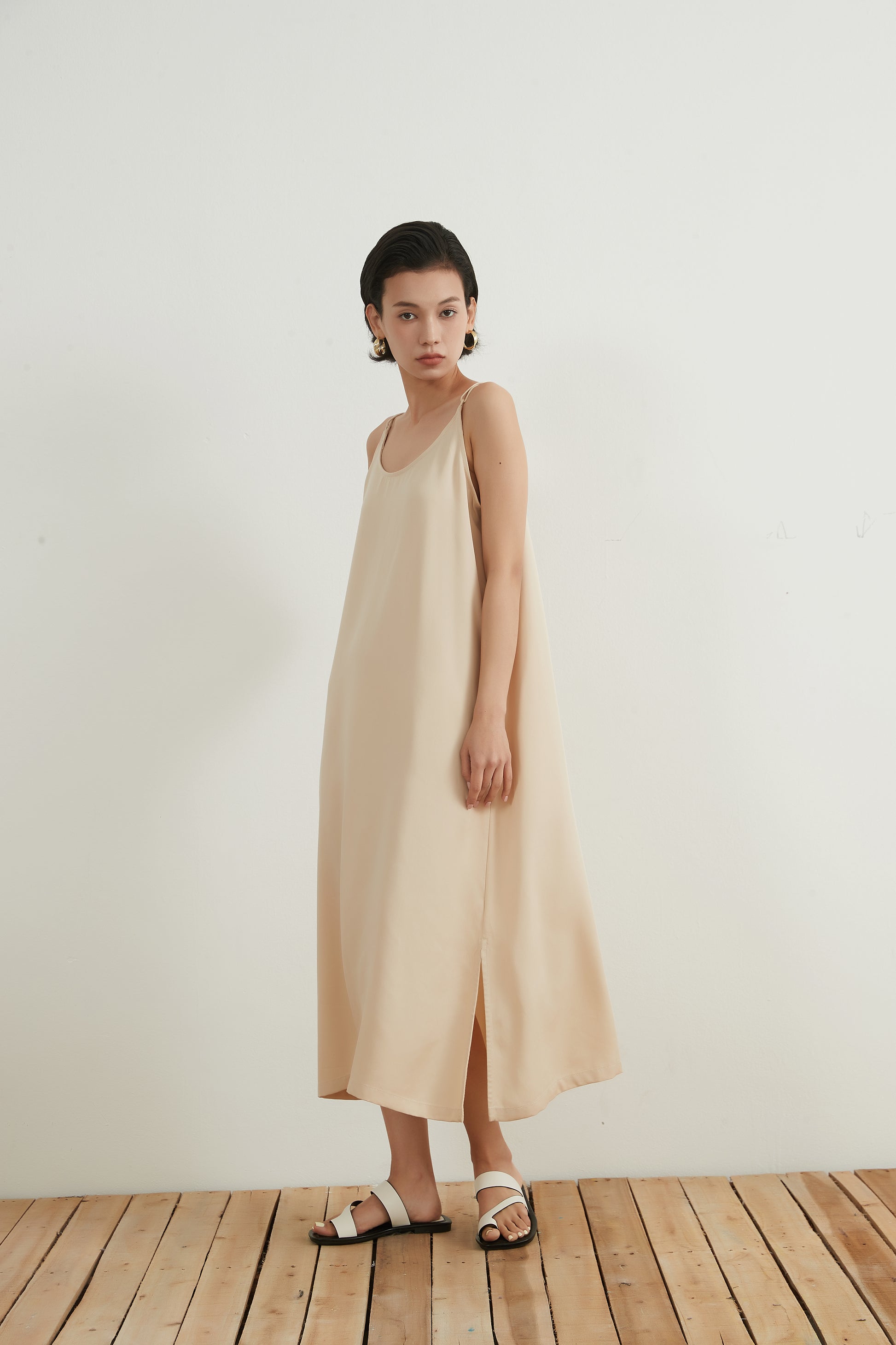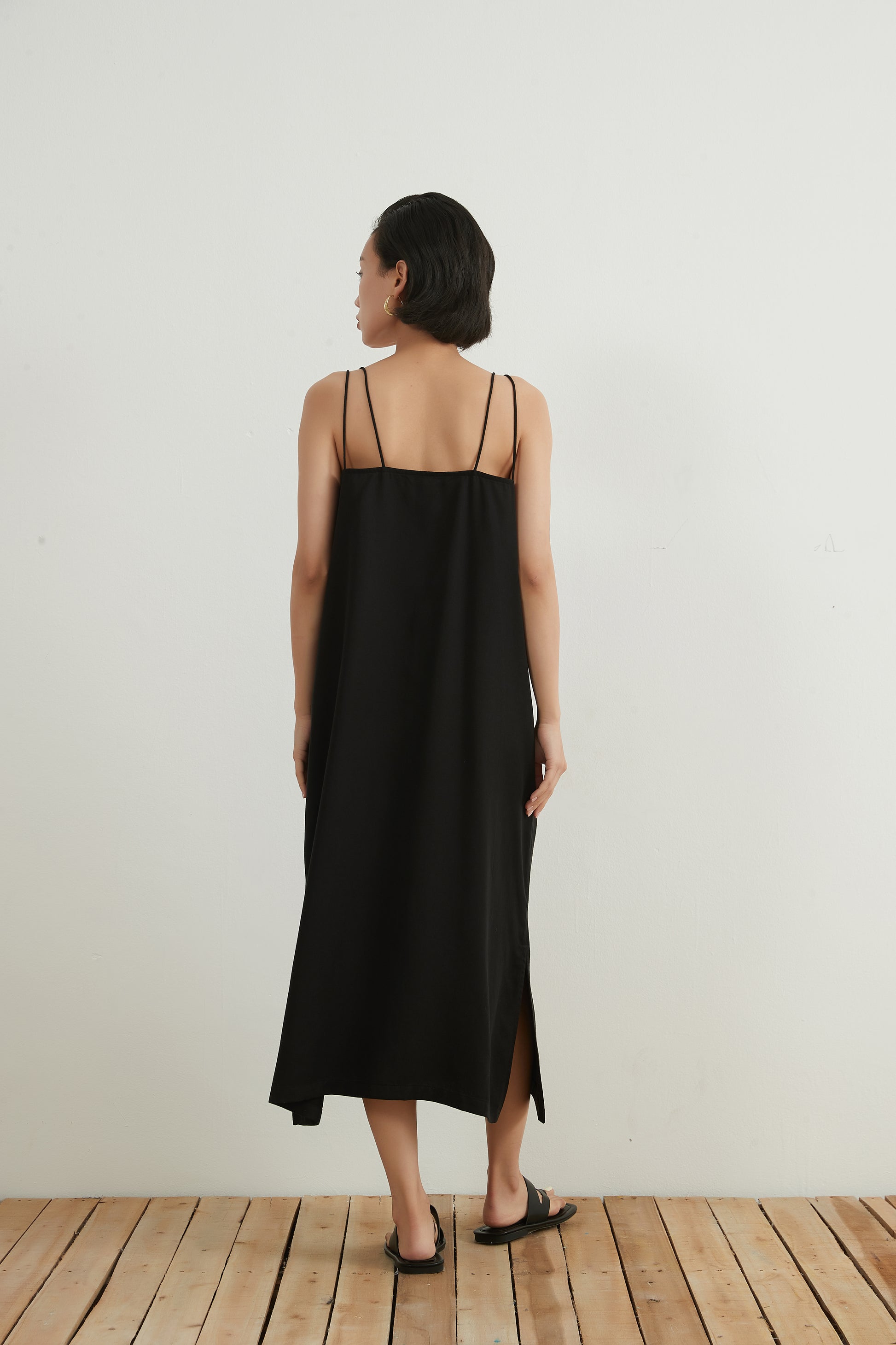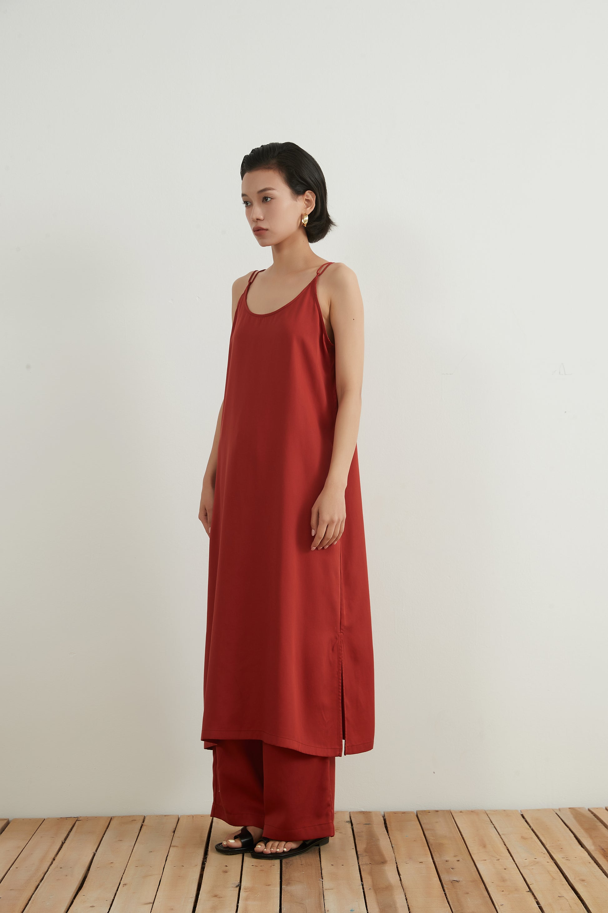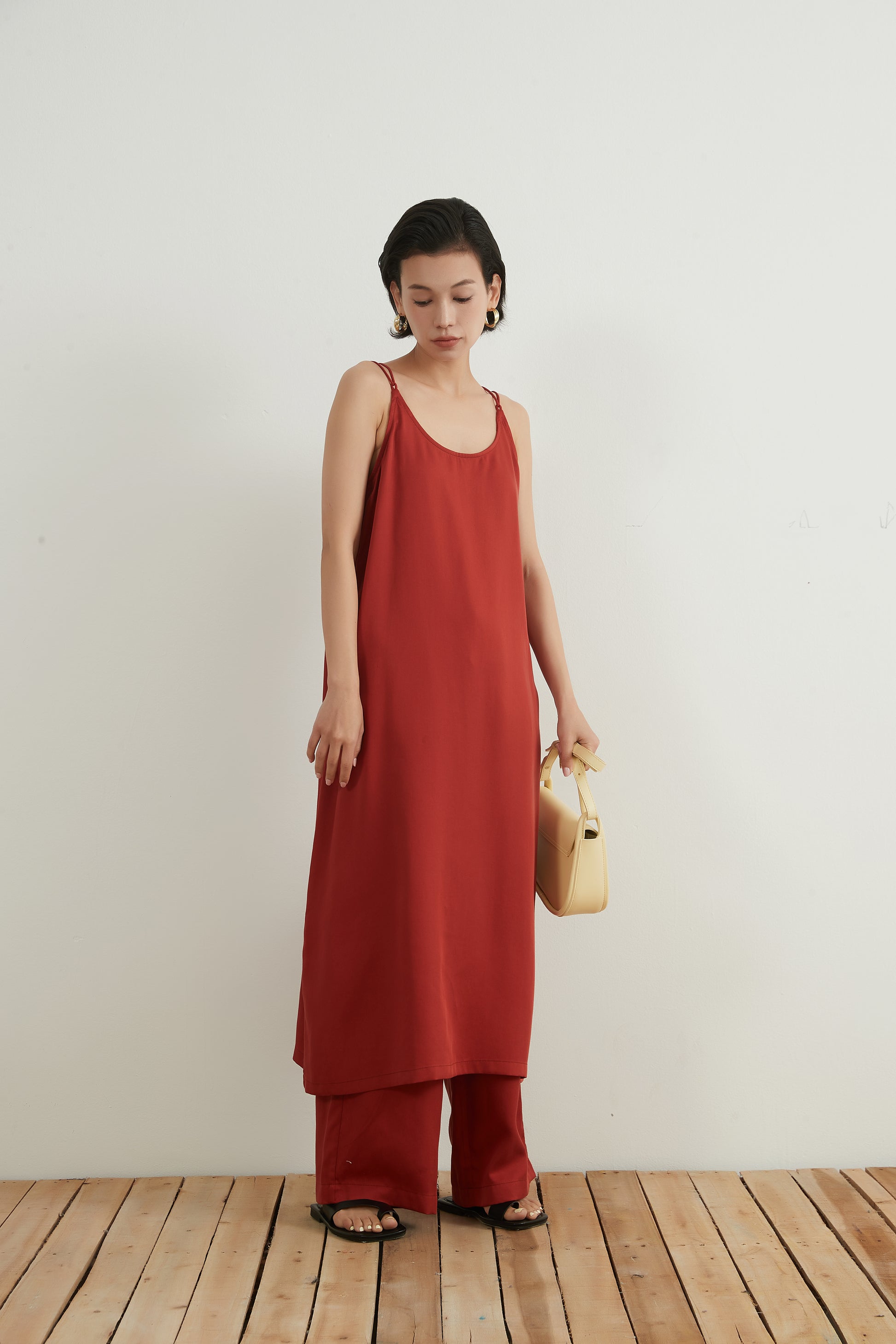A luxurious camisole dress with delicate straps that exude a mature atmosphere. The lines are not too tight, making the body look neat and beautiful, and the thin straps add an accent to the simple design. It has a minimalist impression and can be worn alone, or paired with a sleeveless top or T-shirt for a casual style.