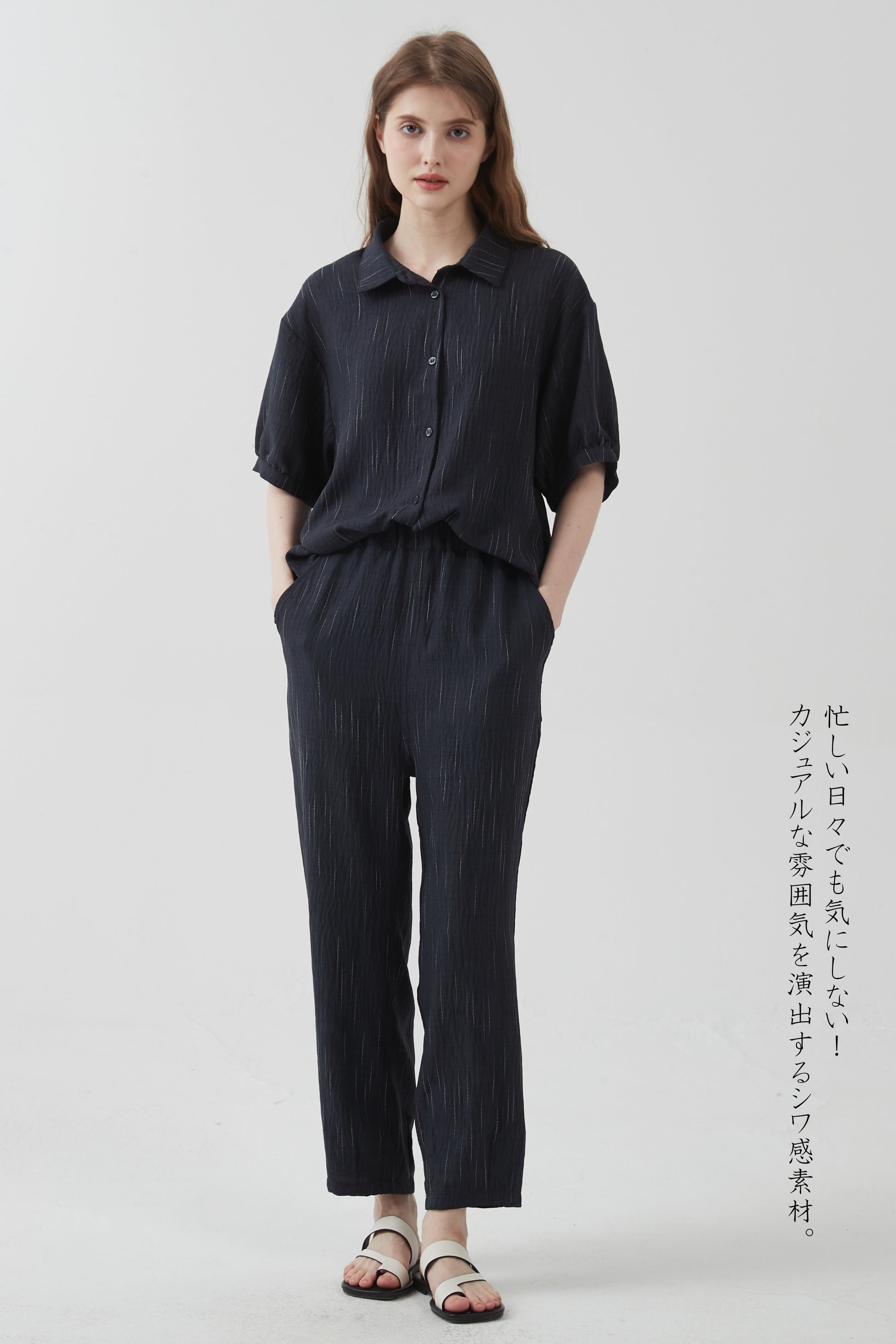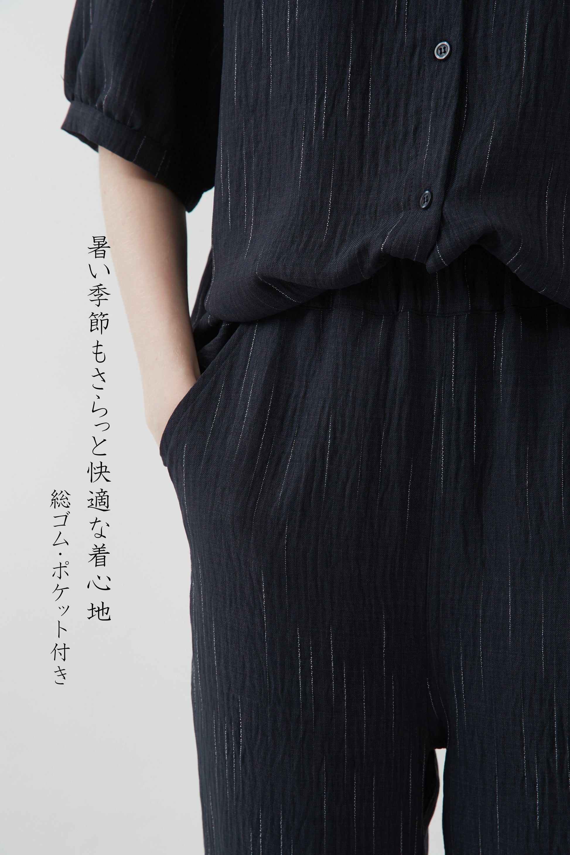 かすれストライプセットアップ・シワ感素材・ブラウスとコクーンパンツのらくちんコーデ-KNXC432/433