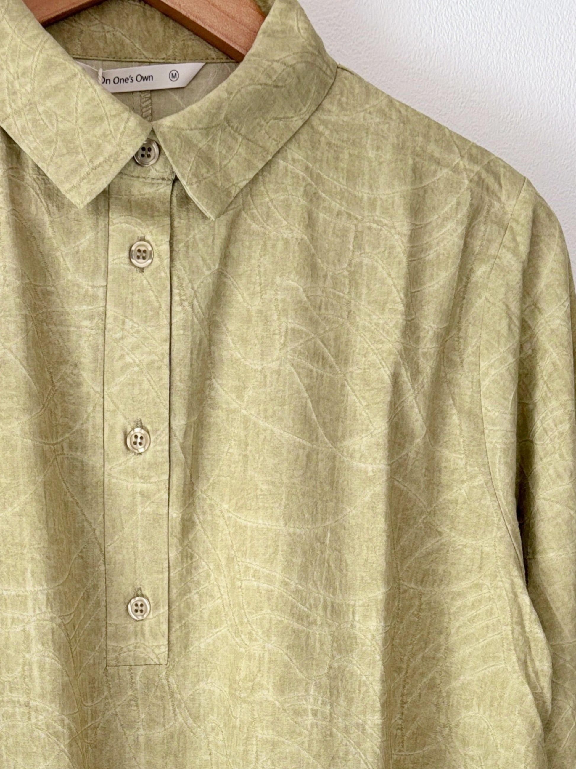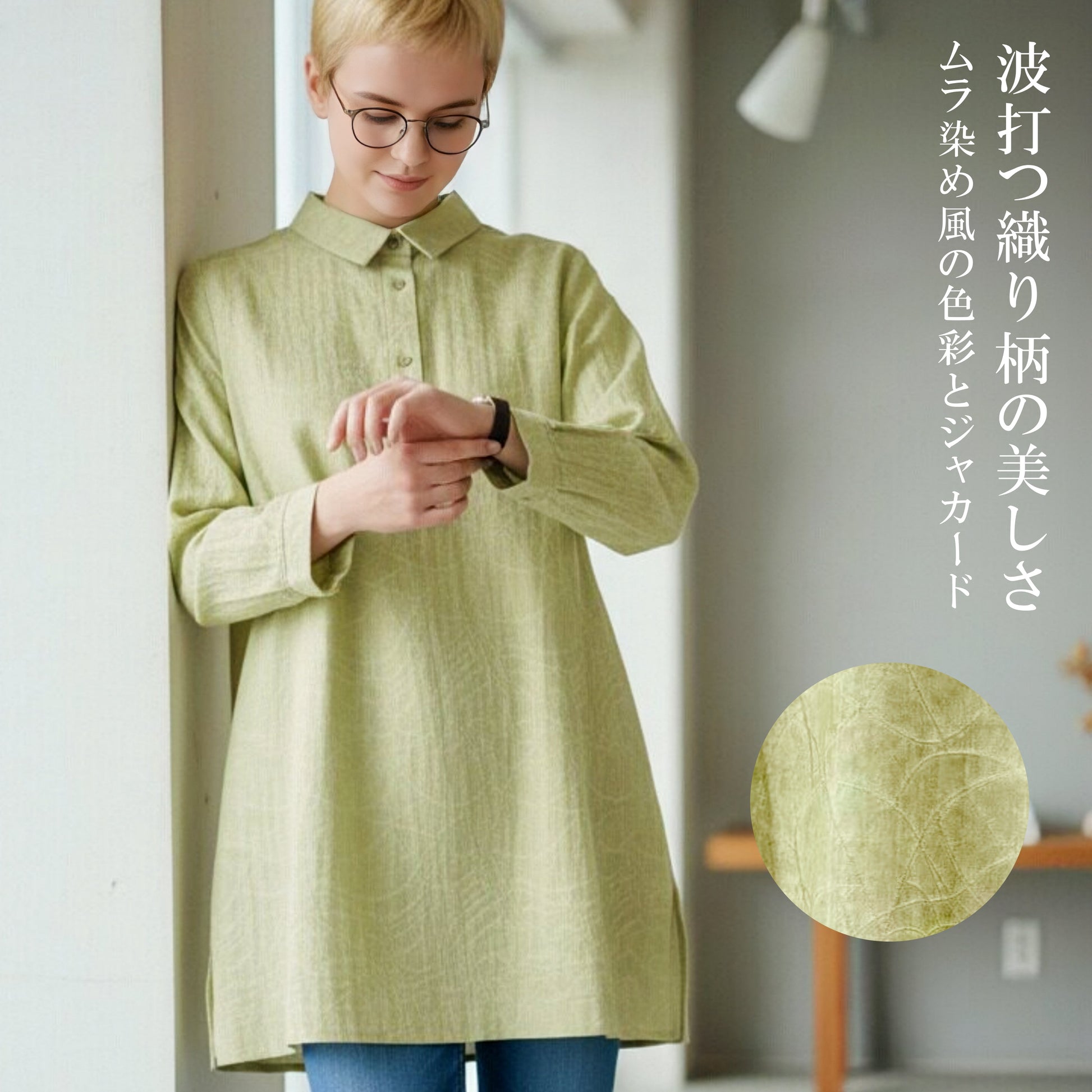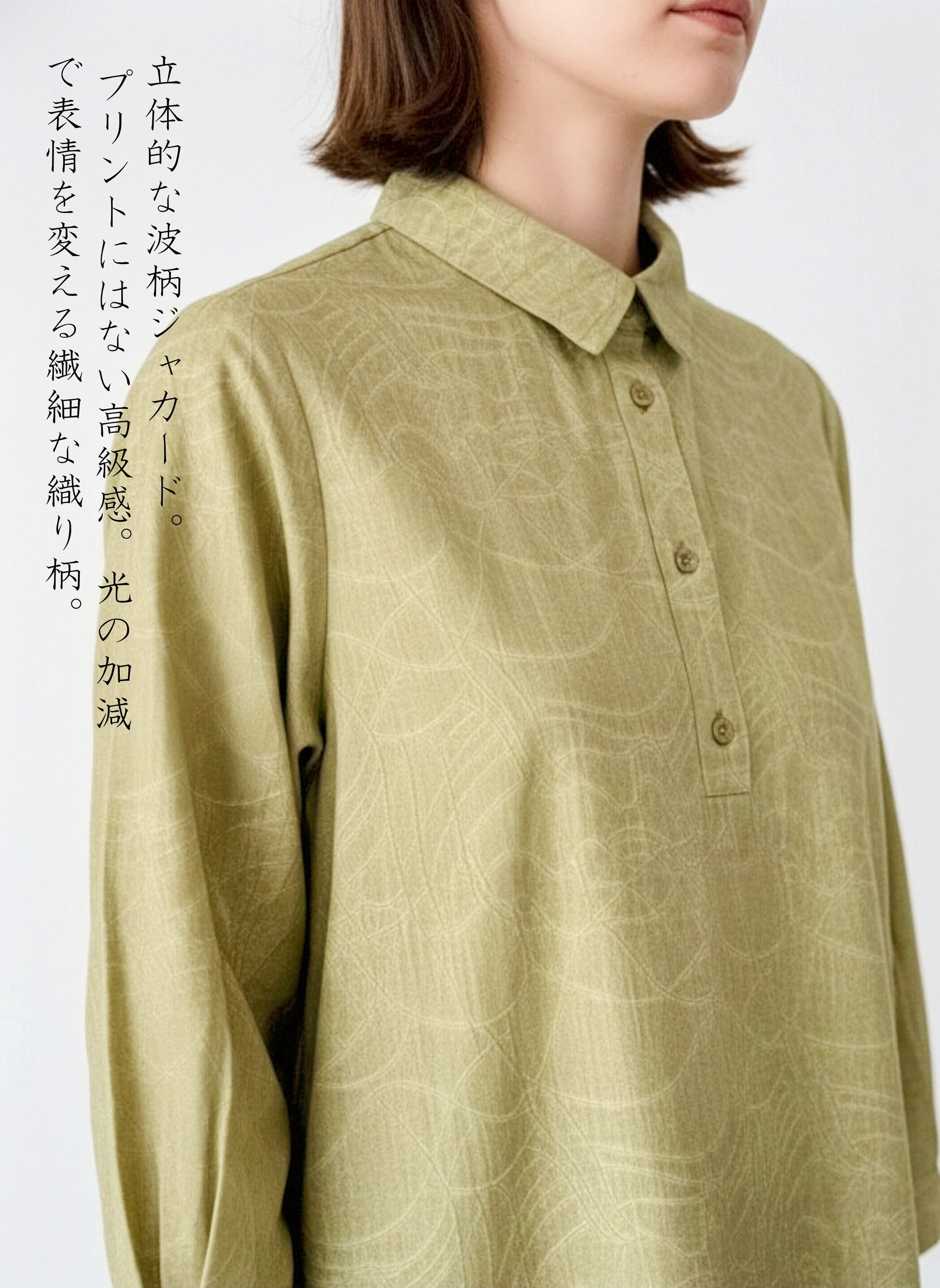 ムラ染め風の明るい色彩に、波打つような弧を描く織り柄を主役にしたハーフボタンチュニック。美しい素材感を活かしたシンプルなデザインは、どんな装いにも馴染む「上品スタンダード」な一着です。