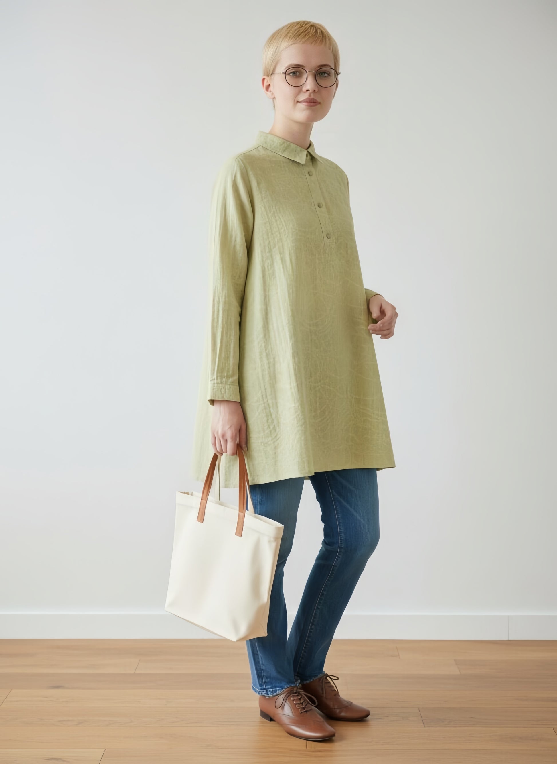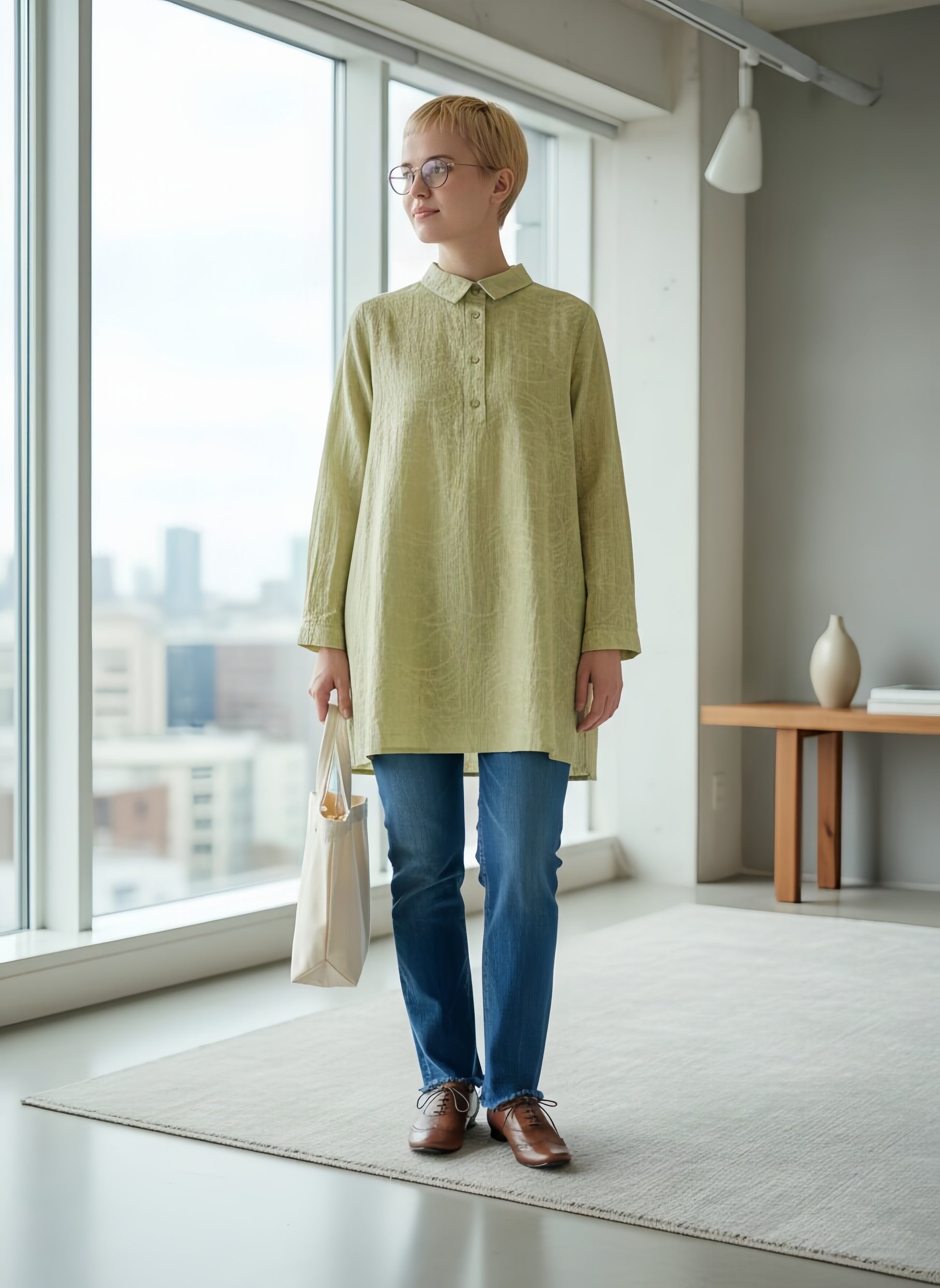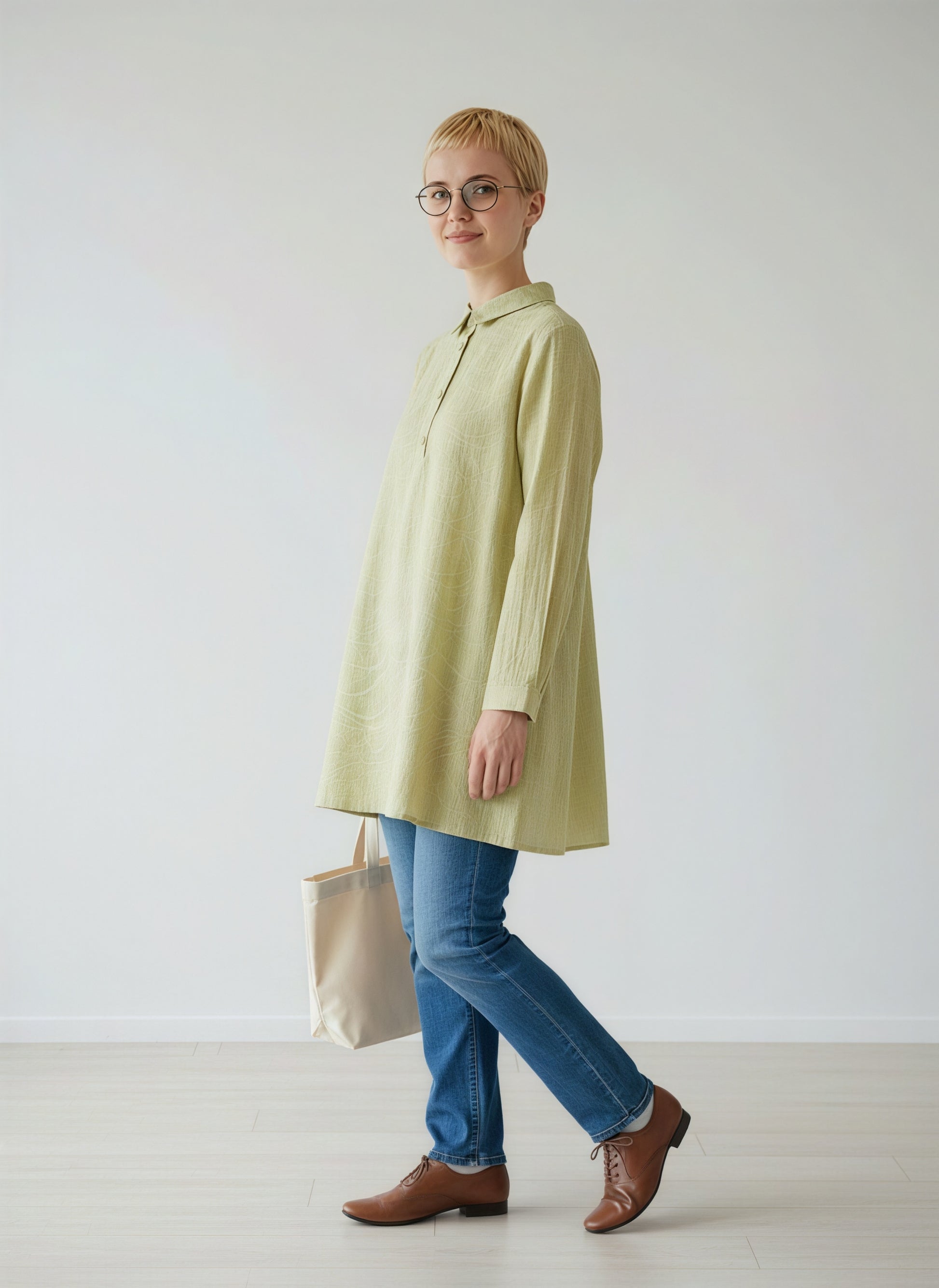 ムラ染め風の明るい色彩に、波打つような弧を描く織り柄を主役にしたハーフボタンチュニック。美しい素材感を活かしたシンプルなデザインは、どんな装いにも馴染む「上品スタンダード」な一着です。