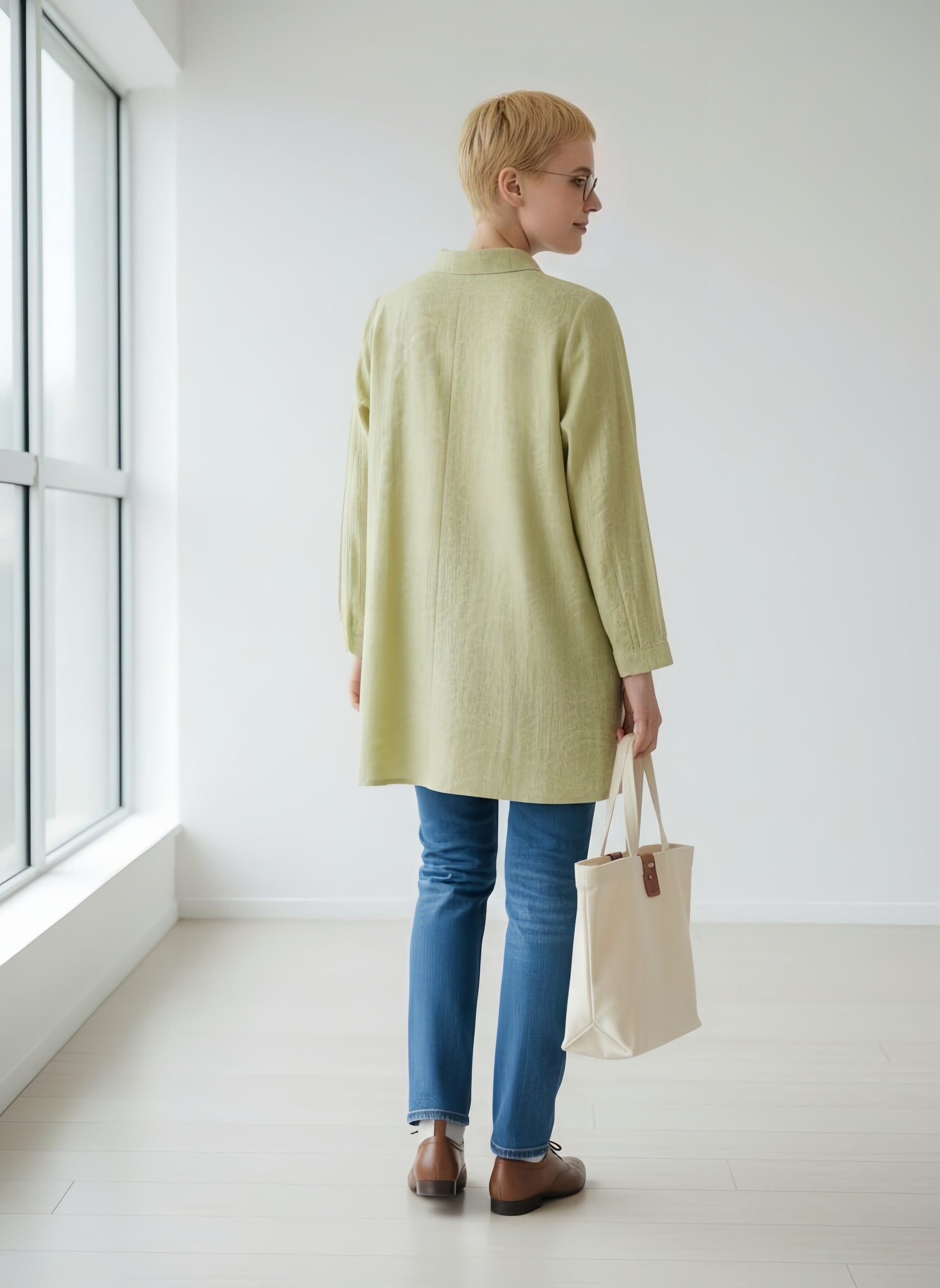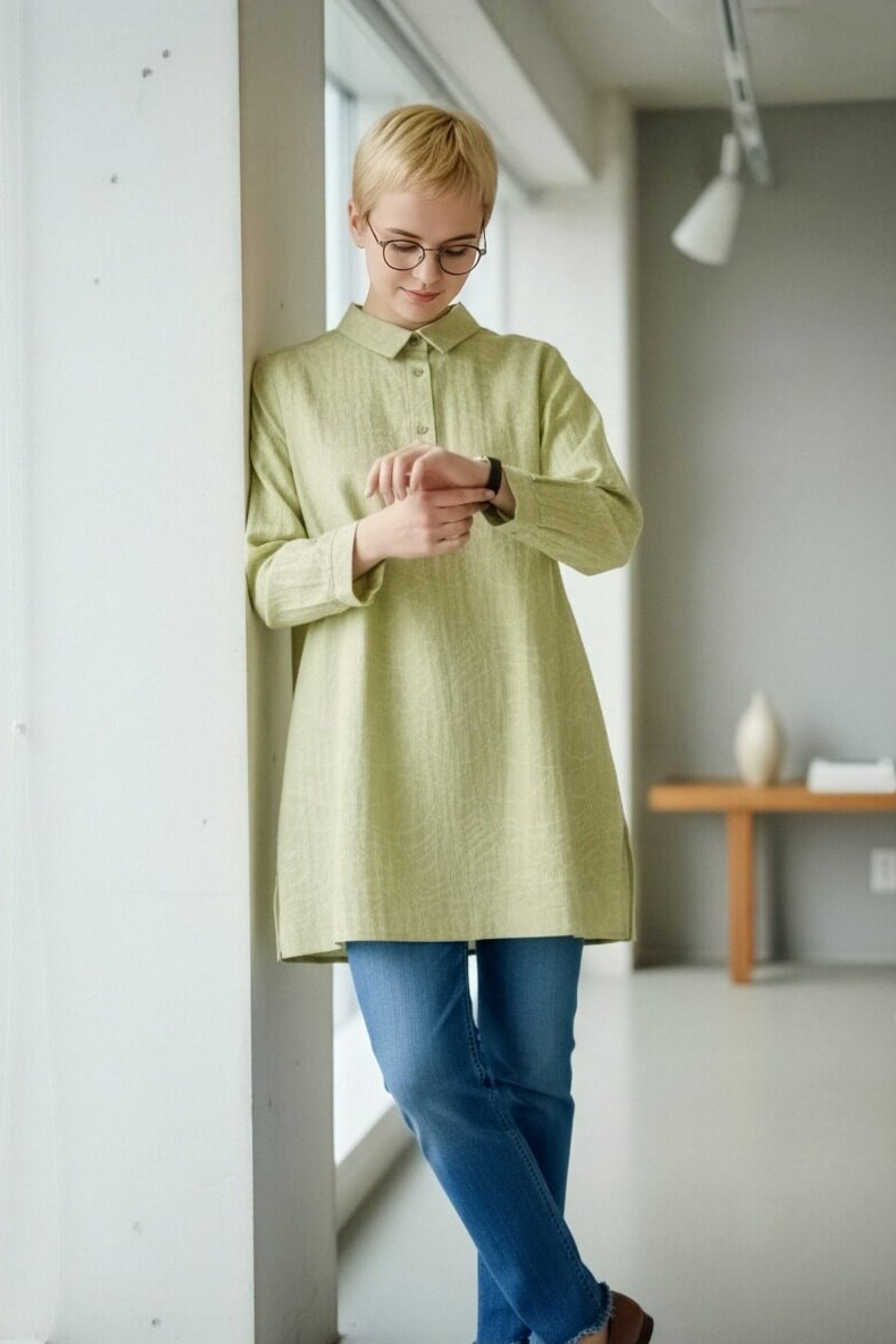 細身のクロップドパンツやテーパードパンツと合わせれば、トップスのゆったり感との対比で全身がスッキリと整います。ムラ染め風の明るいライムグリーンが、顔回りをパッと明るく健康的に見せてくれます。