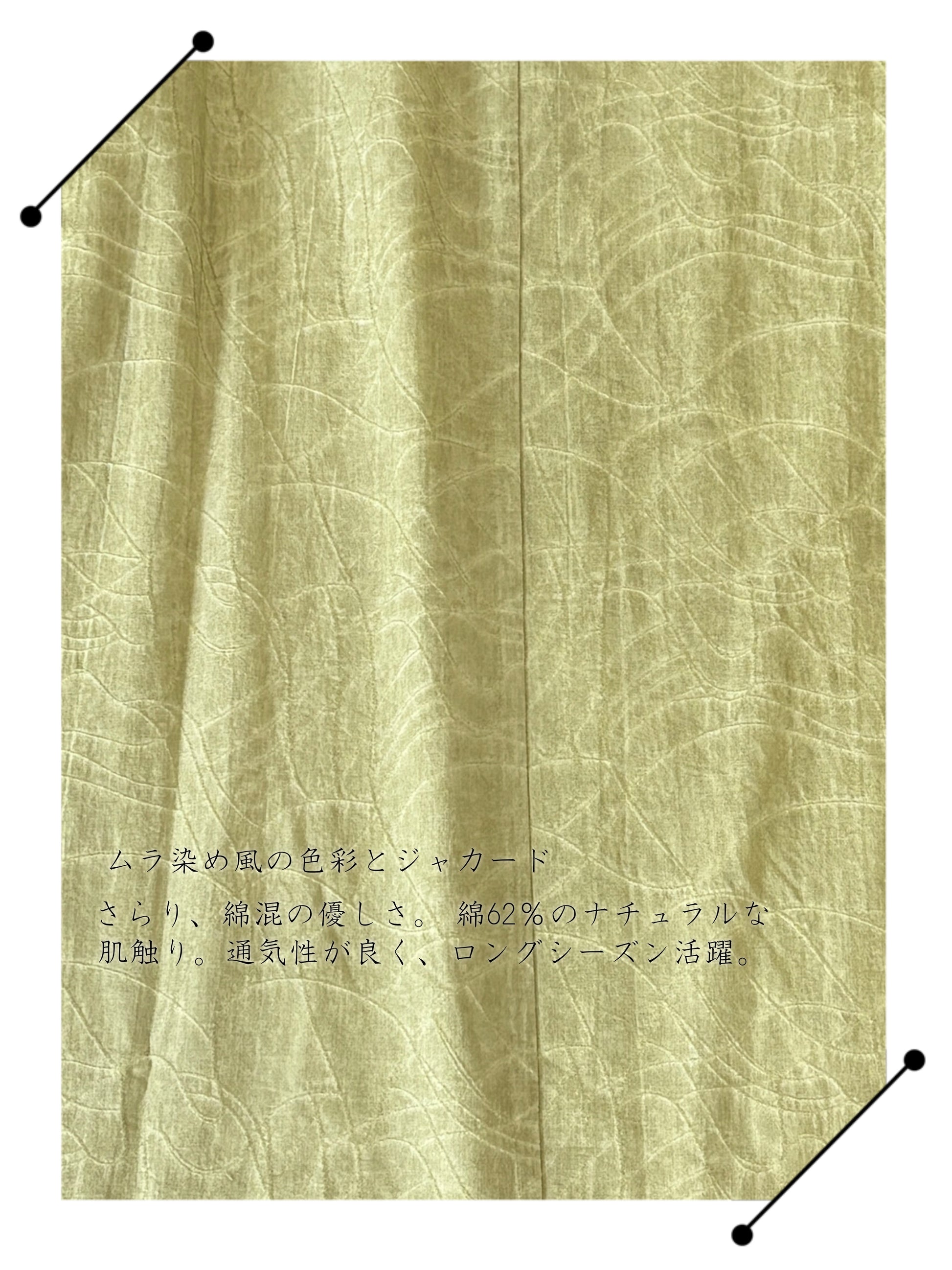 ・素材:綿 62%、レーヨン 29%、再生繊維(セルロース) 9% ・サイズ:M / L / LL ・特徴:ハーフボタン仕様、波柄ジャカード織、家庭洗濯可能