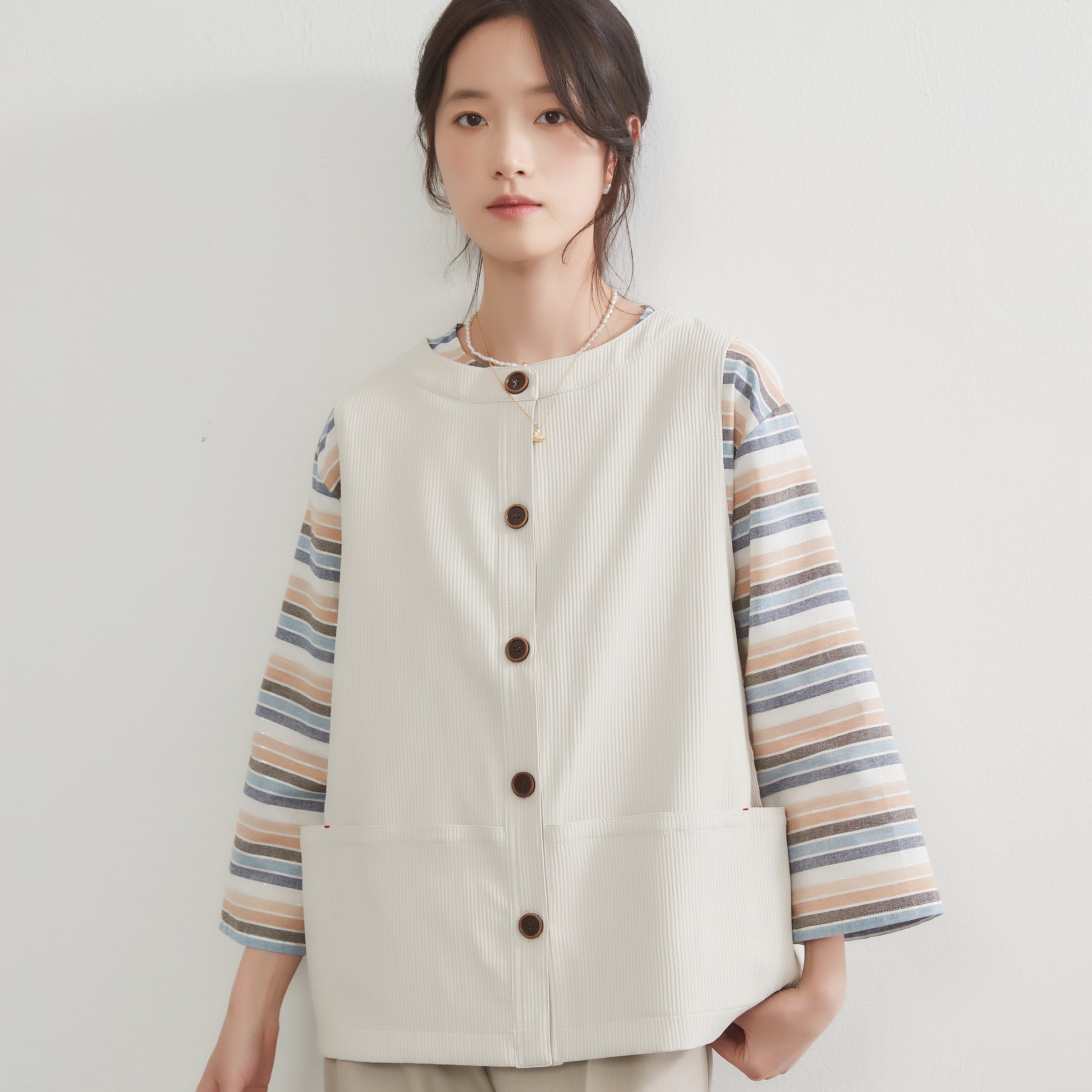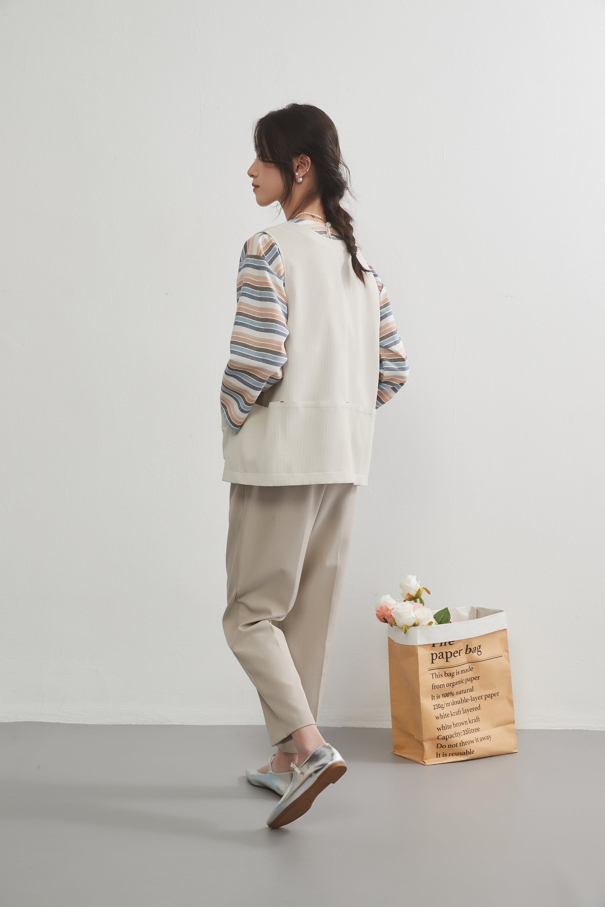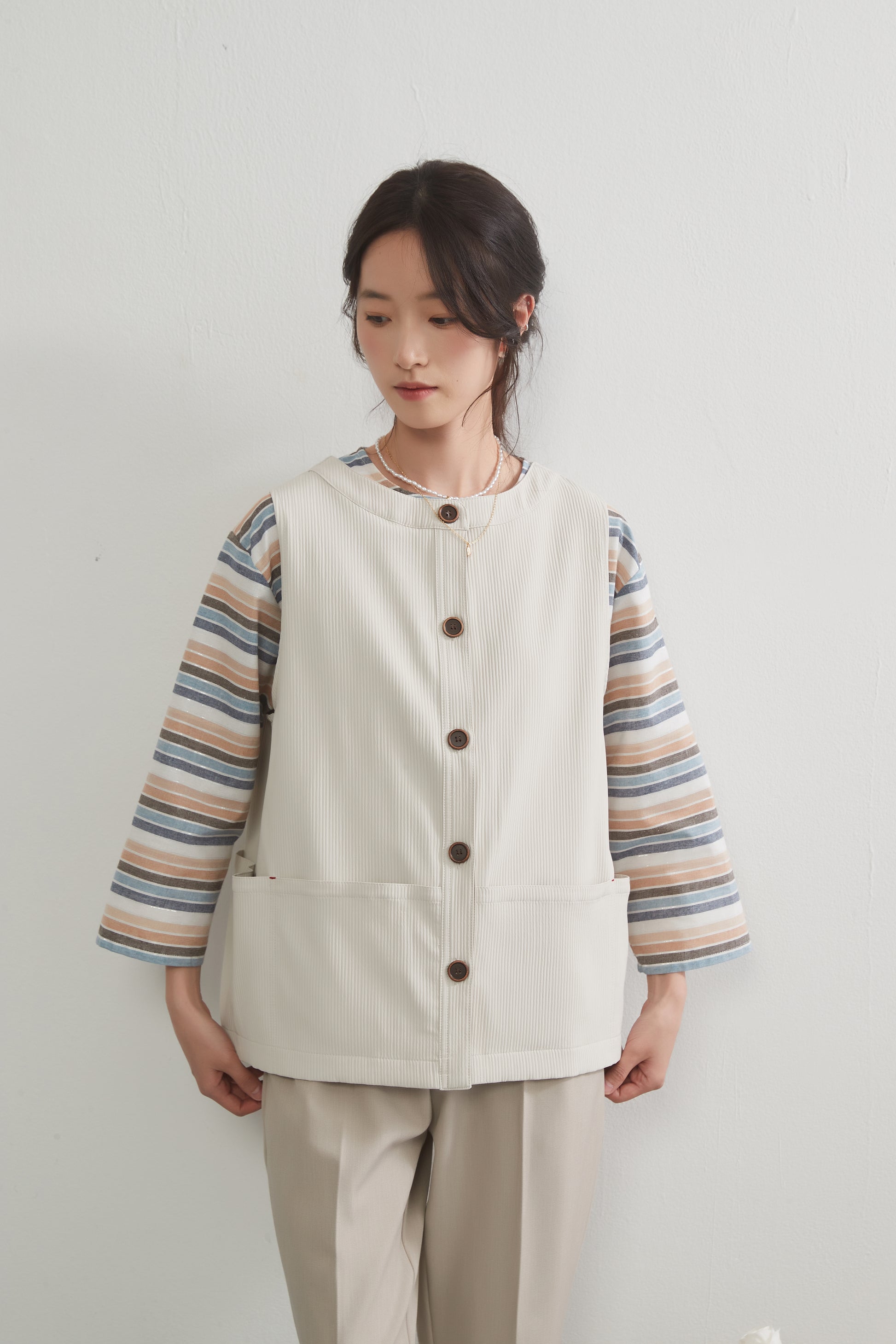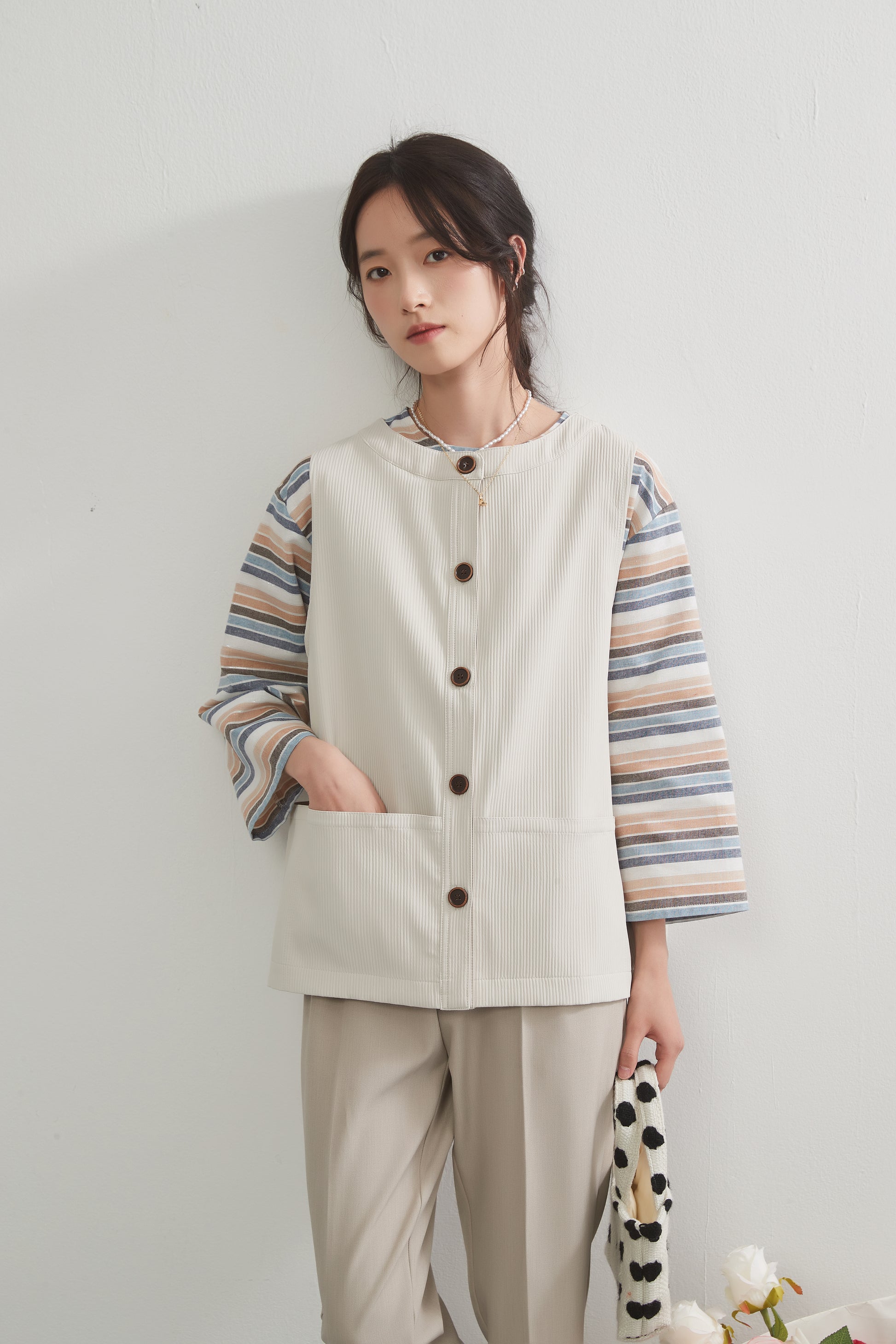 KNXV533-ピンタック織りゆったりベスト・便利ポケットたくさん配色ボタンベスト