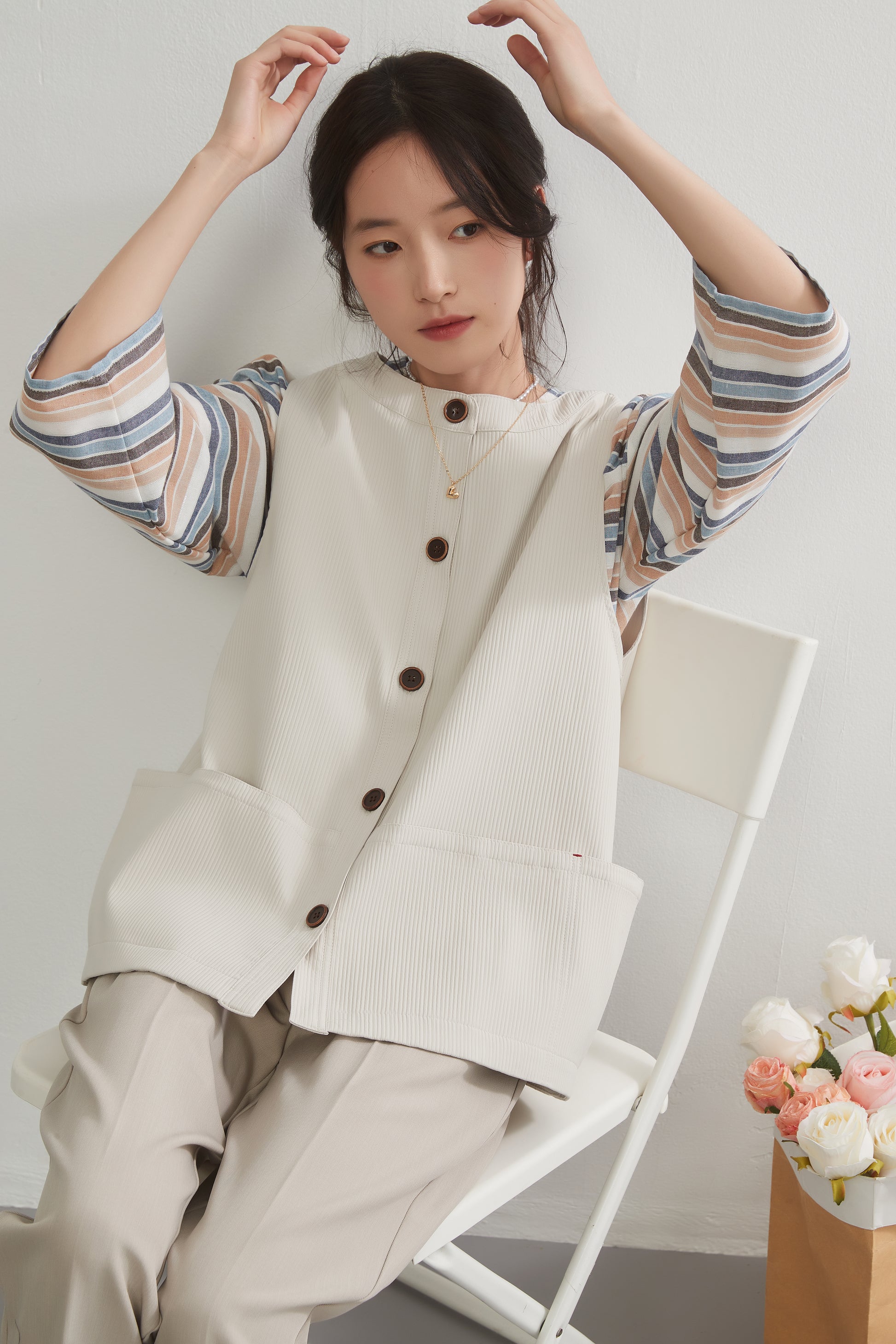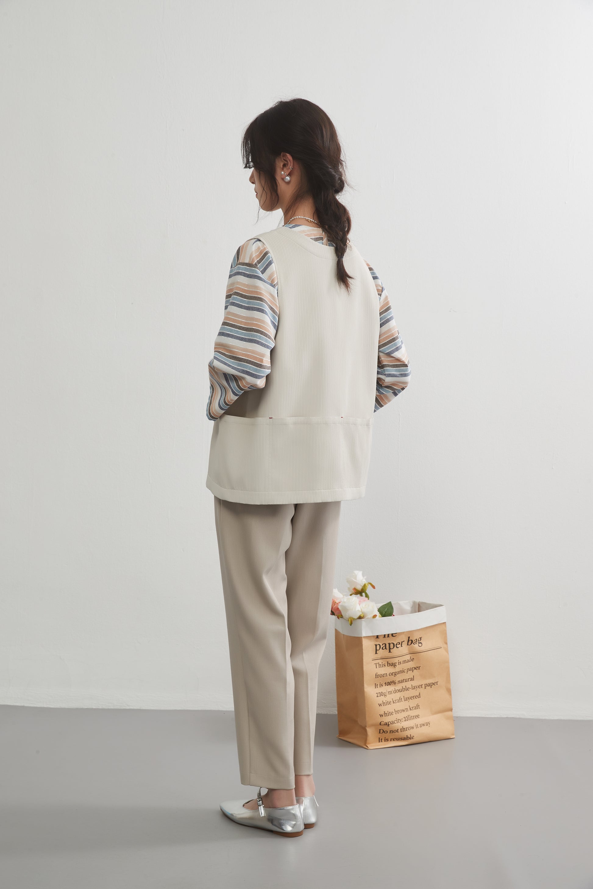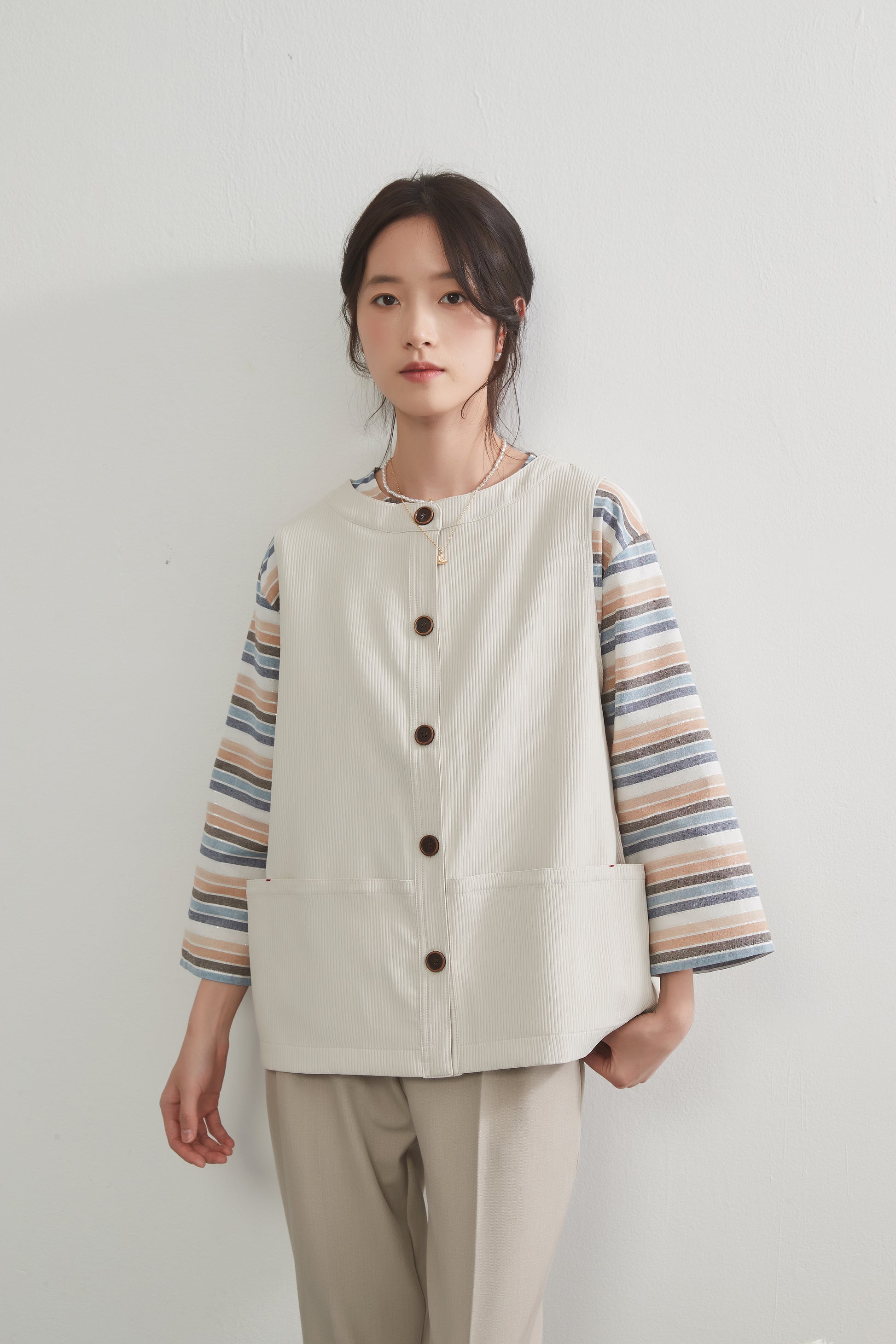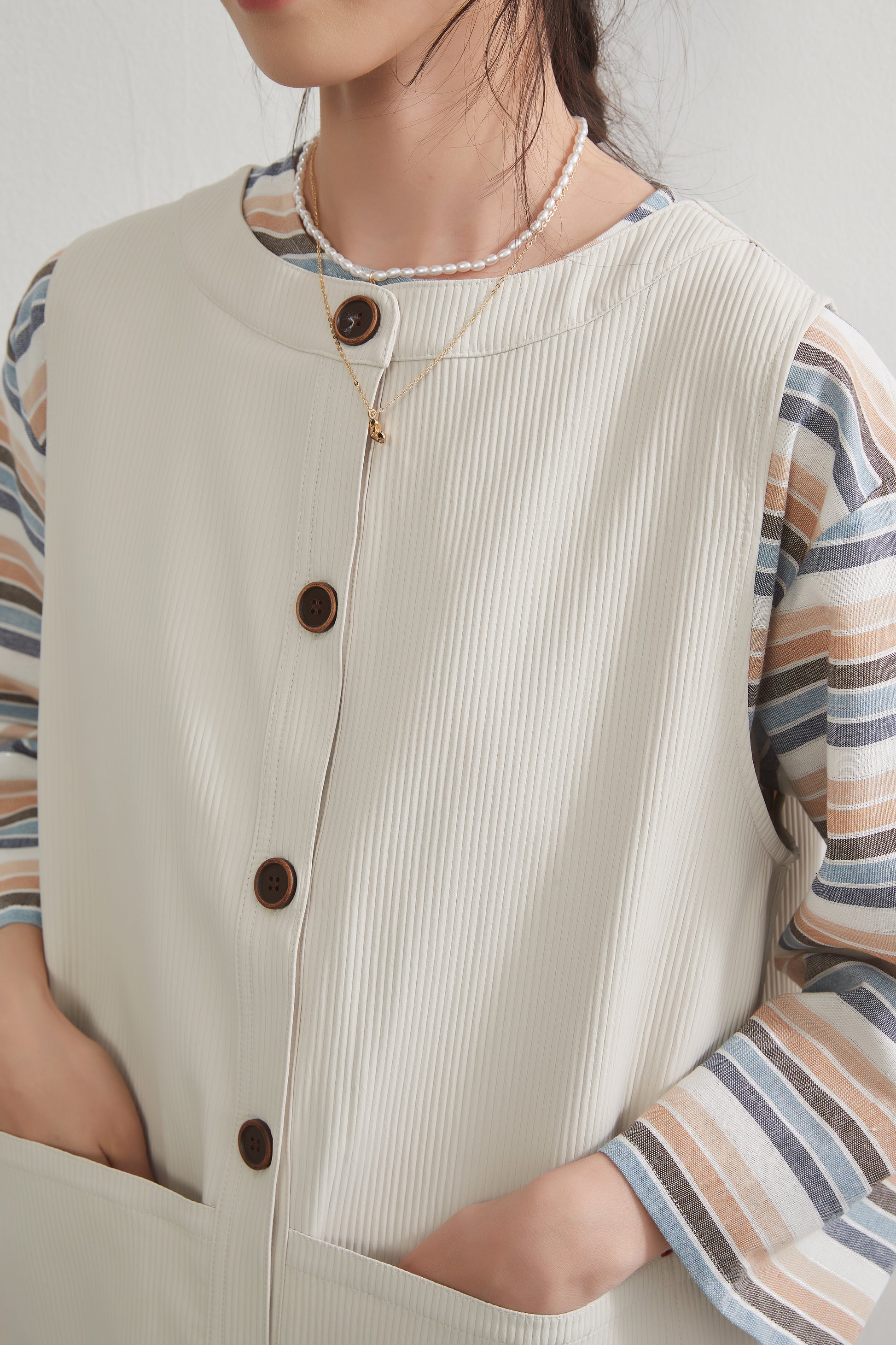KNXV533-ピンタック織りゆったりベスト・便利ポケットたくさん配色ボタンベスト