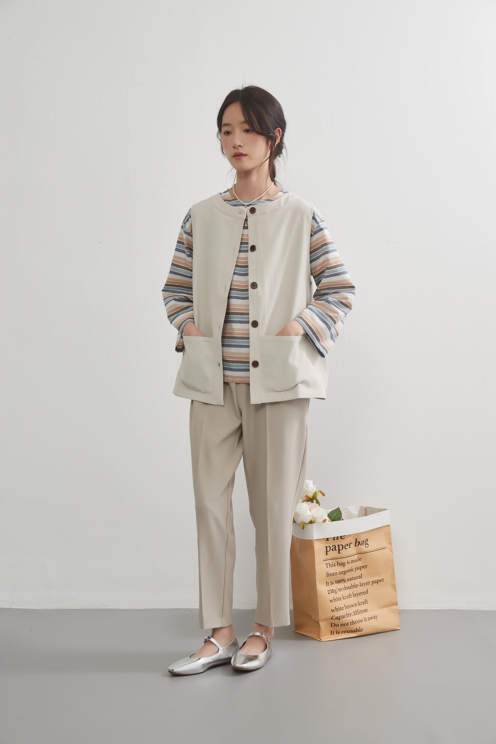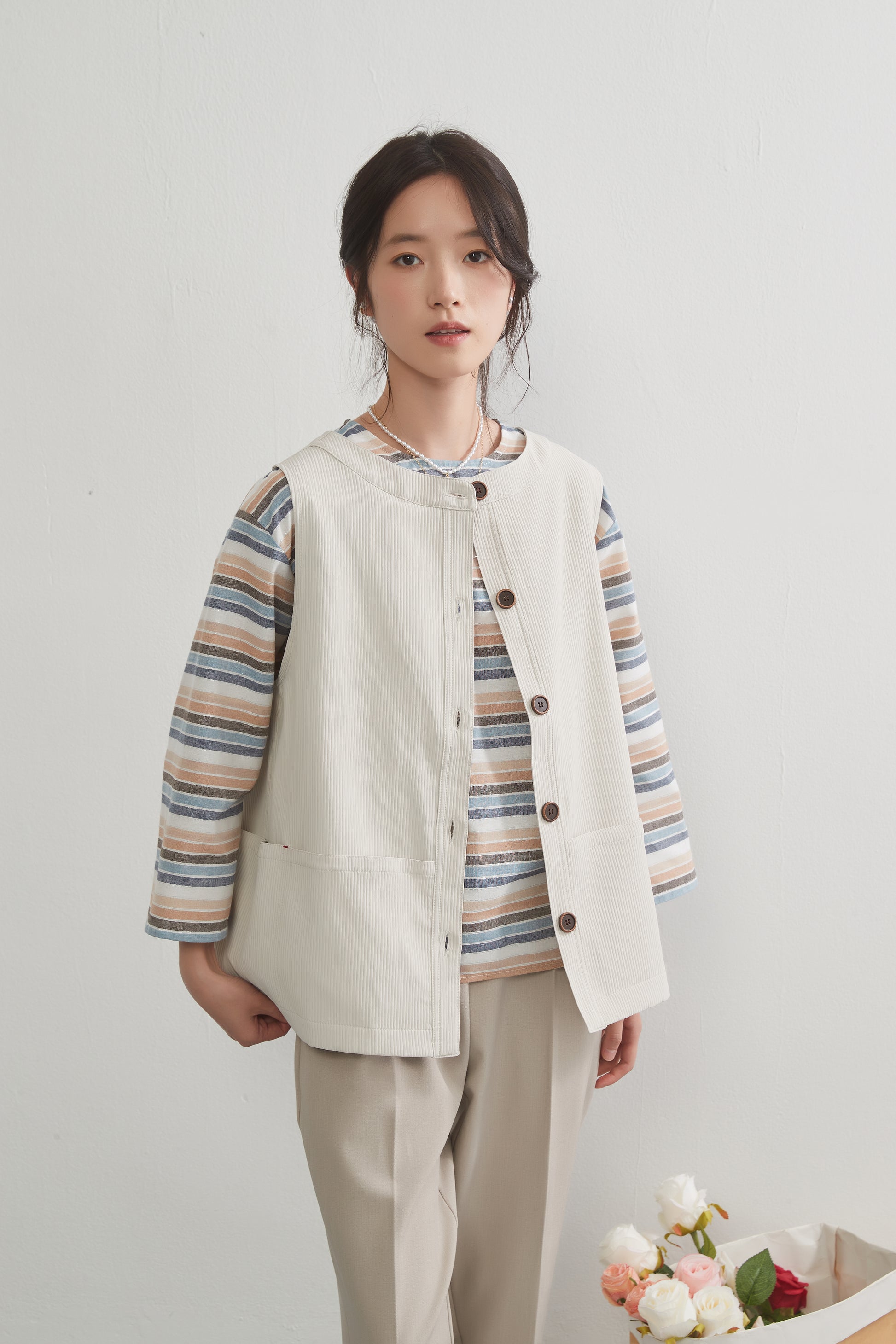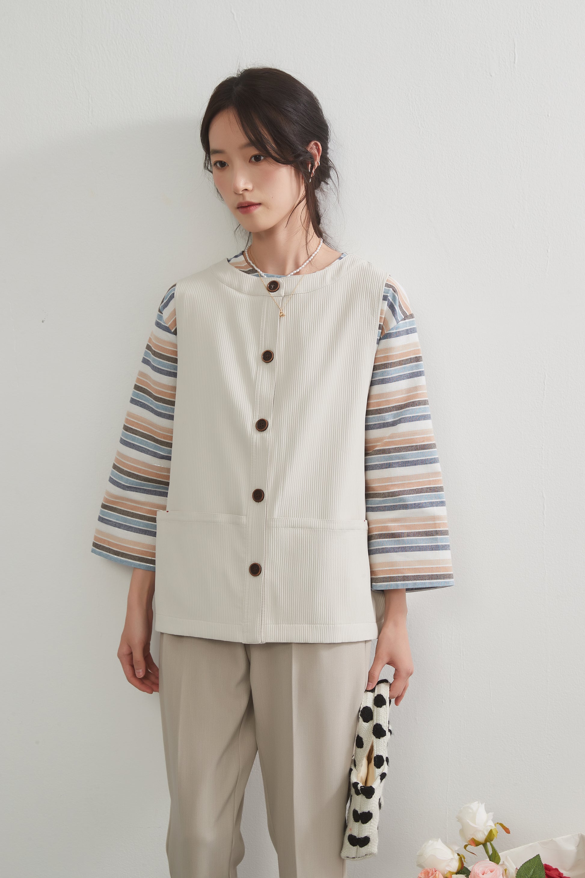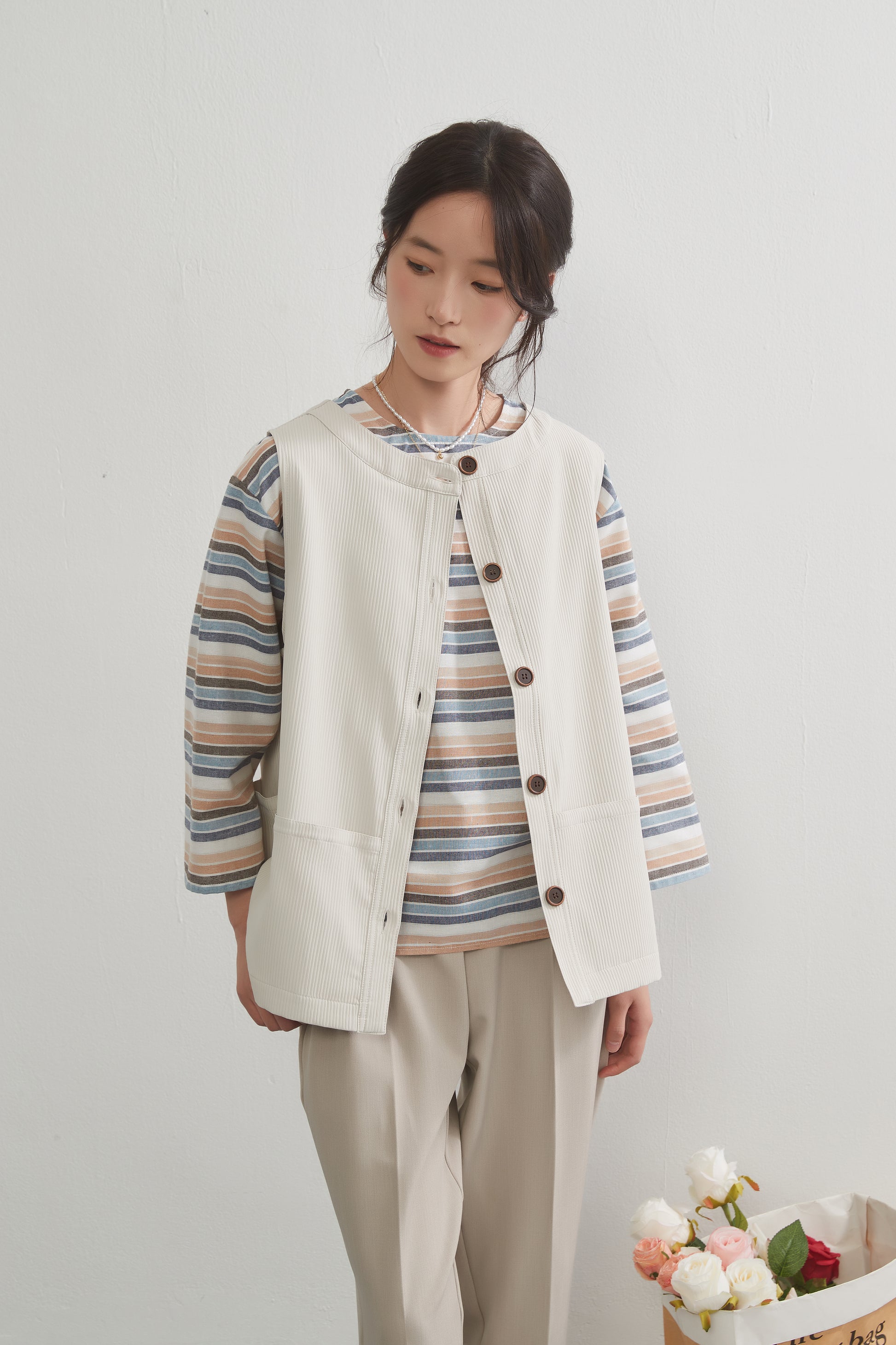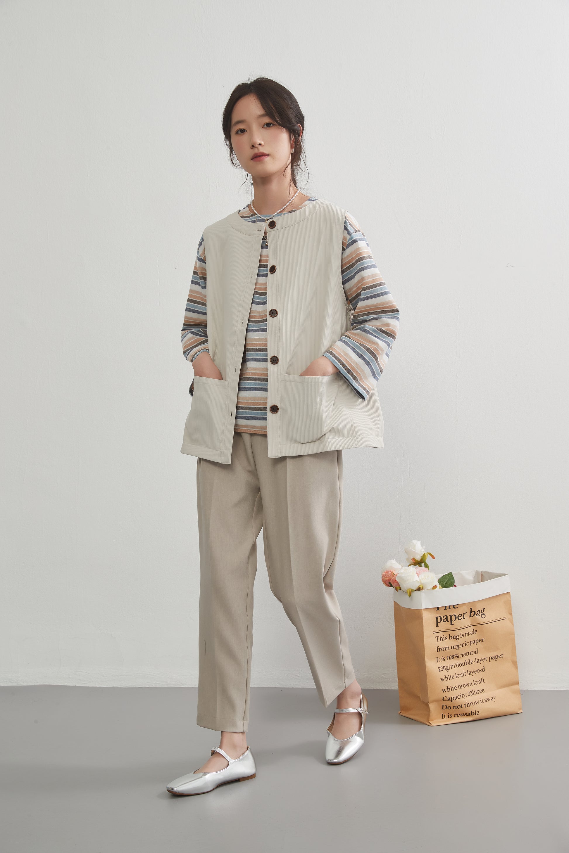 KNXV533-ピンタック織りゆったりベスト・便利ポケットたくさん配色ボタンベスト