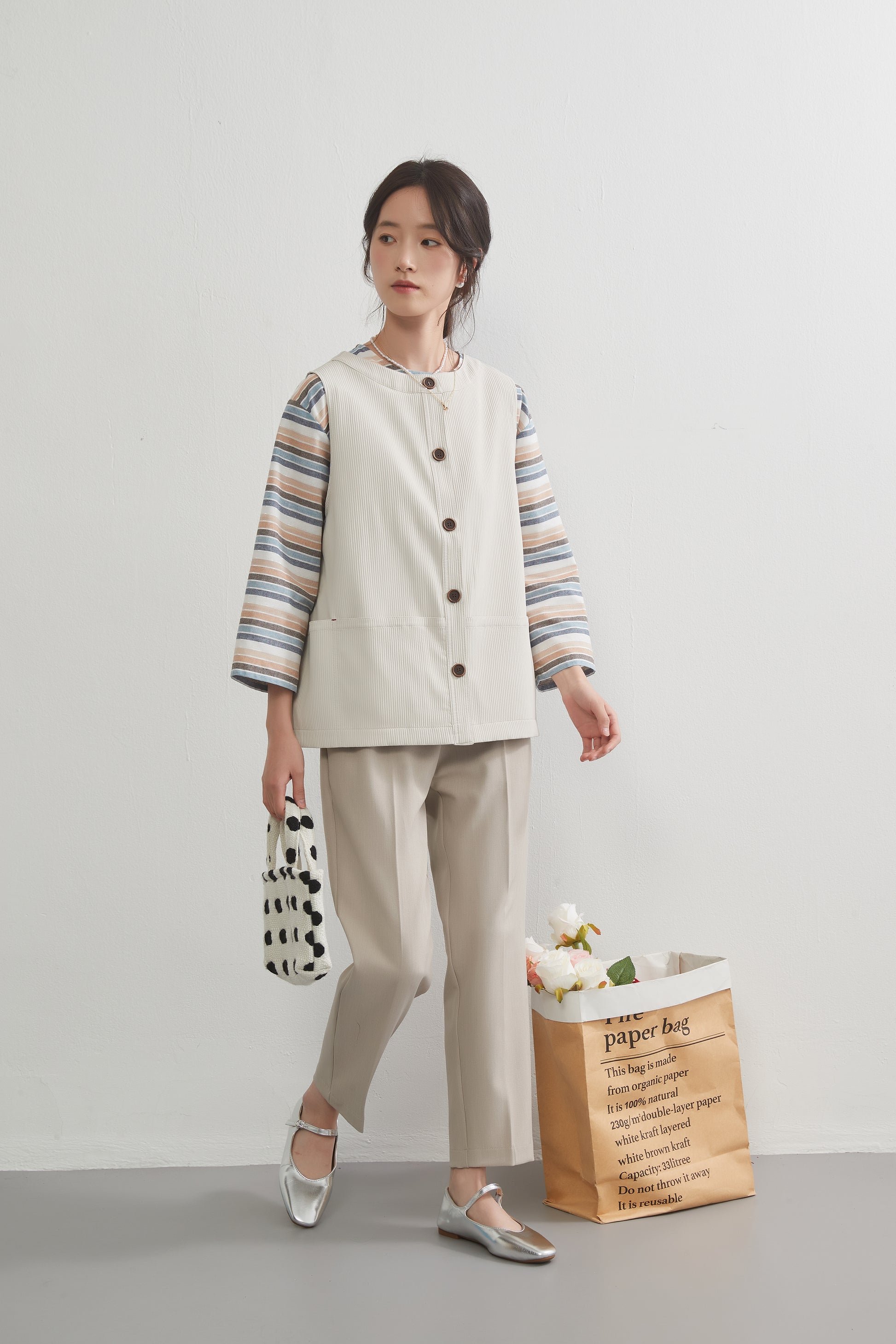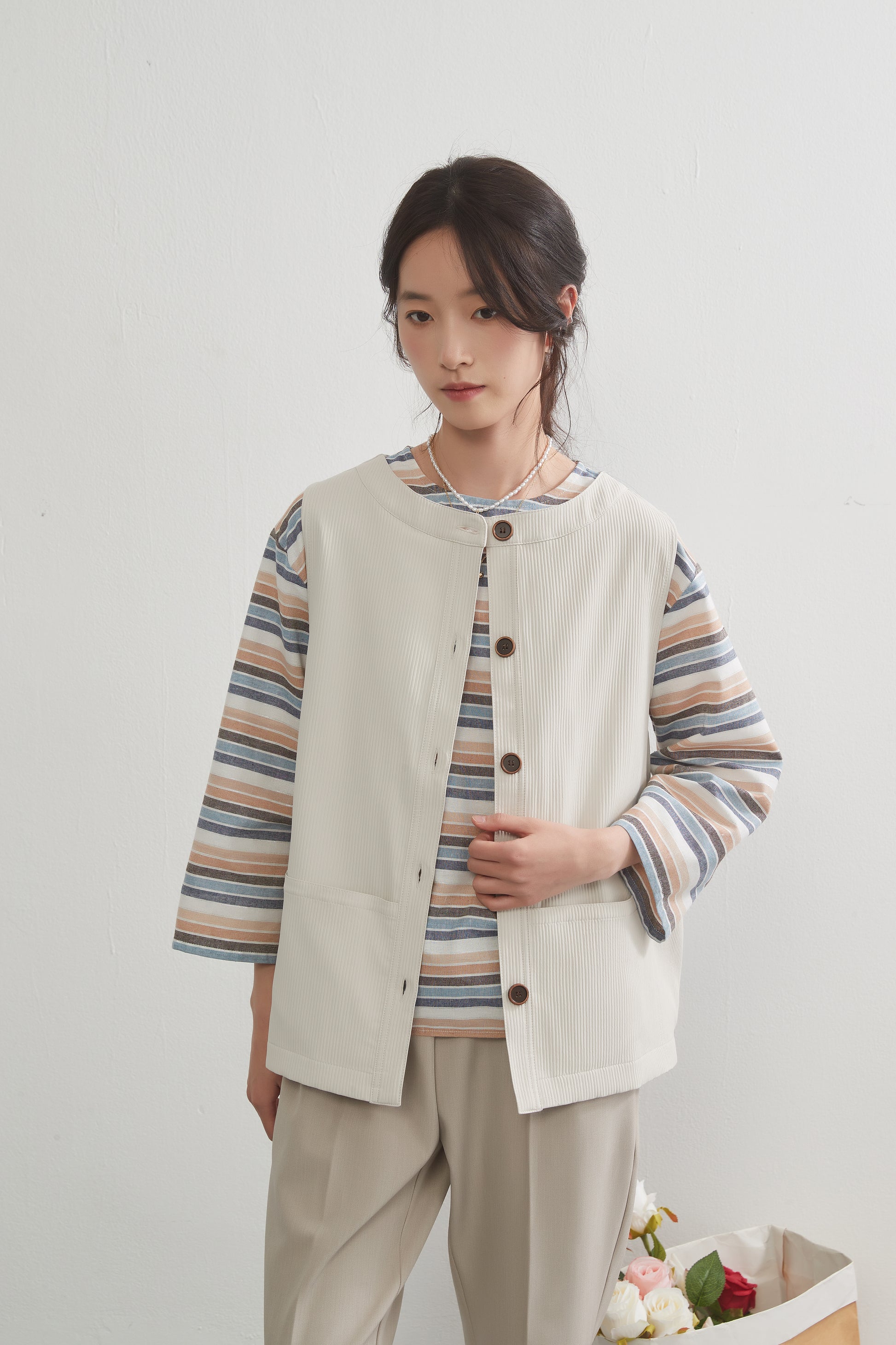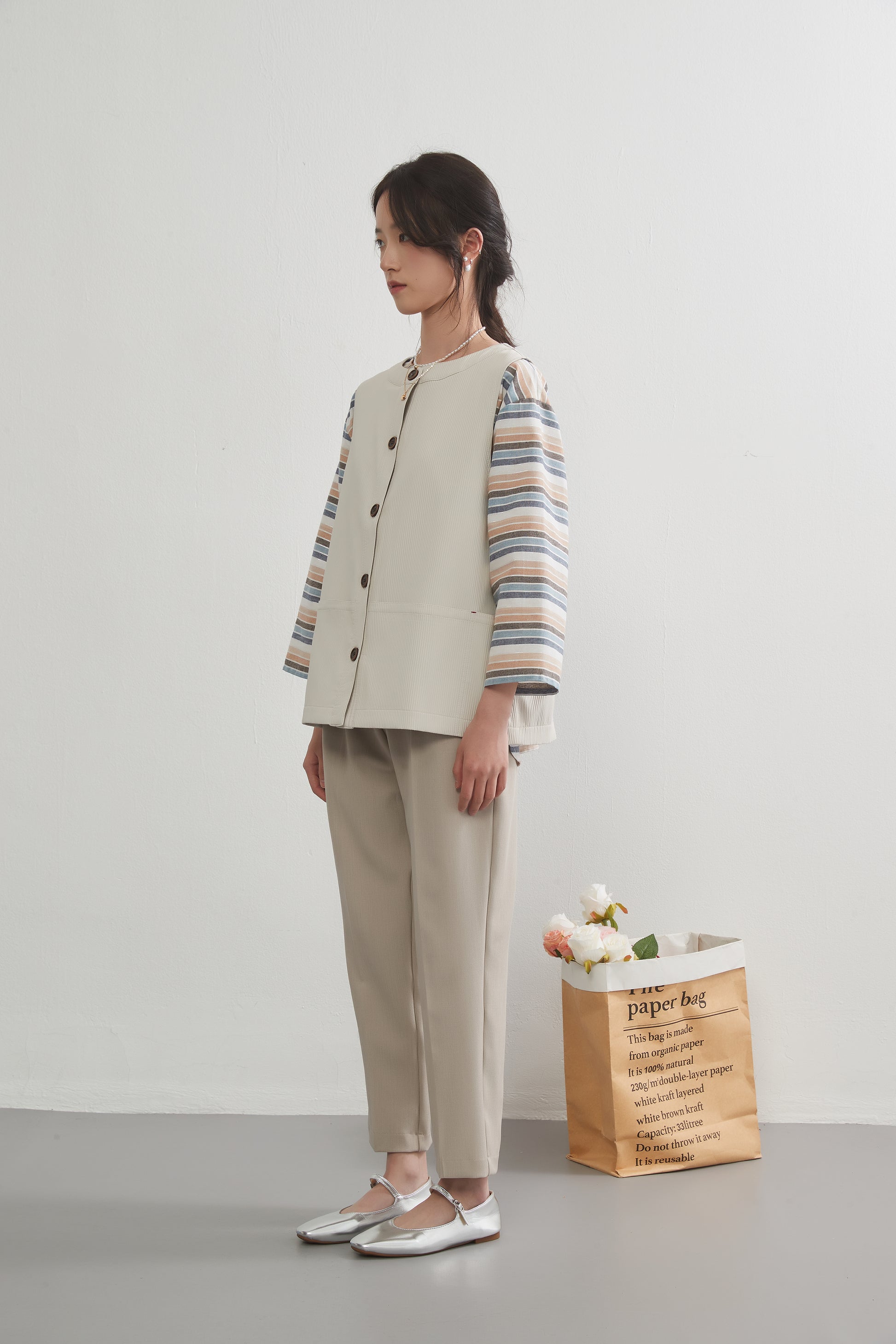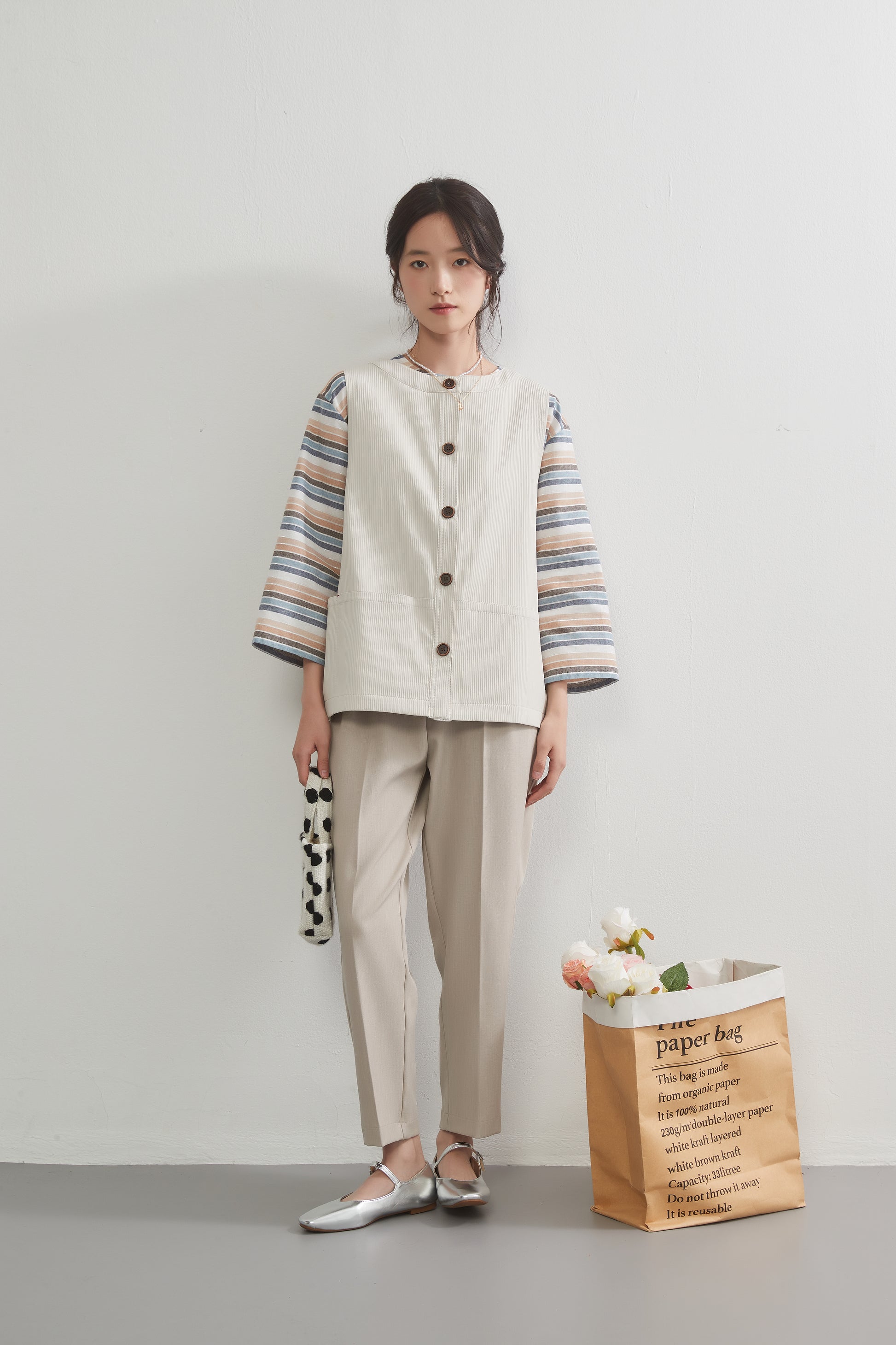 KNXV533-ピンタック織りゆったりベスト・便利ポケットたくさん配色ボタンベスト