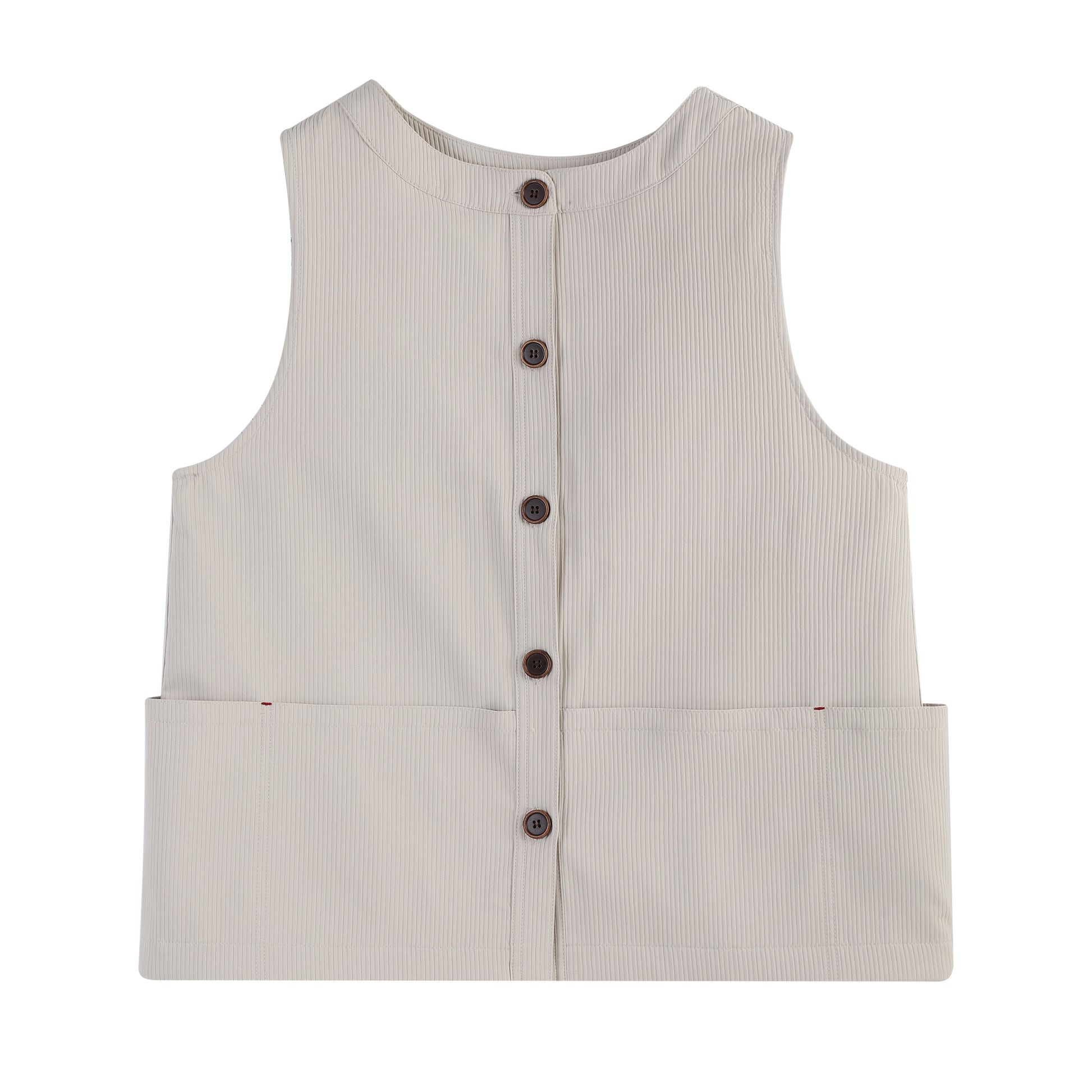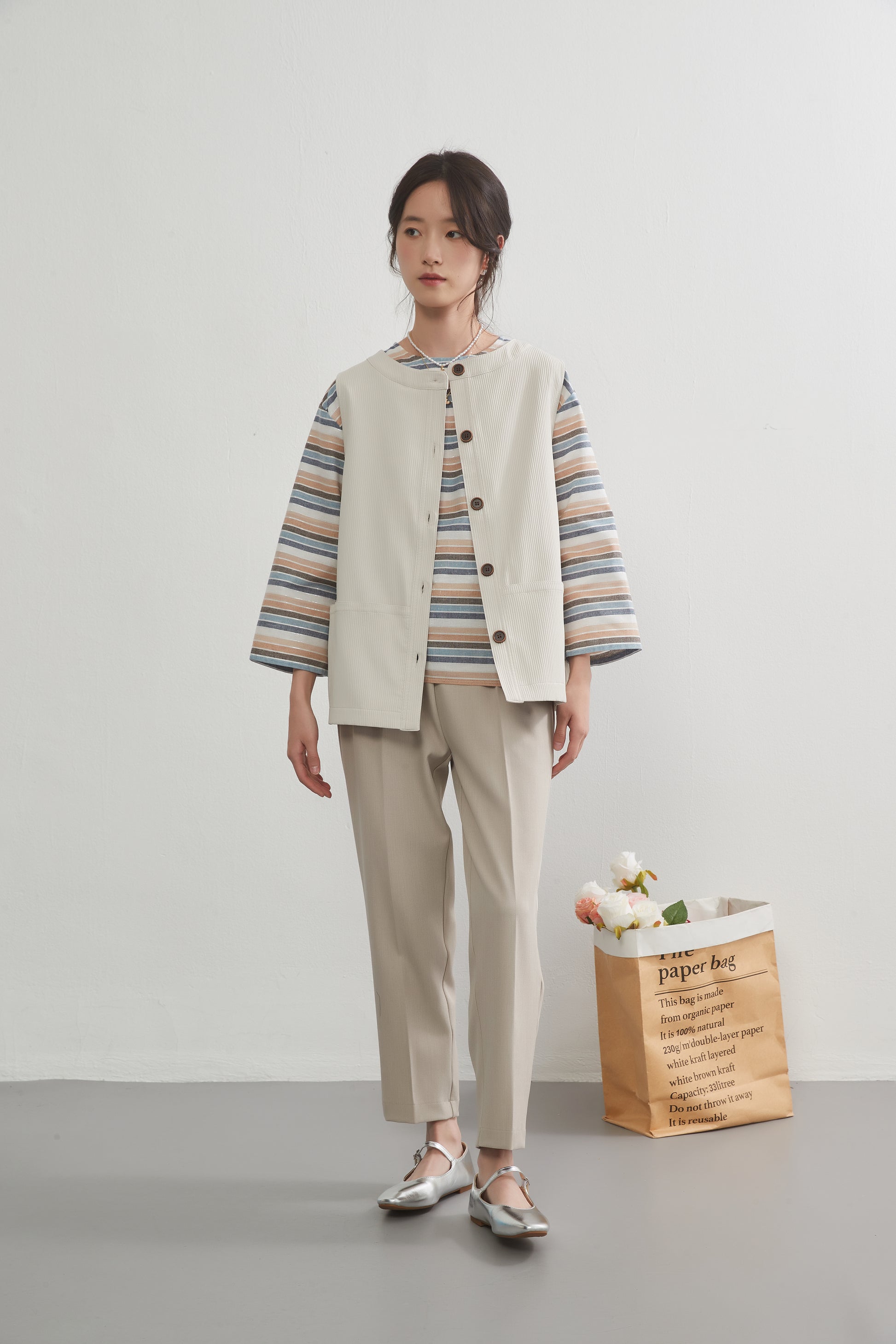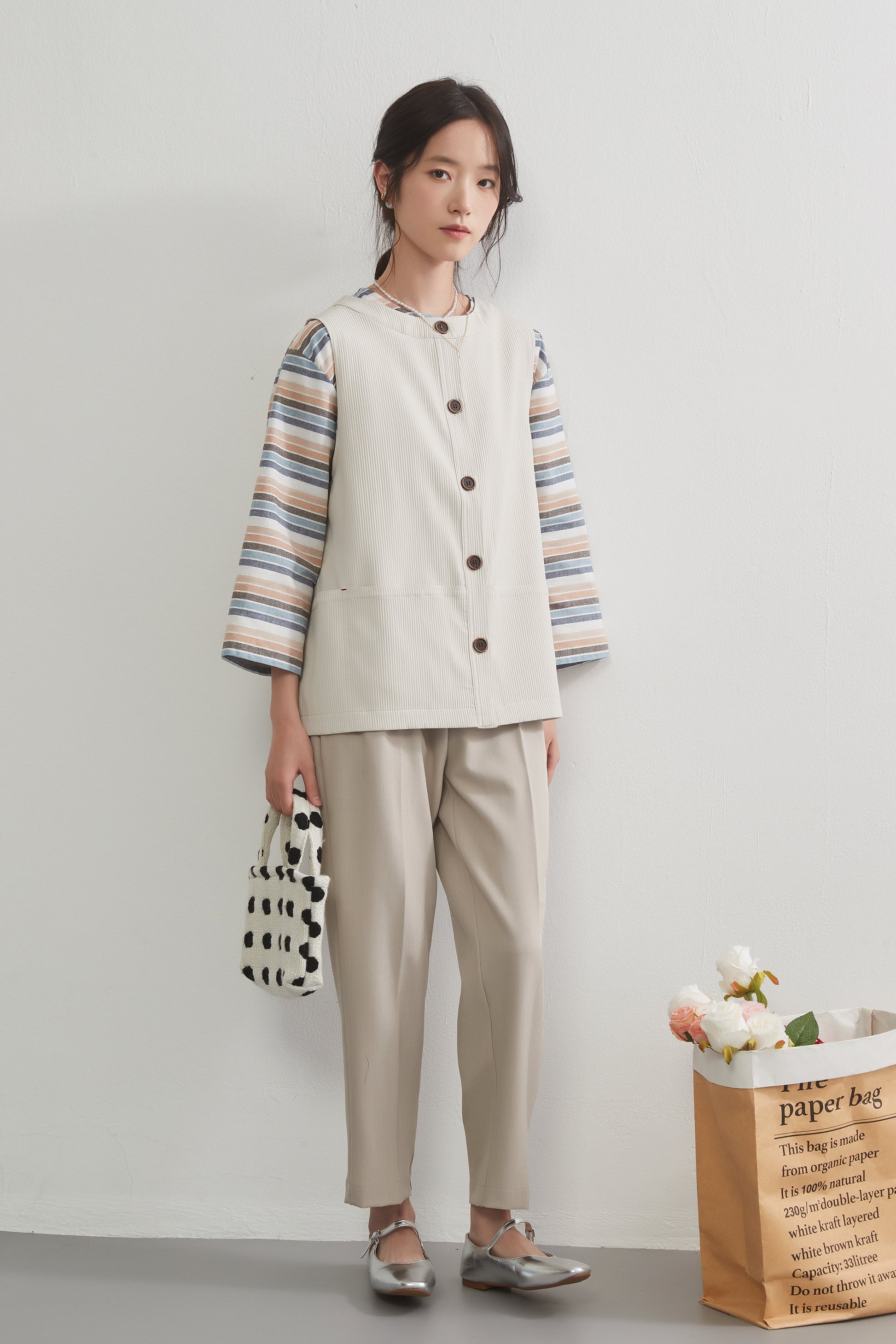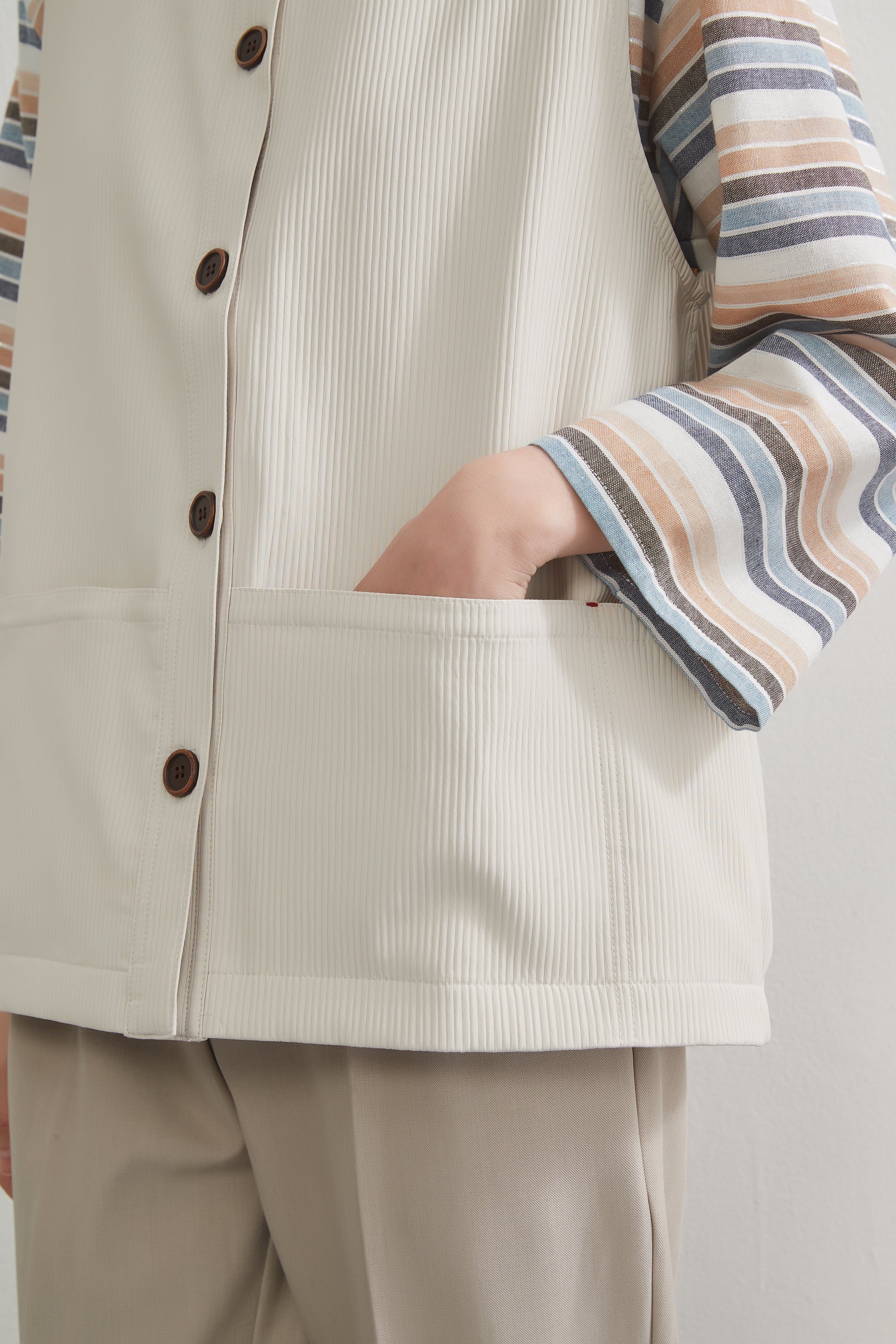 KNXV533-ピンタック織りゆったりベスト・便利ポケットたくさん配色ボタンベスト