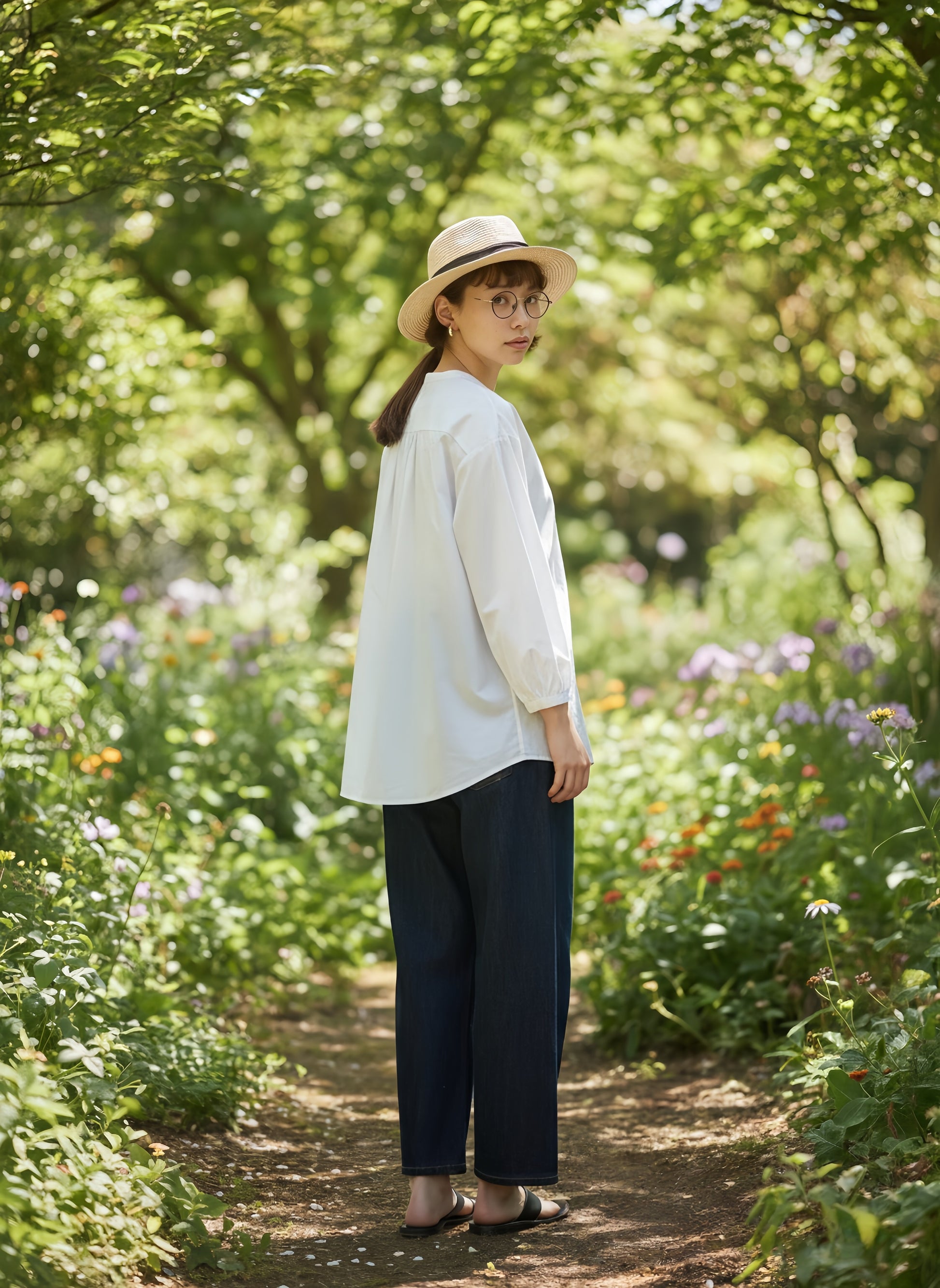 リラックスカジュアルスタイル: 裾をアウトにしてゆったりと。パンツやスカートと合わせたカジュアルなリラックススタイルに。背中のギャザーが後ろ姿に立体感を出します。