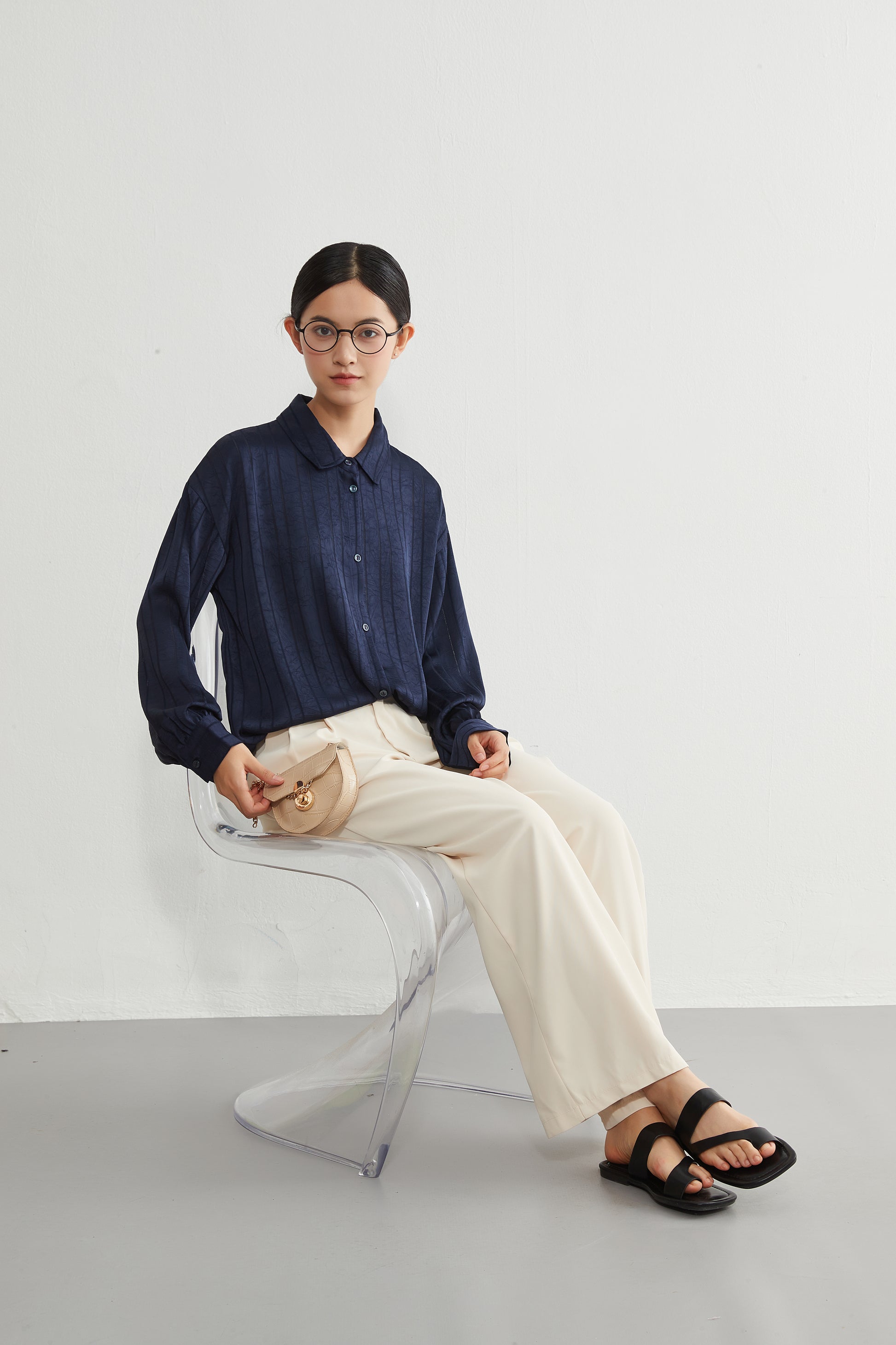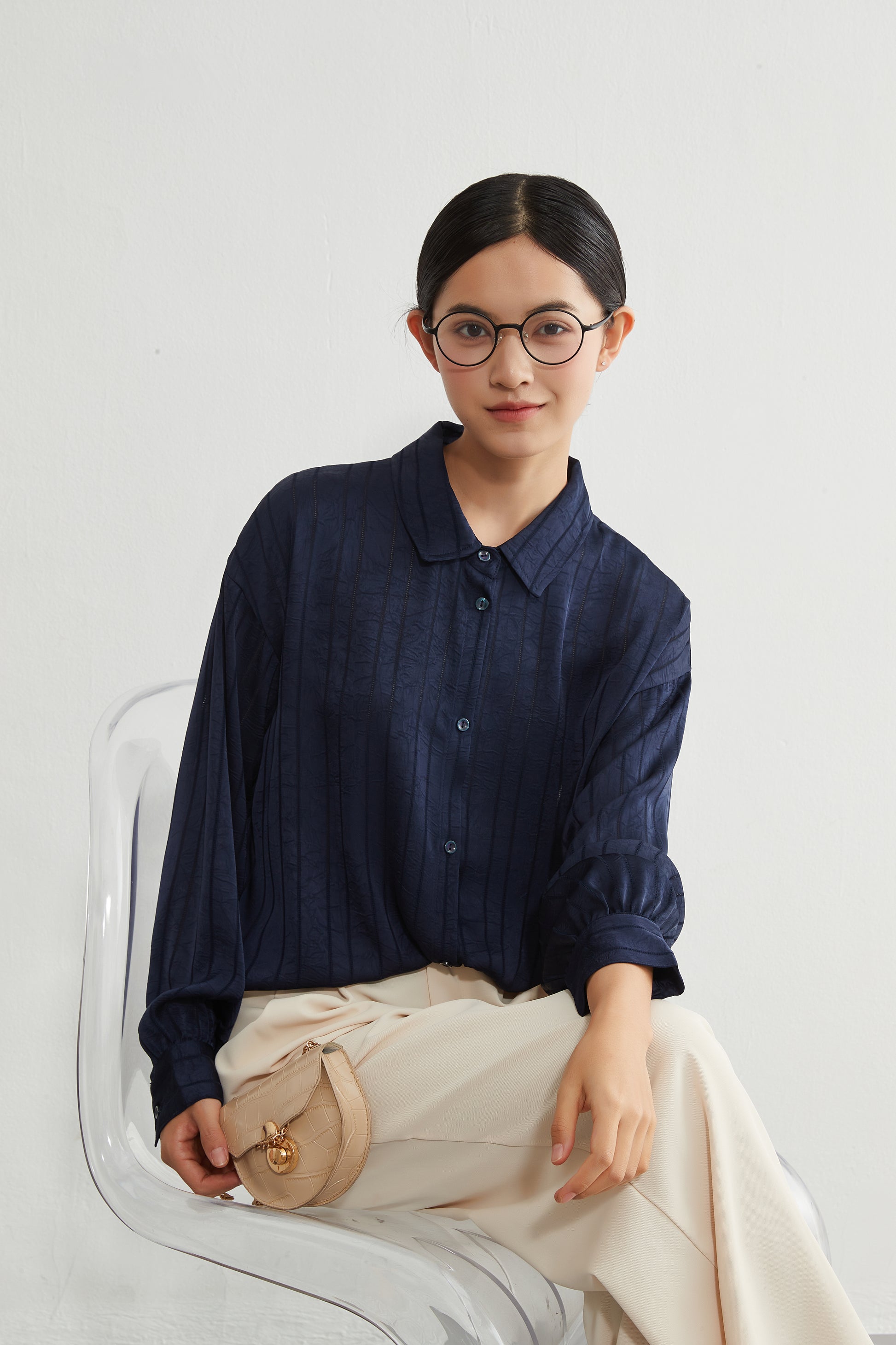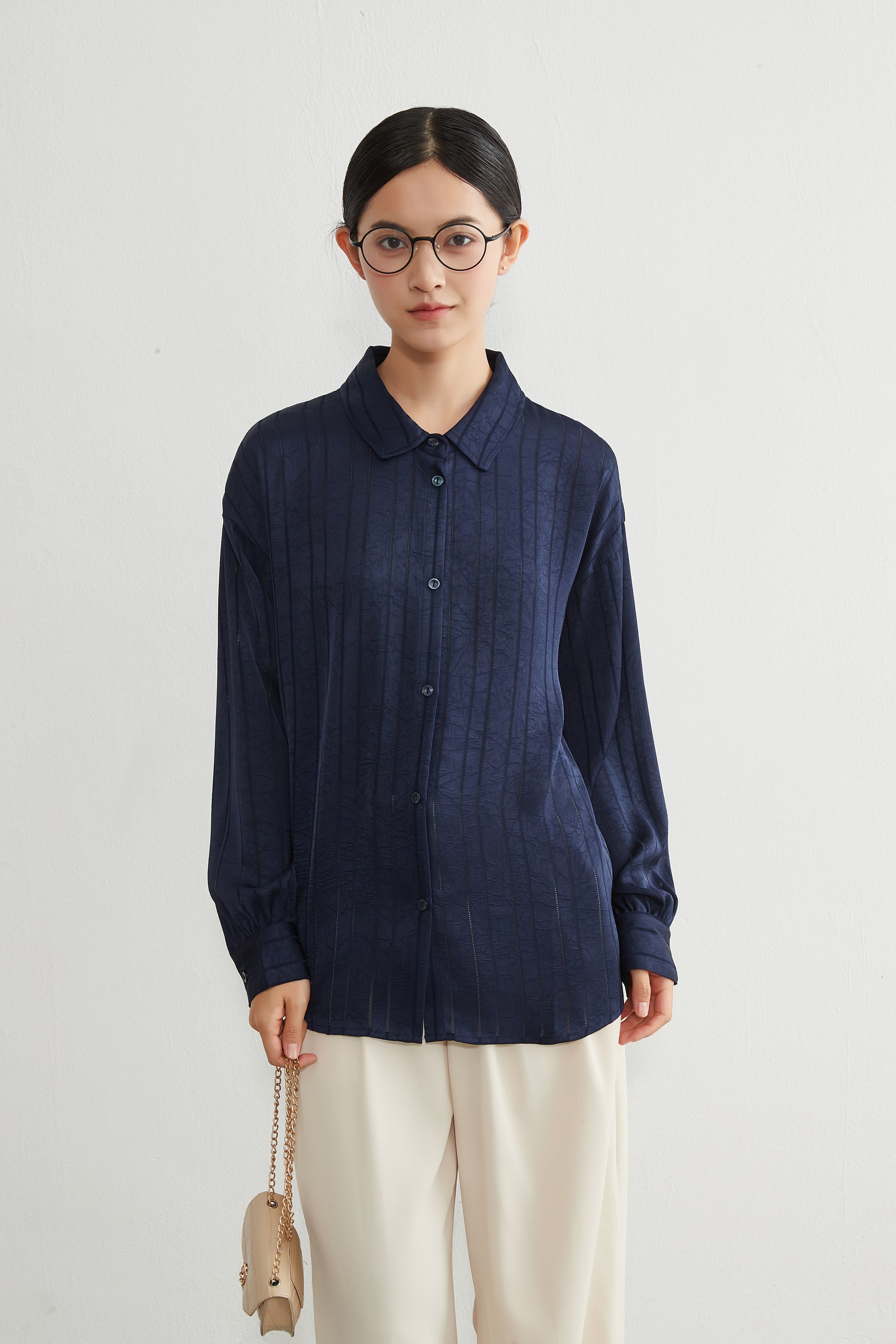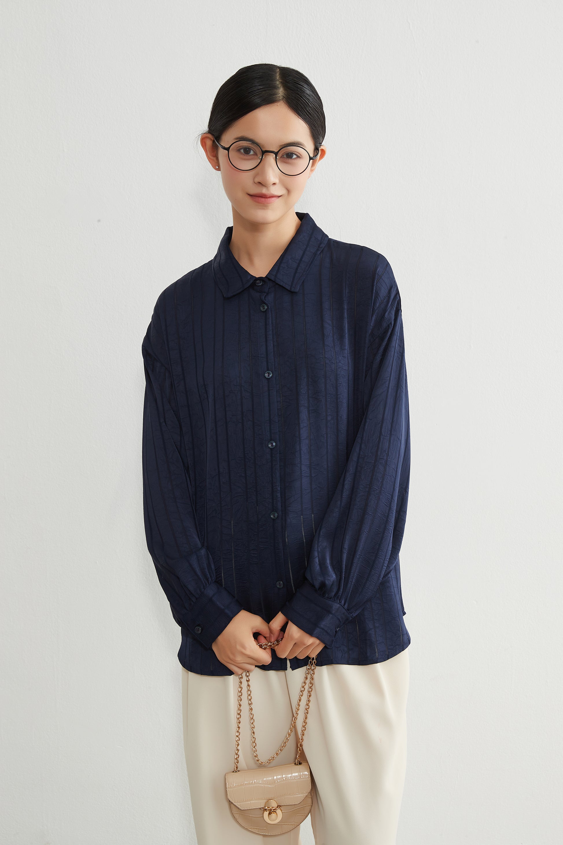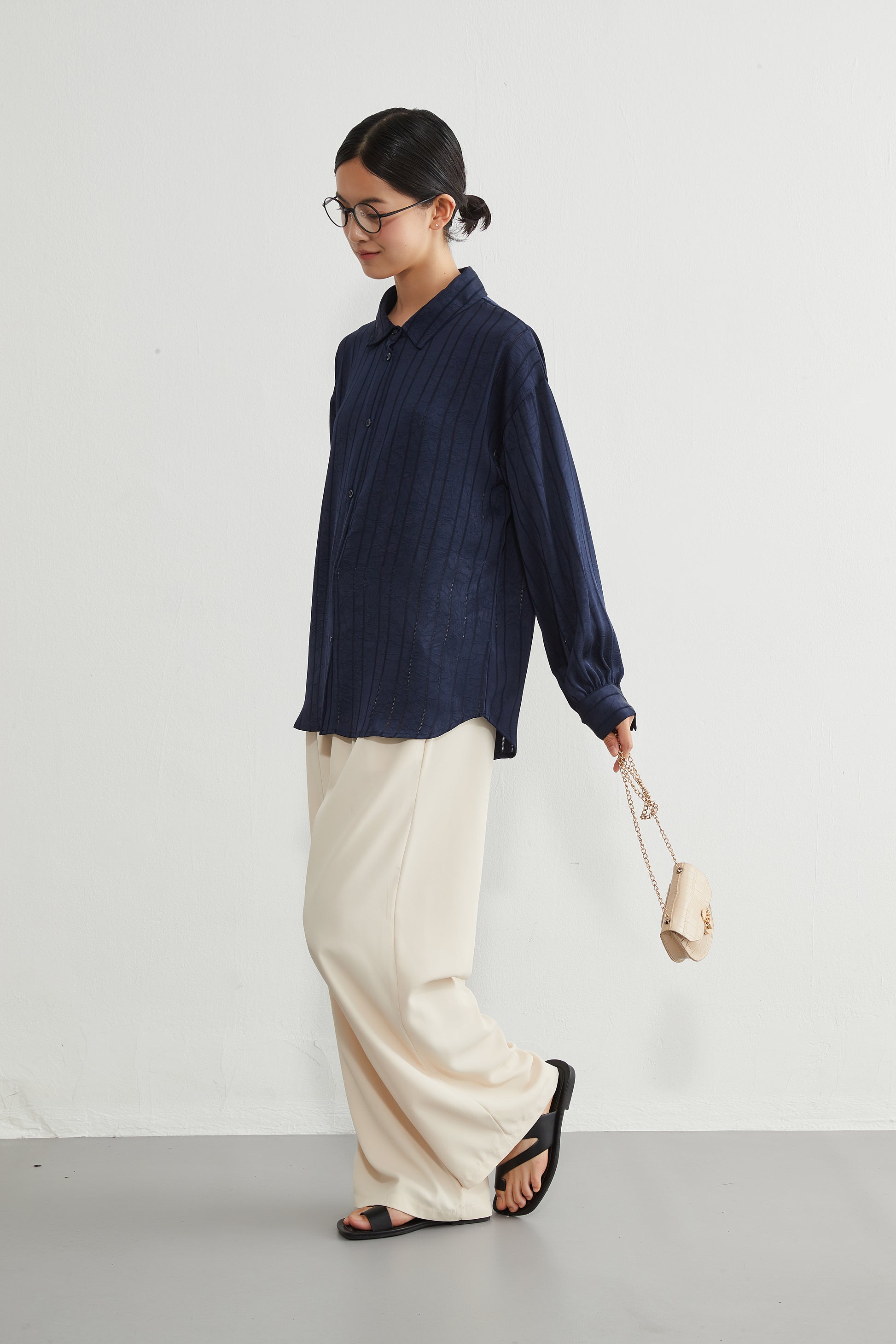 ハンサムなシルエットと長袖デザインで、大人の女性らしい凛とした印象を与えるシャツブラウス。フロントには繊細なアイレット風ジャカード織りが施され、シンプルながらも上品で華やかな表情に。程よい艶感が光を受けて大人きれいめスタイルを引き立て、オンオフ問わず幅広いシーンで活躍します。