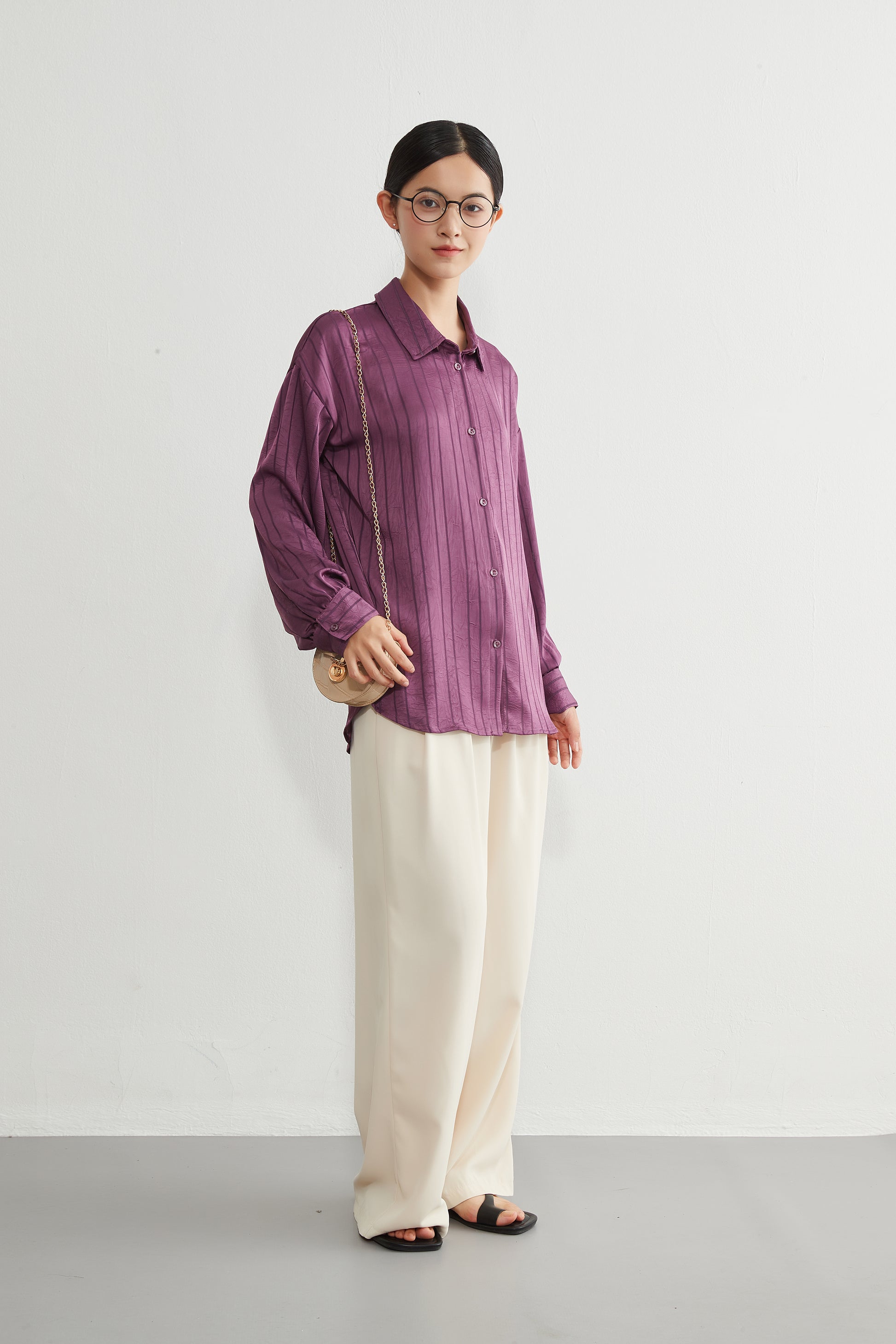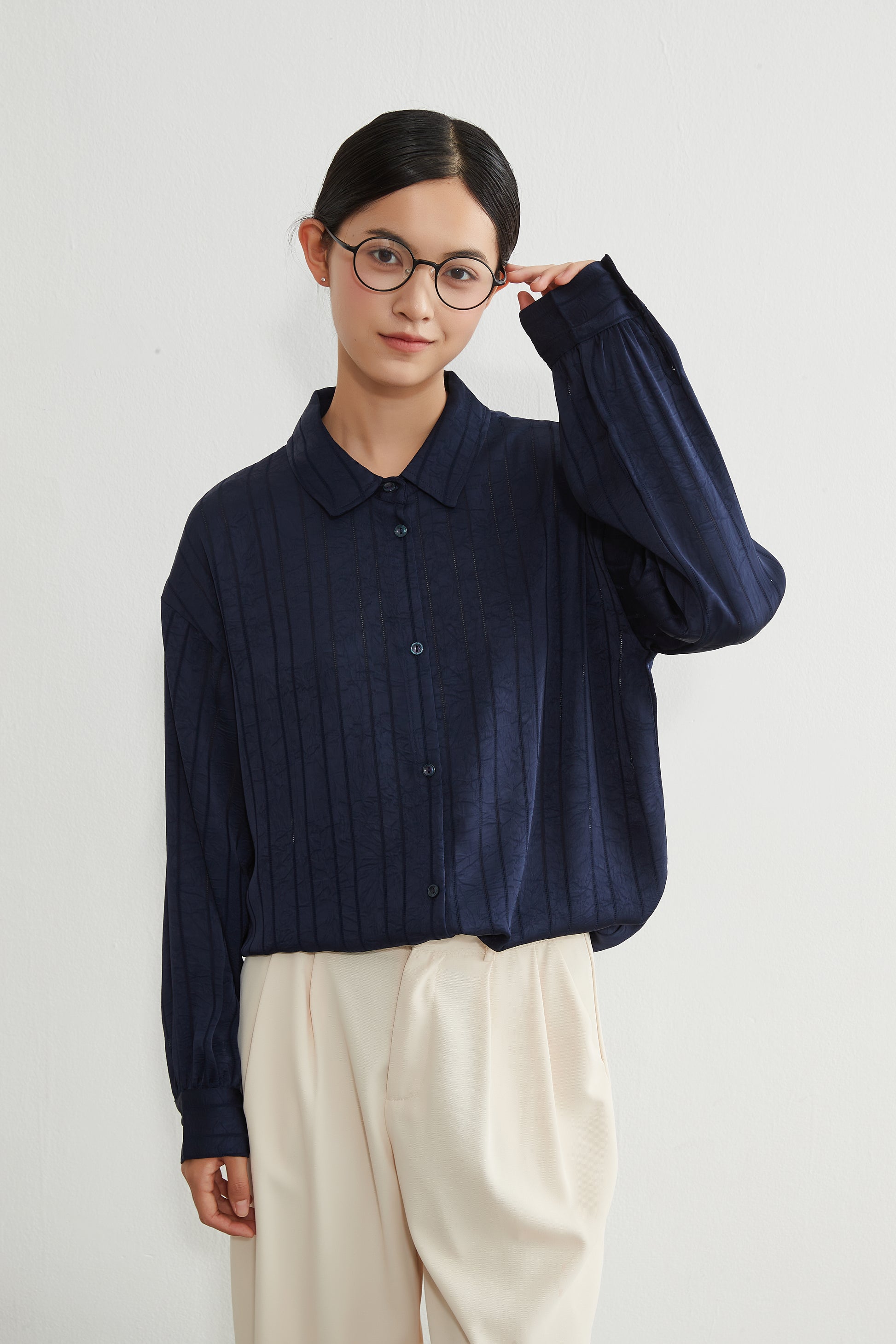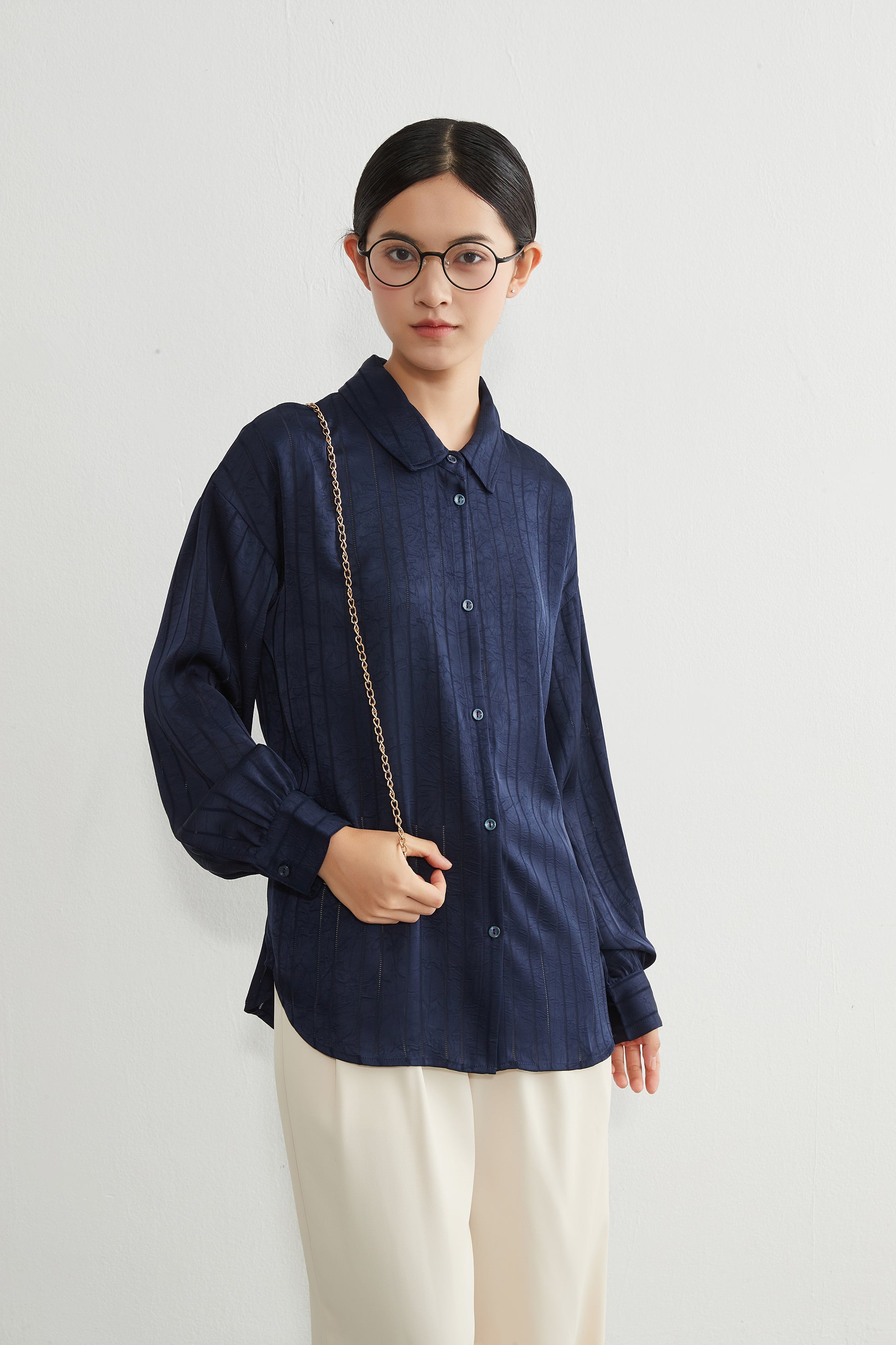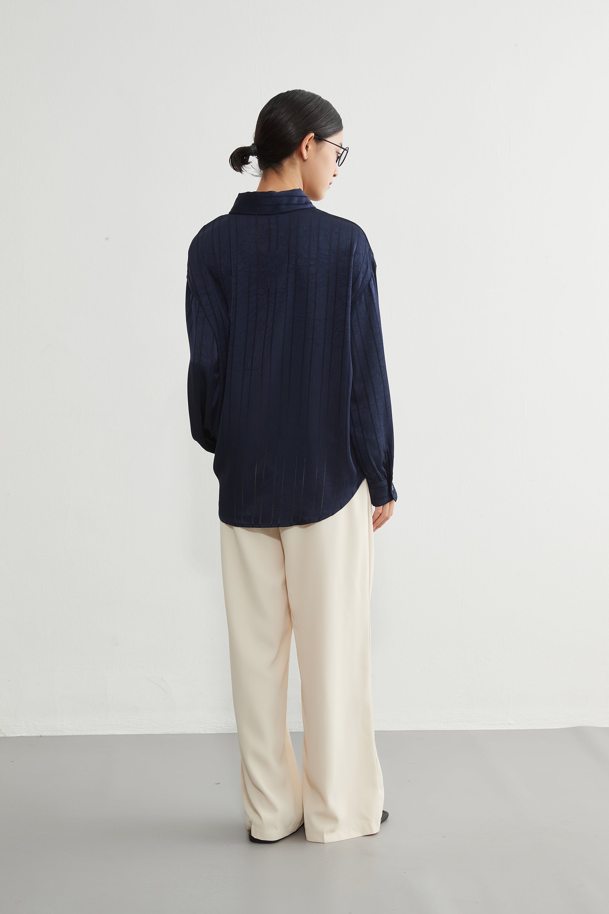 ハンサムなシルエットと長袖デザインで、大人の女性らしい凛とした印象を与えるシャツブラウス。フロントには繊細なアイレット風ジャカード織りが施され、シンプルながらも上品で華やかな表情に。程よい艶感が光を受けて大人きれいめスタイルを引き立て、オンオフ問わず幅広いシーンで活躍します。