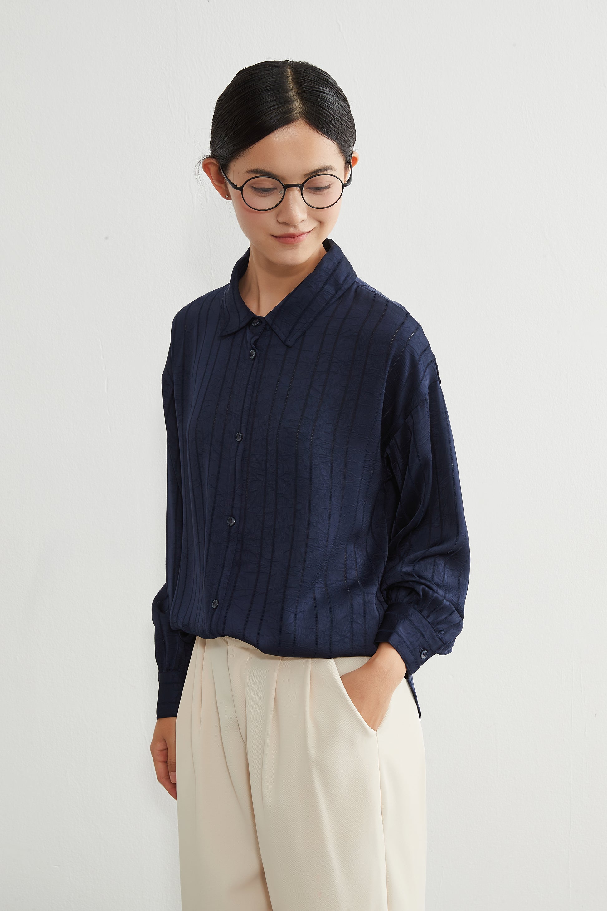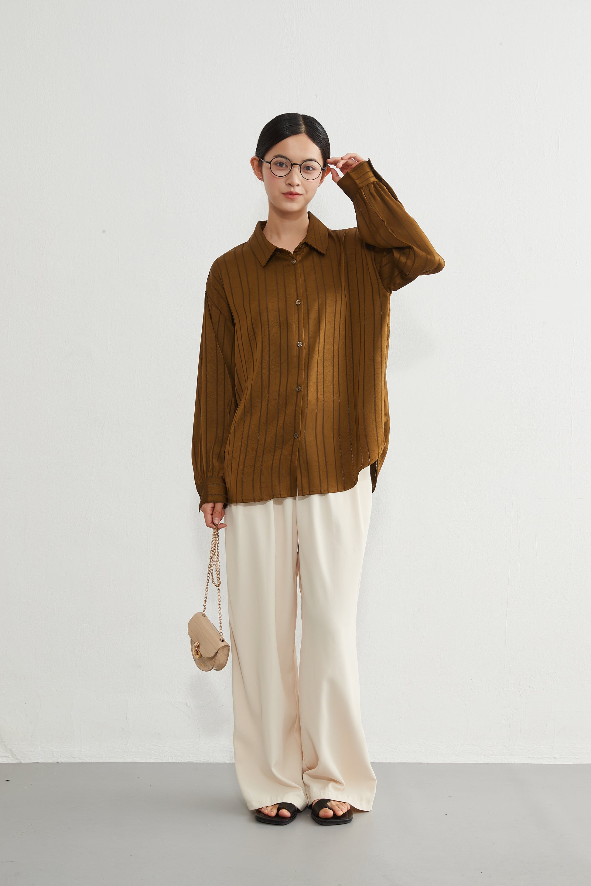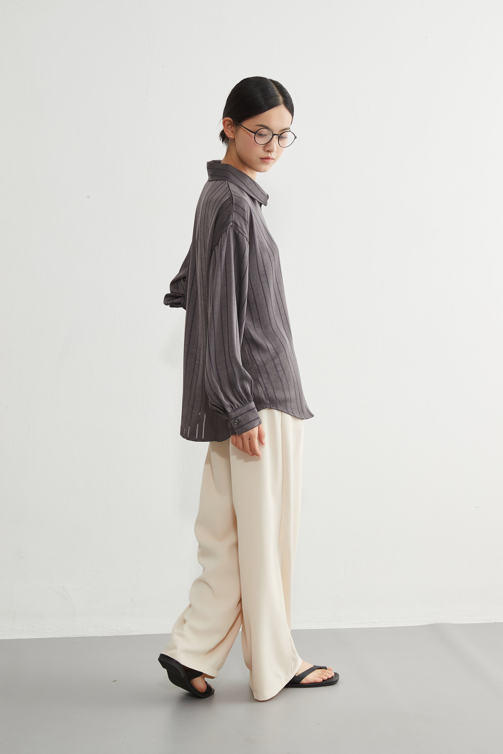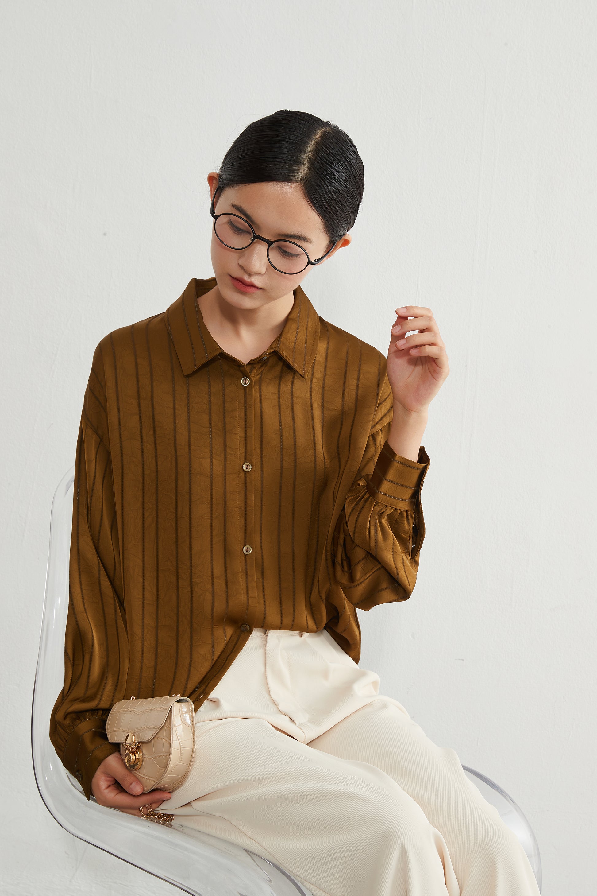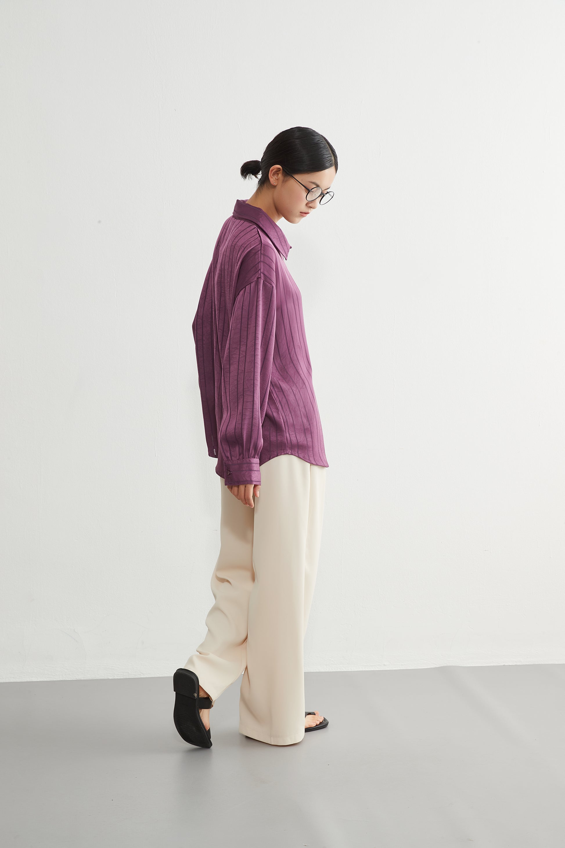 ハンサムなシルエットと長袖デザインで、大人の女性らしい凛とした印象を与えるシャツブラウス。フロントには繊細なアイレット風ジャカード織りが施され、シンプルながらも上品で華やかな表情に。程よい艶感が光を受けて大人きれいめスタイルを引き立て、オンオフ問わず幅広いシーンで活躍します。