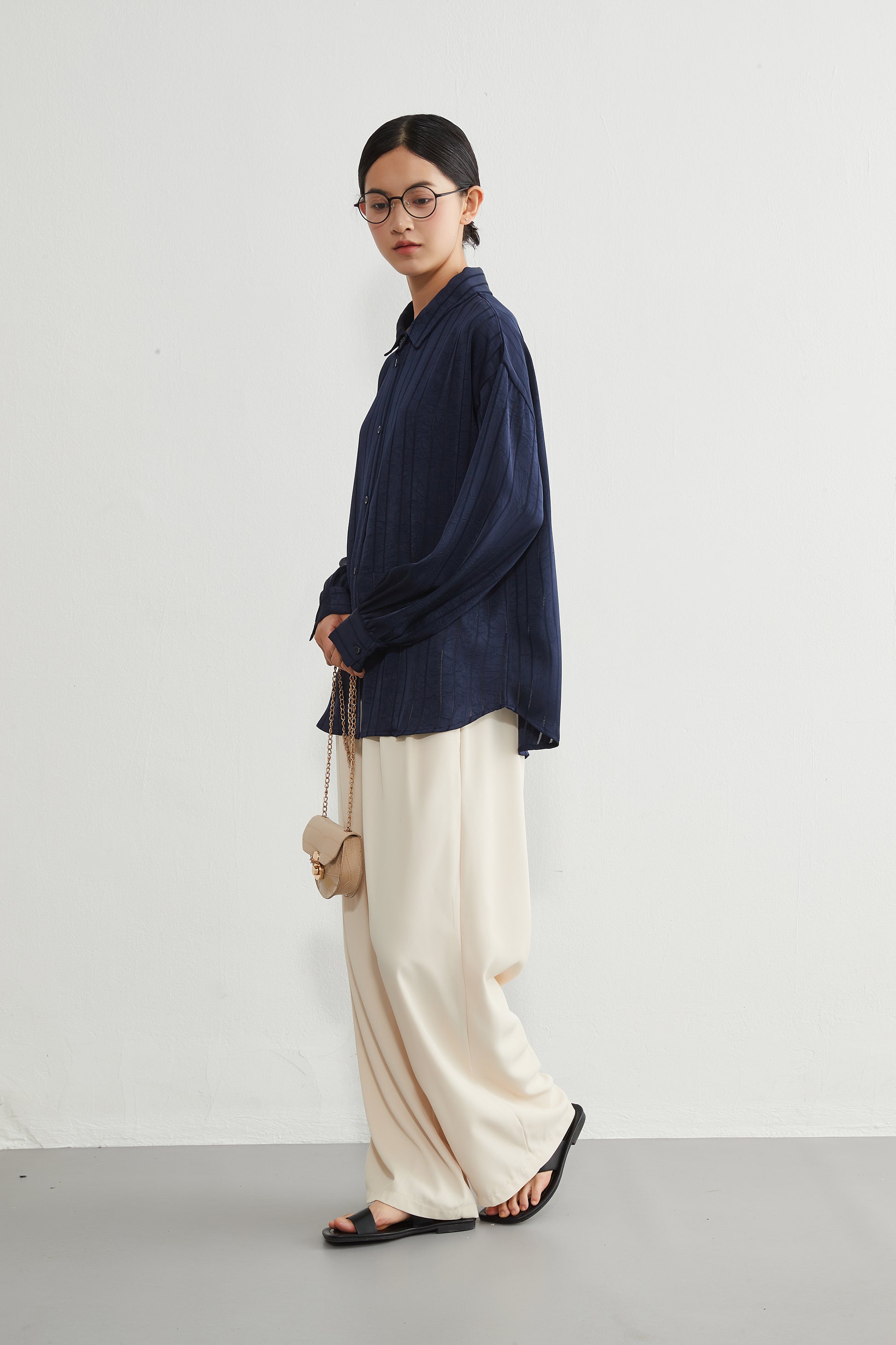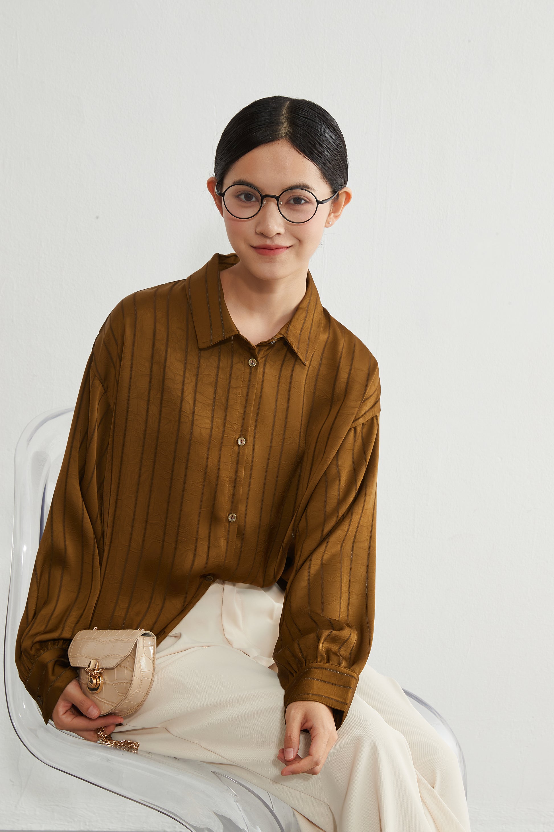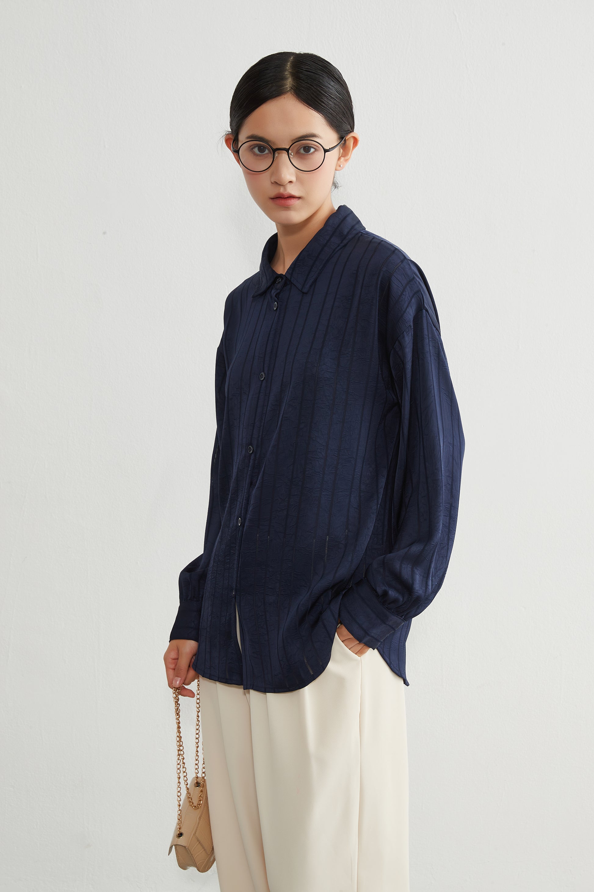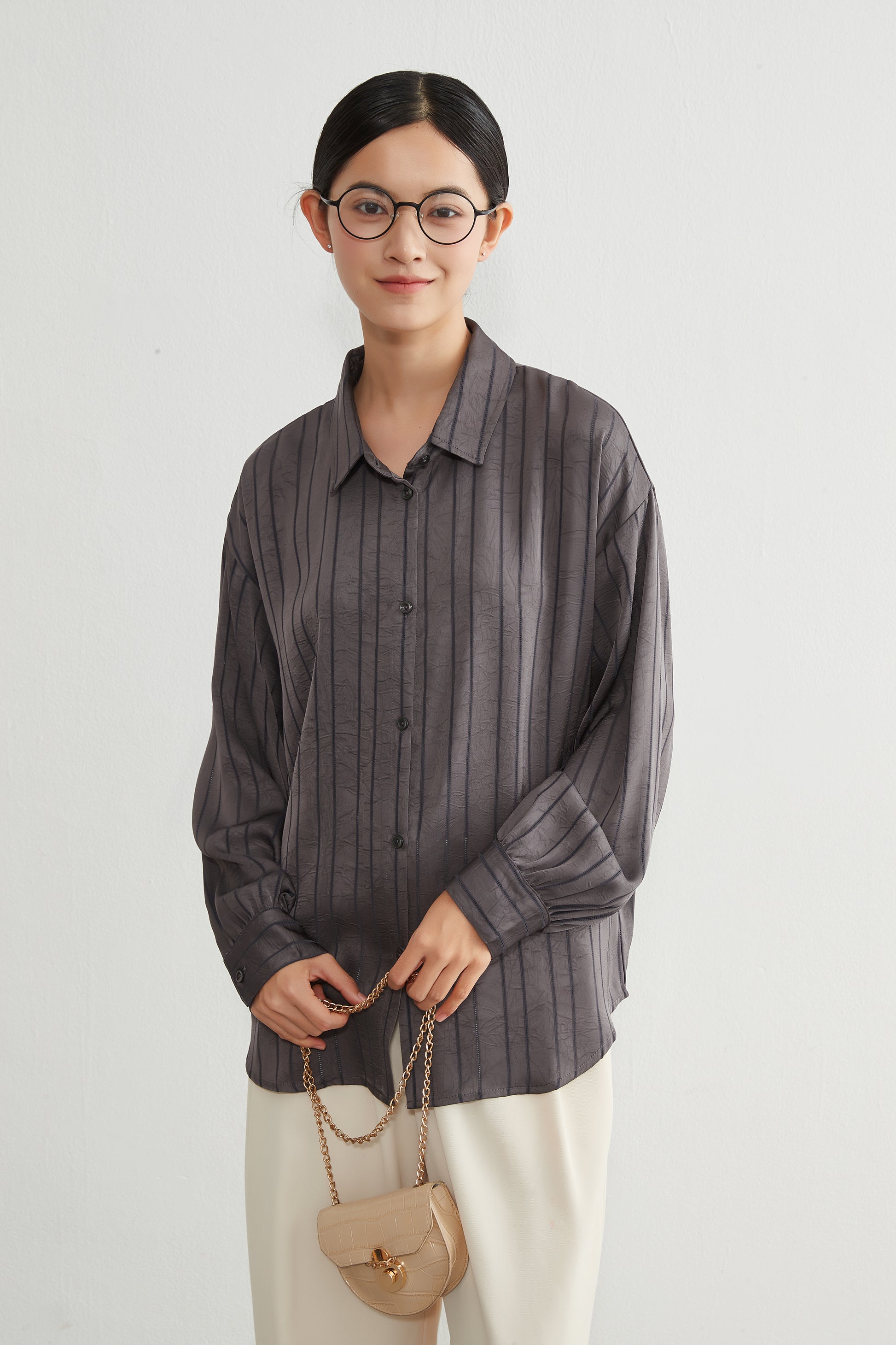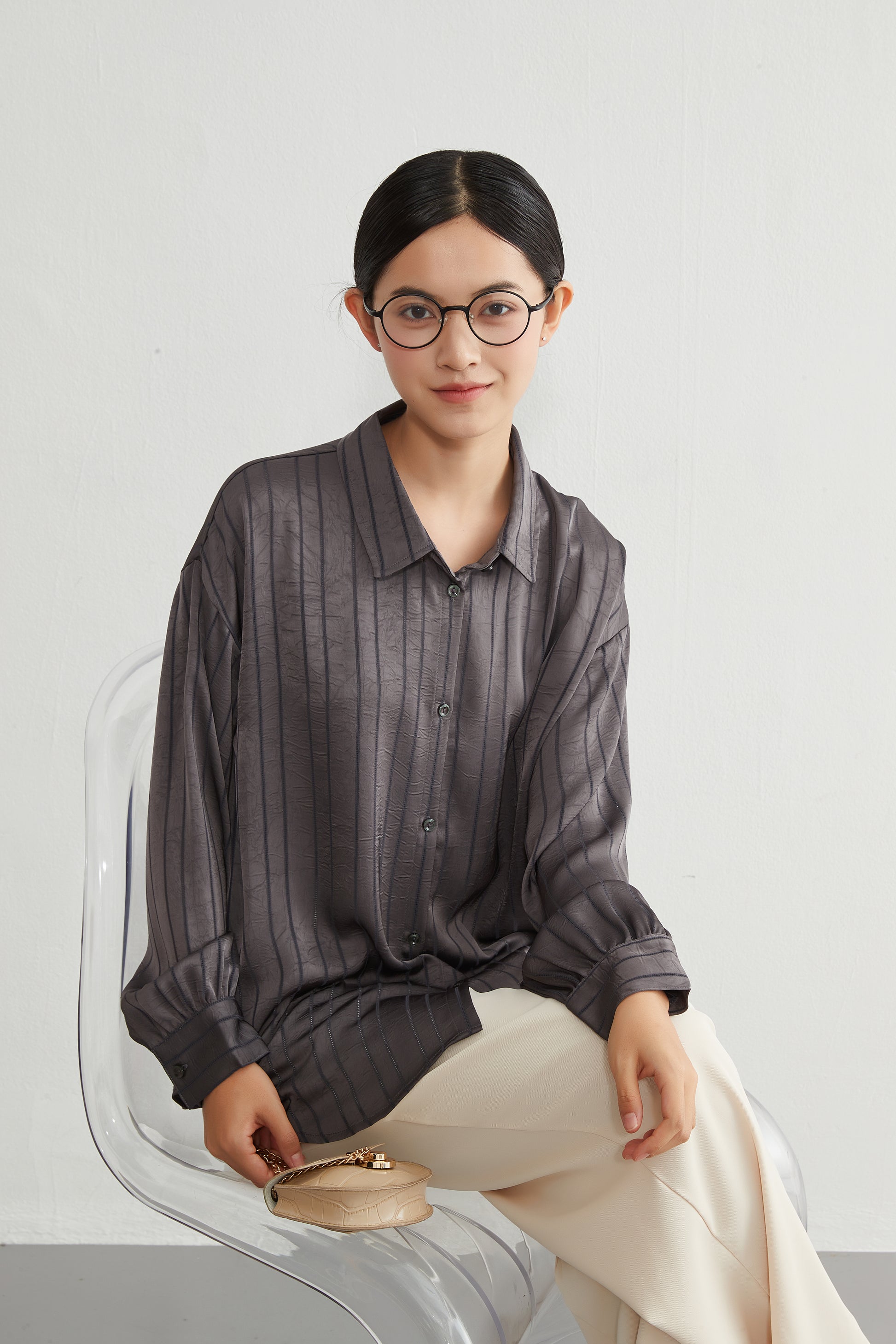 ハンサムなシルエットと長袖デザインで、大人の女性らしい凛とした印象を与えるシャツブラウス。フロントには繊細なアイレット風ジャカード織りが施され、シンプルながらも上品で華やかな表情に。程よい艶感が光を受けて大人きれいめスタイルを引き立て、オンオフ問わず幅広いシーンで活躍します。