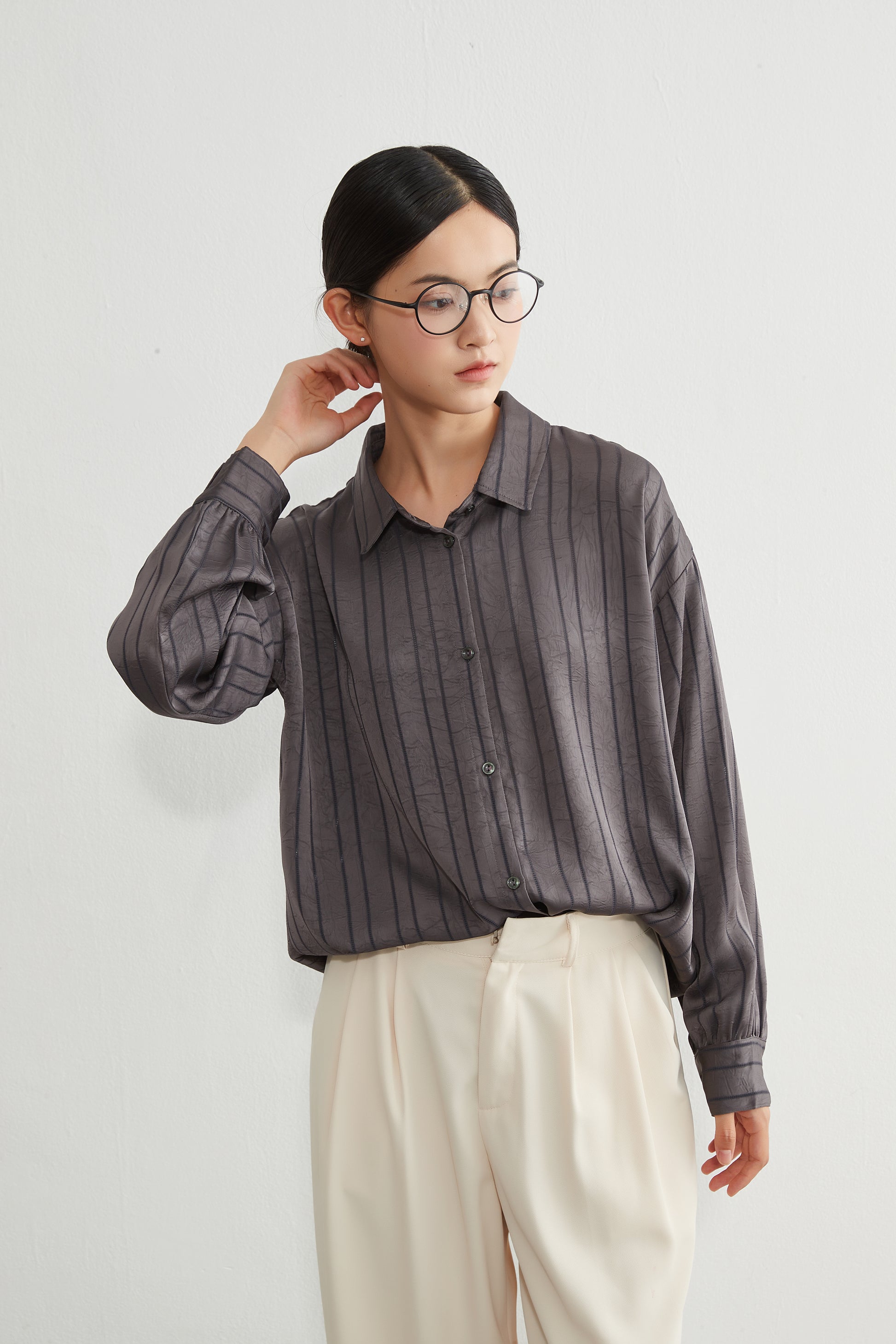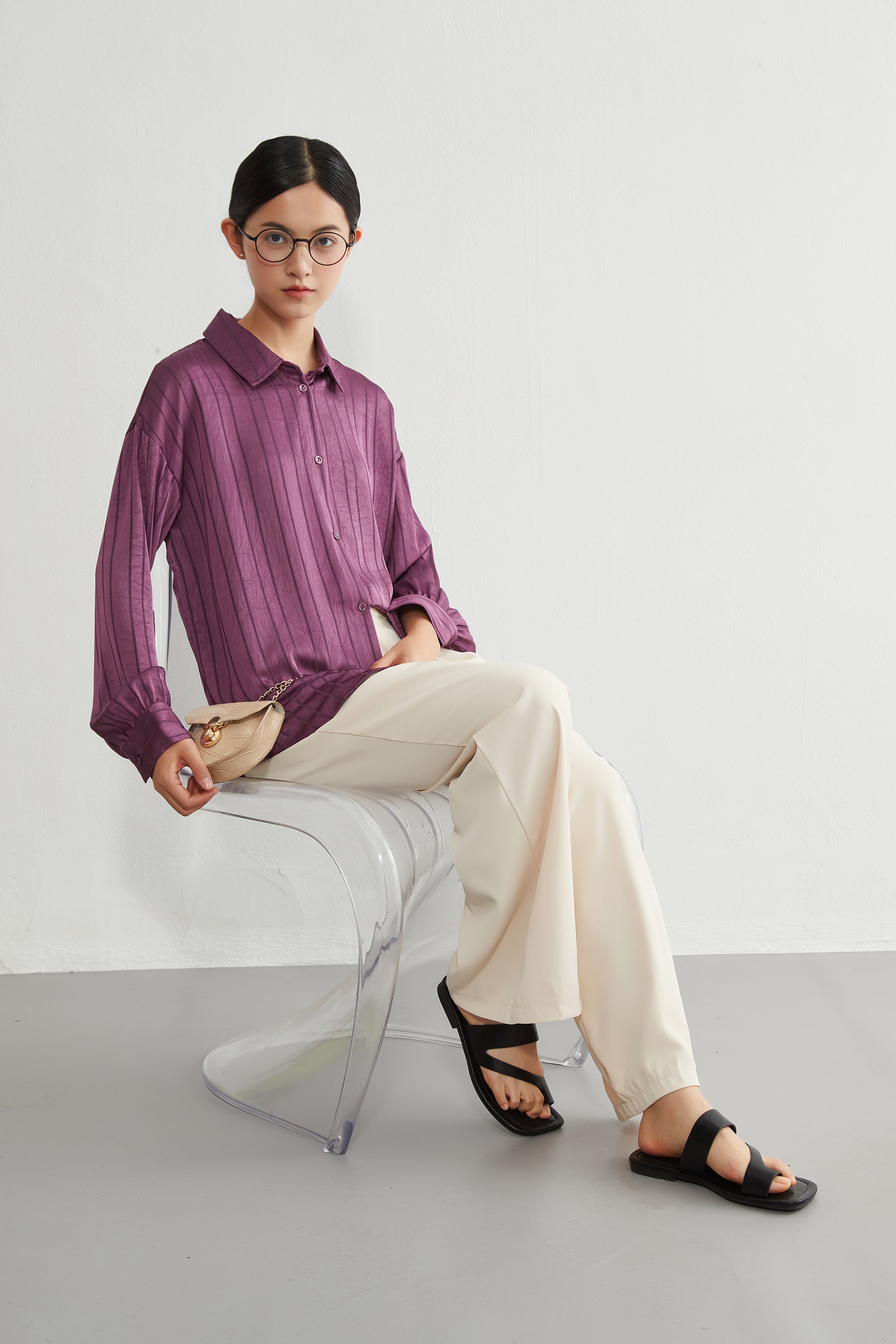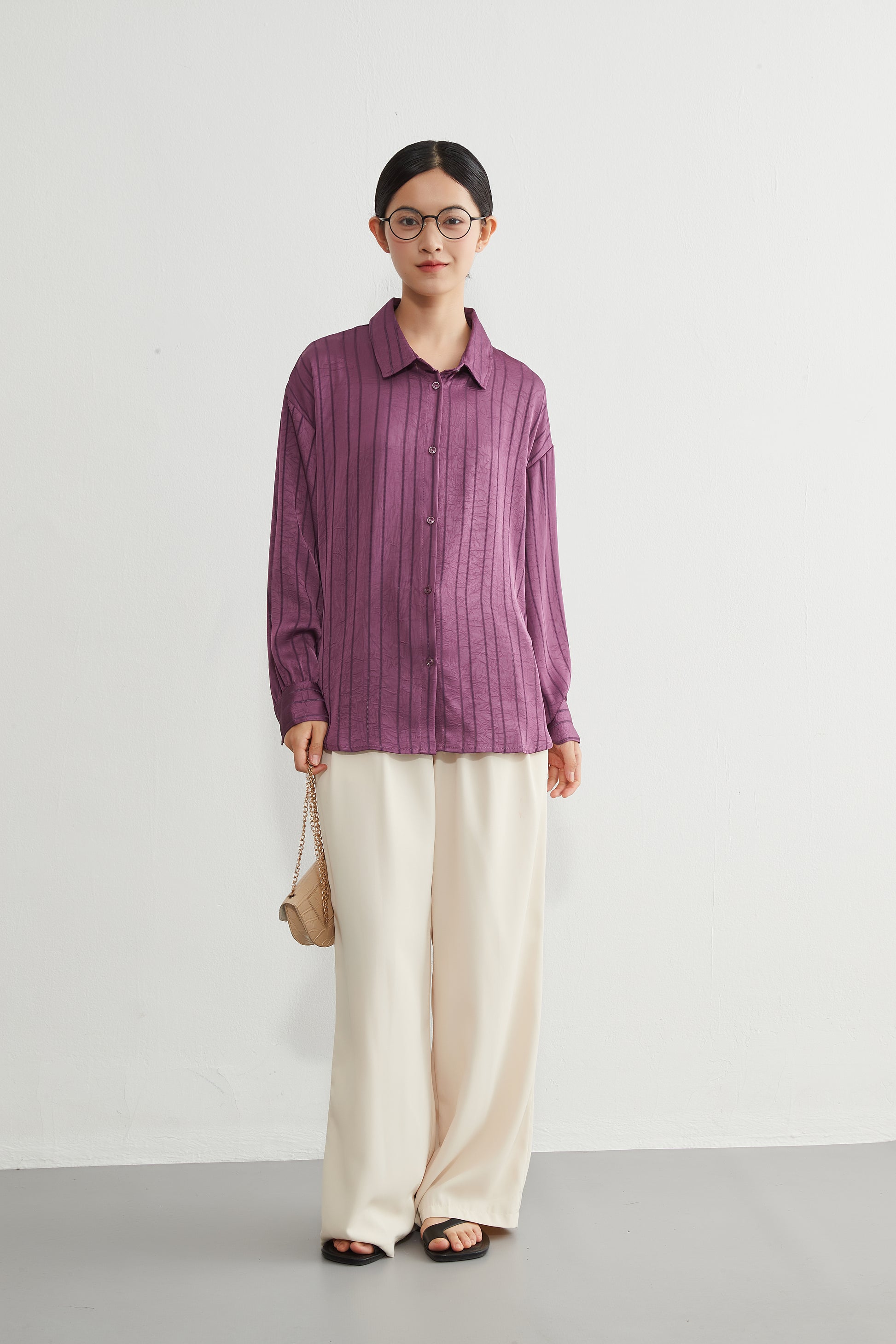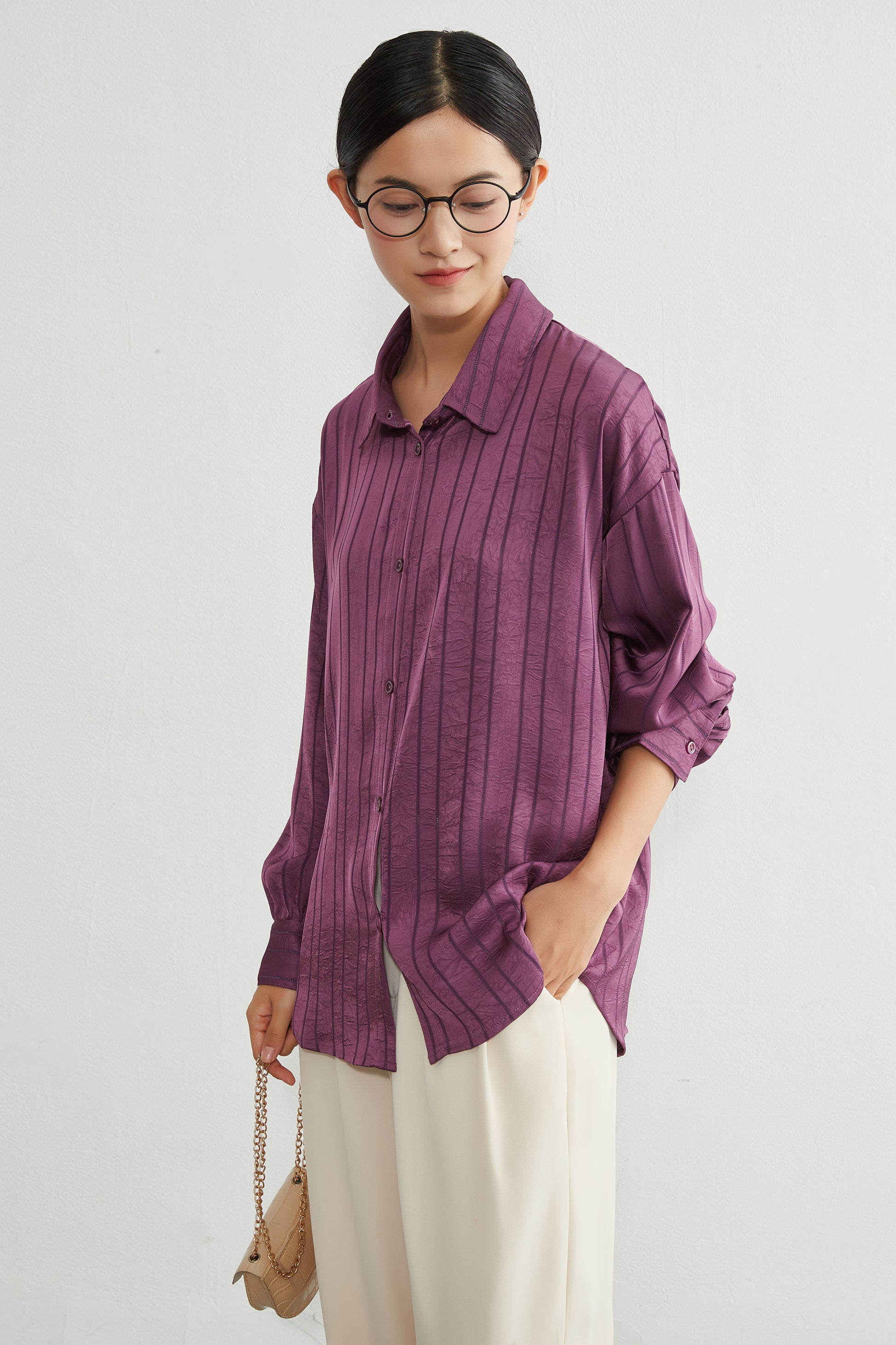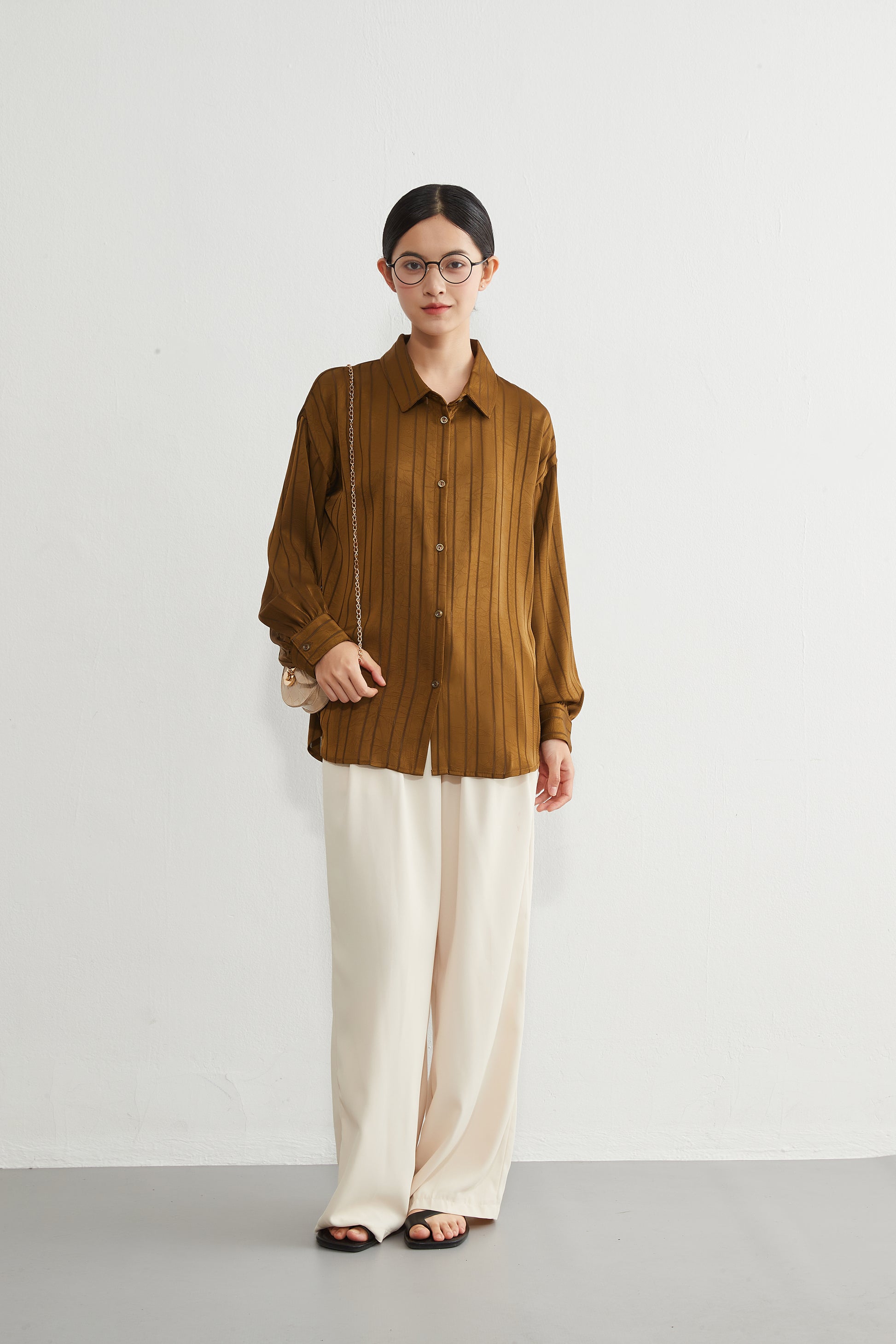 ハンサムなシルエットと長袖デザインで、大人の女性らしい凛とした印象を与えるシャツブラウス。フロントには繊細なアイレット風ジャカード織りが施され、シンプルながらも上品で華やかな表情に。程よい艶感が光を受けて大人きれいめスタイルを引き立て、オンオフ問わず幅広いシーンで活躍します。