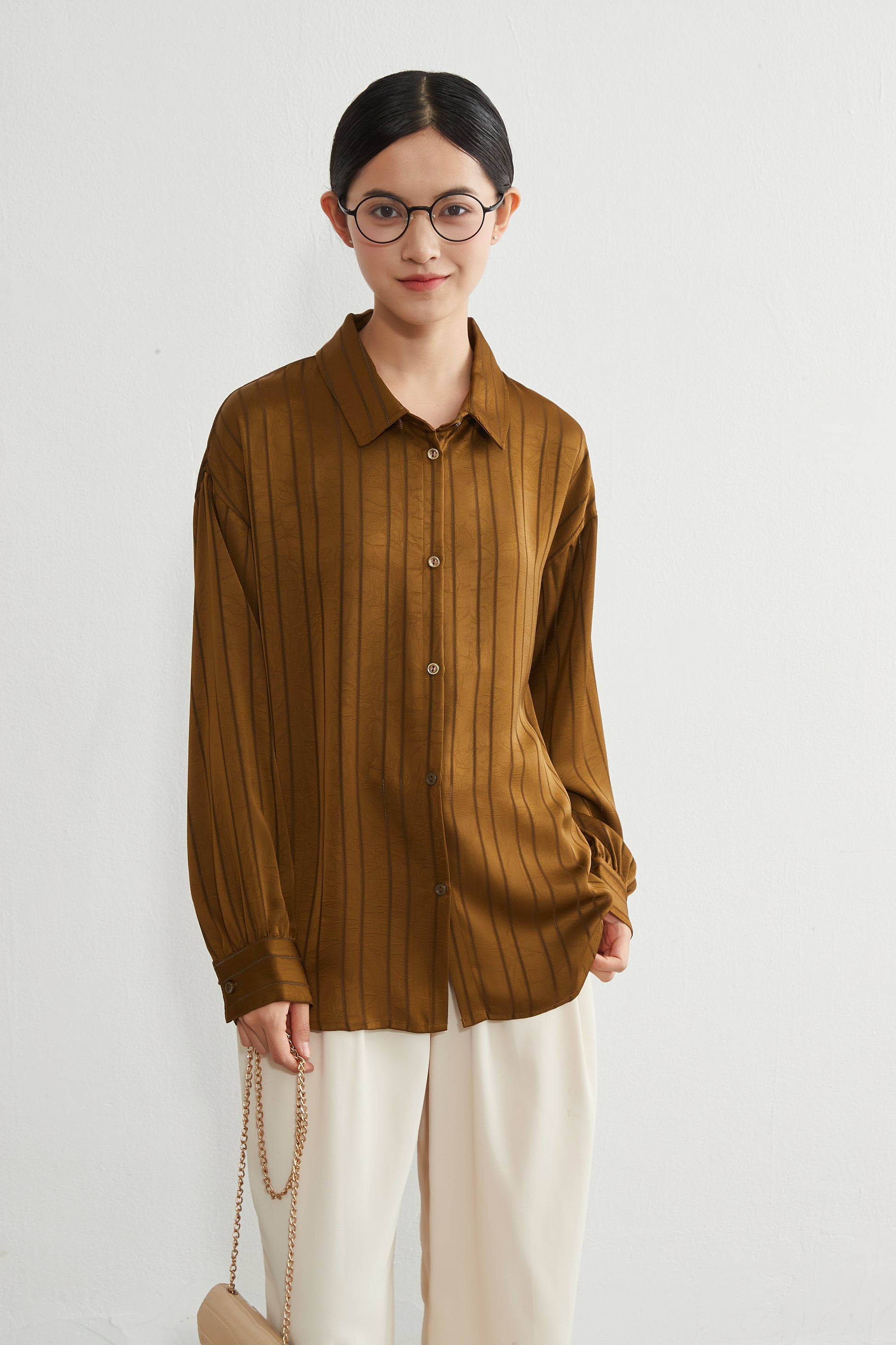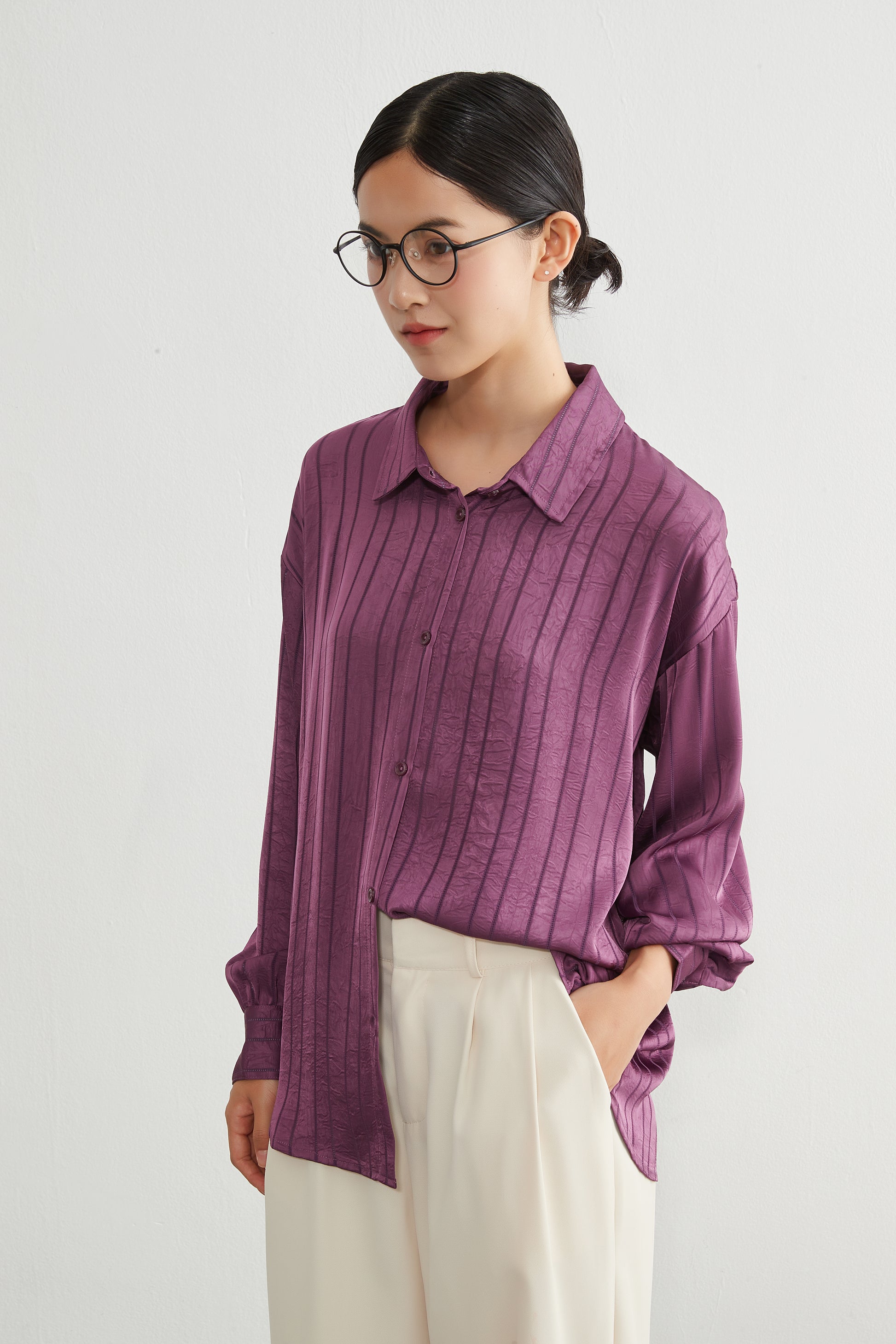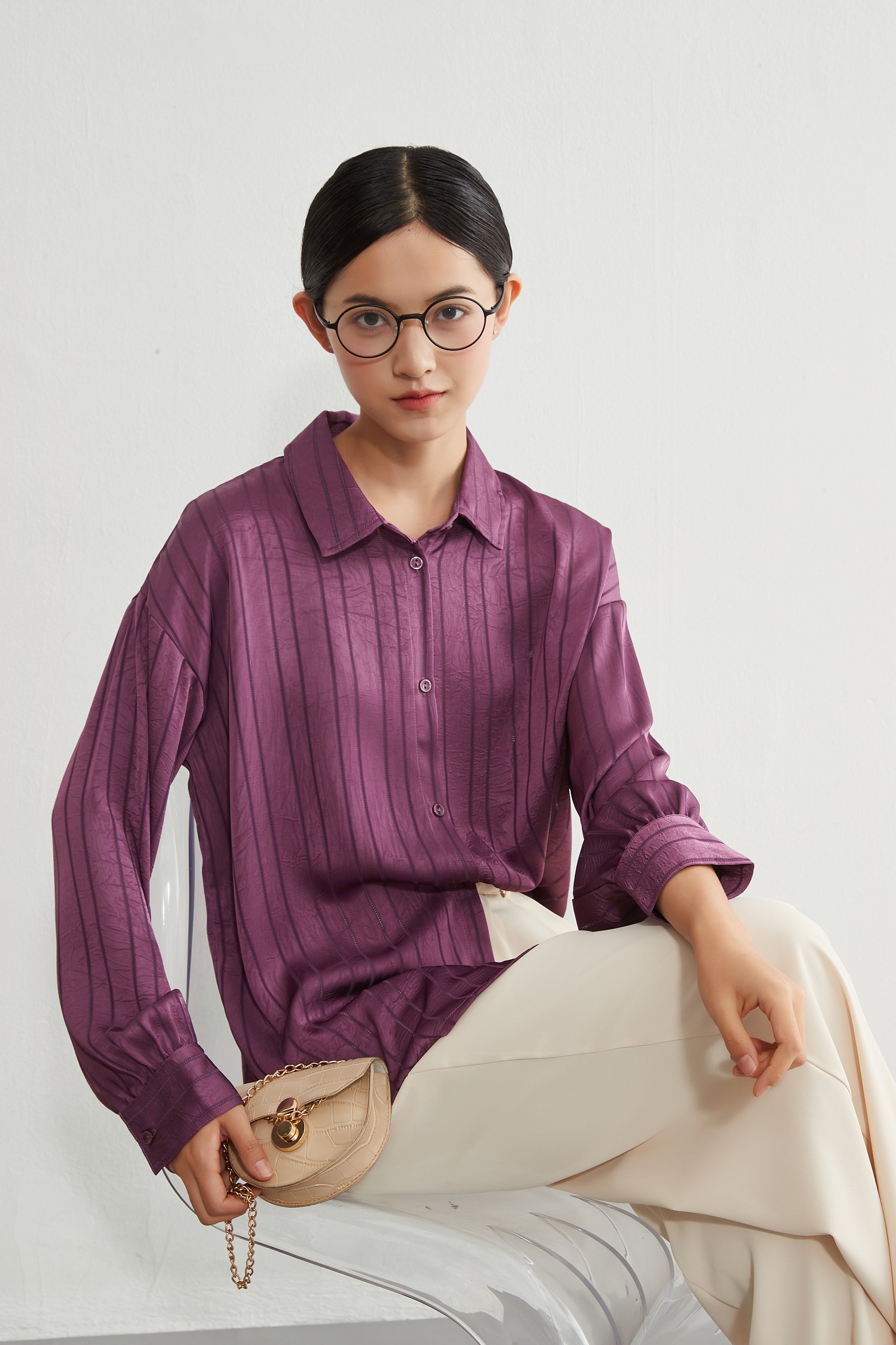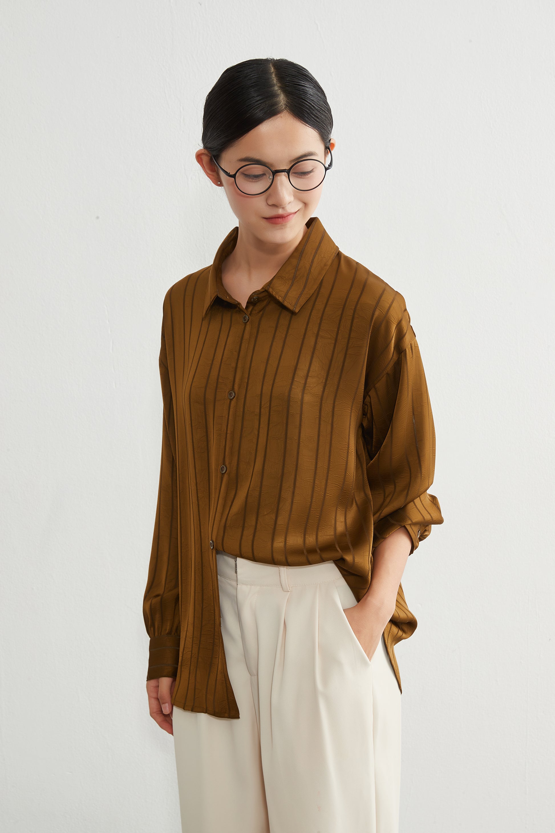 ハンサムなシルエットと長袖デザインで、大人の女性らしい凛とした印象を与えるシャツブラウス。フロントには繊細なアイレット風ジャカード織りが施され、シンプルながらも上品で華やかな表情に。程よい艶感が光を受けて大人きれいめスタイルを引き立て、オンオフ問わず幅広いシーンで活躍します。