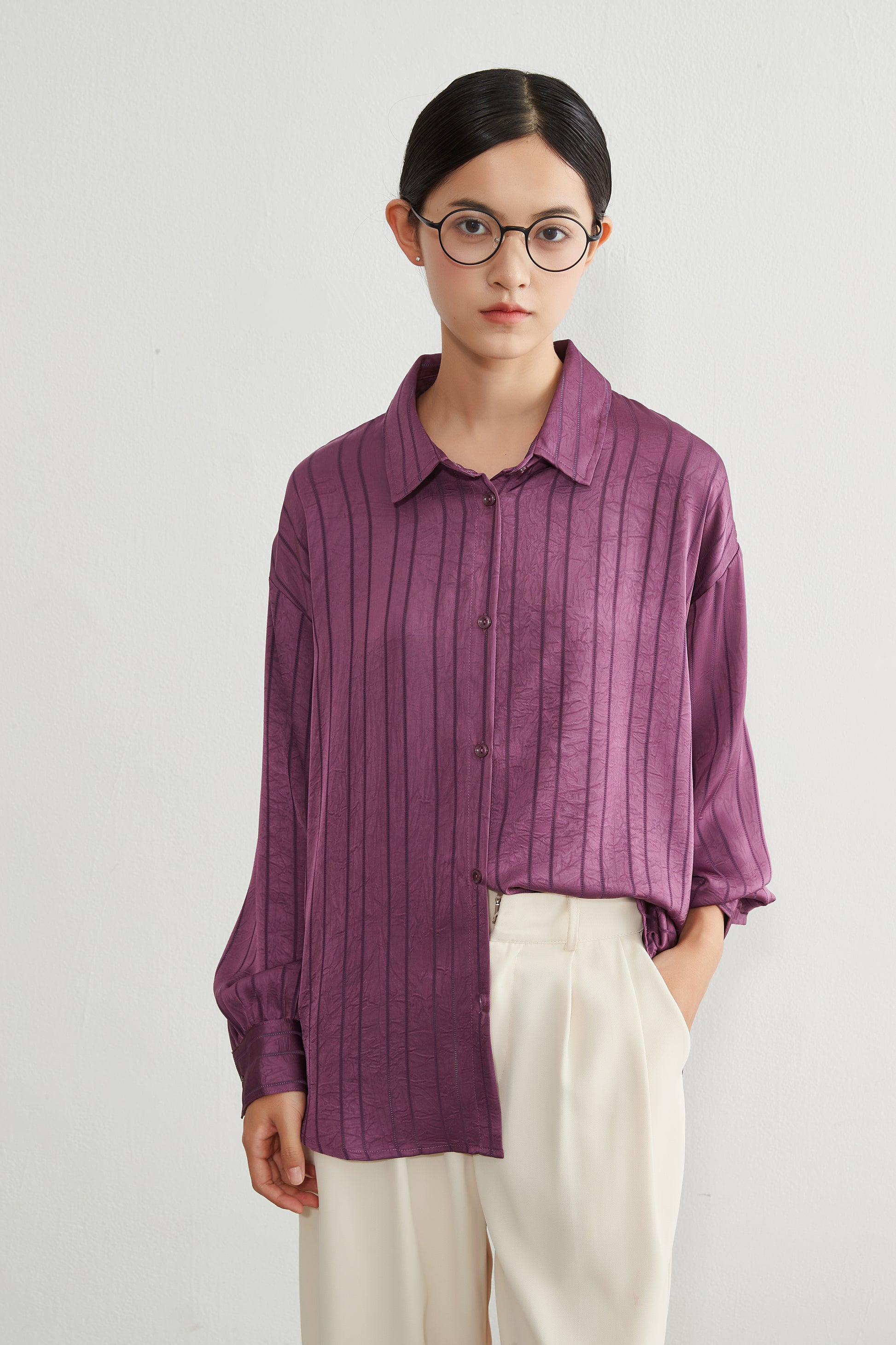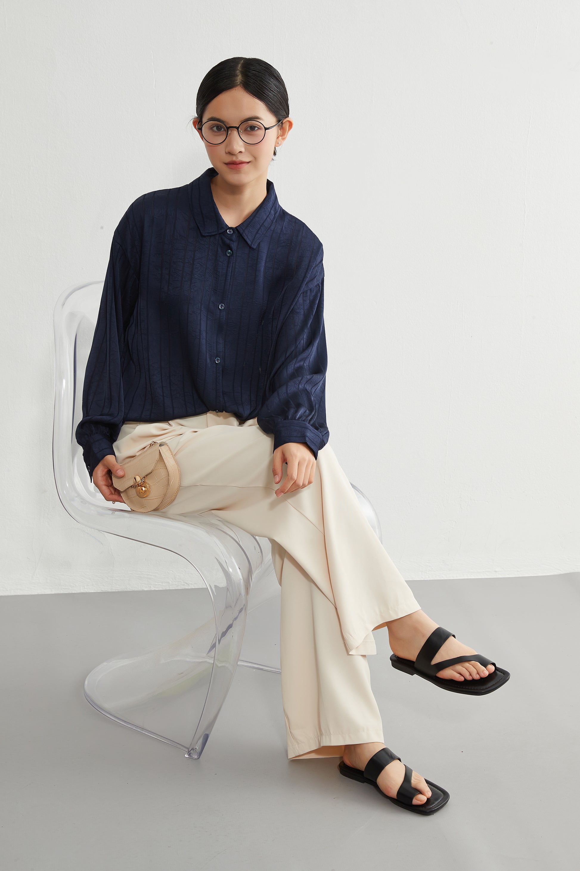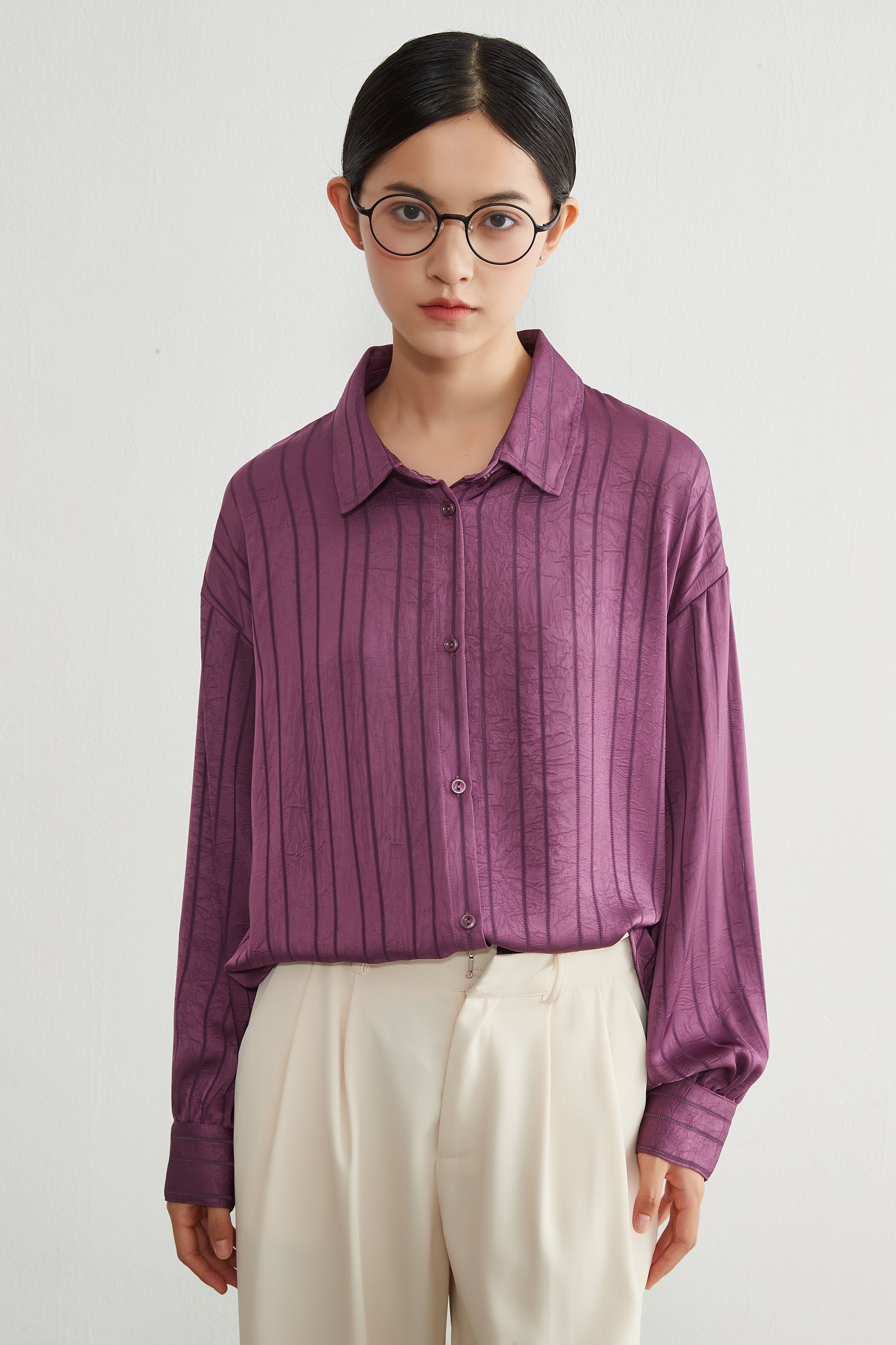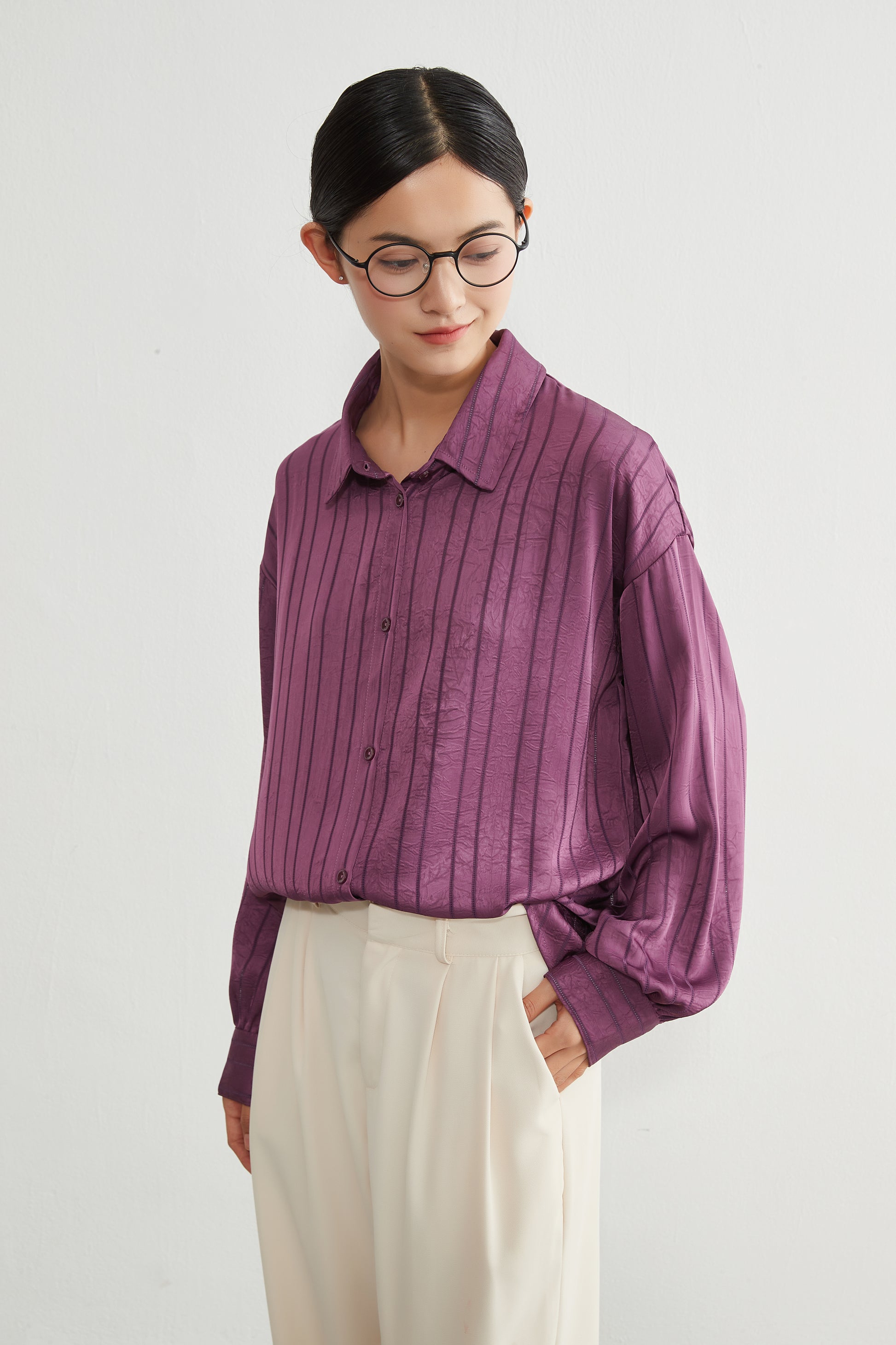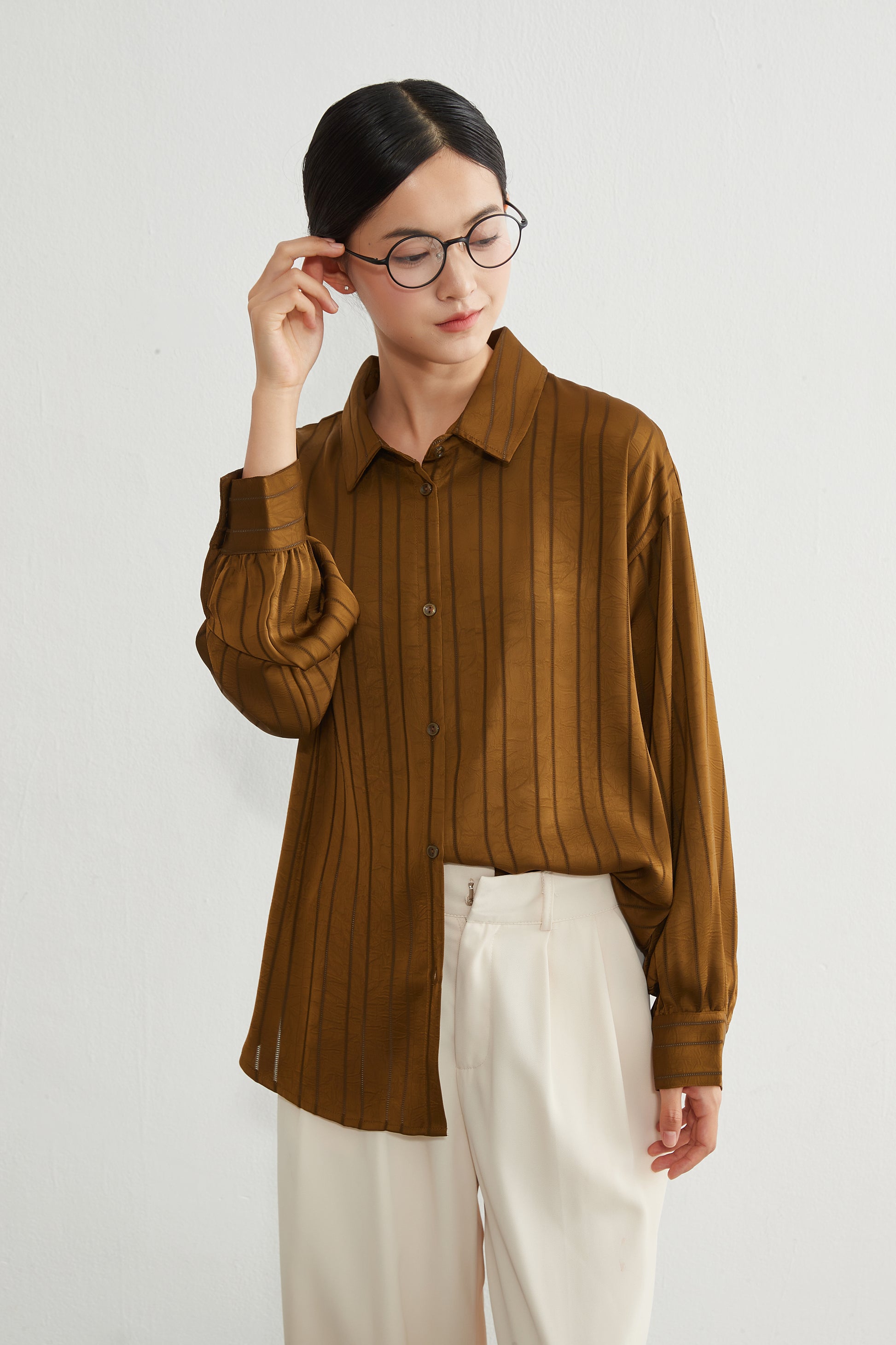 ハンサムなシルエットと長袖デザインで、大人の女性らしい凛とした印象を与えるシャツブラウス。フロントには繊細なアイレット風ジャカード織りが施され、シンプルながらも上品で華やかな表情に。程よい艶感が光を受けて大人きれいめスタイルを引き立て、オンオフ問わず幅広いシーンで活躍します。
