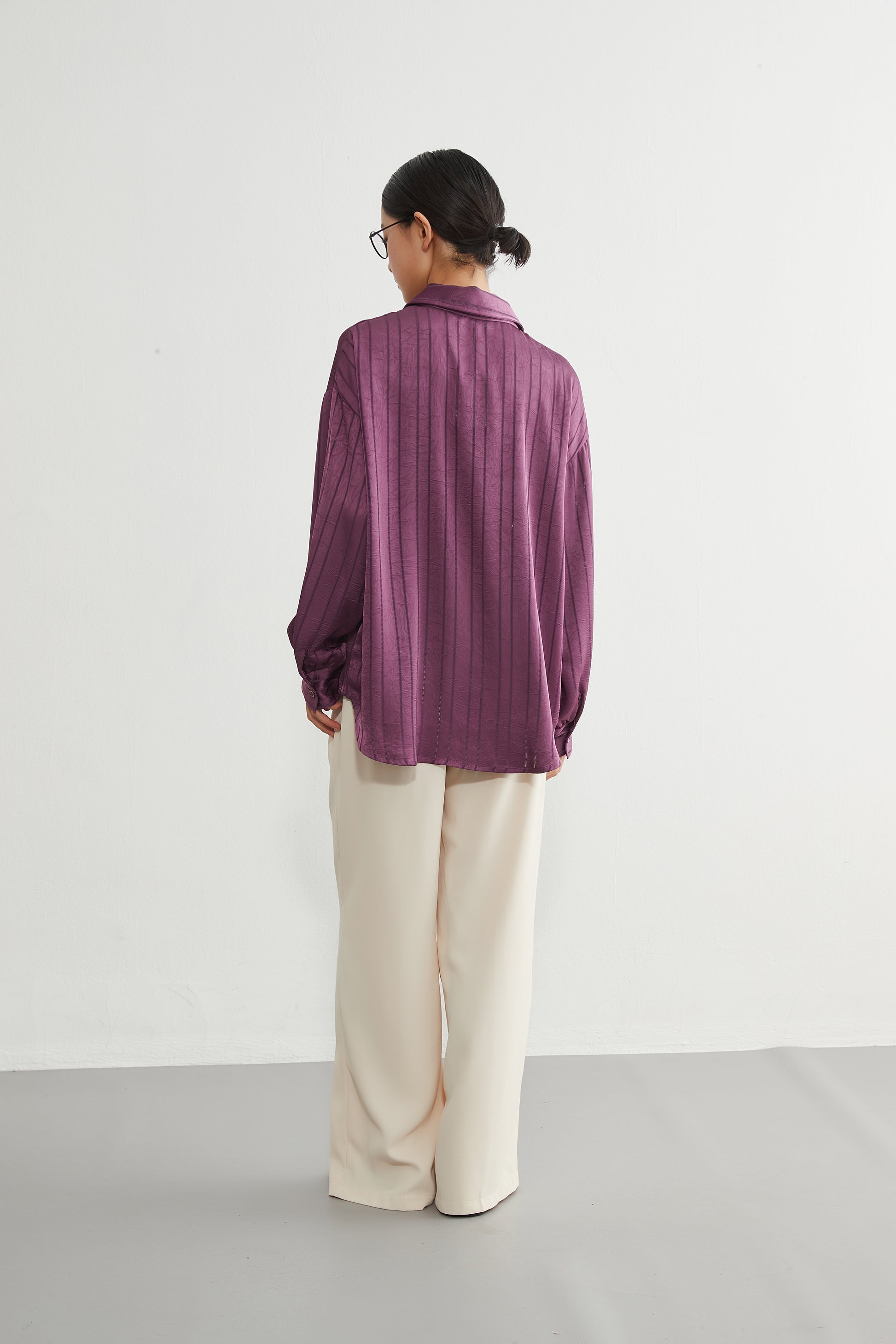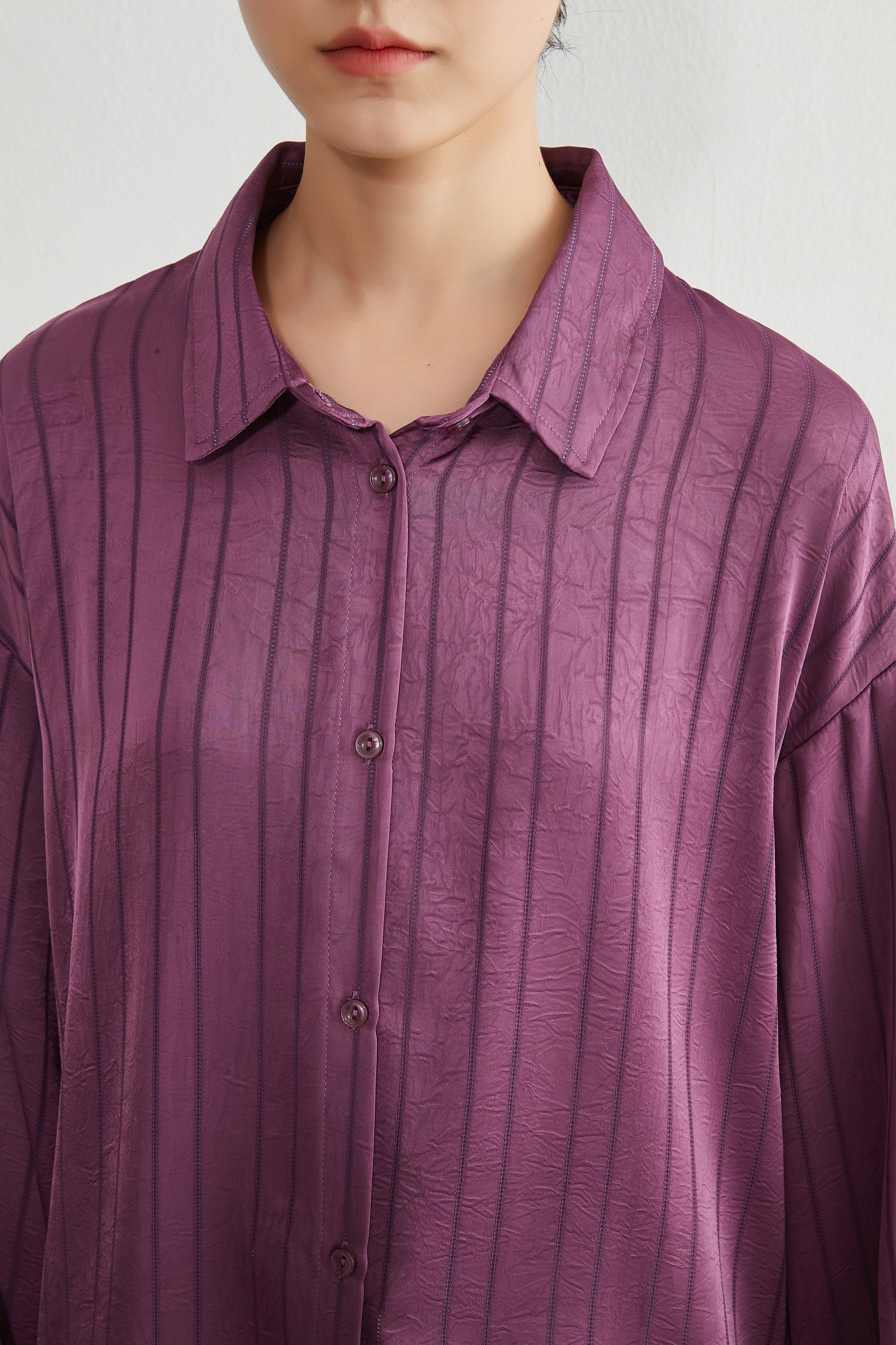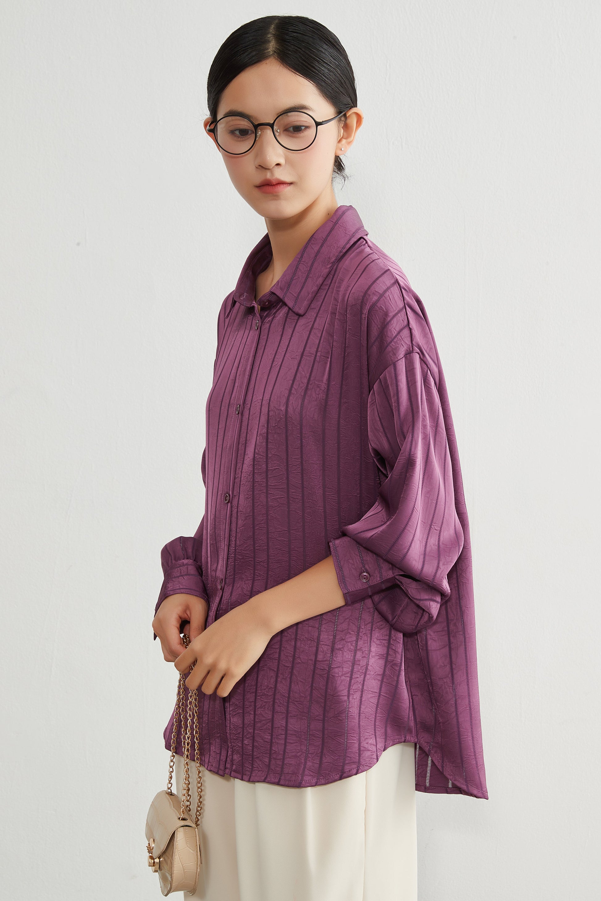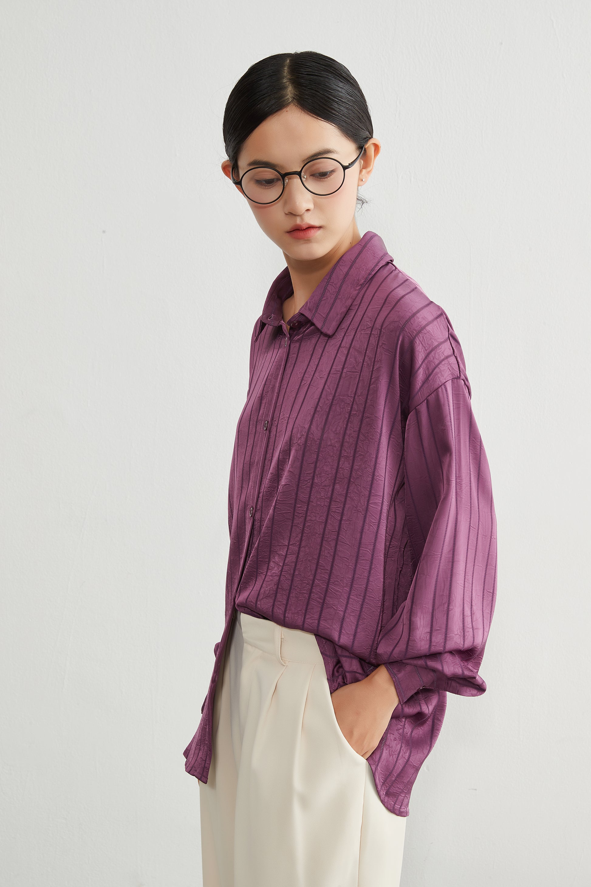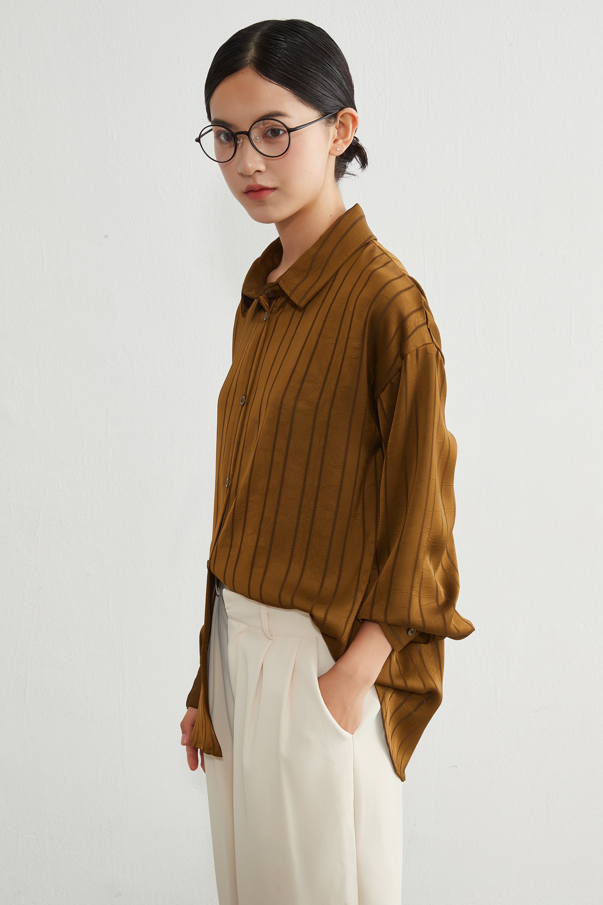 ハンサムなシルエットと長袖デザインで、大人の女性らしい凛とした印象を与えるシャツブラウス。フロントには繊細なアイレット風ジャカード織りが施され、シンプルながらも上品で華やかな表情に。程よい艶感が光を受けて大人きれいめスタイルを引き立て、オンオフ問わず幅広いシーンで活躍します。