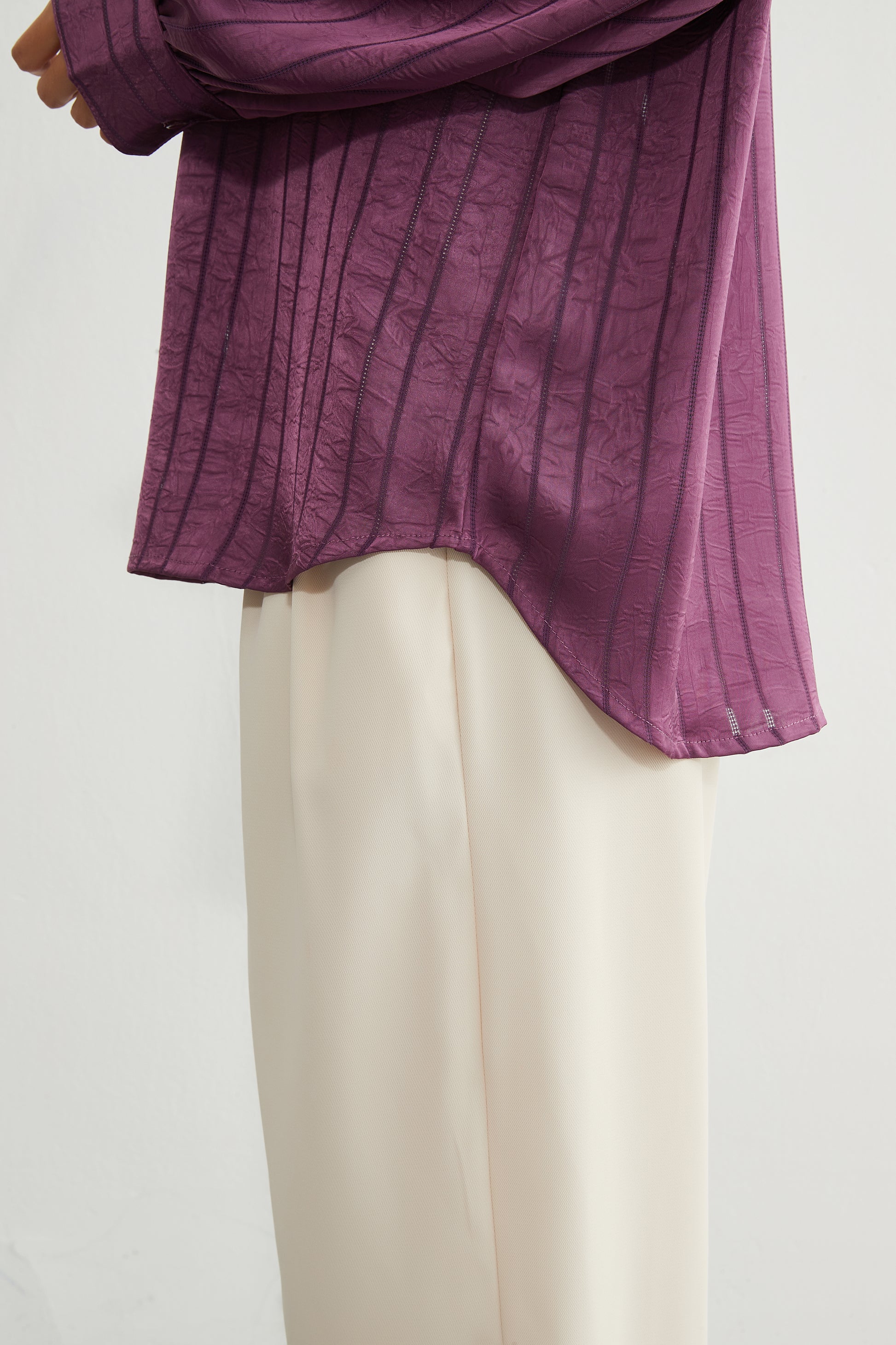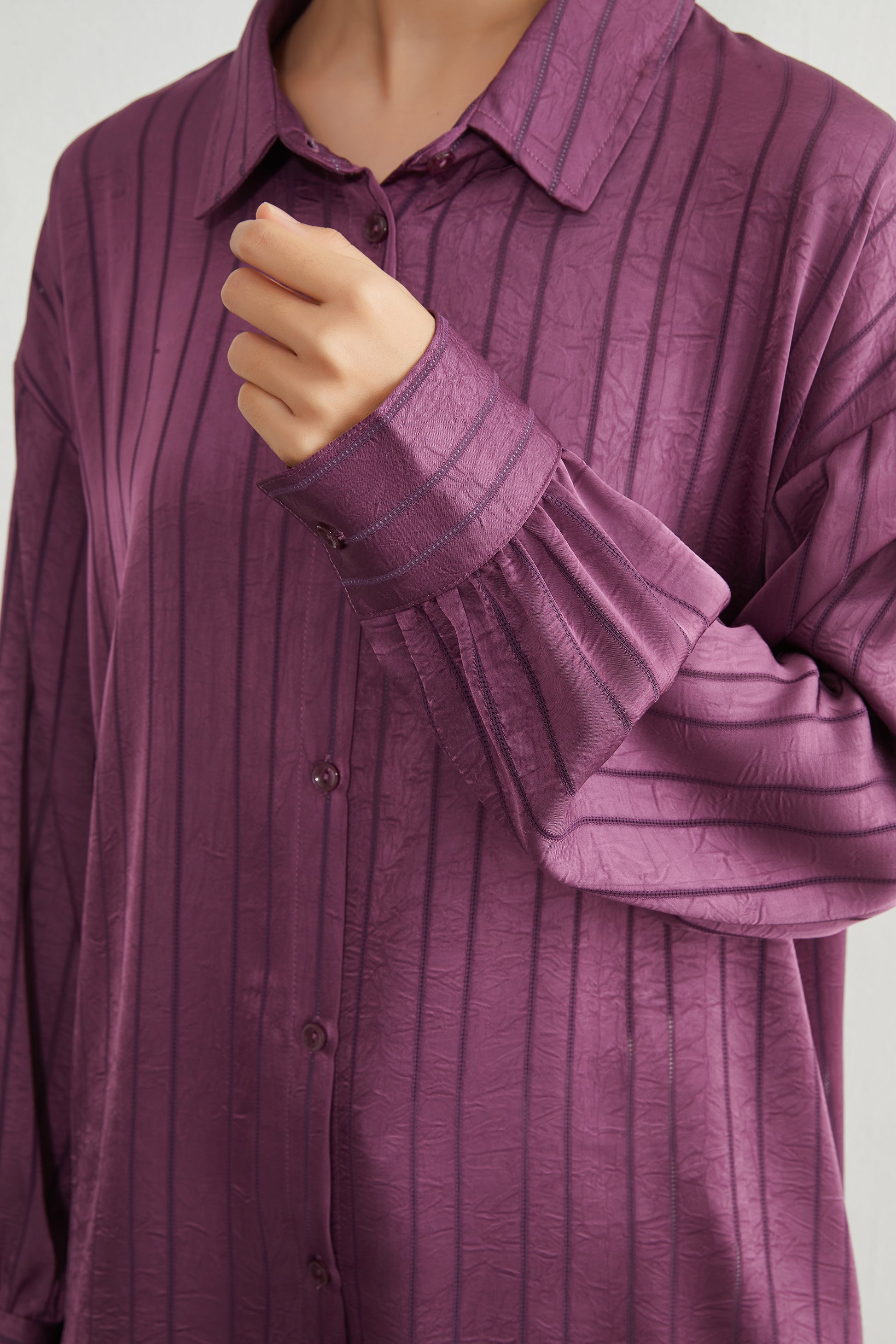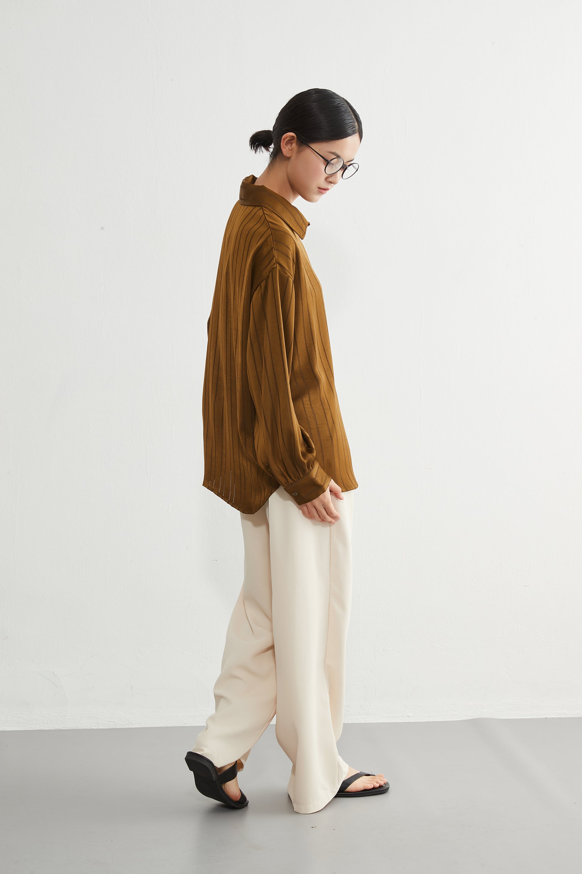凹凸感のあるジャカード織りにさりげない光沢を加えた高見え素材を採用。透けすぎない適度な厚みで、一枚でも安心して着用でき、羽織りとしても重ねやすい設計です。滑らかで肌触りの良い生地感が、着心地の快適さと上品さを両立させます。