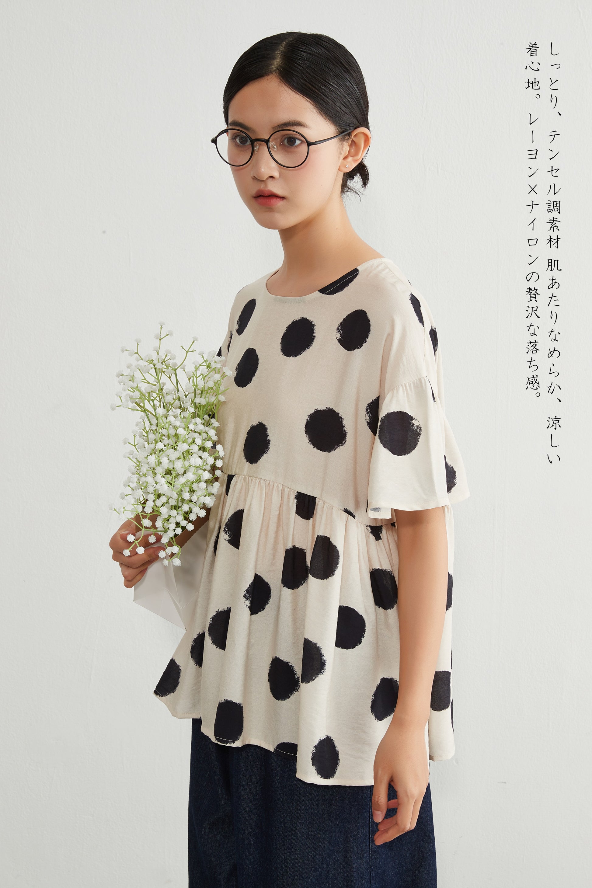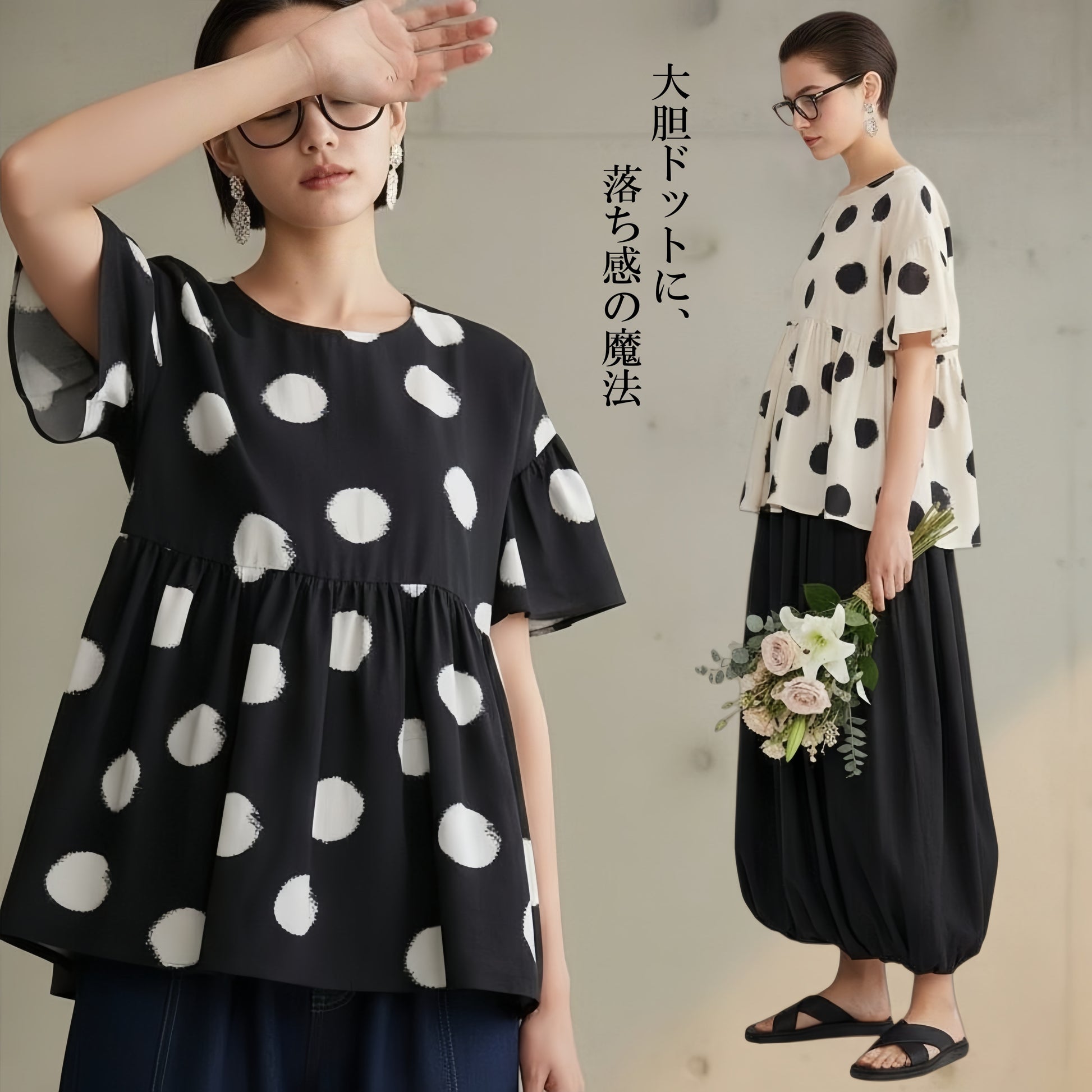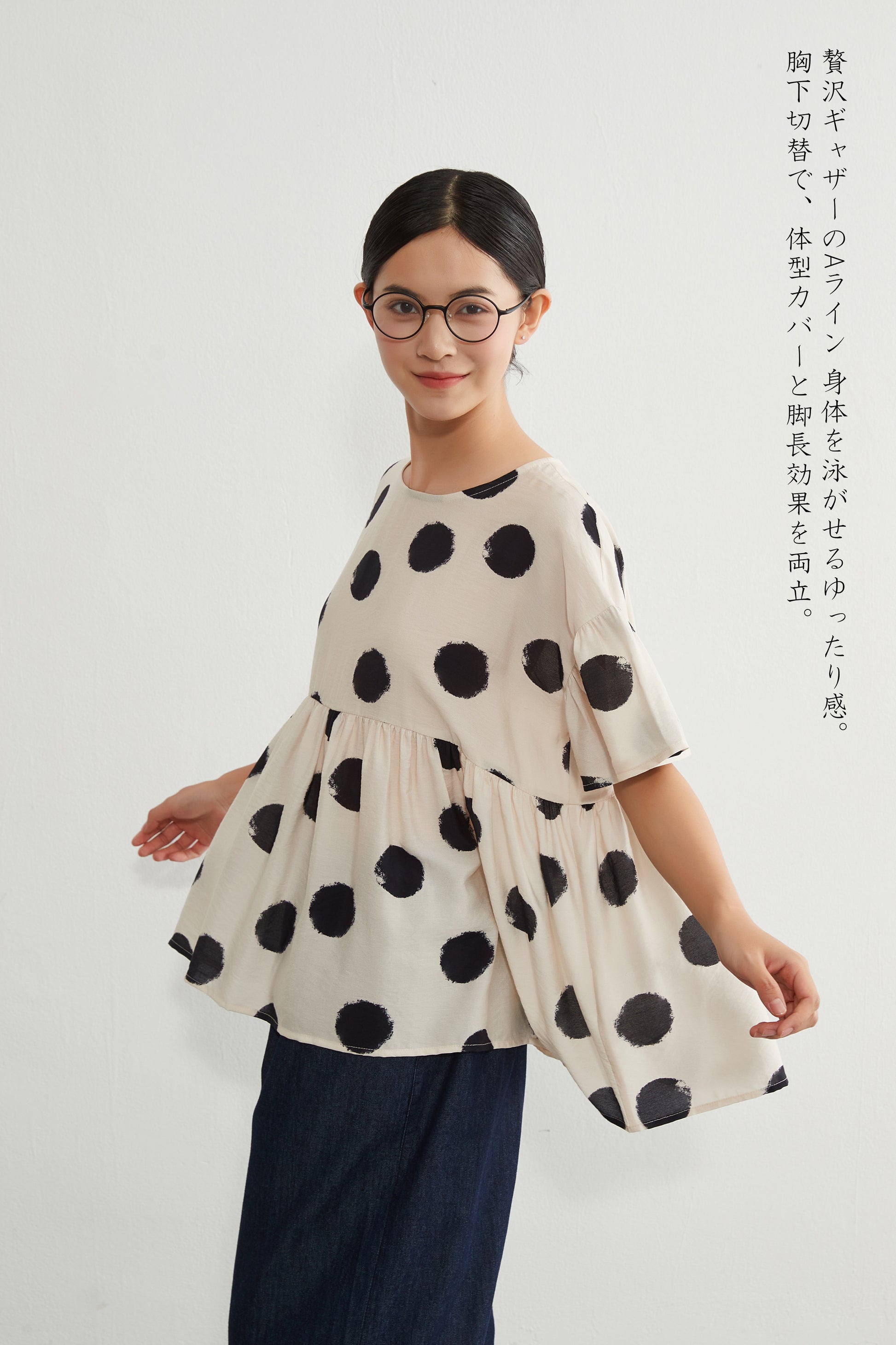 大胆なビッグドット柄の存在感のあるプリントトップス。胸下で切り替えられたギャザーがたっぷりと入っており、ふんわりと広がるAラインシルエットが女性らしいやわらかな印象を与えます。ゆったりとした身幅とドロップショルダーのデザインで、リラックス感がありつつも、動きに合わせて軽やかに揺れる表情のある一枚。プルオーバー仕様で着脱も簡単です。