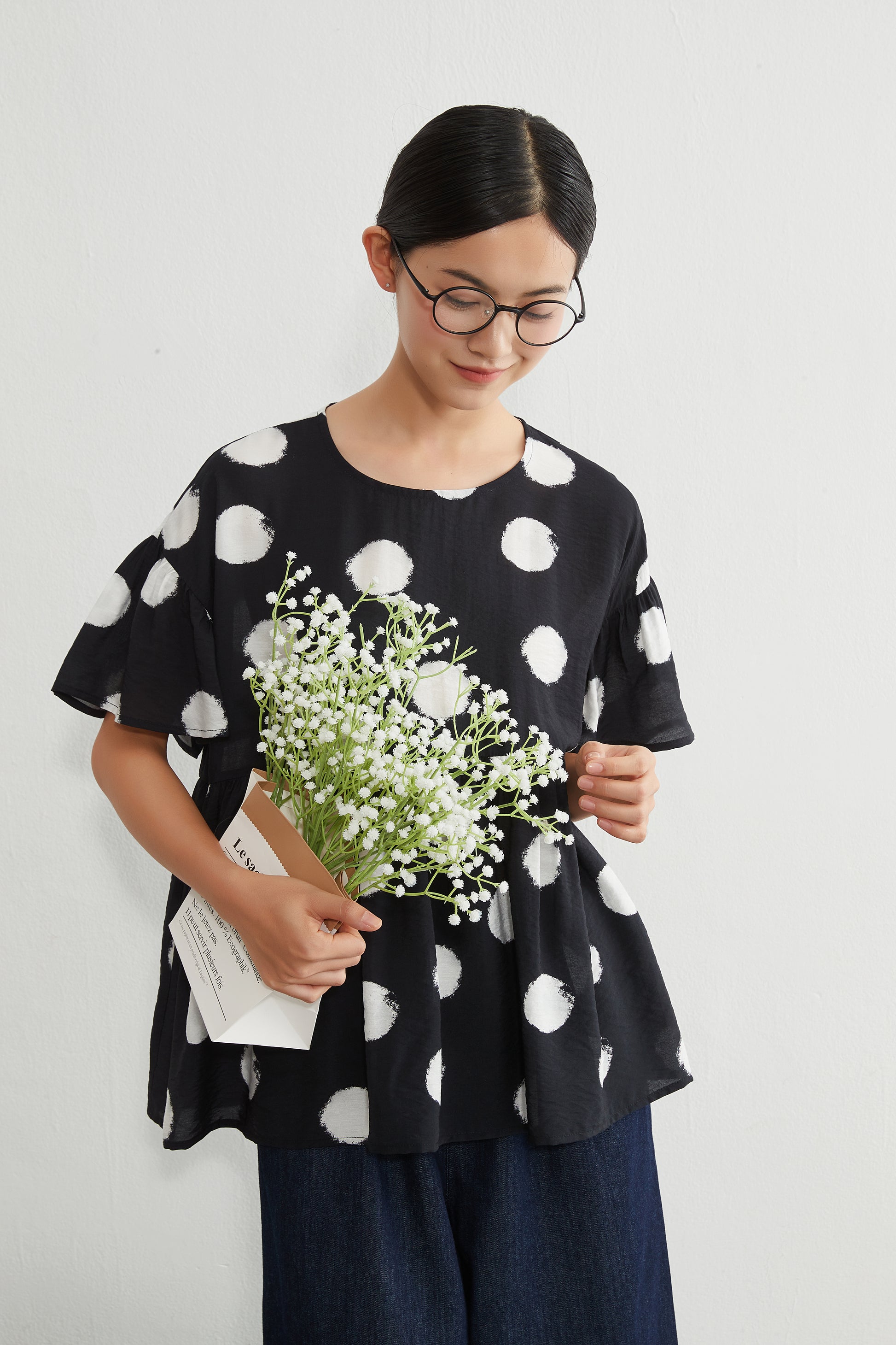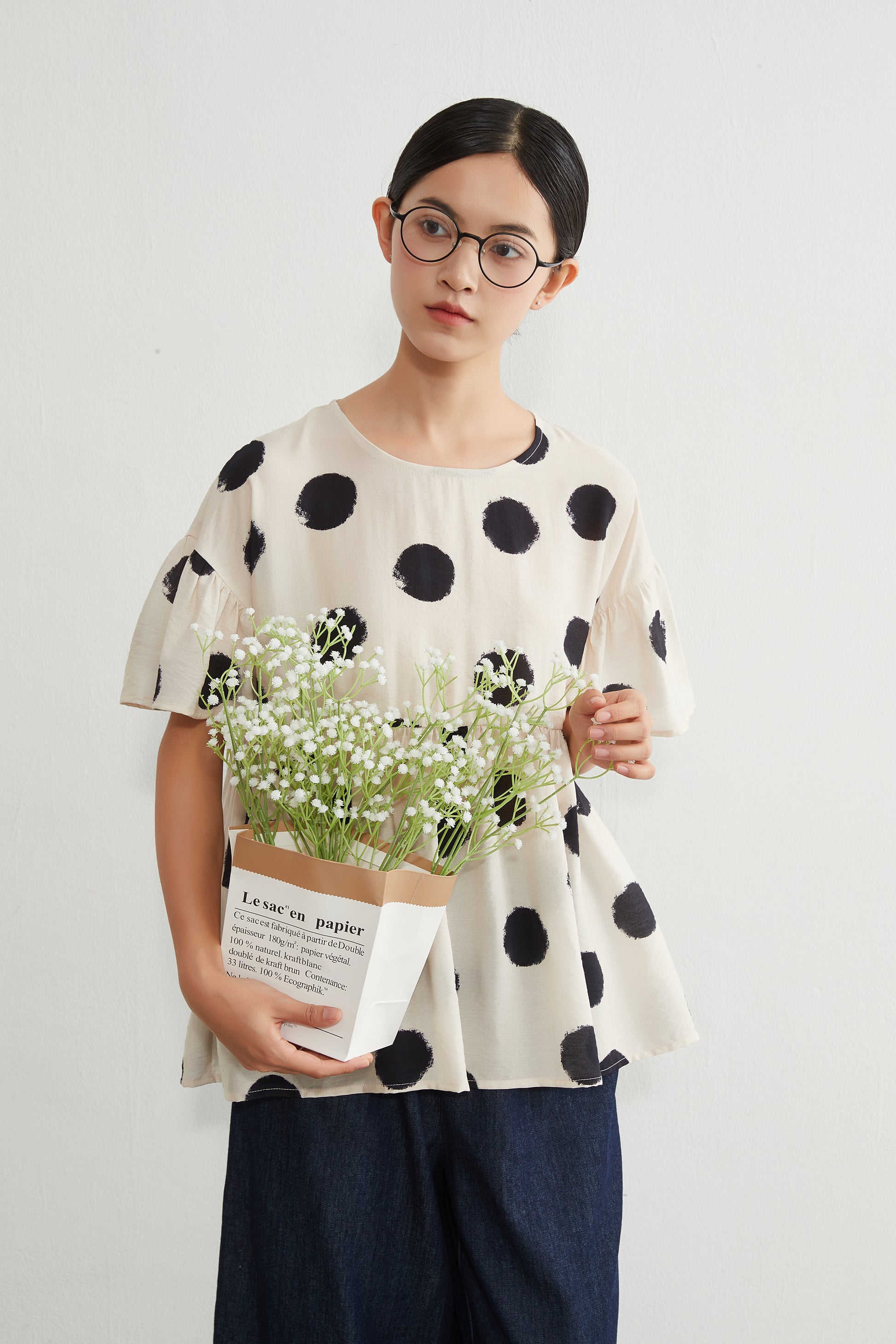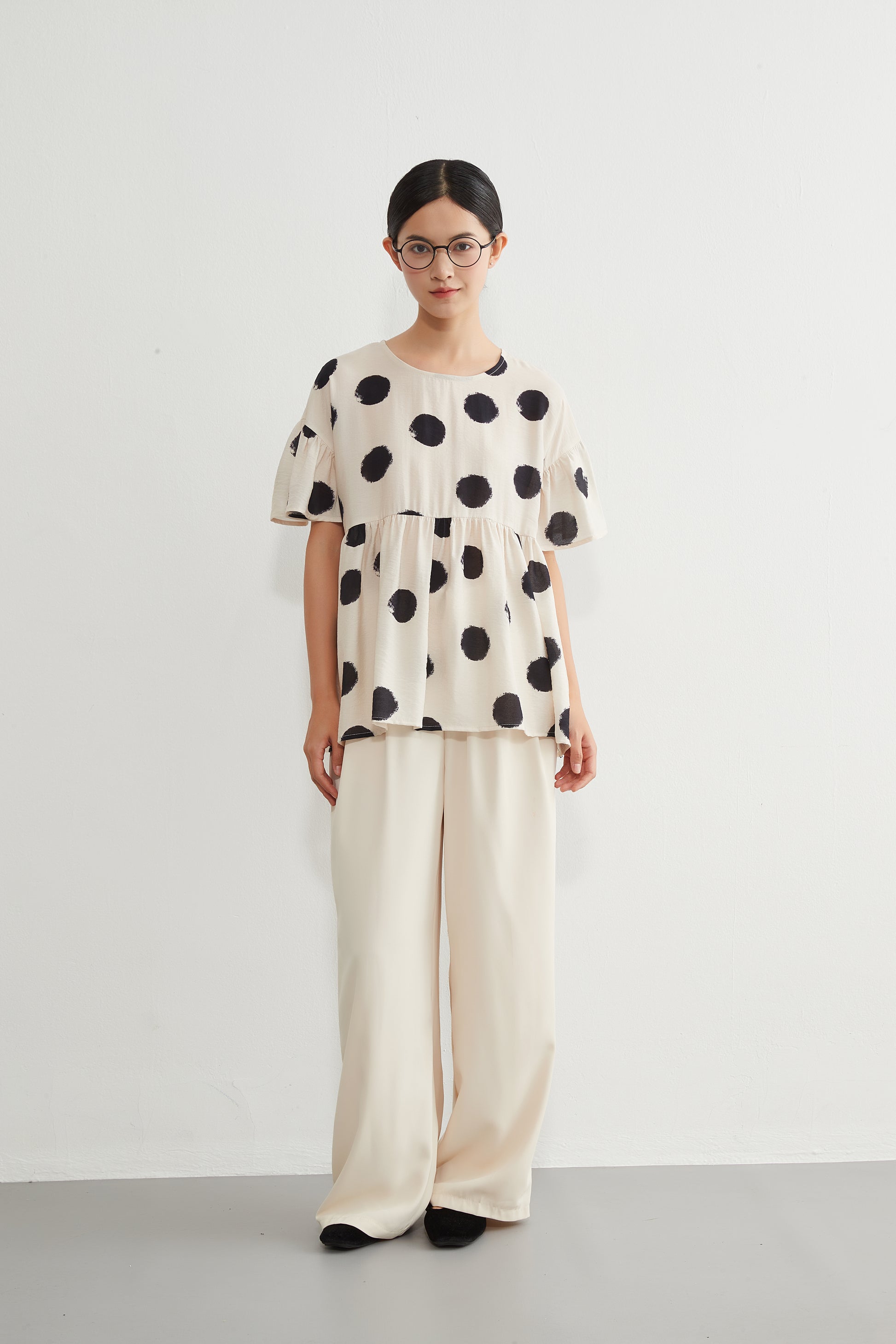 大胆なビッグドット柄の存在感のあるプリントトップス。胸下で切り替えられたギャザーがたっぷりと入っており、ふんわりと広がるAラインシルエットが女性らしいやわらかな印象を与えます。ゆったりとした身幅とドロップショルダーのデザインで、リラックス感がありつつも、動きに合わせて軽やかに揺れる表情のある一枚。プルオーバー仕様で着脱も簡単です。