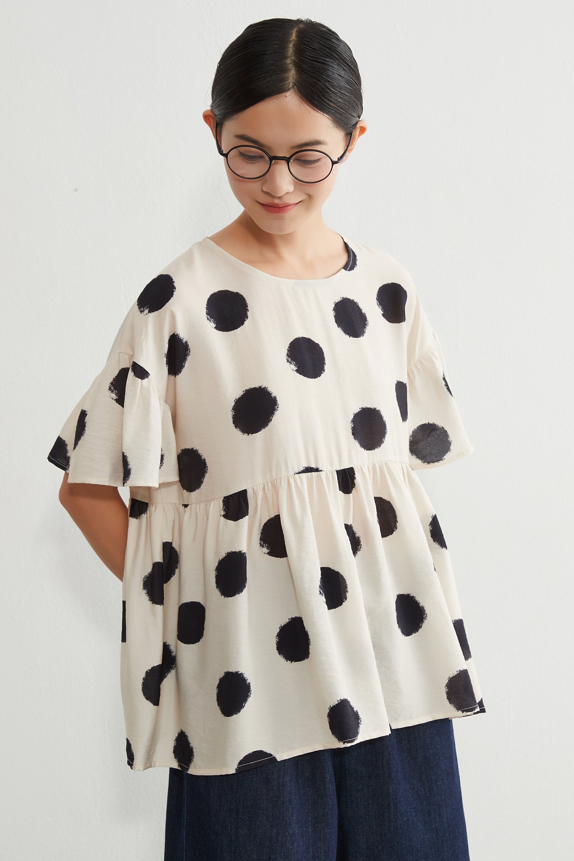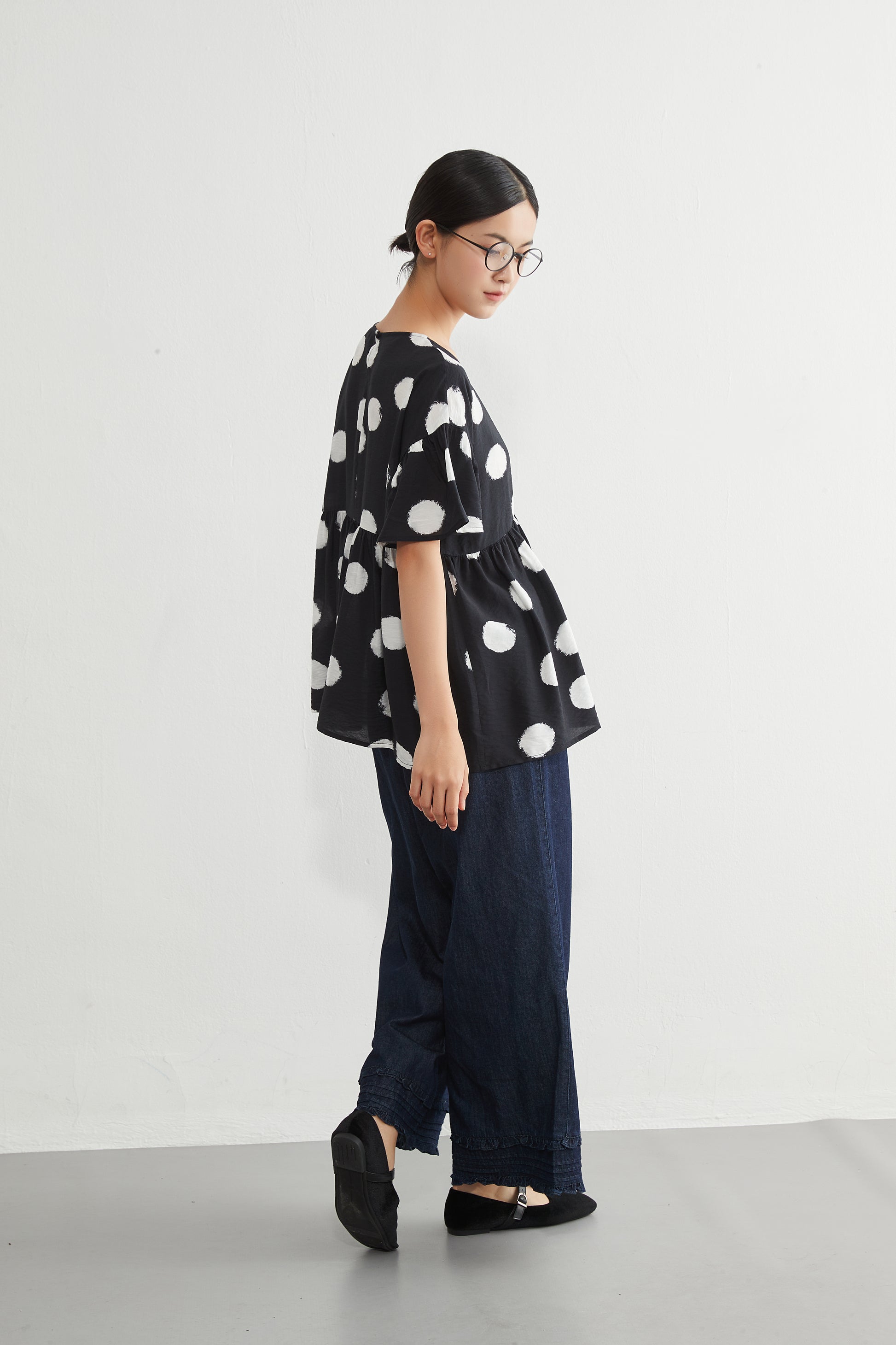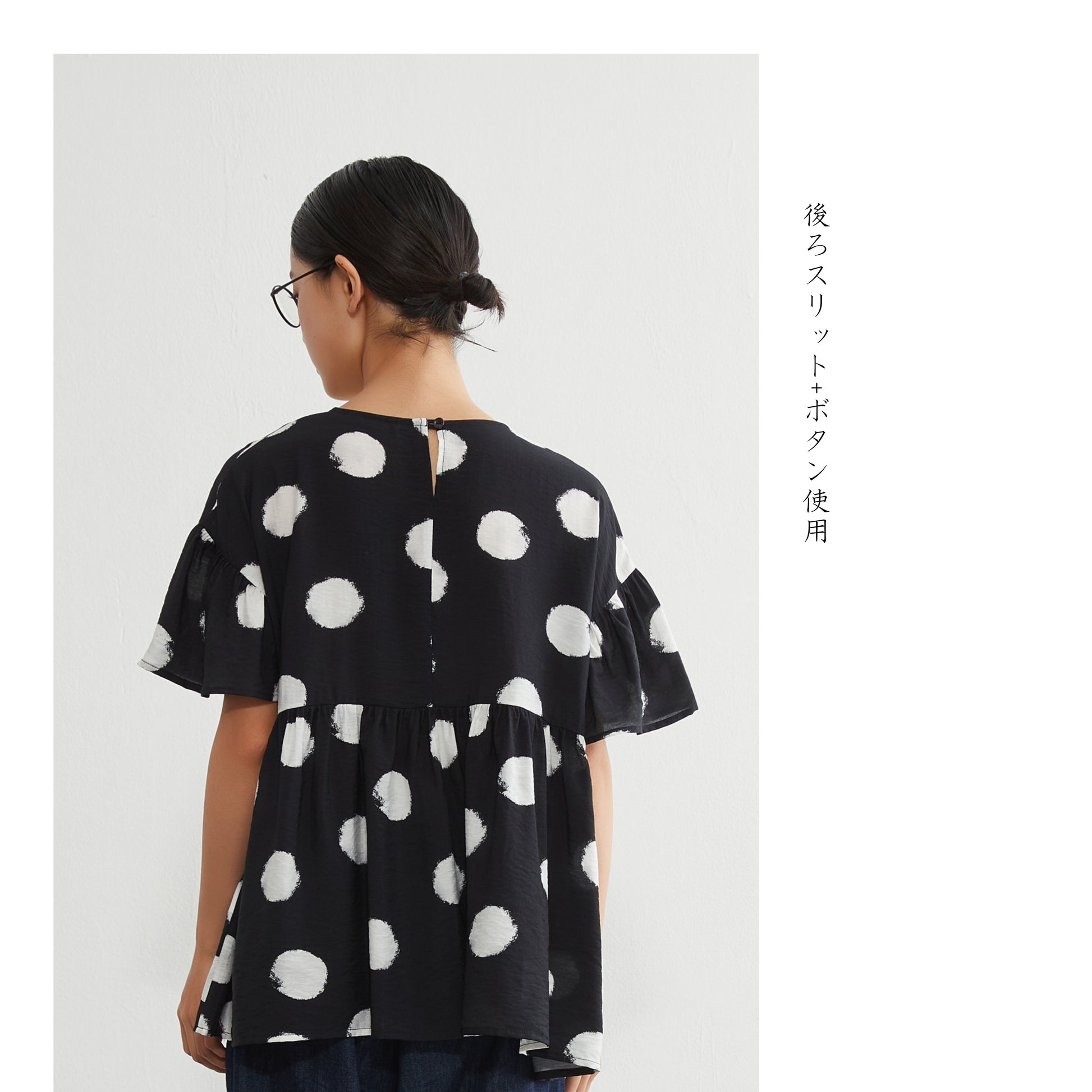 KNGT638・かすれビッグドットたっぷりギャザー切替TOPプルオーバー