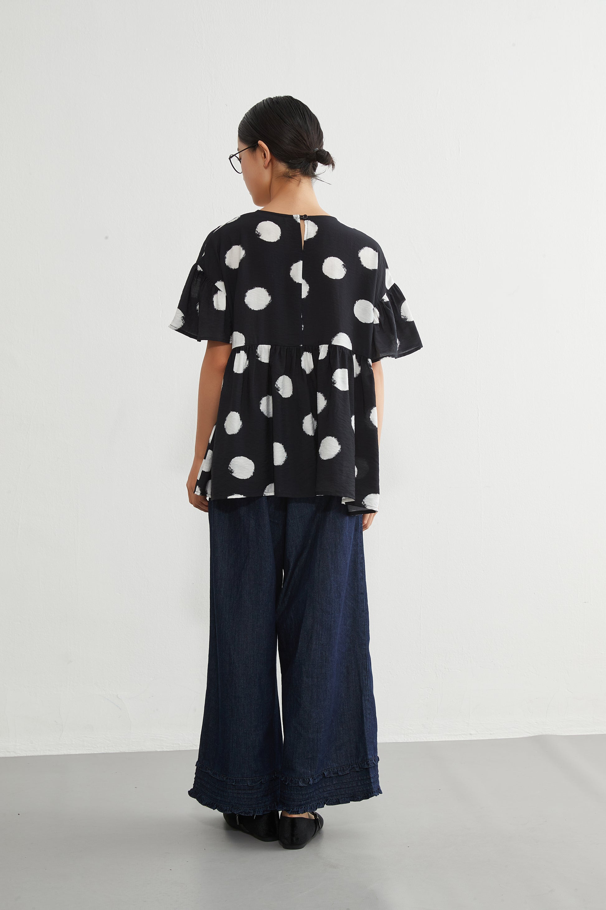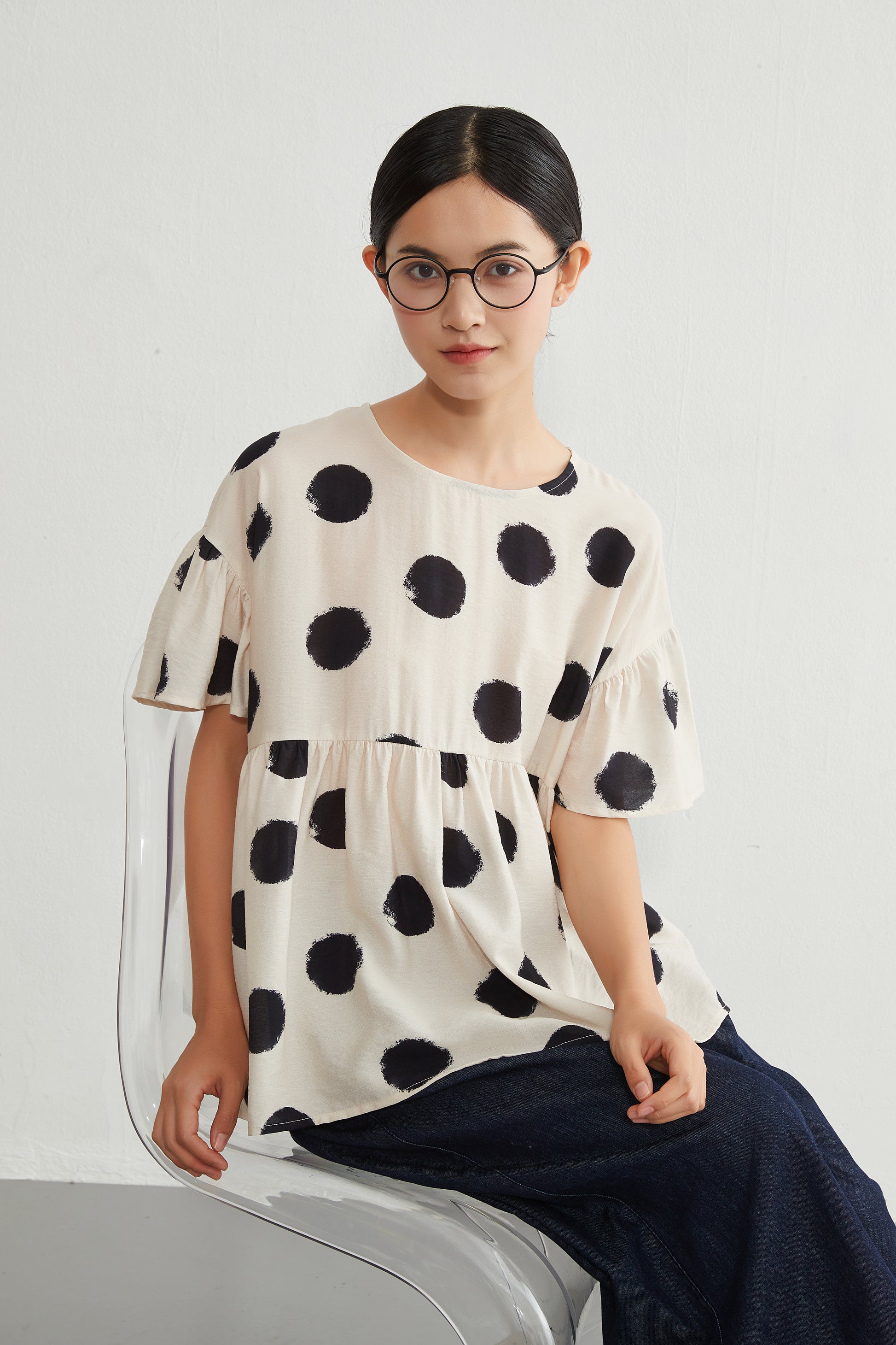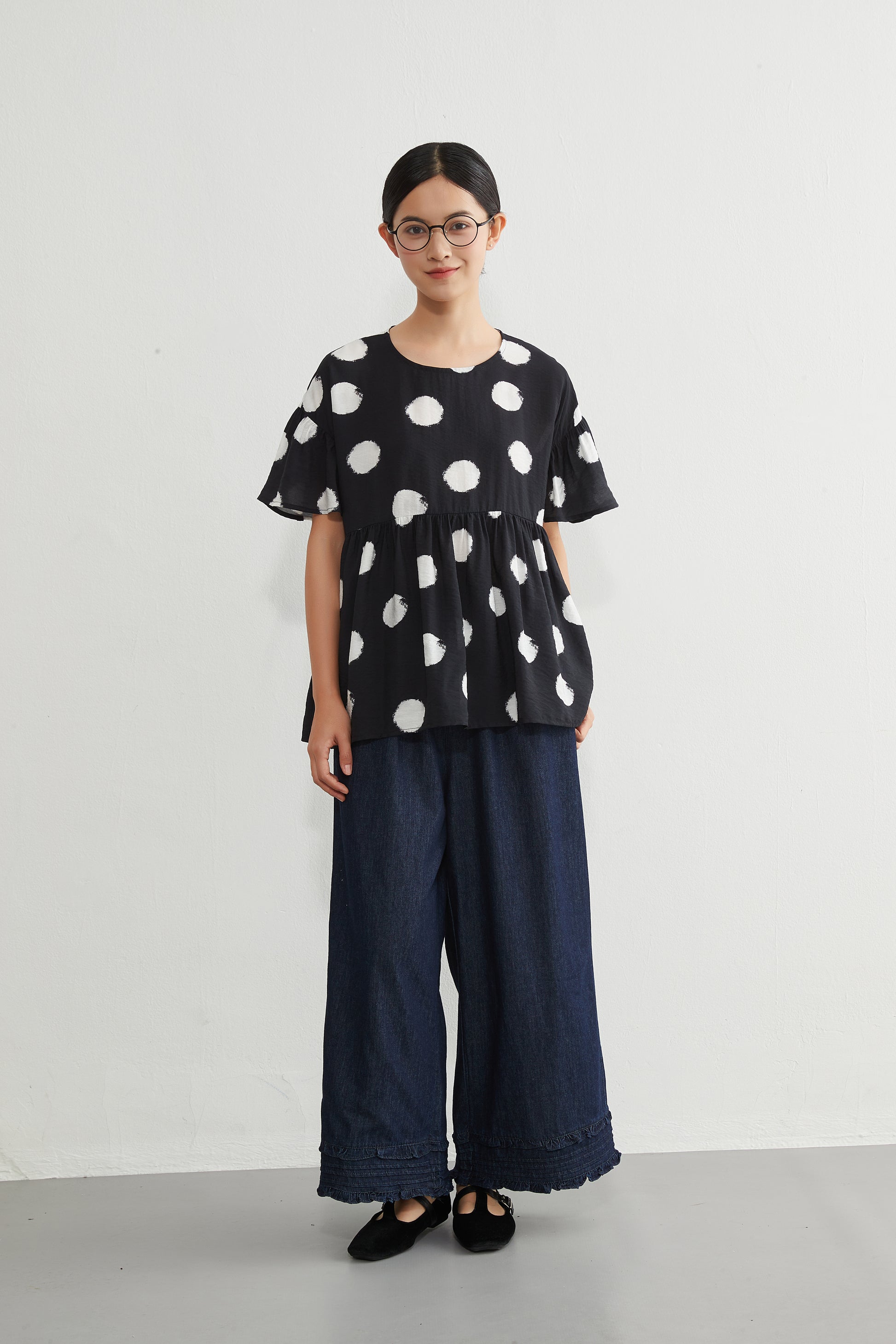 KNGT638・かすれビッグドットたっぷりギャザー切替TOPプルオーバー