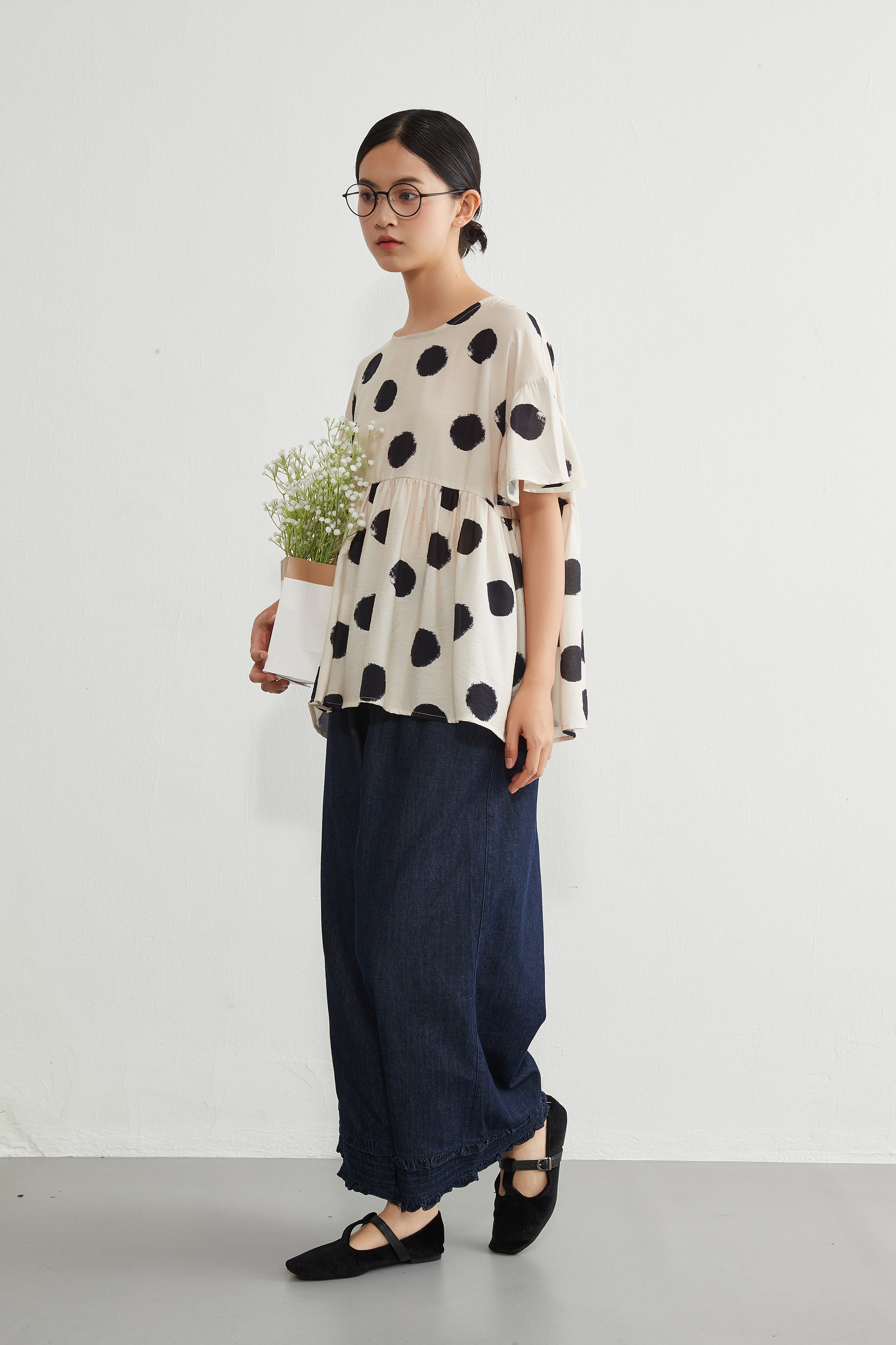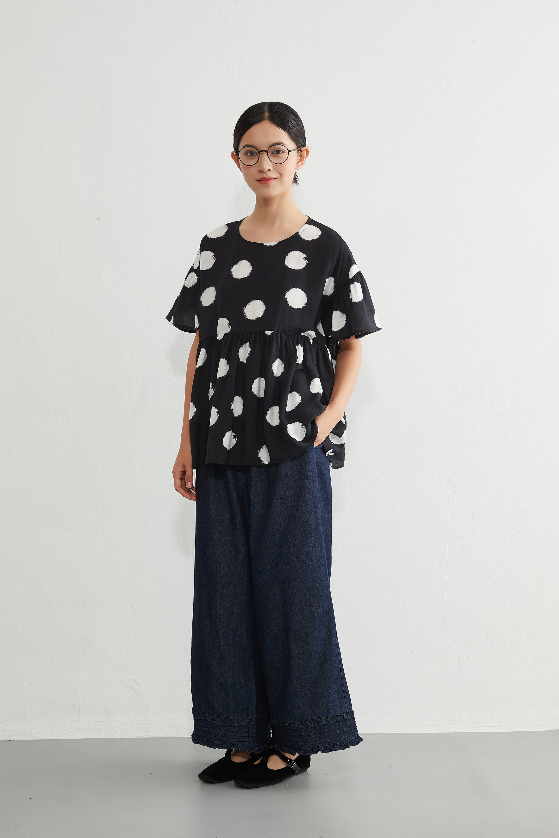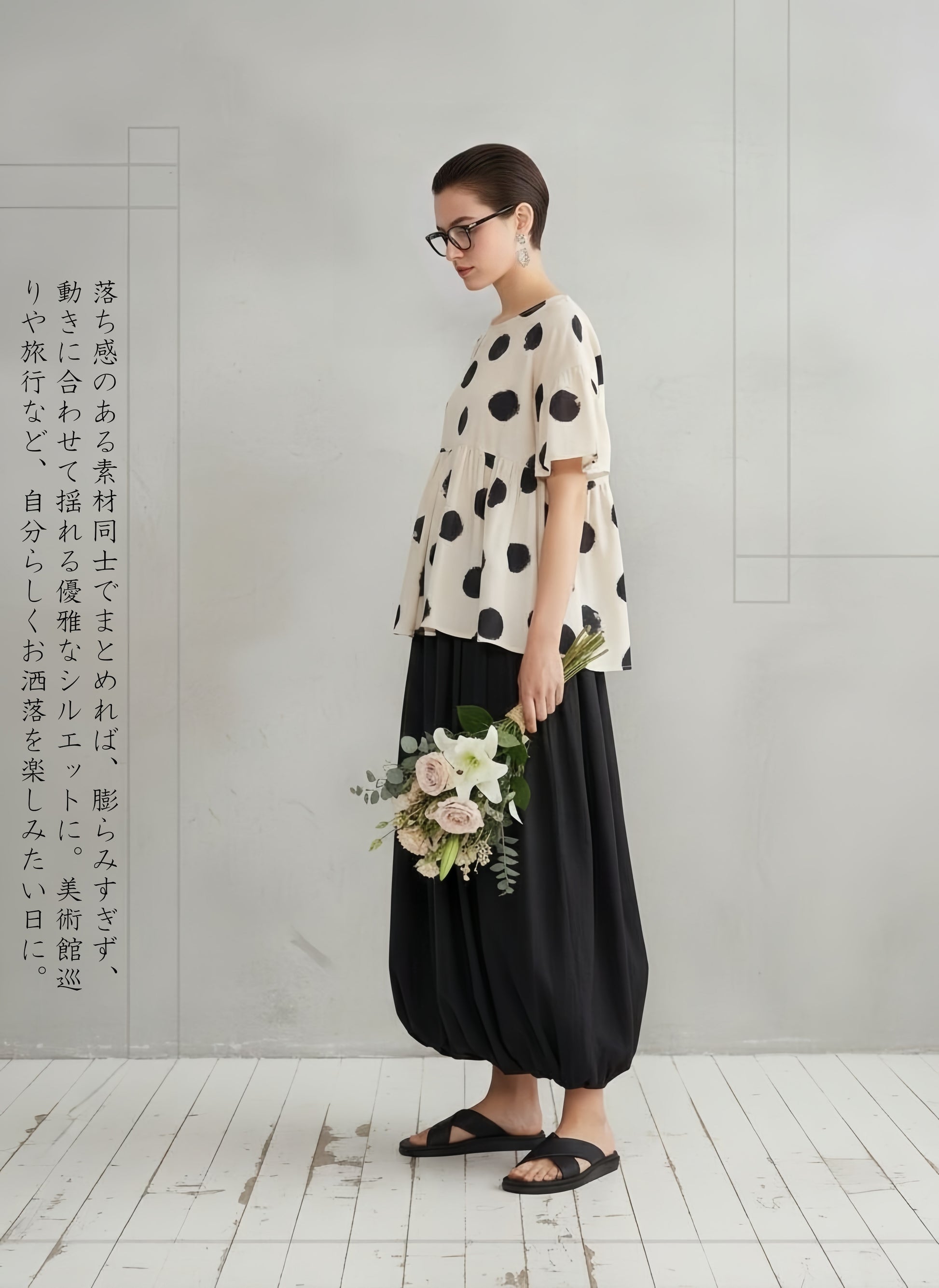 かすれドットの個性が引き立ち、視線が上に集まるので脚長効果も抜群。フラットなパンプスを合わせれば、品のある大人のデイリーコーデが完成します。
