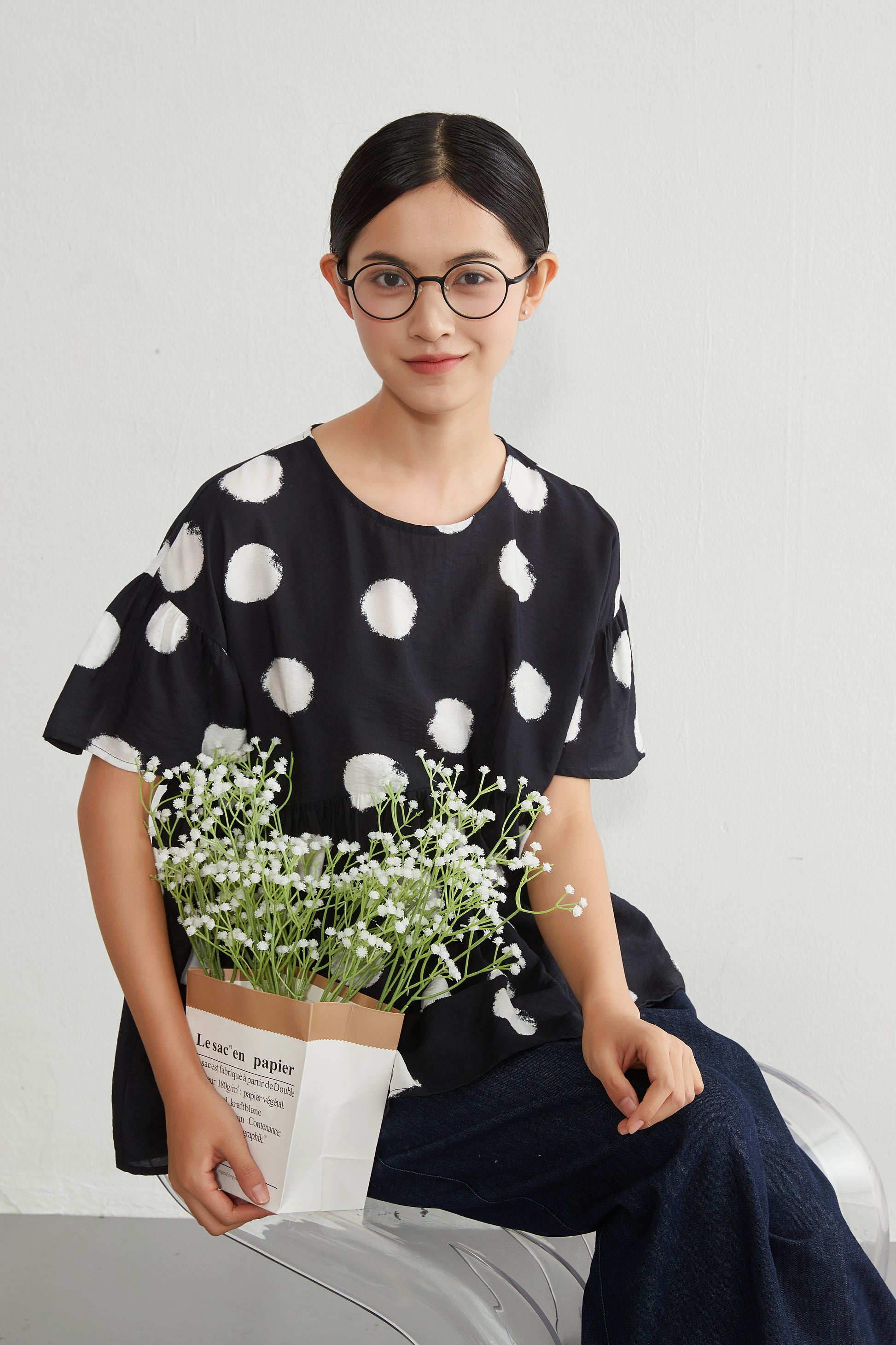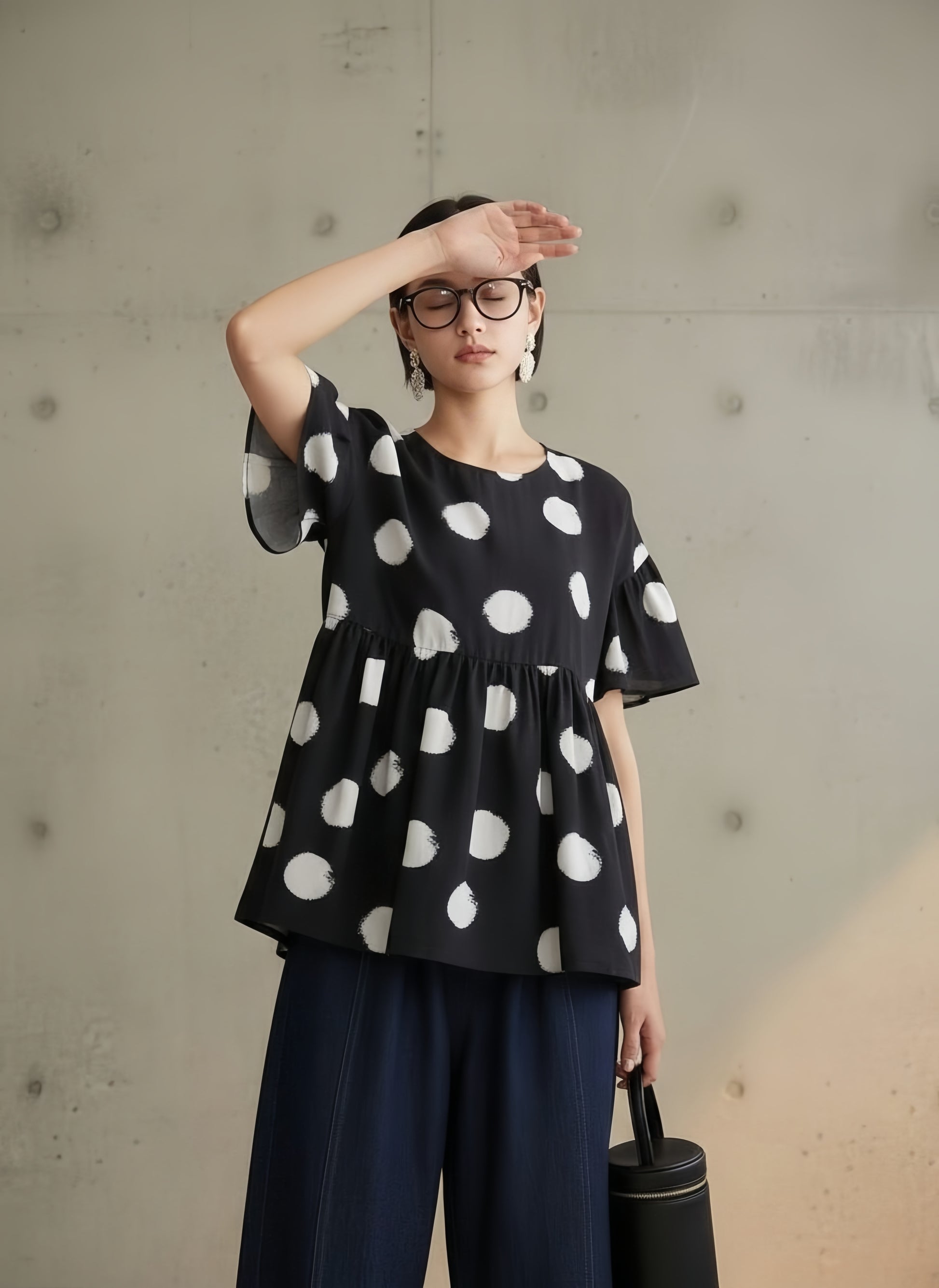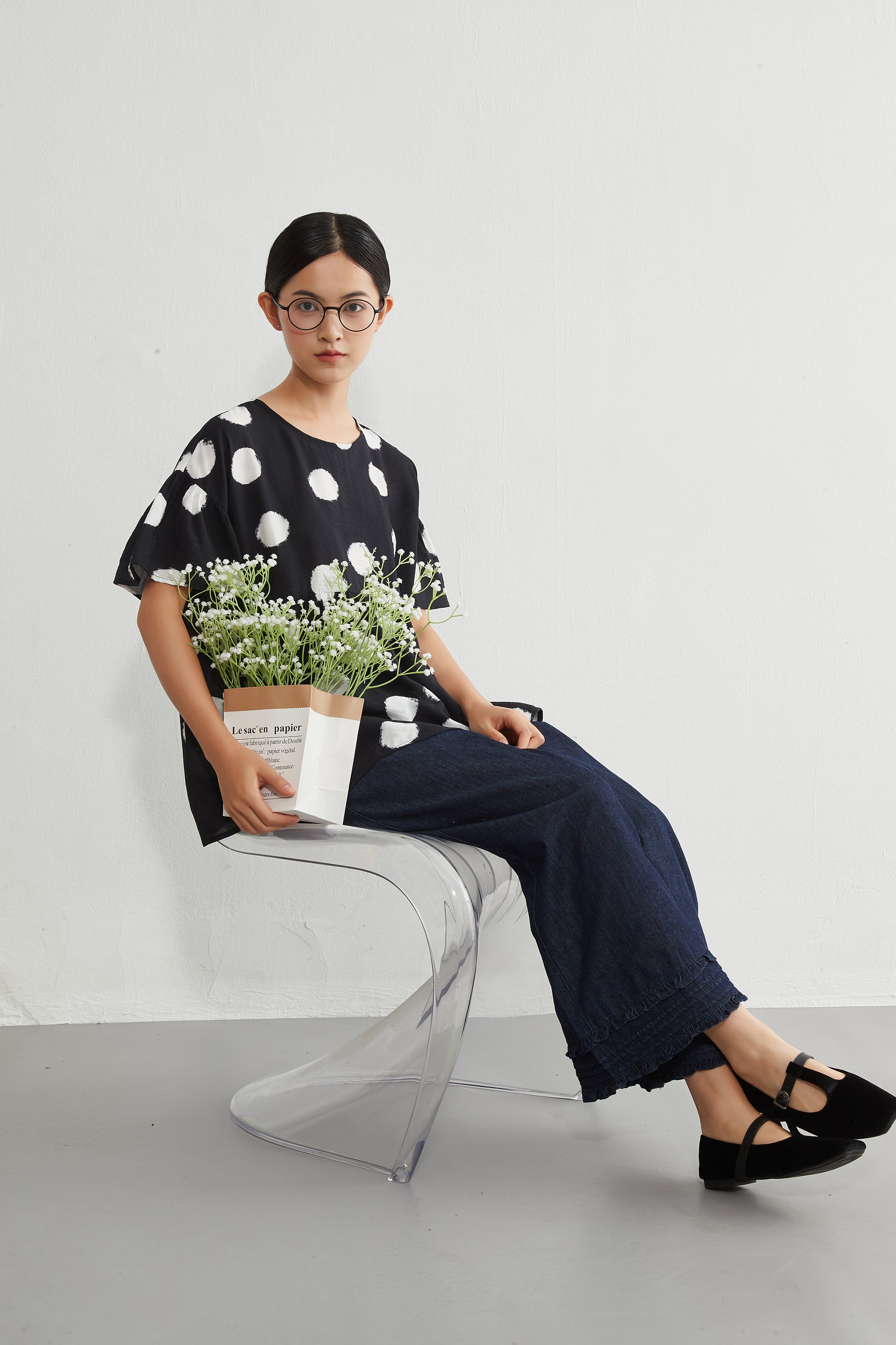 かすれドットの個性が引き立ち、視線が上に集まるので脚長効果も抜群。フラットなパンプスを合わせれば、品のある大人のデイリーコーデが完成します。