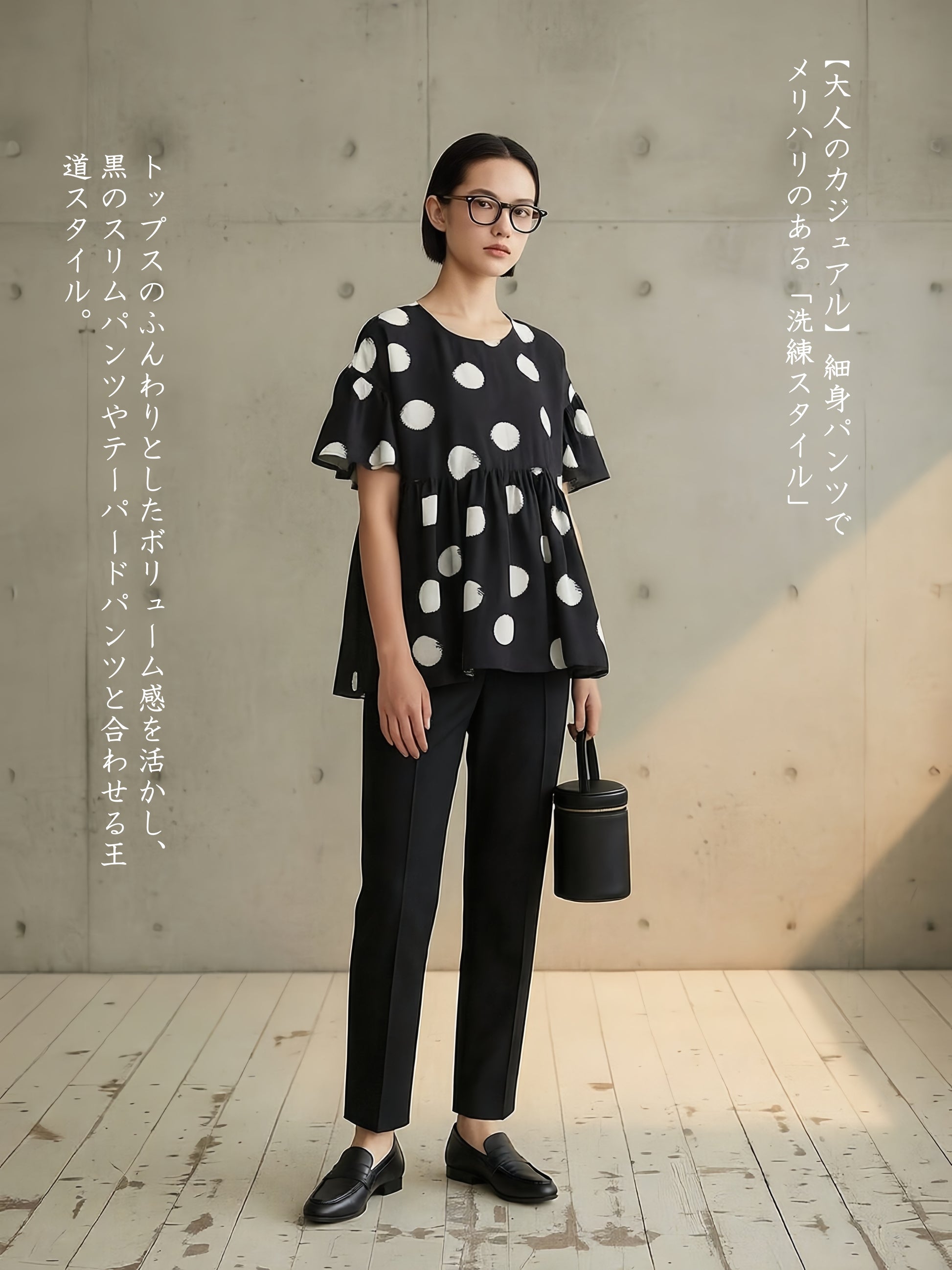 トップスのふんわりとしたボリューム感を活かし、黒のスリムパンツやテーパードパンツと合わせる王道スタイル。