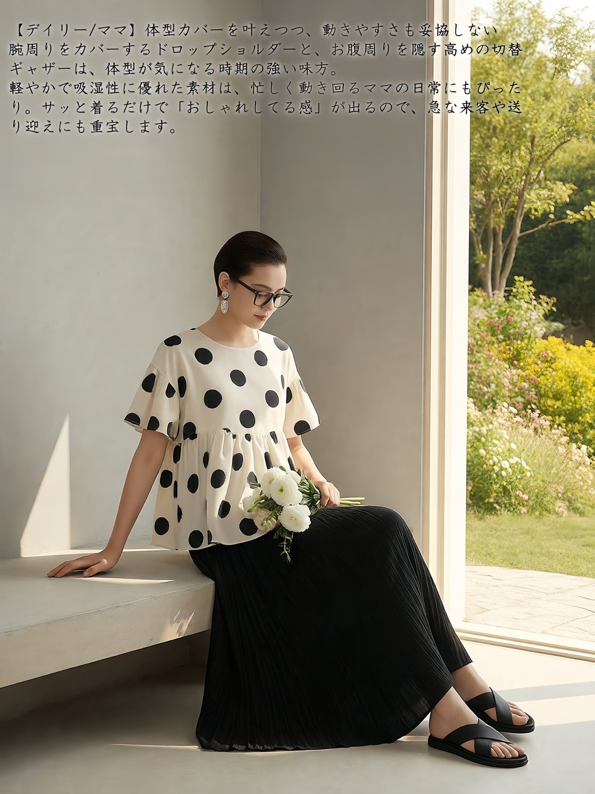 腕周りをカバーするドロップショルダーと、お腹周りを隠す高めの切替ギャザーは、体型が気になる時期の強い味方。