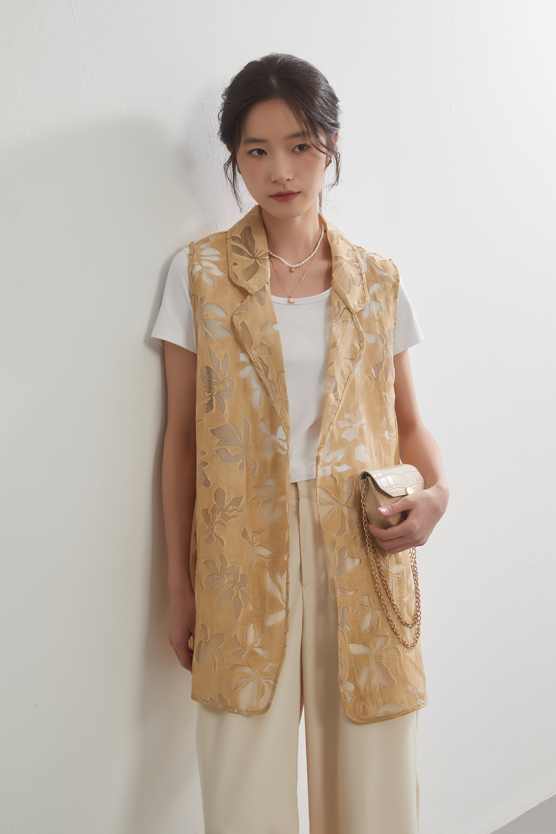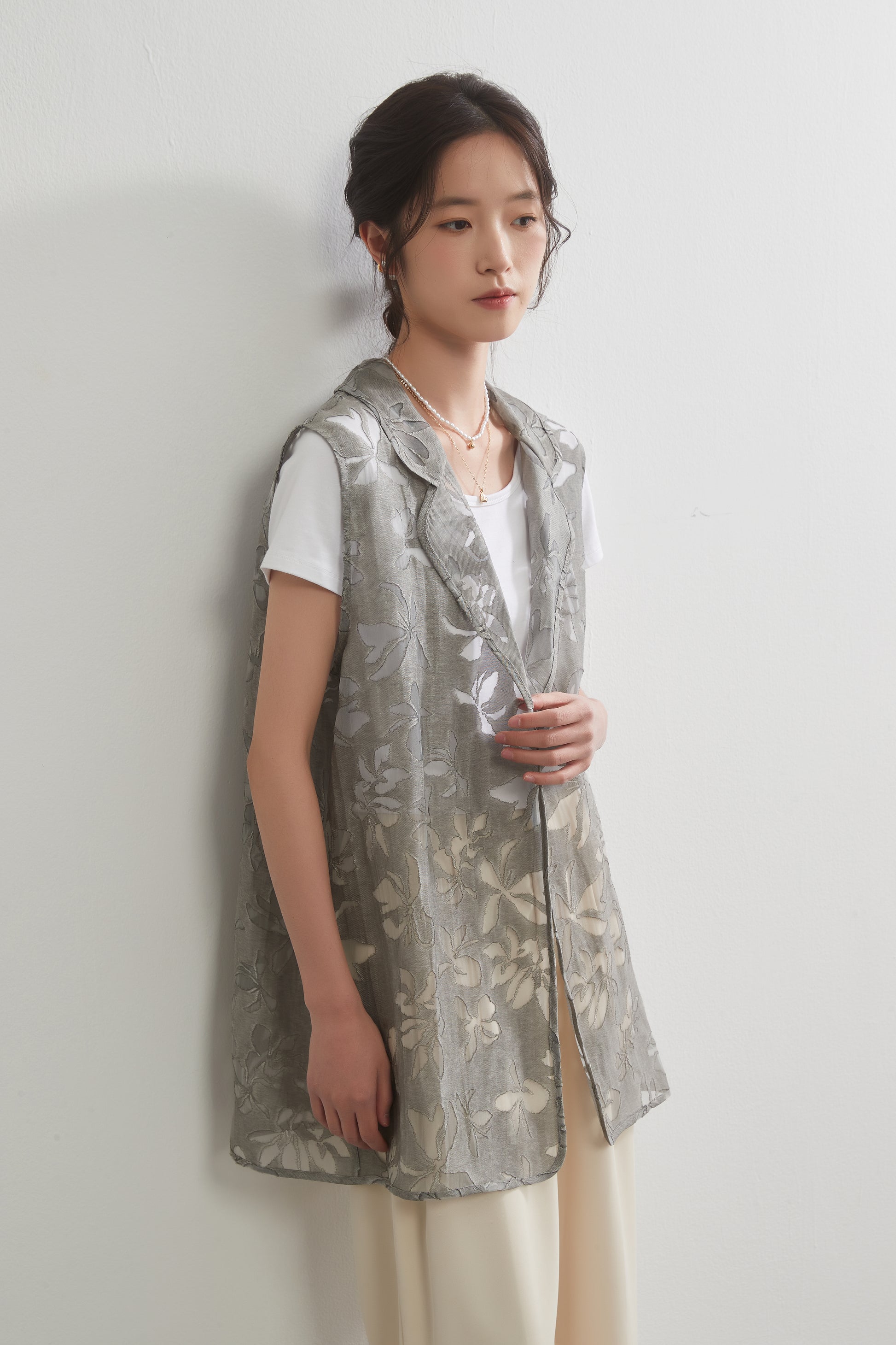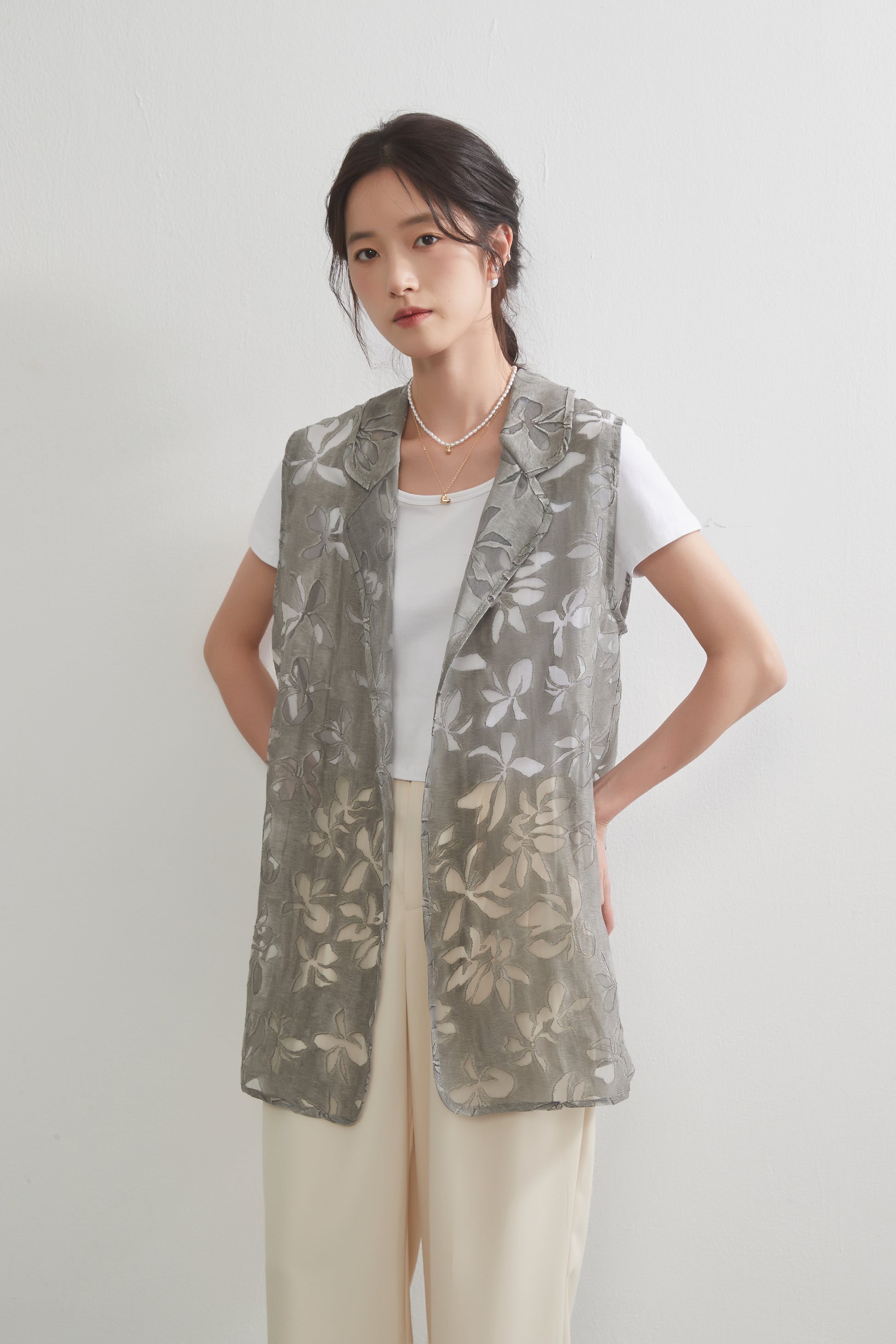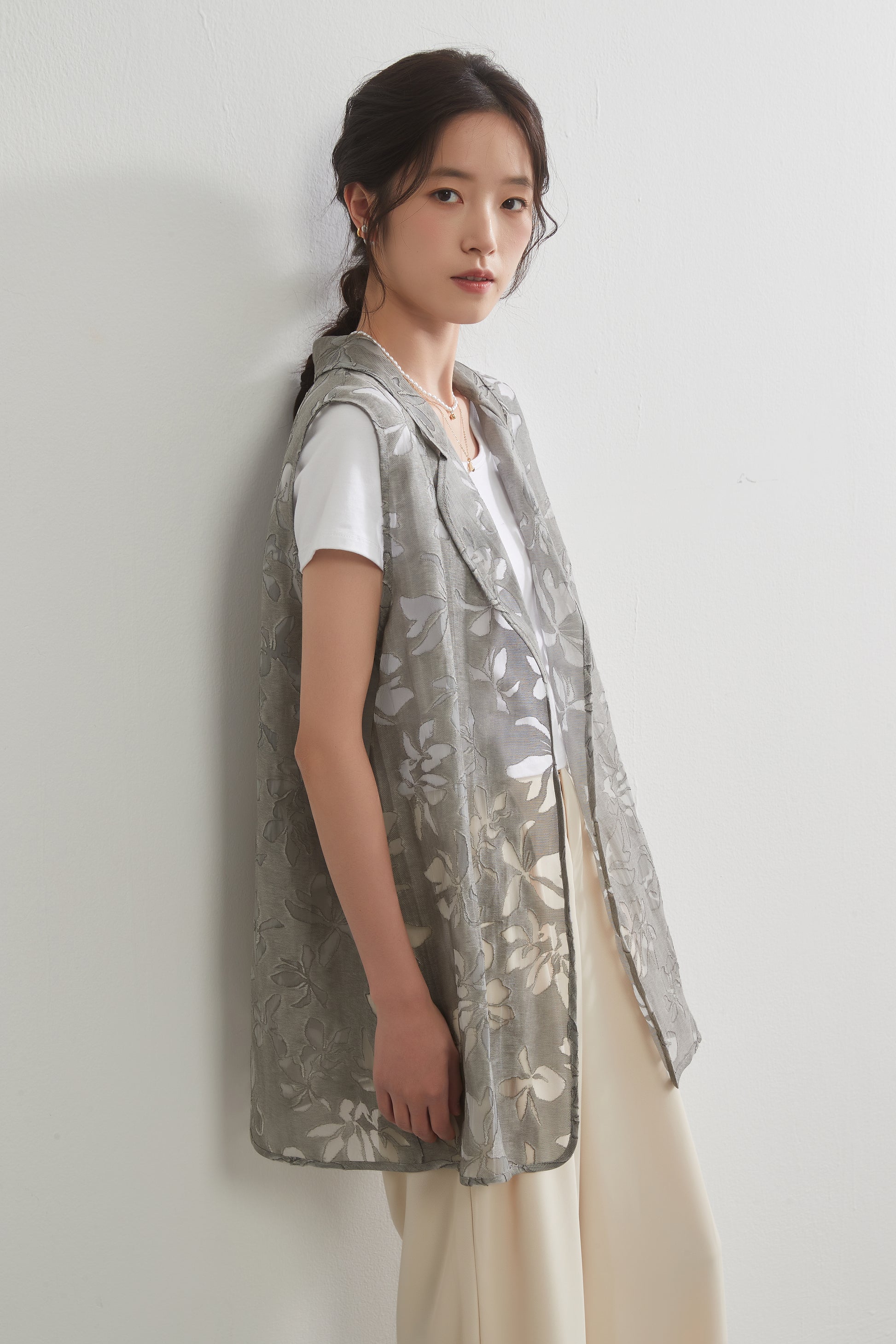 繊細な花柄のオパール加工が特徴的なベスト。軽やかな透け感があり、エレガントさとカジュアルさを両立したデザインです。シンプルなインナーと合わせることで、柄の美しさを引き立てます。