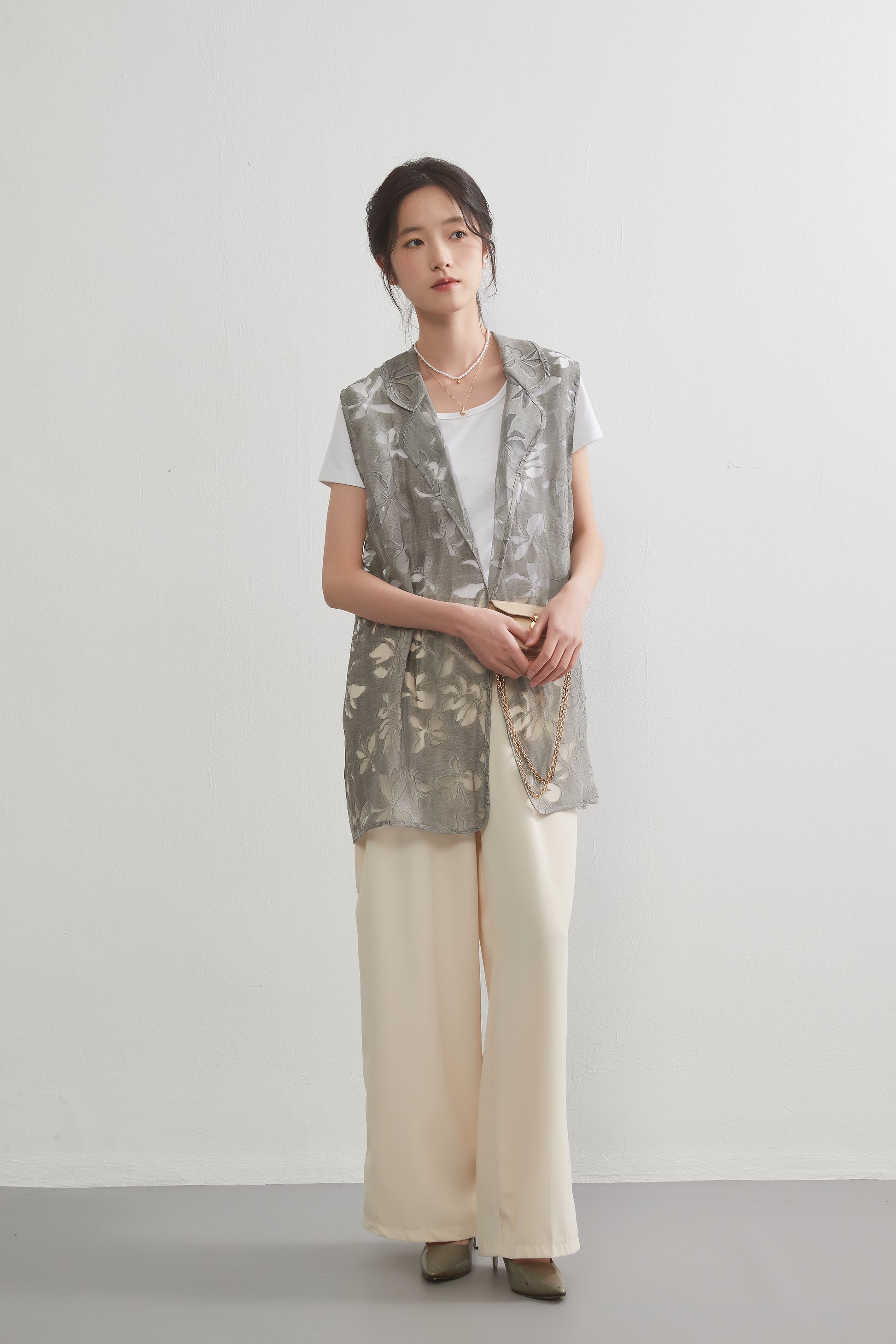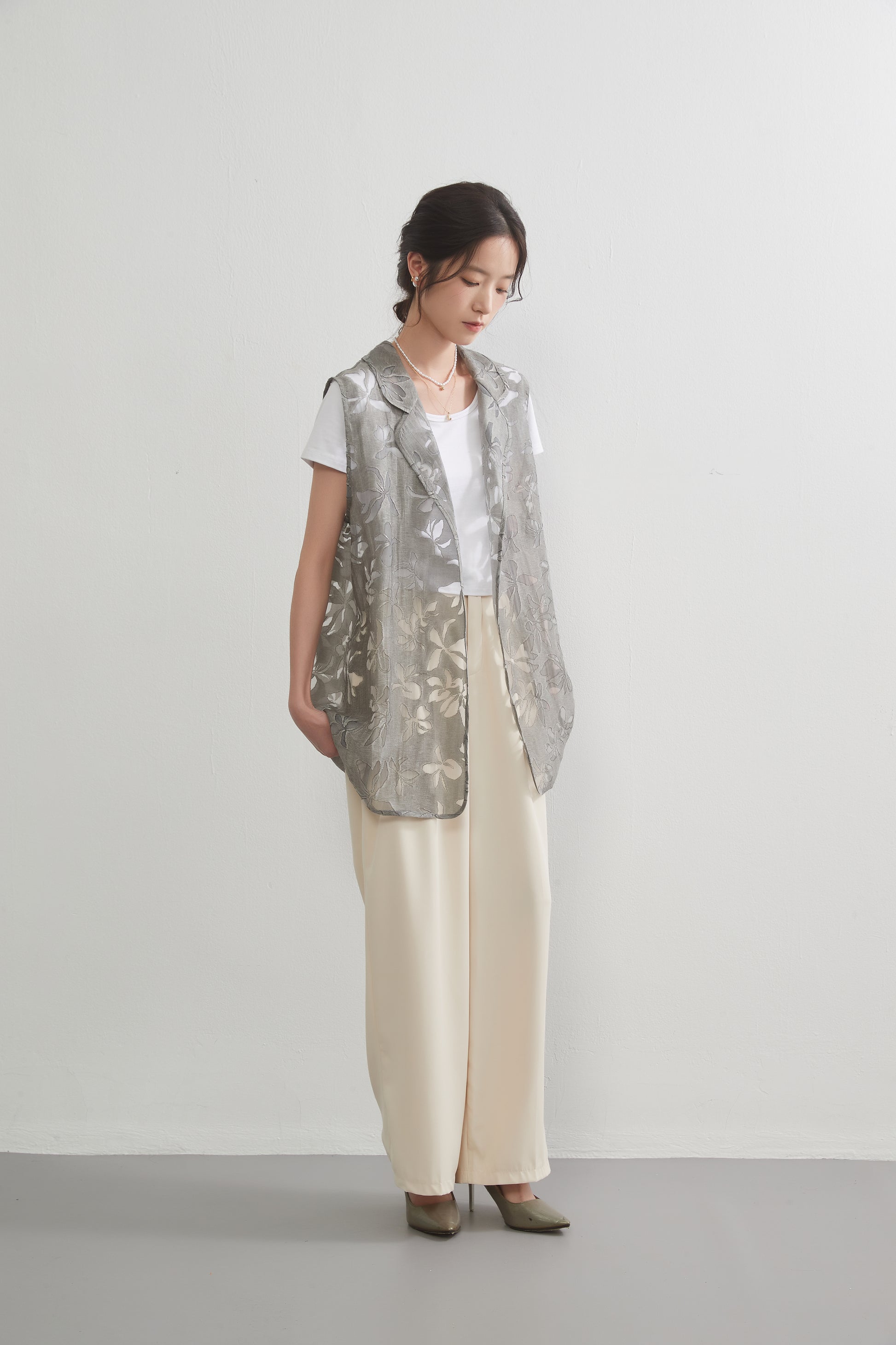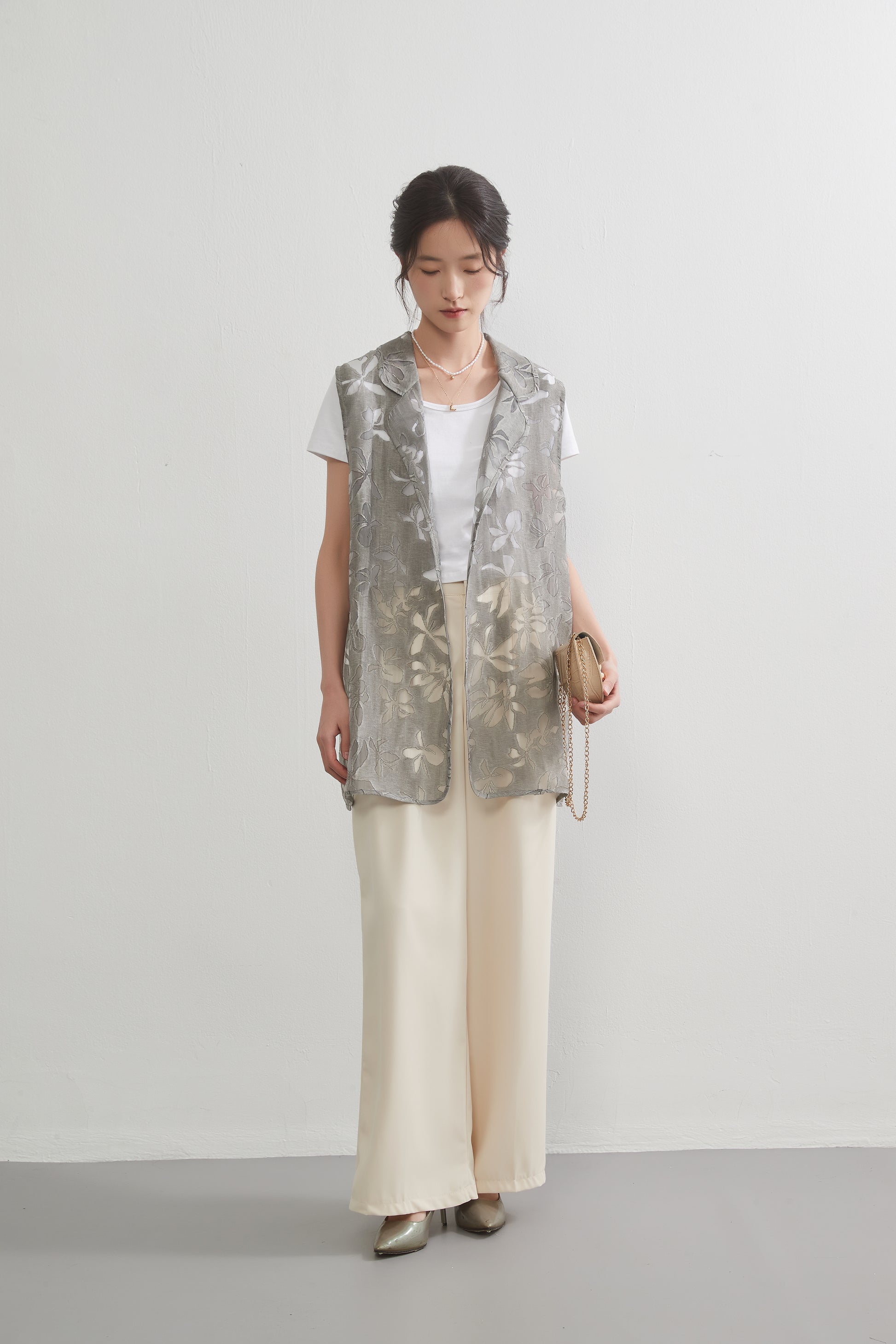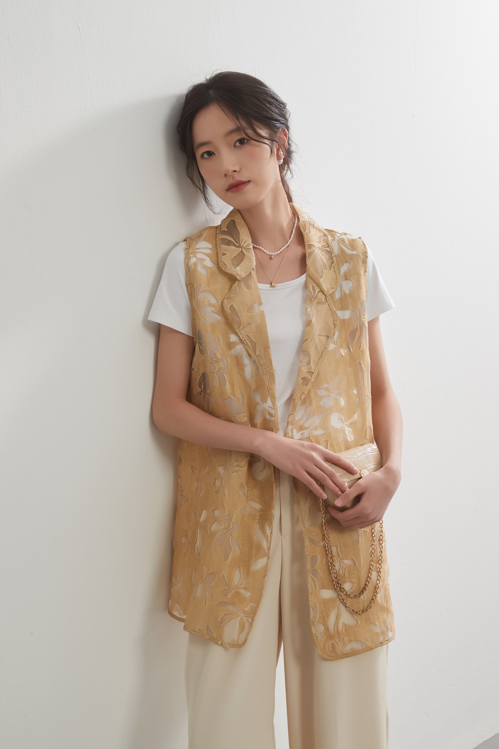 繊細な花柄のオパール加工が特徴的なベスト。軽やかな透け感があり、エレガントさとカジュアルさを両立したデザインです。シンプルなインナーと合わせることで、柄の美しさを引き立てます。