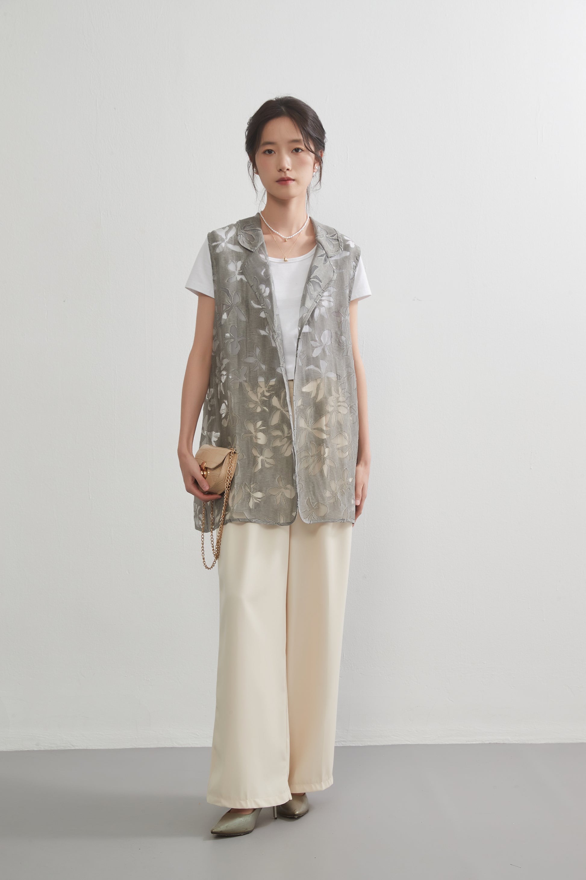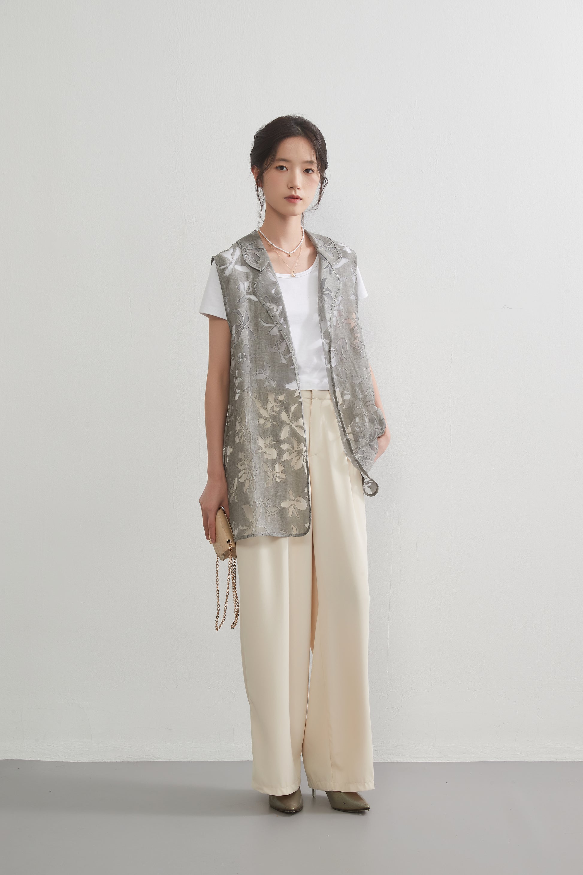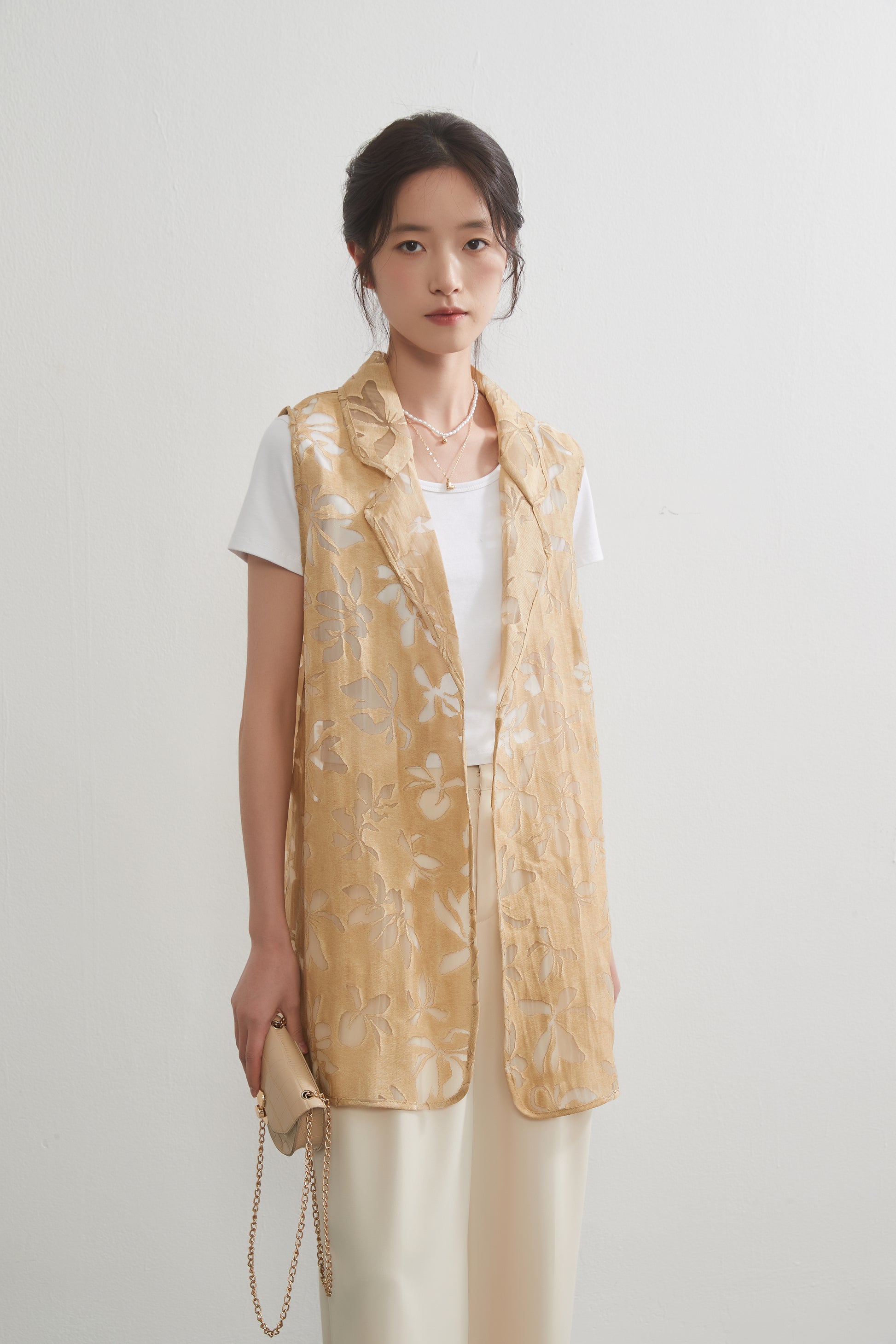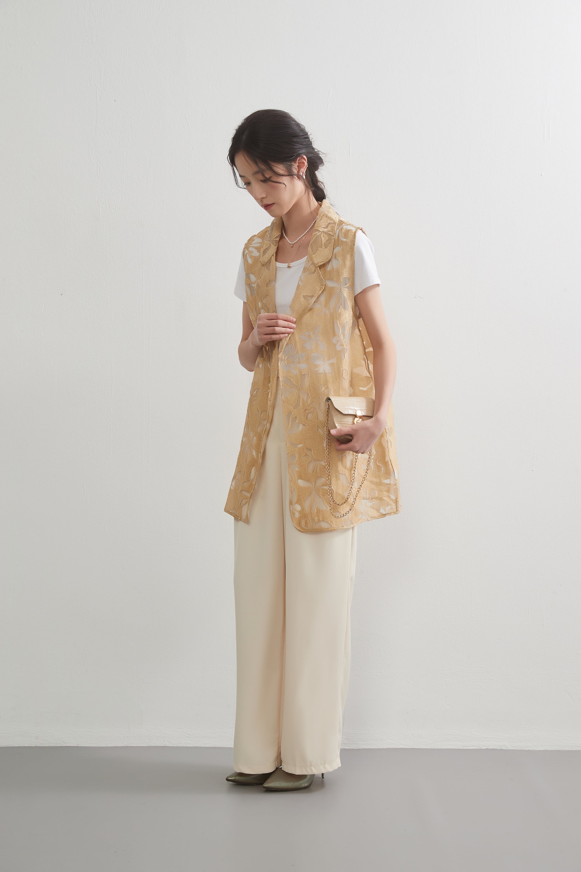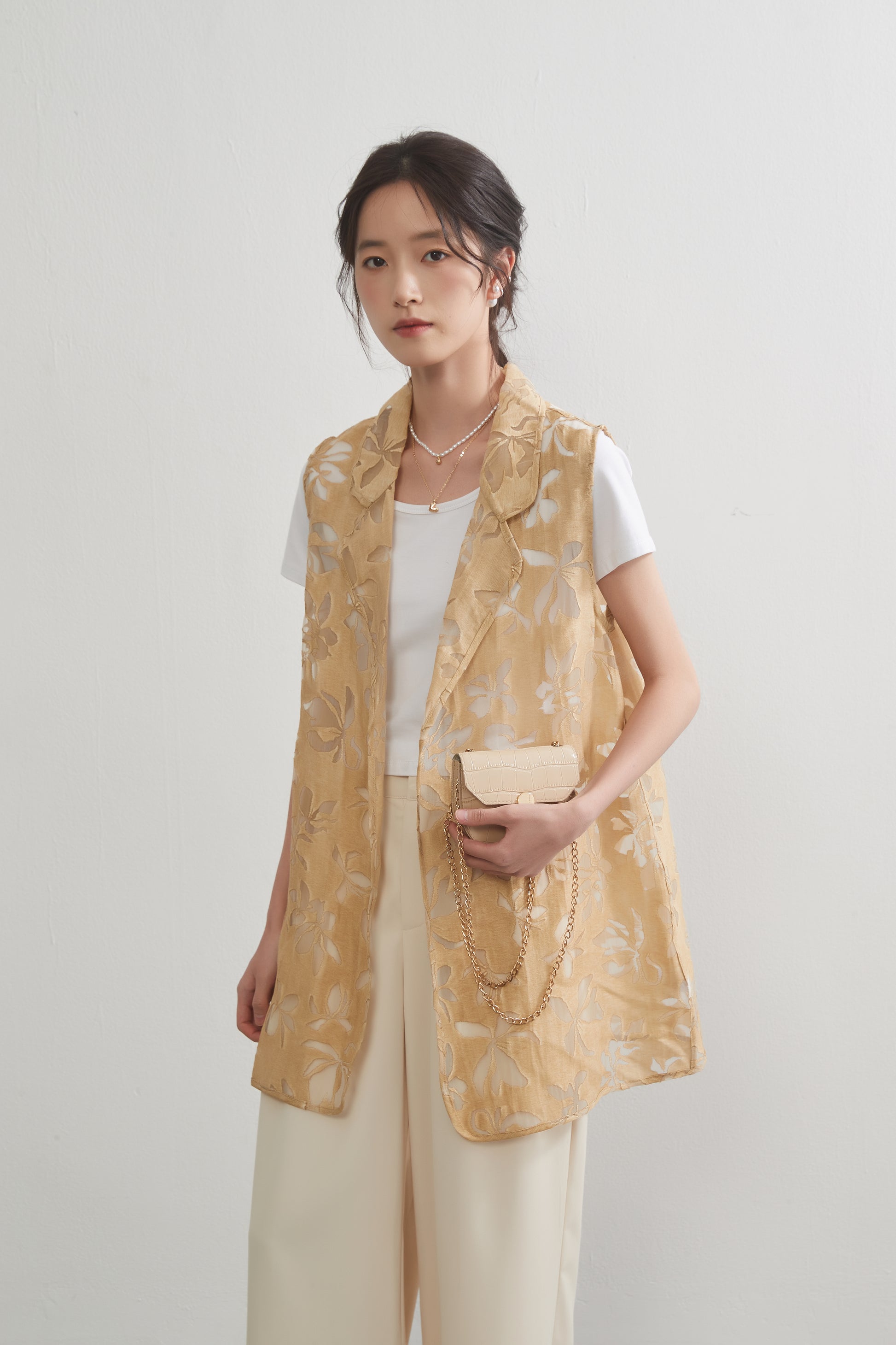 繊細な花柄のオパール加工が特徴的なベスト。軽やかな透け感があり、エレガントさとカジュアルさを両立したデザインです。シンプルなインナーと合わせることで、柄の美しさを引き立てます。
